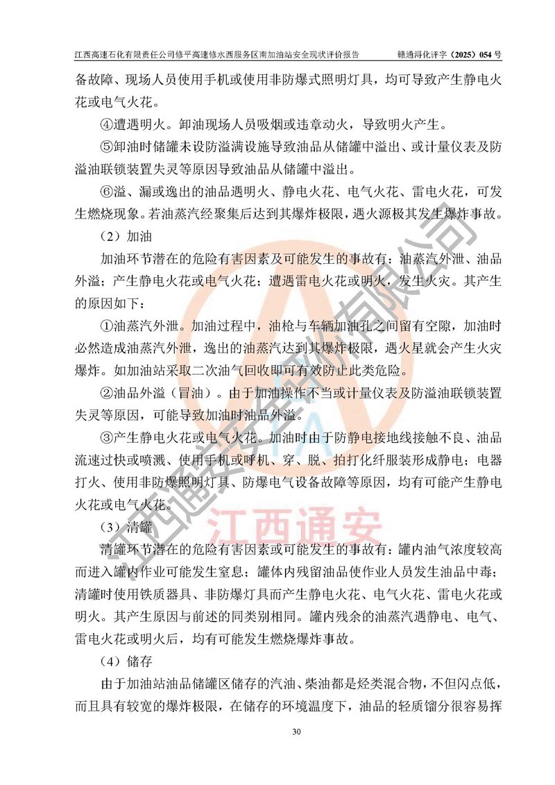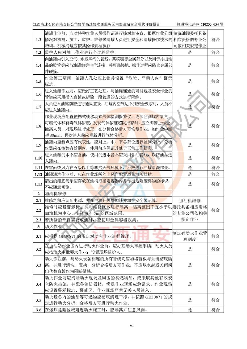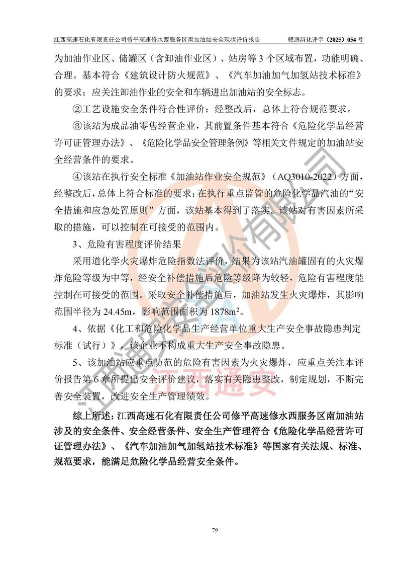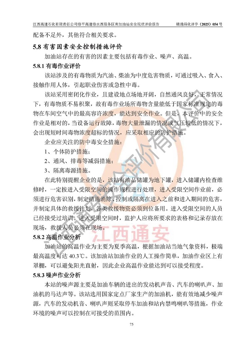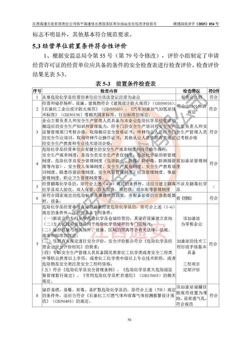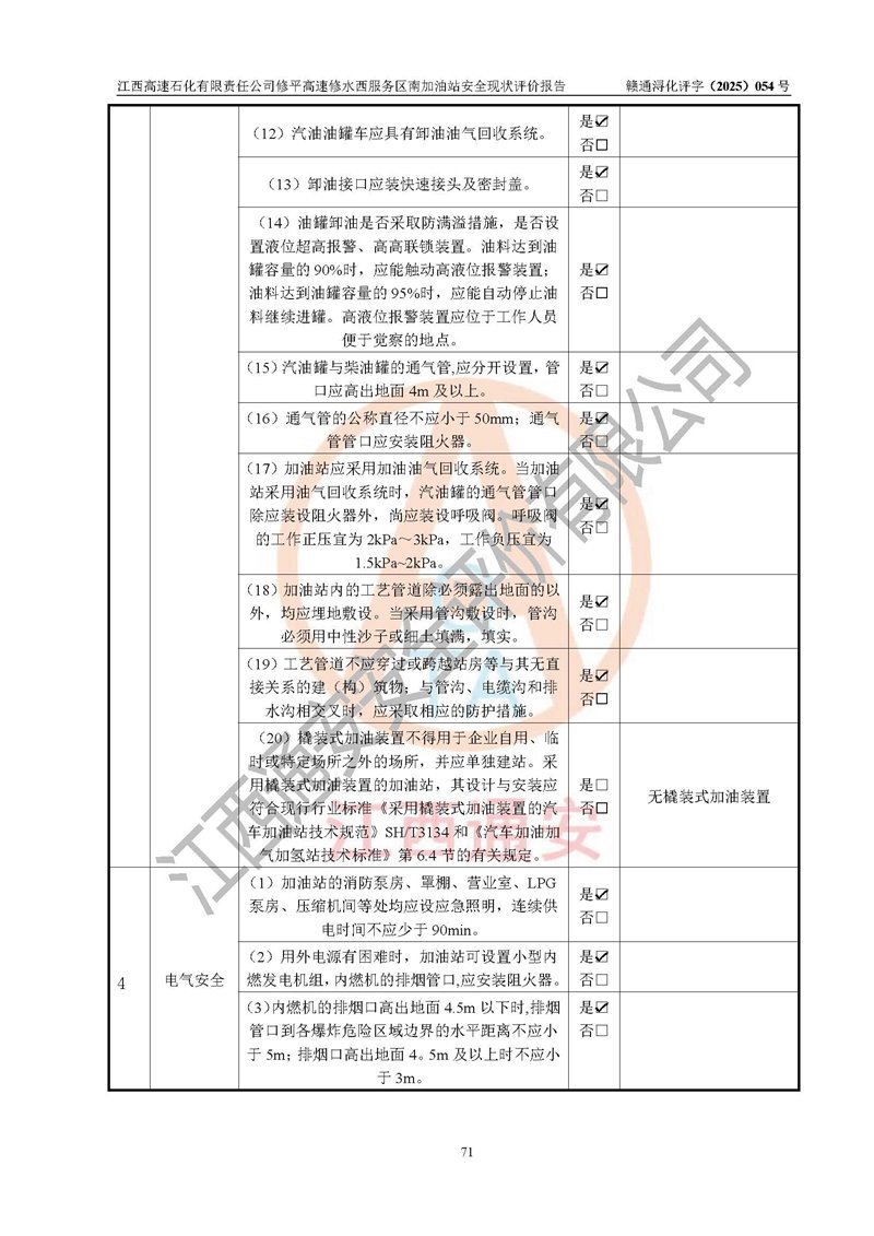 評價(jià)結(jié)論 | 江西高速石化有限責(zé)任公司修平高速修水西服務(wù)區(qū)南加油站涉及的安全條件、安全經(jīng)營條件、安全生產(chǎn)管理符合《危險(xiǎn)化學(xué)品經(jīng)營許可證管理辦法》、《汽車加油加氣加氫站技術(shù)標(biāo)準(zhǔn)》等**有關(guān)法規(guī)、標(biāo)準(zhǔn)、規(guī)范要求,能滿足危險(xiǎn)化學(xué)品經(jīng)營安全條件。 | |||