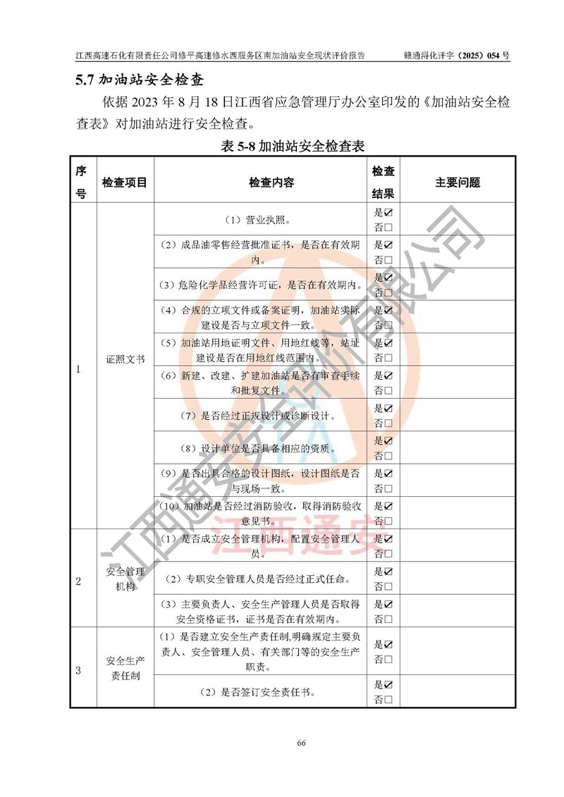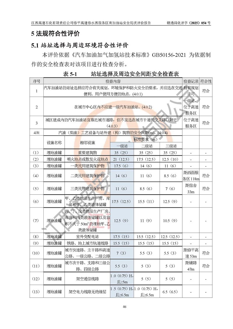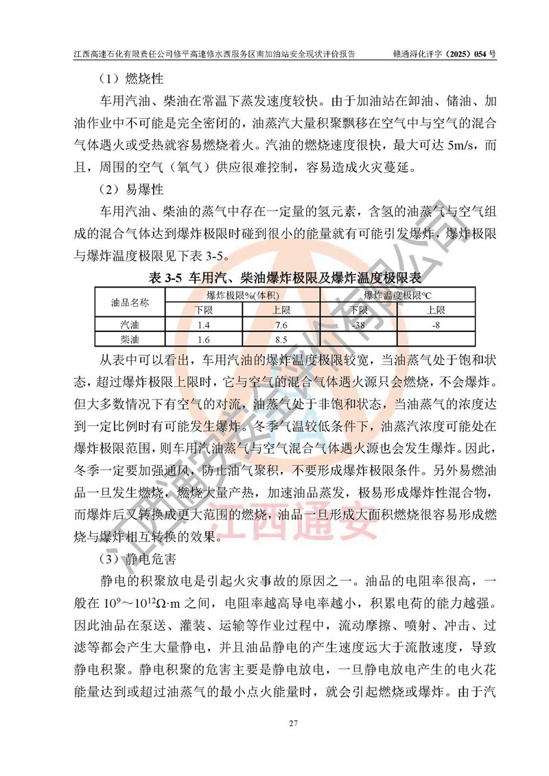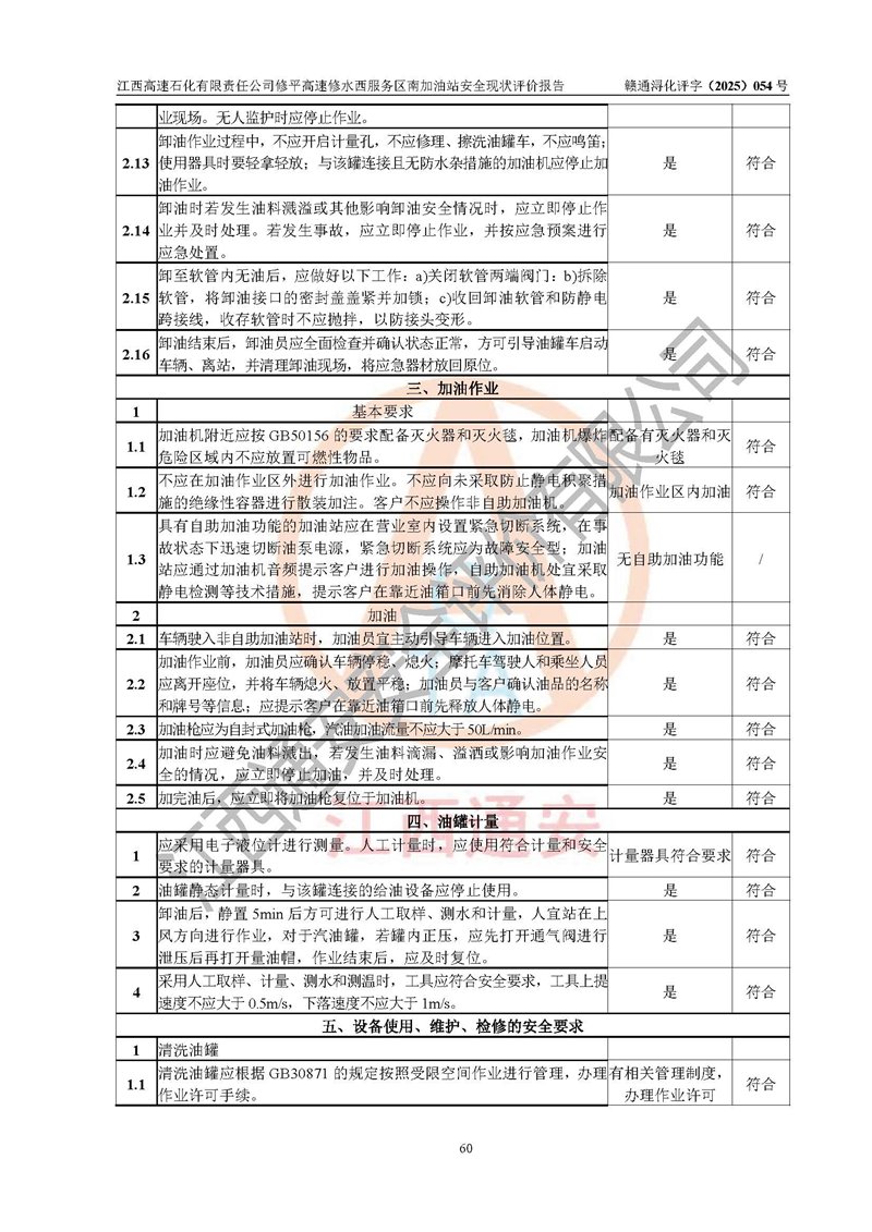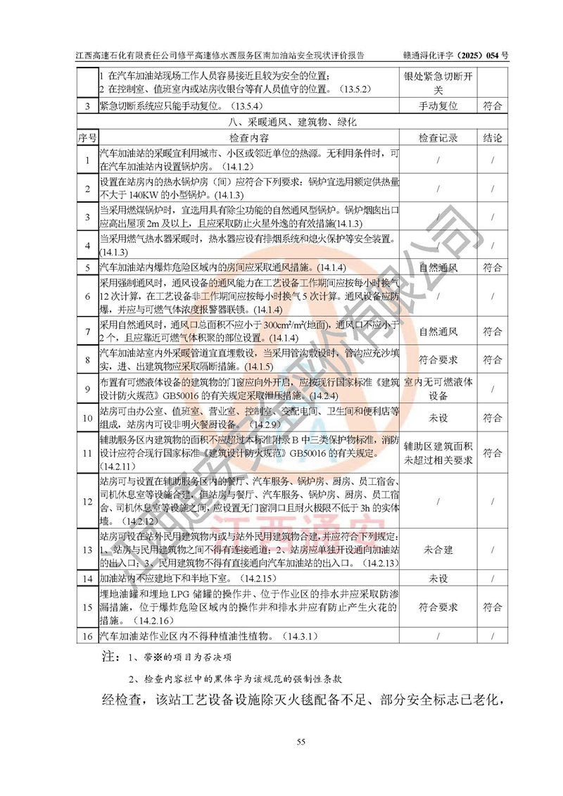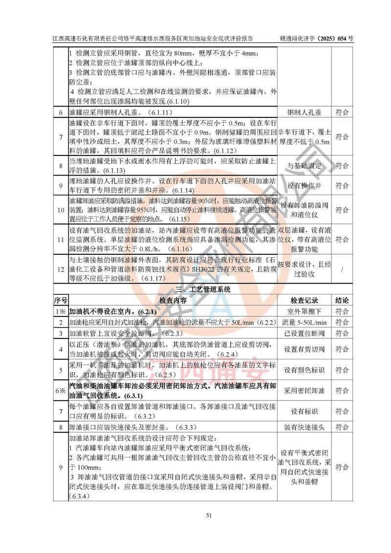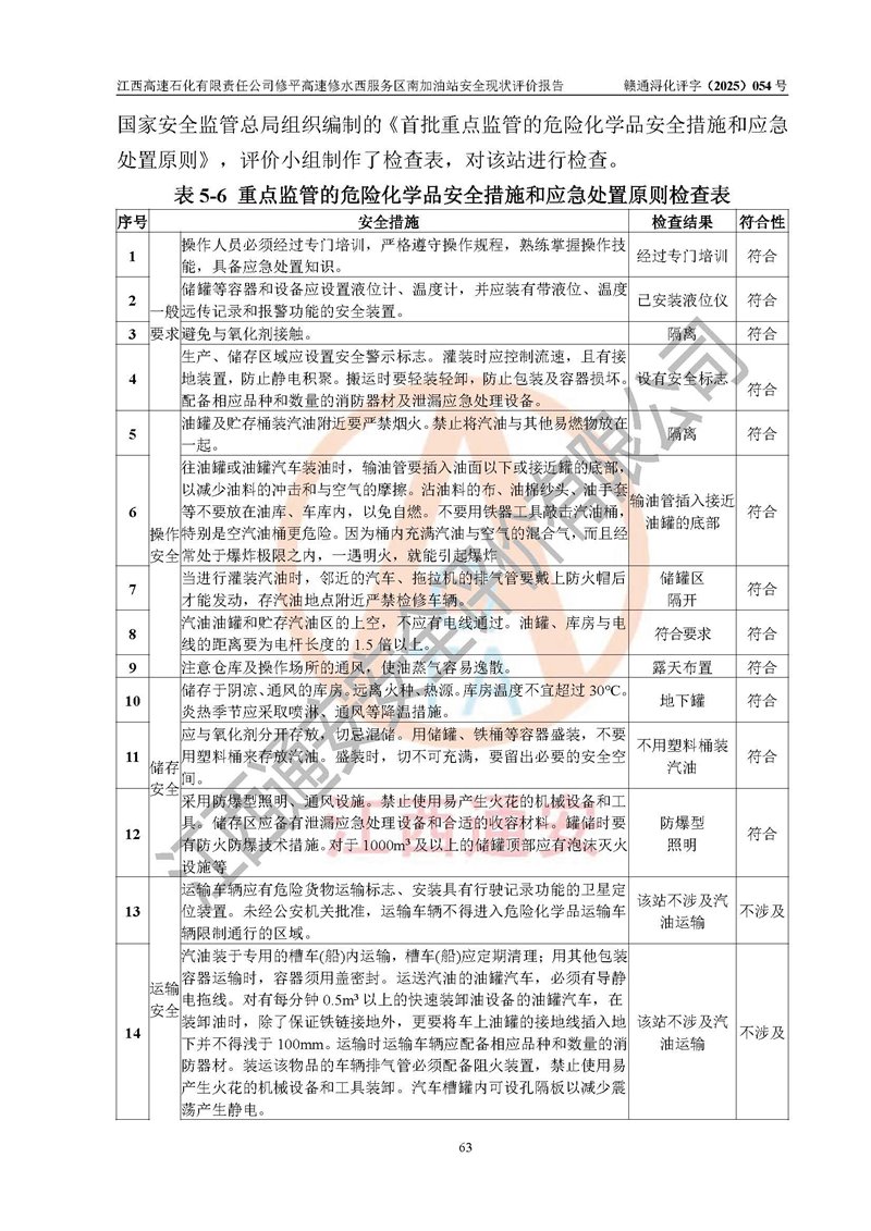 評價(jià)結(jié)論 | 江西高速石化有限責(zé)任公司修平高速修水西服務(wù)區(qū)南加油站涉及的安全條件、安全經(jīng)營條件、安全生產(chǎn)管理符合《危險(xiǎn)化學(xué)品經(jīng)營許可證管理辦法》、《汽車加油加氣加氫站技術(shù)標(biāo)準(zhǔn)》等**有關(guān)法規(guī)、標(biāo)準(zhǔn)、規(guī)范要求,能滿足危險(xiǎn)化學(xué)品經(jīng)營安全條件。 | |||