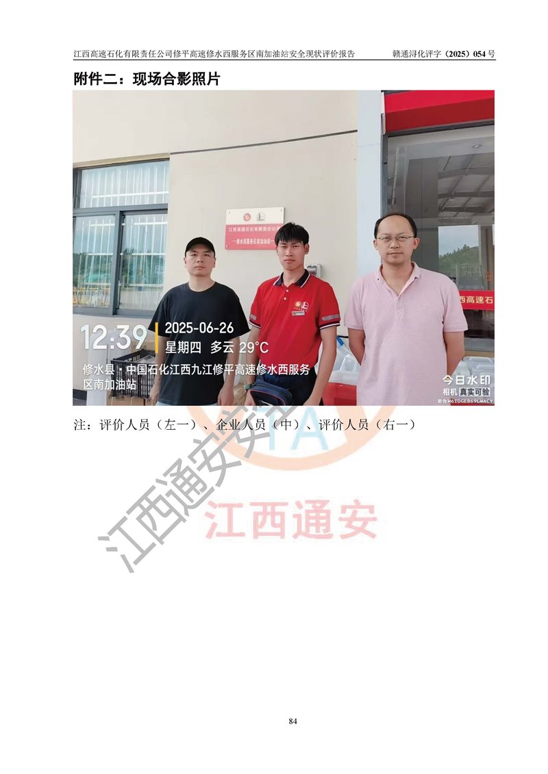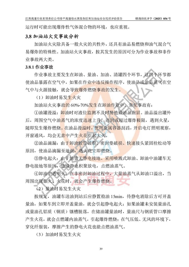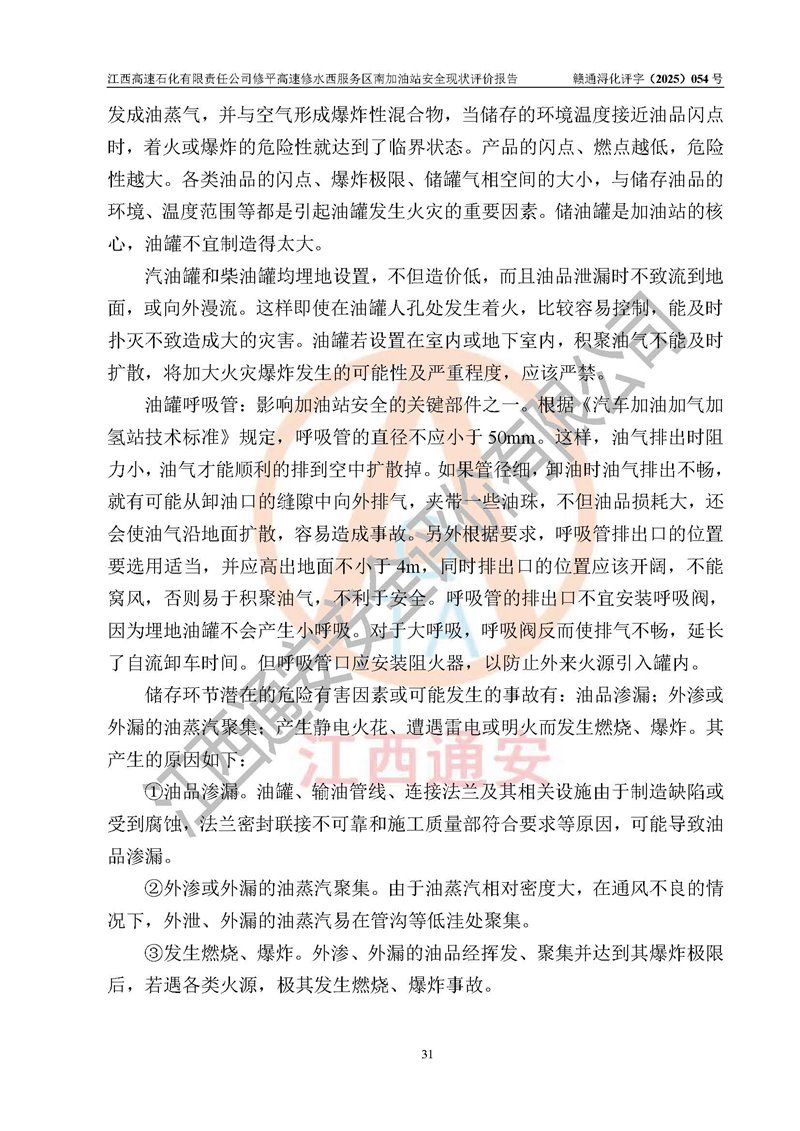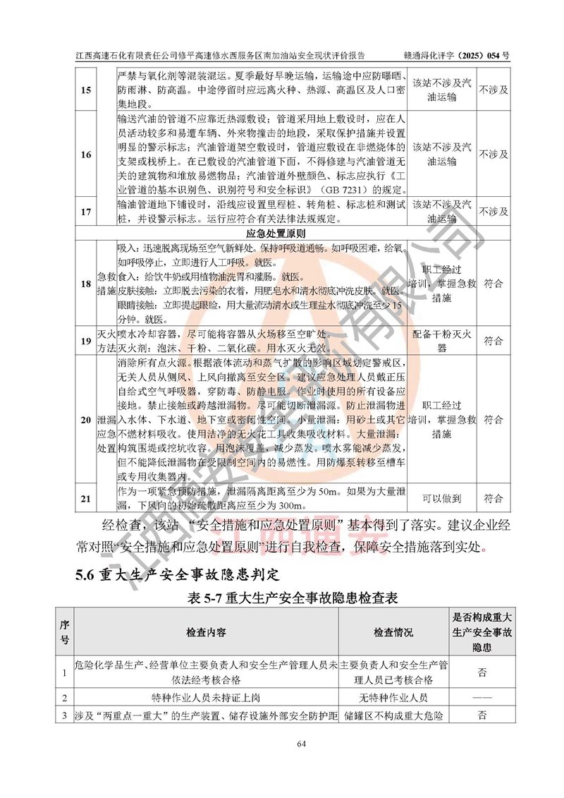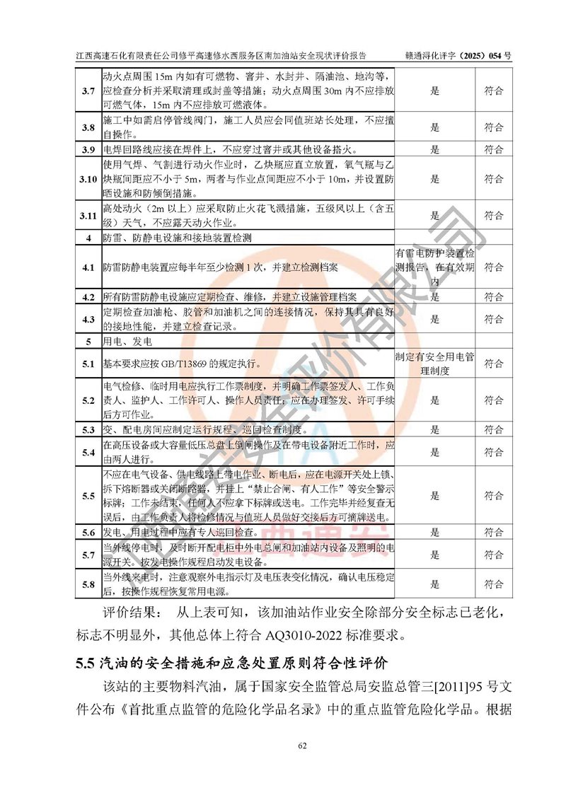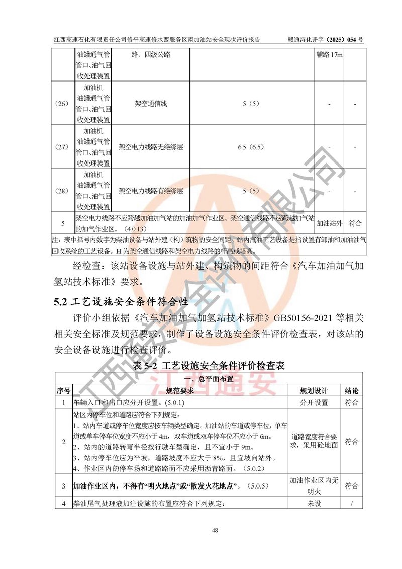 評價(jià)結(jié)論 | 江西高速石化有限責(zé)任公司修平高速修水西服務(wù)區(qū)南加油站涉及的安全條件、安全經(jīng)營條件、安全生產(chǎn)管理符合《危險(xiǎn)化學(xué)品經(jīng)營許可證管理辦法》、《汽車加油加氣加氫站技術(shù)標(biāo)準(zhǔn)》等**有關(guān)法規(guī)、標(biāo)準(zhǔn)、規(guī)范要求,能滿足危險(xiǎn)化學(xué)品經(jīng)營安全條件。 | |||