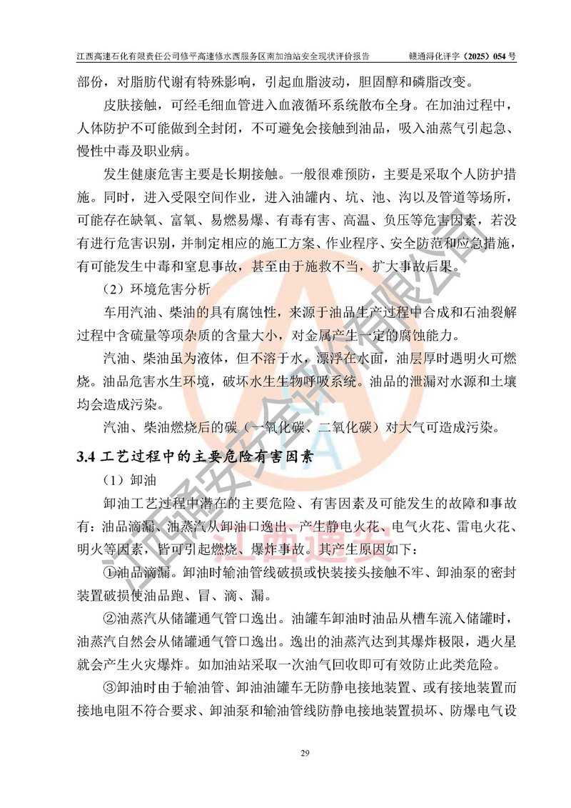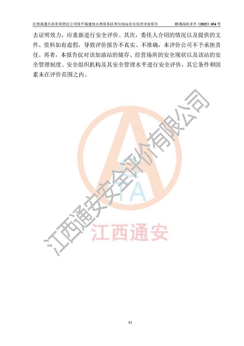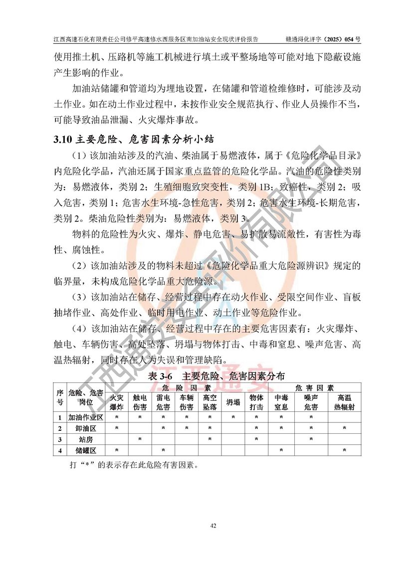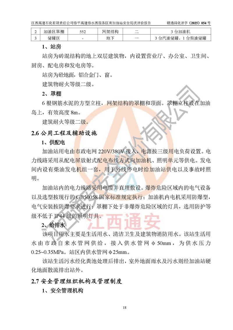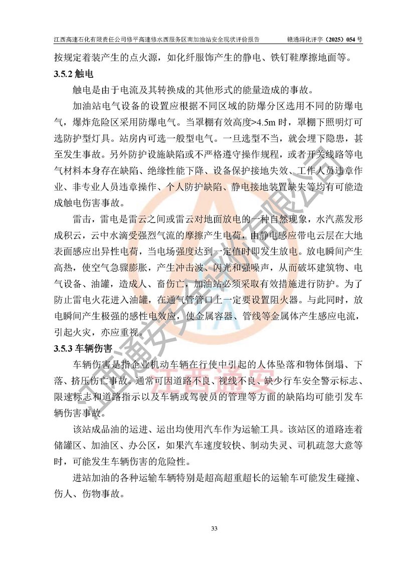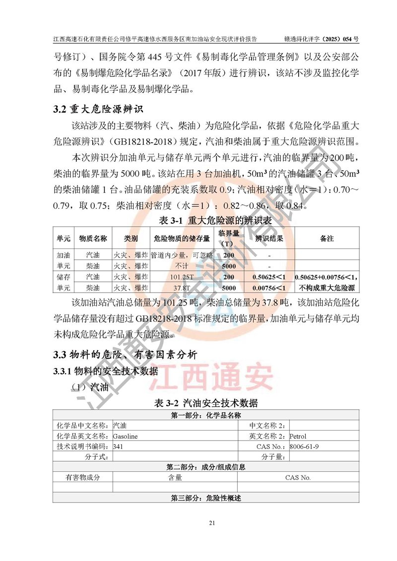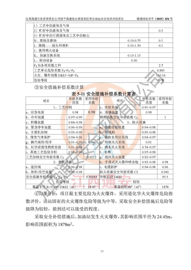 評價(jià)結(jié)論 | 江西高速石化有限責(zé)任公司修平高速修水西服務(wù)區(qū)南加油站涉及的安全條件、安全經(jīng)營條件、安全生產(chǎn)管理符合《危險(xiǎn)化學(xué)品經(jīng)營許可證管理辦法》、《汽車加油加氣加氫站技術(shù)標(biāo)準(zhǔn)》等**有關(guān)法規(guī)、標(biāo)準(zhǔn)、規(guī)范要求,能滿足危險(xiǎn)化學(xué)品經(jīng)營安全條件。 | |||