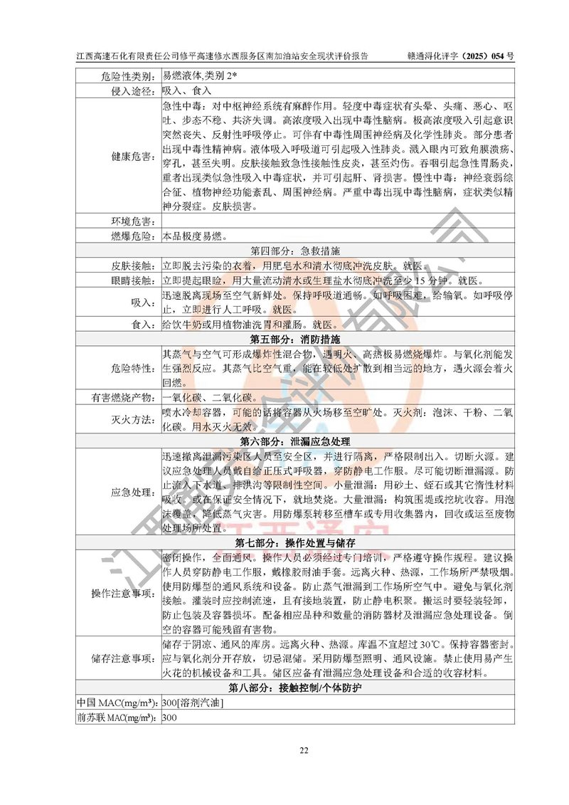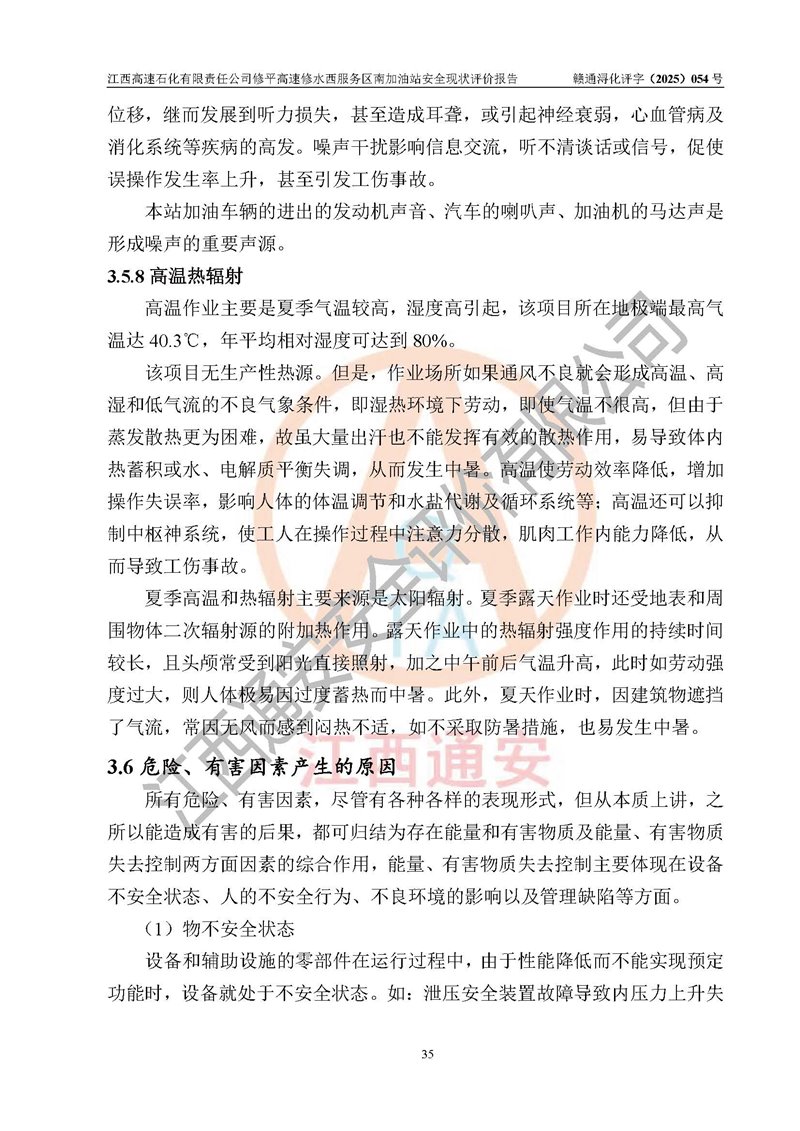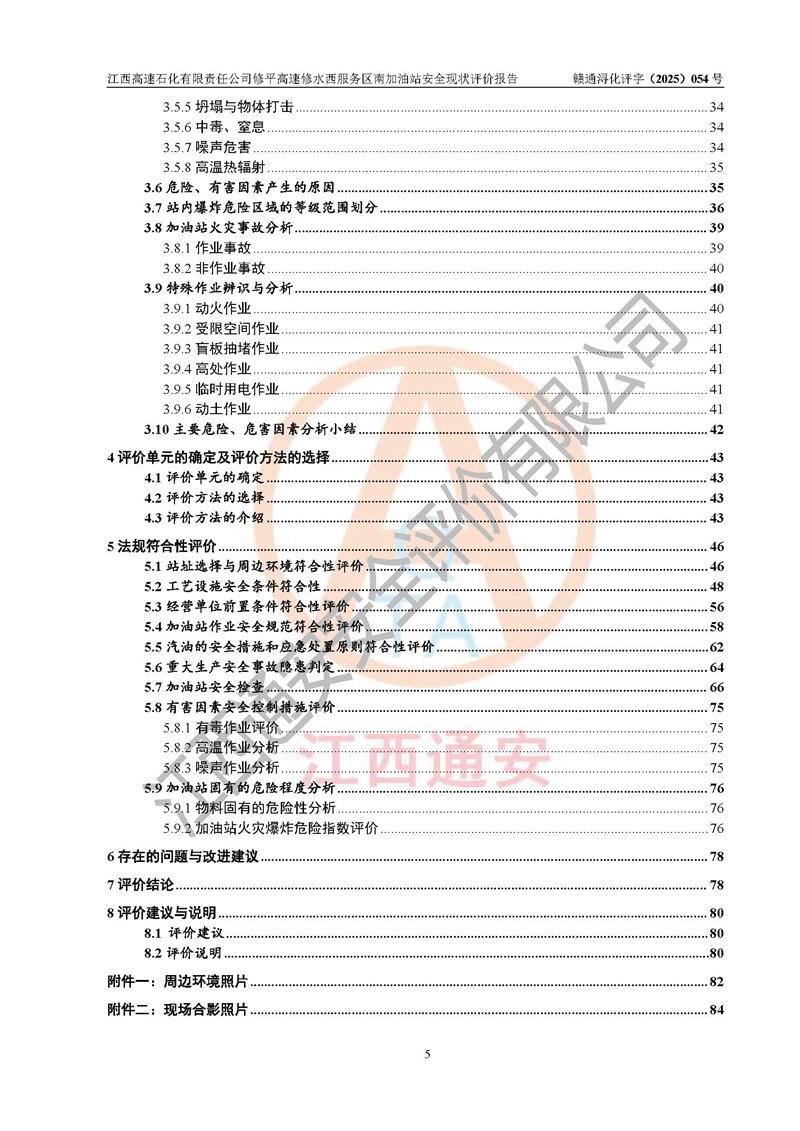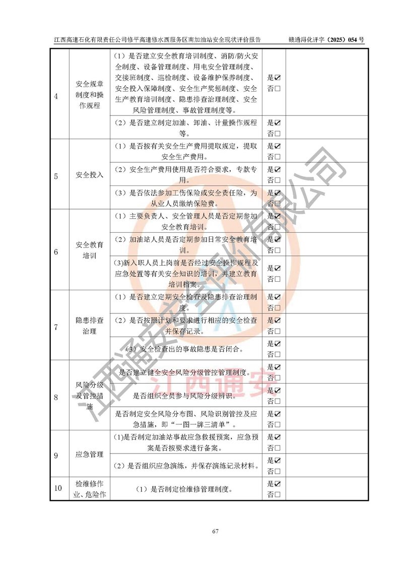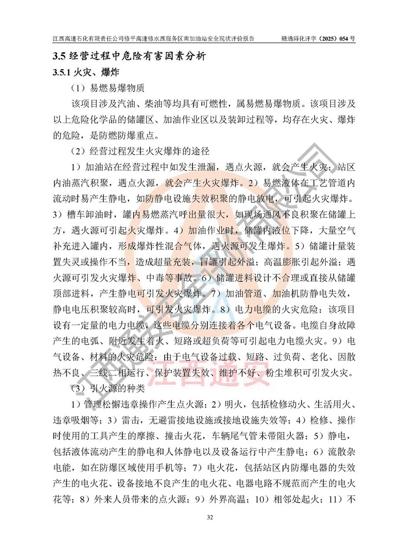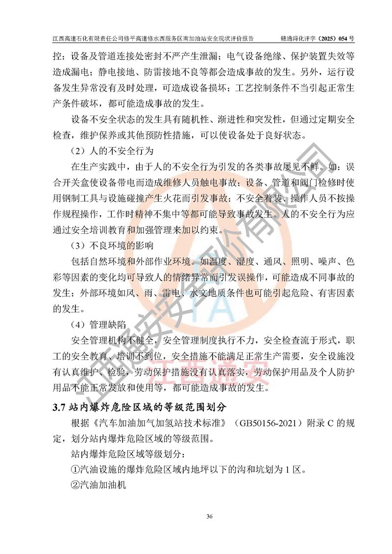 評價(jià)結(jié)論 | 江西高速石化有限責(zé)任公司修平高速修水西服務(wù)區(qū)南加油站涉及的安全條件、安全經(jīng)營條件、安全生產(chǎn)管理符合《危險(xiǎn)化學(xué)品經(jīng)營許可證管理辦法》、《汽車加油加氣加氫站技術(shù)標(biāo)準(zhǔn)》等**有關(guān)法規(guī)、標(biāo)準(zhǔn)、規(guī)范要求,能滿足危險(xiǎn)化學(xué)品經(jīng)營安全條件。 | |||