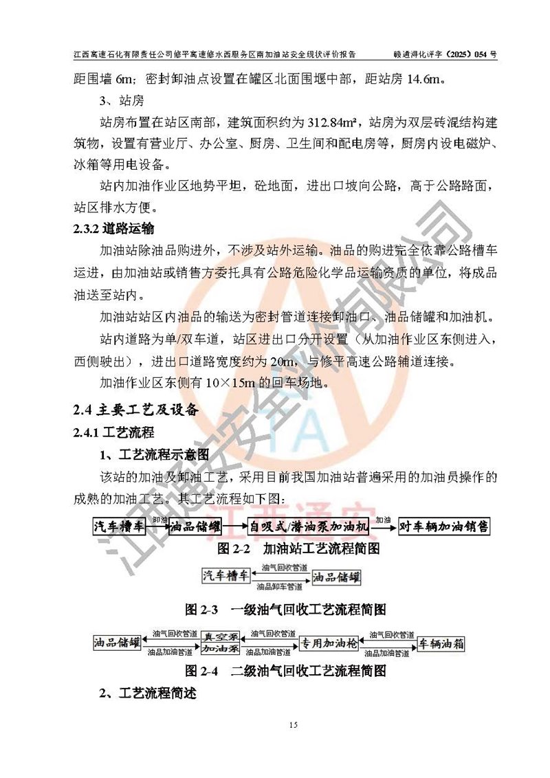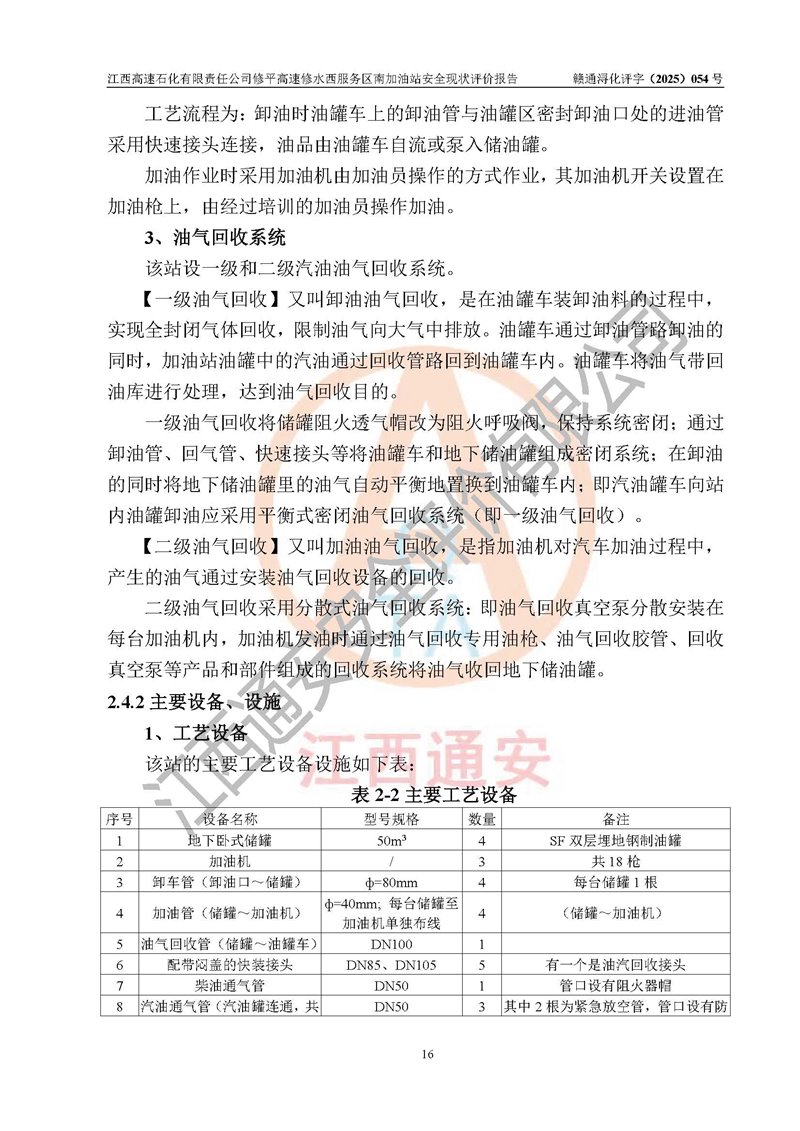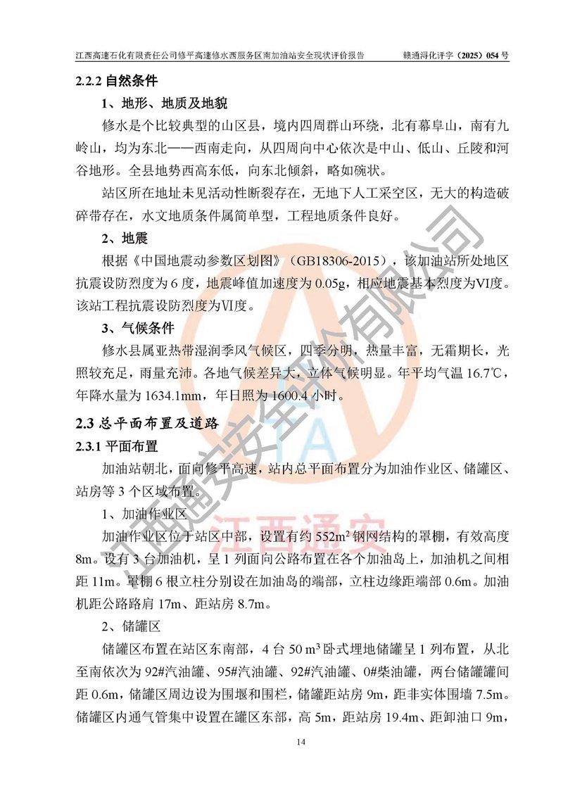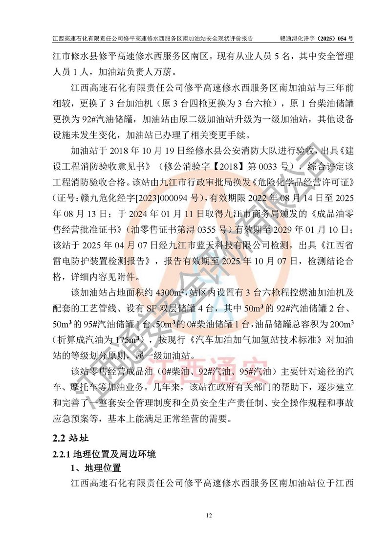 項(xiàng)目簡介 | 江西高速石化有限責(zé)任公司修平高速修水西服務(wù)區(qū)南加油站是一家專門從事成品油零售經(jīng)營的其他有限責(zé)任公司分公司,注冊成立日期2022年08月15日,主要負(fù)責(zé)人:萬蔚,經(jīng)營場所位于江西省九江市修水縣修平高速修水西服務(wù)區(qū)南區(qū)。 該加油站占地面積約4300m2,站區(qū)內(nèi)設(shè)置有3臺(tái)六槍程控燃油加油機(jī)及配套的工藝管線、設(shè)有SF雙層儲(chǔ)罐4臺(tái),其中50m3的92#汽油儲(chǔ)罐2臺(tái)、50m3的95#汽油儲(chǔ)罐1臺(tái)、50m3的0#柴油儲(chǔ)罐1臺(tái),油品儲(chǔ)罐總?cè)莘e為200m3(折算成汽油為175m3),按現(xiàn)行《汽車加油加氣加氫站技術(shù)標(biāo)準(zhǔn)》對加油站的等級劃分原則,屬一級加油站。 該站由九江市行政審批局換發(fā)《危險(xiǎn)化學(xué)品經(jīng)營許可證》(證號:贛九危化經(jīng)字[2023]000094號),**期限2022年08月14日至2025年08月13日。 | |||