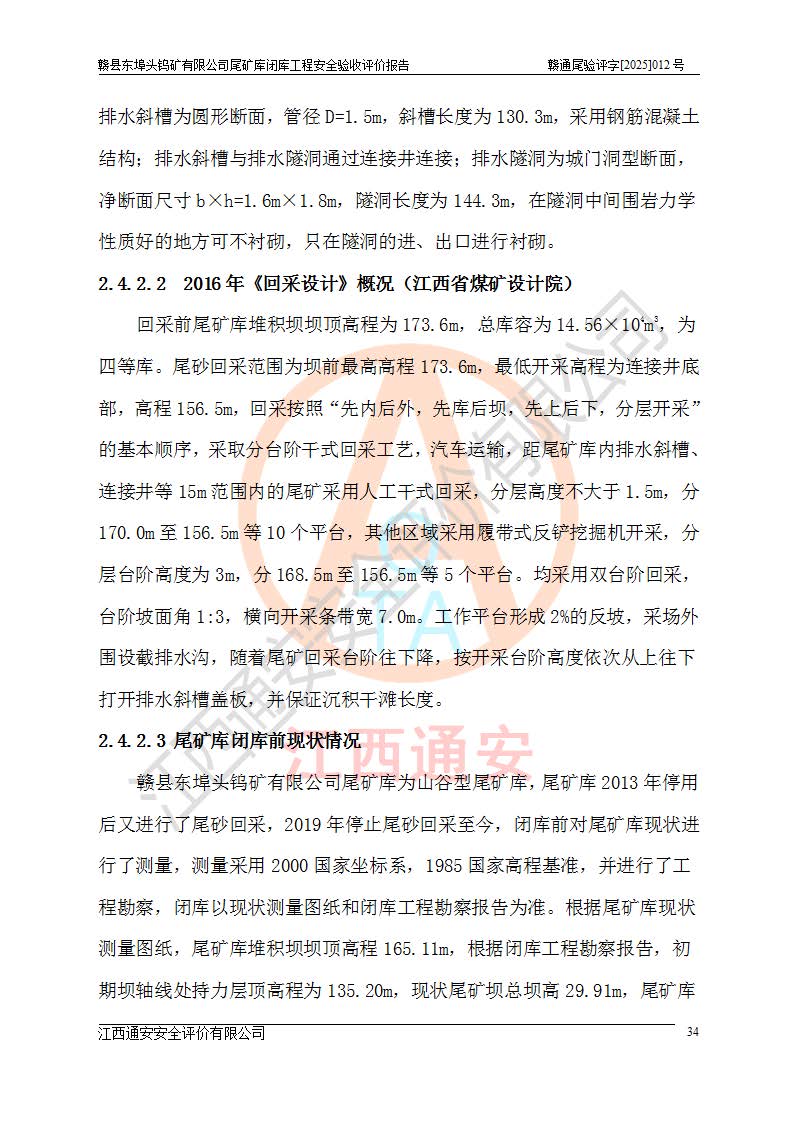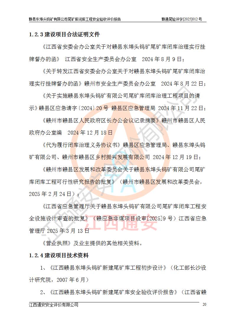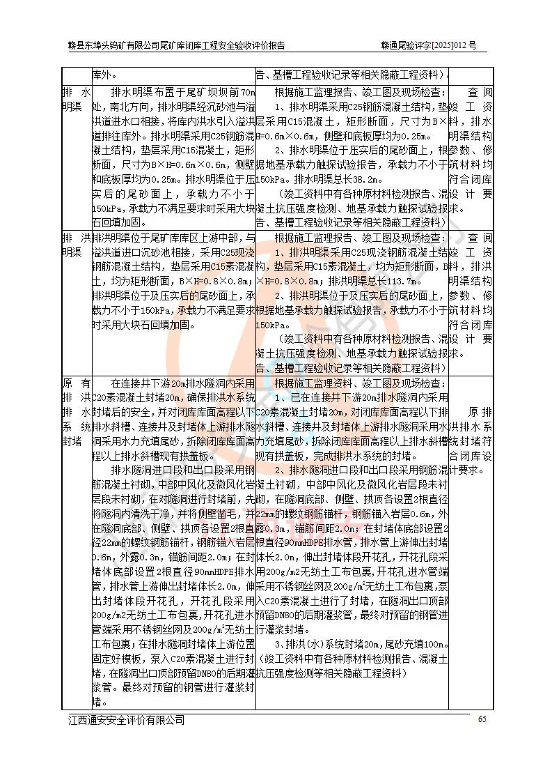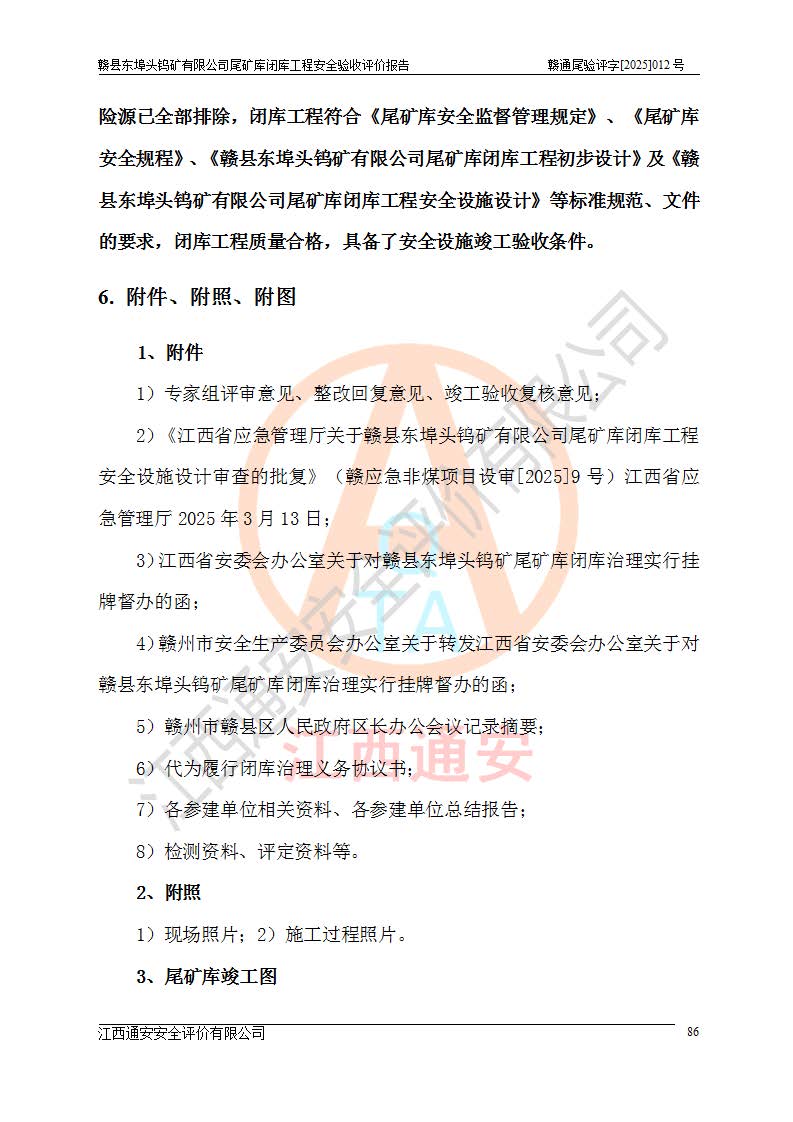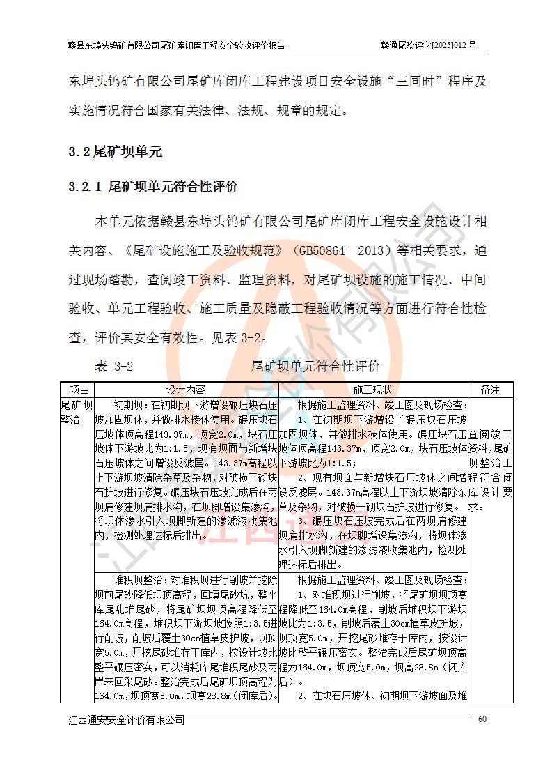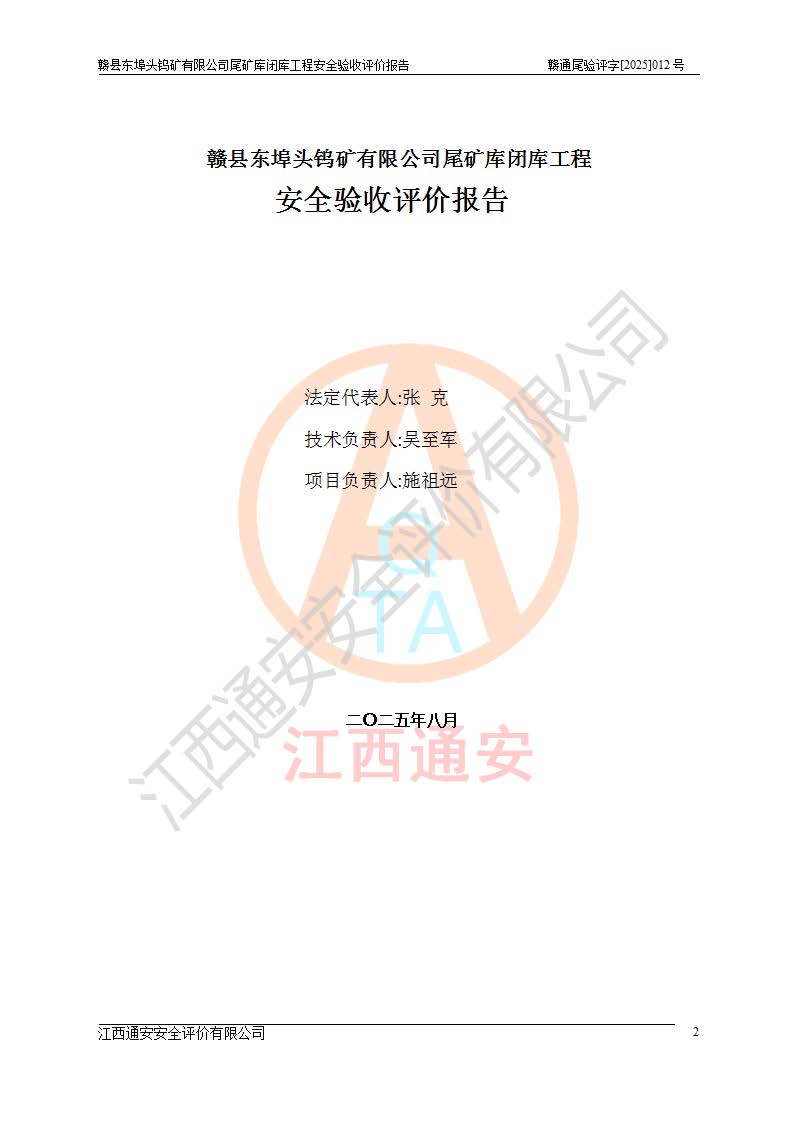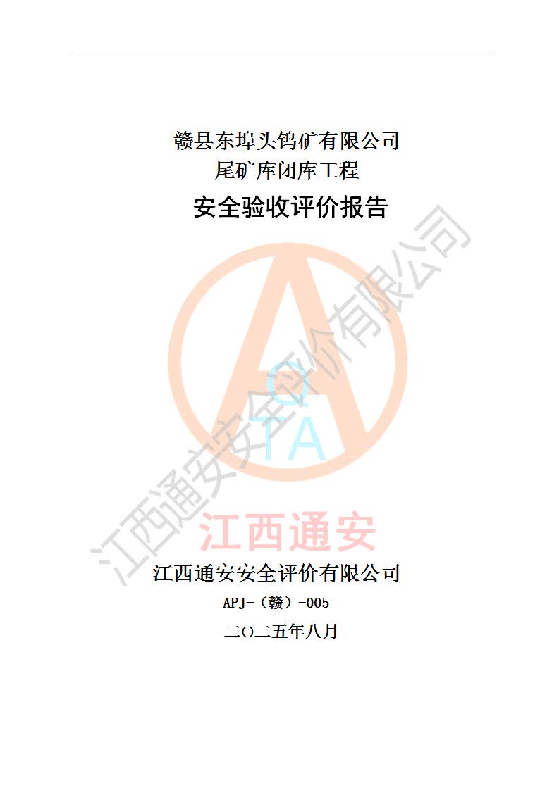 評(píng)價(jià)報(bào)告名稱 | 贛縣東埠頭鎢礦有限公司尾礦庫(kù)閉庫(kù)工程安全驗(yàn)收評(píng)價(jià)報(bào)告 | |||