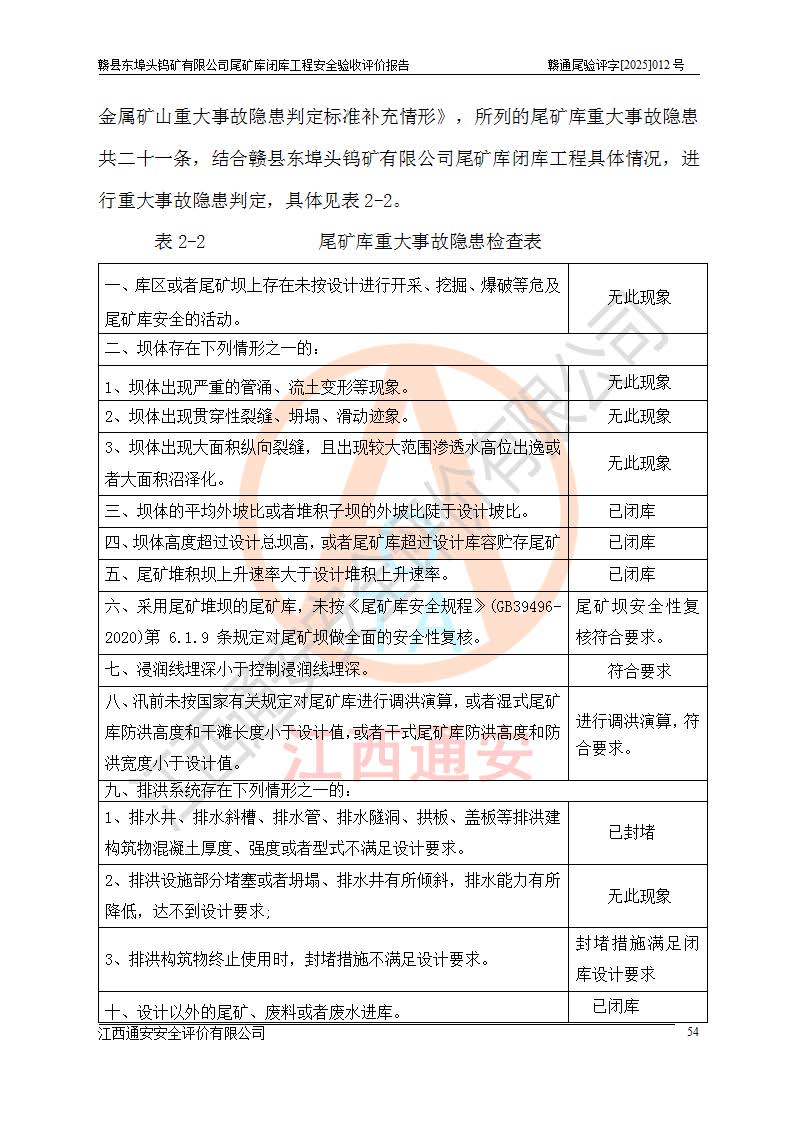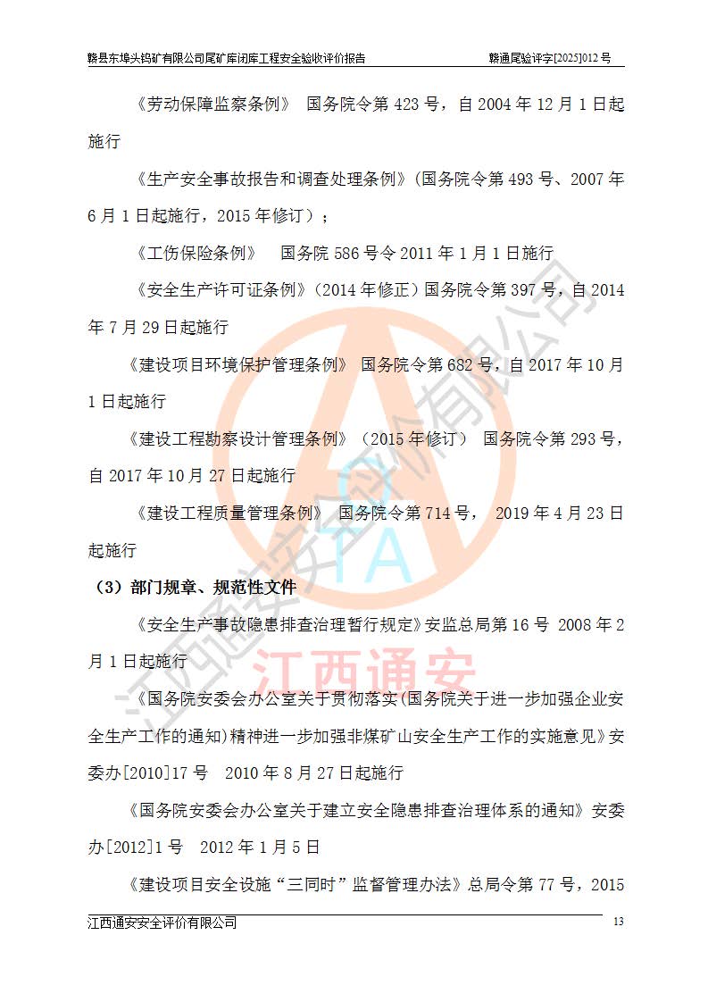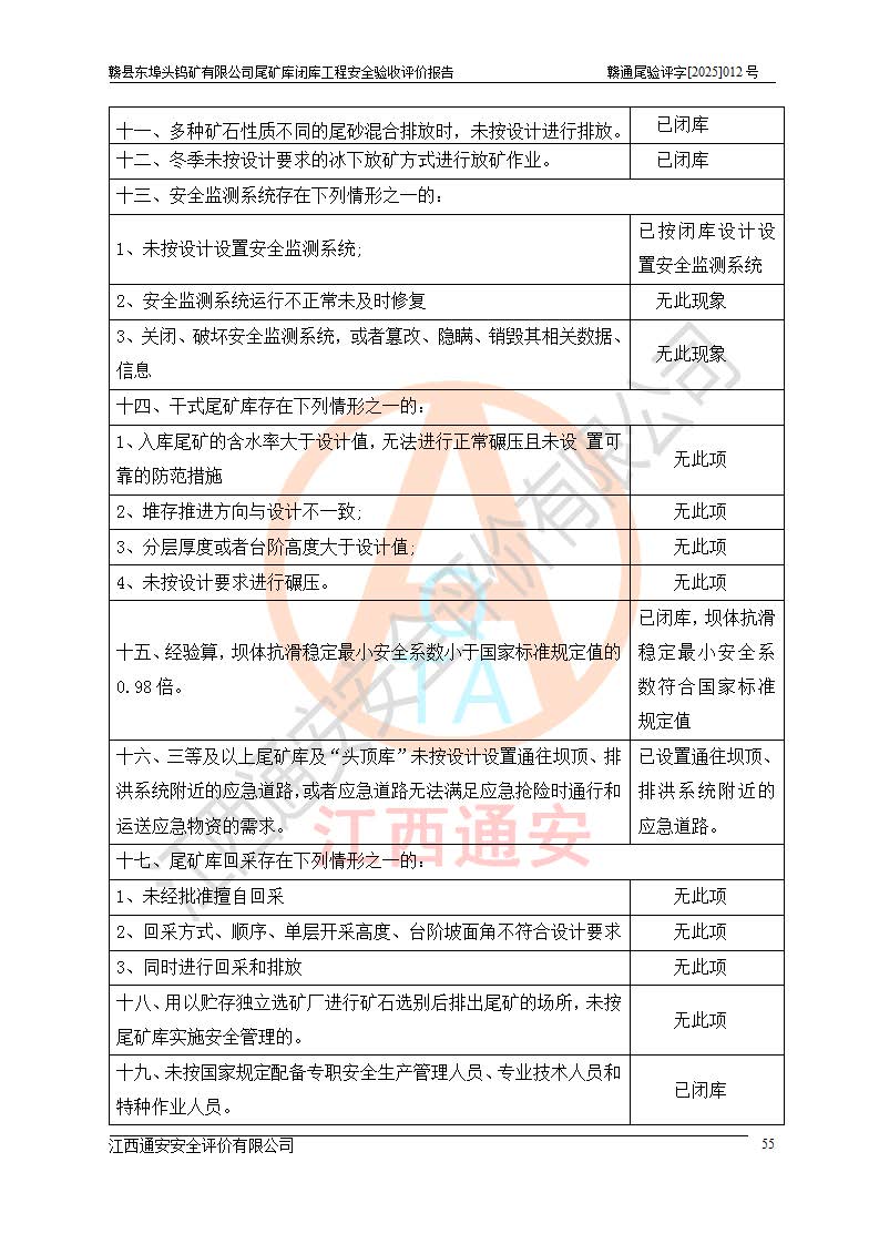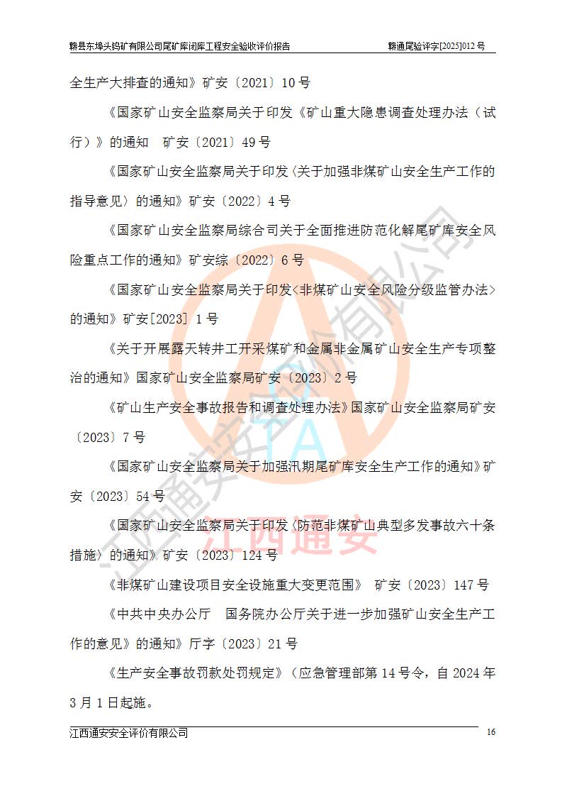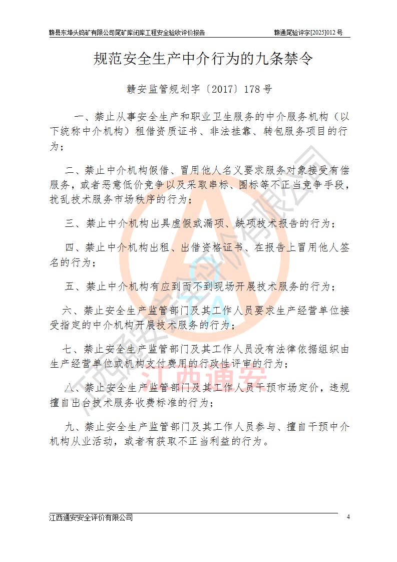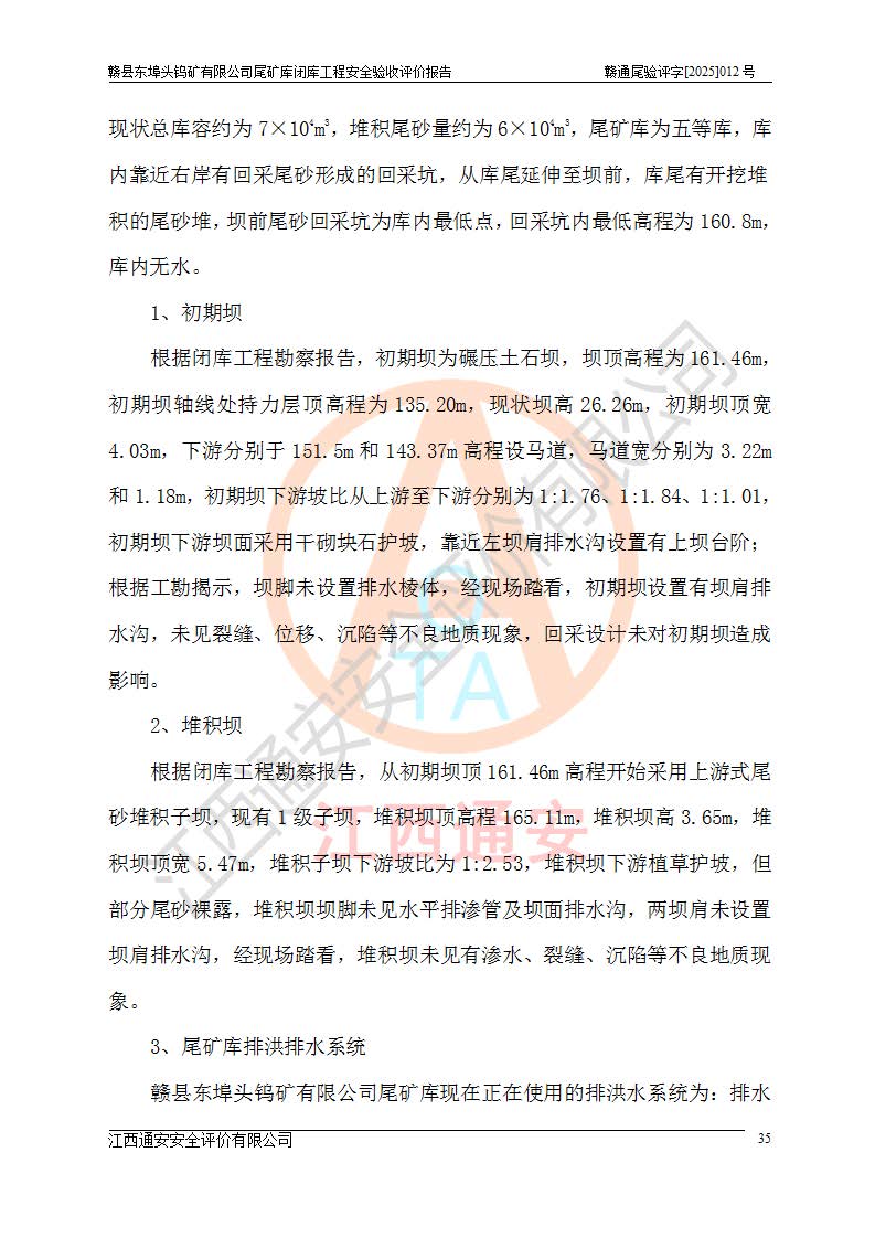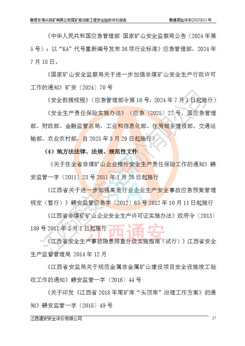 評(píng)價(jià)報(bào)告名稱 | 贛縣東埠頭鎢礦有限公司尾礦庫(kù)閉庫(kù)工程安全驗(yàn)收評(píng)價(jià)報(bào)告 | |||