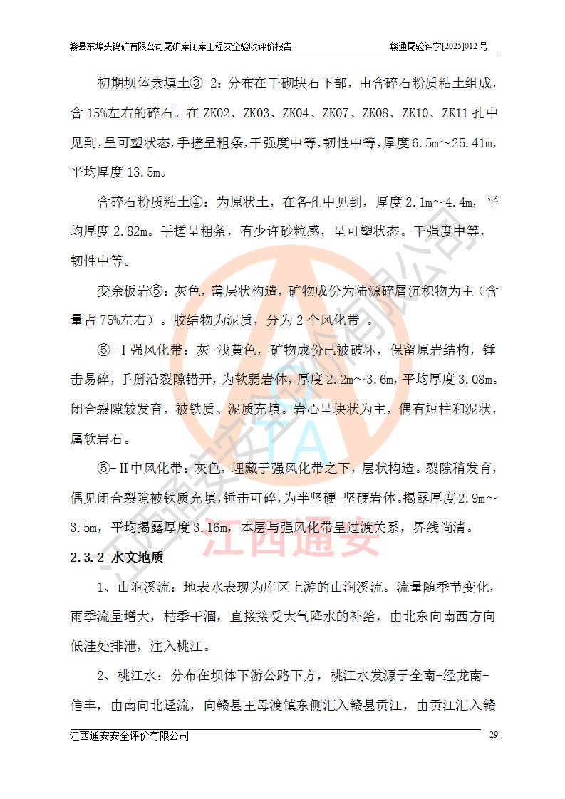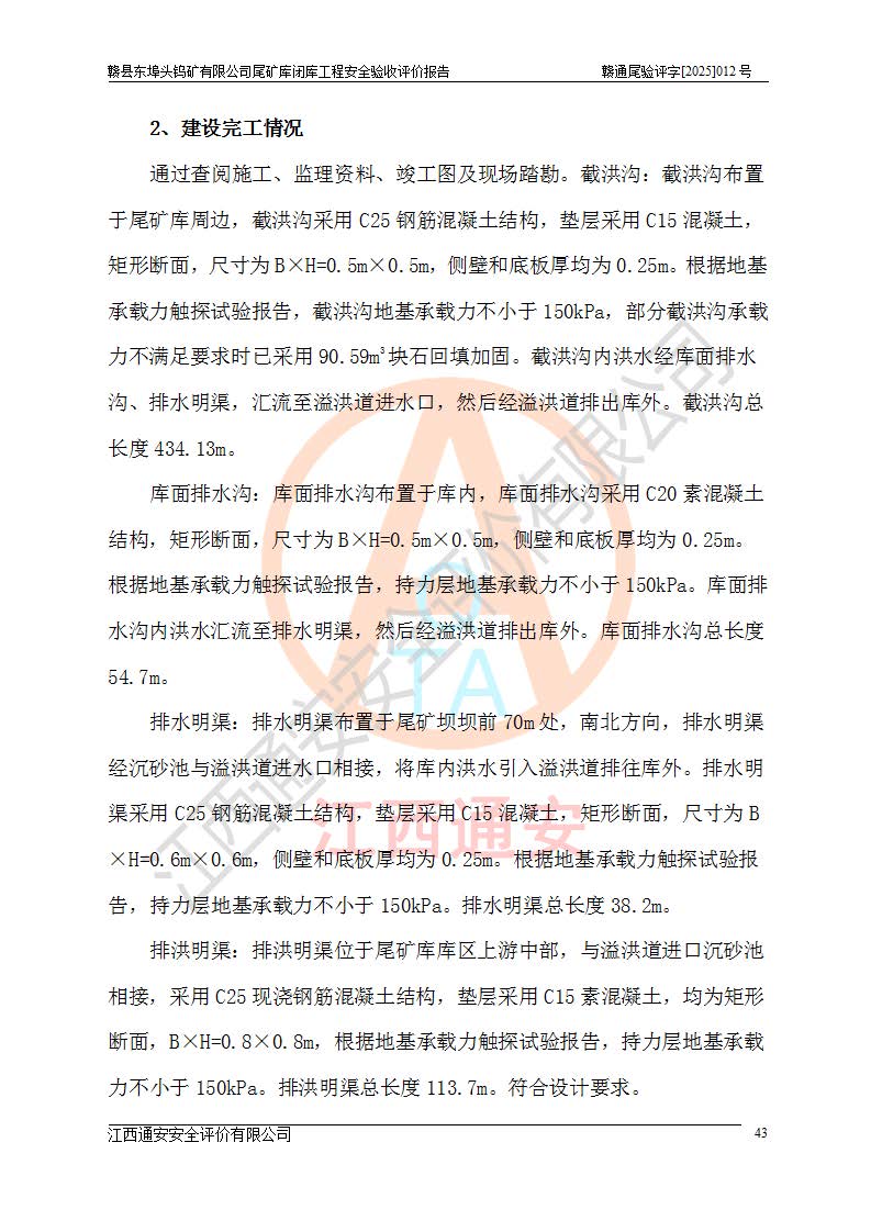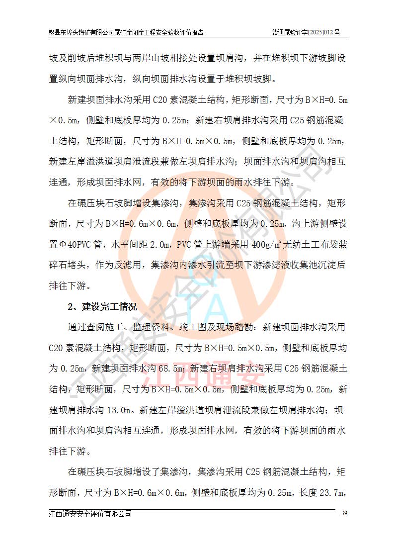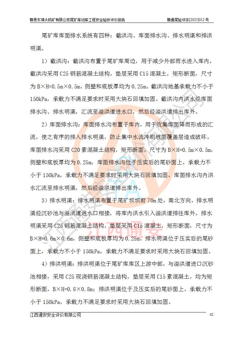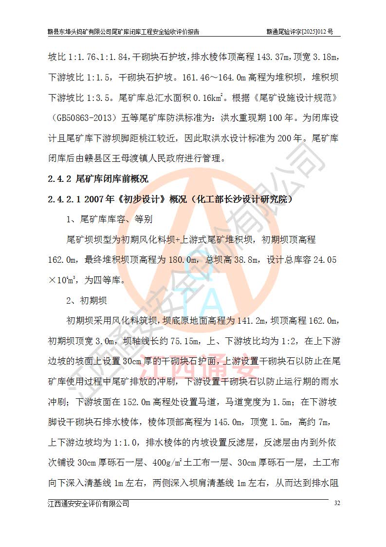 項(xiàng)目簡(jiǎn)介 | 贛縣東埠頭鎢礦有限公司尾礦庫(kù)位于江西省贛州市贛縣區(qū)王母渡鎮(zhèn),屬王母渡鎮(zhèn)行政管轄。北距大埠圩15km,南距桃江圩2.5km,礦區(qū)有三級(jí)公路經(jīng)過王母渡鎮(zhèn),王母渡鎮(zhèn)至尾礦庫(kù)有礦區(qū)公路與三級(jí)公路連接,即通往王母渡鎮(zhèn)的三級(jí)公路從尾礦壩前通過,尾礦庫(kù)下游為桃江河,交通較為便利。 贛縣東埠頭鎢礦有限公司尾礦庫(kù)于2007年6月由化工部長(zhǎng)沙設(shè)計(jì)研究院設(shè)計(jì),設(shè)計(jì)為初期風(fēng)化料壩+上游式尾礦堆積壩,初期壩頂高程162.0m,初期壩高20.8m,*終堆積壩頂高程為180.0m,總壩高38.8m,設(shè)計(jì)總庫(kù)容24.05×104m3,為四等庫(kù);尾礦庫(kù)2008年4月完成建設(shè),2009年12月首次取得了安全生產(chǎn)許可證,2013年3月礦山停產(chǎn)尾礦庫(kù)停止使用,2015年12月安全生產(chǎn)許可證到期;2016年3月由江西省煤礦設(shè)計(jì)院編制了尾砂回采利用設(shè)計(jì),經(jīng)原江西省安監(jiān)局批準(zhǔn)進(jìn)行尾砂回采,尾砂回采于2019年期滿后未申請(qǐng)延續(xù),尾礦庫(kù)一直停用至今。根據(jù)相關(guān)規(guī)定,停用時(shí)間*過3年的尾礦庫(kù),**在1年內(nèi)完成閉庫(kù)治理并銷號(hào),因此決定對(duì)東埠頭尾礦庫(kù)進(jìn)行閉庫(kù)。 2024年8月9日,江西省安全生產(chǎn)委員會(huì)辦公室下發(fā)了《江西省安委會(huì)辦公室關(guān)于對(duì)贛縣東埠頭鎢礦尾礦庫(kù)閉庫(kù)治理實(shí)行掛牌督辦的函》, 2024年8月22日,贛州市安全生產(chǎn)委員會(huì)辦公室下發(fā)了《關(guān)于轉(zhuǎn)發(fā)江西省安委會(huì)辦公室關(guān)于對(duì)贛縣東埠頭鎢礦尾礦庫(kù)閉庫(kù)治理實(shí)行掛牌督辦的函》,要求立即開展尾礦庫(kù)閉庫(kù)治理工程相關(guān)工作,于2025年6月前完成閉庫(kù)治理并銷號(hào)。 贛縣東埠頭鎢礦有限公司主體尚存,但瀕臨破產(chǎn),實(shí)質(zhì)上沒有能力履行尾礦庫(kù)閉庫(kù)主體責(zé)任,根據(jù)贛縣區(qū)人民**2024年12月6日區(qū)長(zhǎng)辦公會(huì)議記要精神,由贛州市贛縣區(qū)鄉(xiāng)村振興發(fā)展有限公司作為業(yè)主,實(shí)施贛縣東埠頭鎢礦有限公司尾礦庫(kù)閉庫(kù)工程。 2025年1月多貝建筑設(shè)計(jì)(西安)有限公司提交了《贛縣東埠頭鎢礦有限公司尾礦庫(kù)閉庫(kù)工程(水文)地質(zhì)勘察報(bào)告》,2025年2月江西通安安全評(píng)價(jià)有限公司提交了《贛縣東埠頭鎢礦有限公司尾礦庫(kù)閉庫(kù)工程安全現(xiàn)狀評(píng)價(jià)報(bào)告》,2025年3月金建工程設(shè)計(jì)有限公司出具了《贛縣東埠頭鎢礦有限公司尾礦庫(kù)閉庫(kù)工程安全設(shè)施設(shè)計(jì)》,并于2025年3月13日取得《江西省應(yīng)急管理廳關(guān)于贛縣東埠頭鎢礦有限公司尾礦庫(kù)閉庫(kù)工程安全設(shè)施設(shè)計(jì)審查的批復(fù)》(贛應(yīng)急非煤項(xiàng)目設(shè)審[2025]9號(hào)),該閉庫(kù)工程由山西華陸建設(shè)工程有限公司進(jìn)行施工,榮泰工程管理咨詢有限公司進(jìn)行監(jiān)理,該工程已2025年7月7日完工,現(xiàn)進(jìn)入驗(yàn)收程序。 根據(jù)《中華人民共和國(guó)安全生產(chǎn)法》,按照原**安全生產(chǎn)監(jiān)督管理總局《**安全監(jiān)管總局關(guān)于規(guī)范金屬非金屬礦山建設(shè)項(xiàng)目安全設(shè)施竣工驗(yàn)收工作的通知》(安監(jiān)總管一〔2016〕14號(hào))和《**安全監(jiān)管總局關(guān)于印發(fā)金屬非金屬礦山建設(shè)項(xiàng)目安全評(píng)價(jià)報(bào)告編寫提綱的通知》(安監(jiān)總管一〔2016〕49號(hào))的具體要求,受贛州市贛縣區(qū)鄉(xiāng)村振興發(fā)展有限公司委托,我公司承擔(dān)該尾礦庫(kù)閉庫(kù)工程的安全驗(yàn)收評(píng)價(jià)工作。 | |||