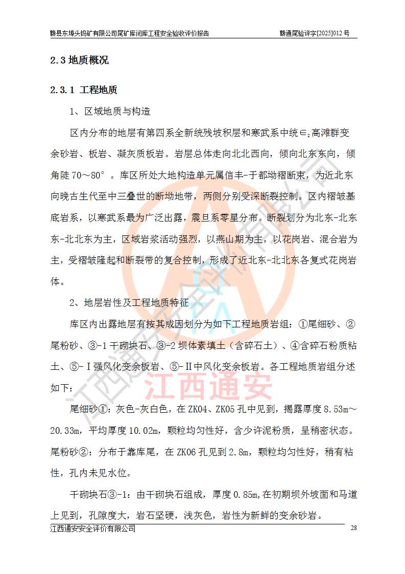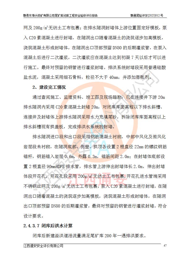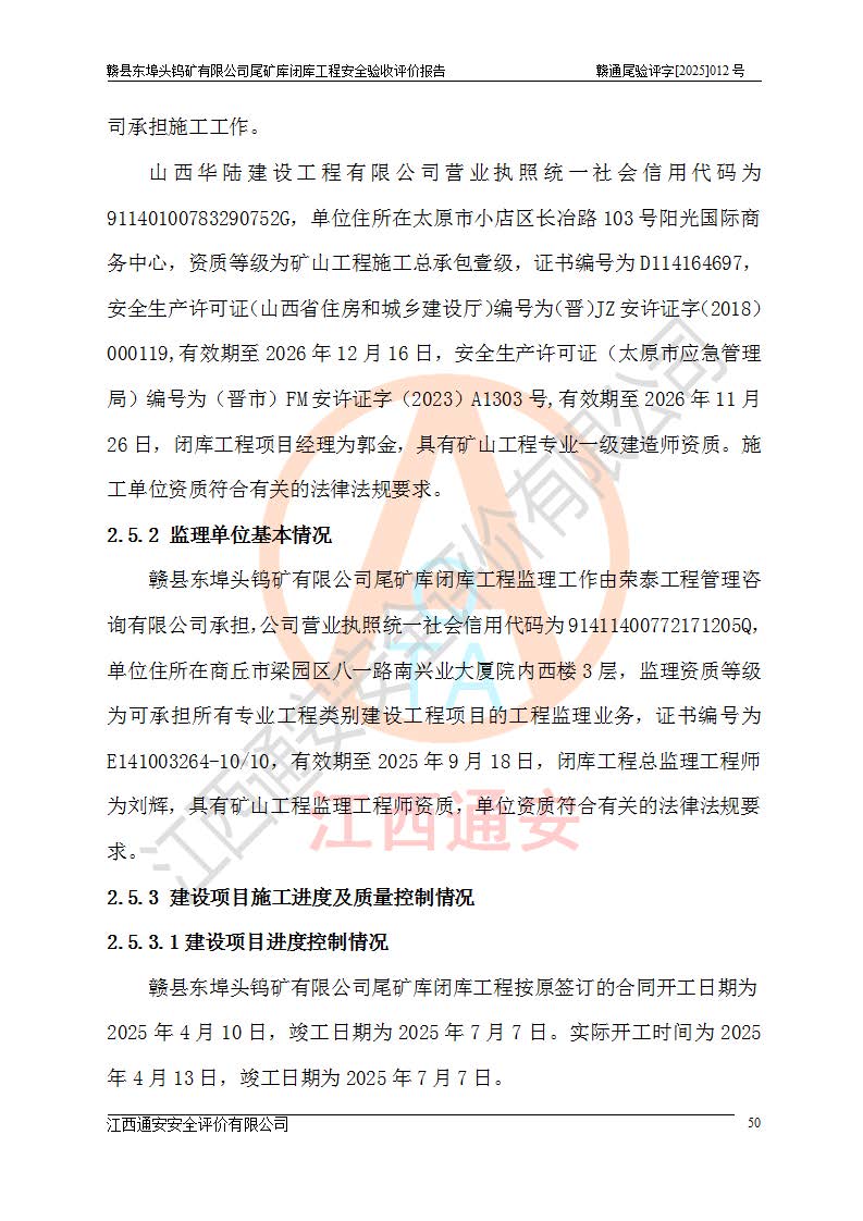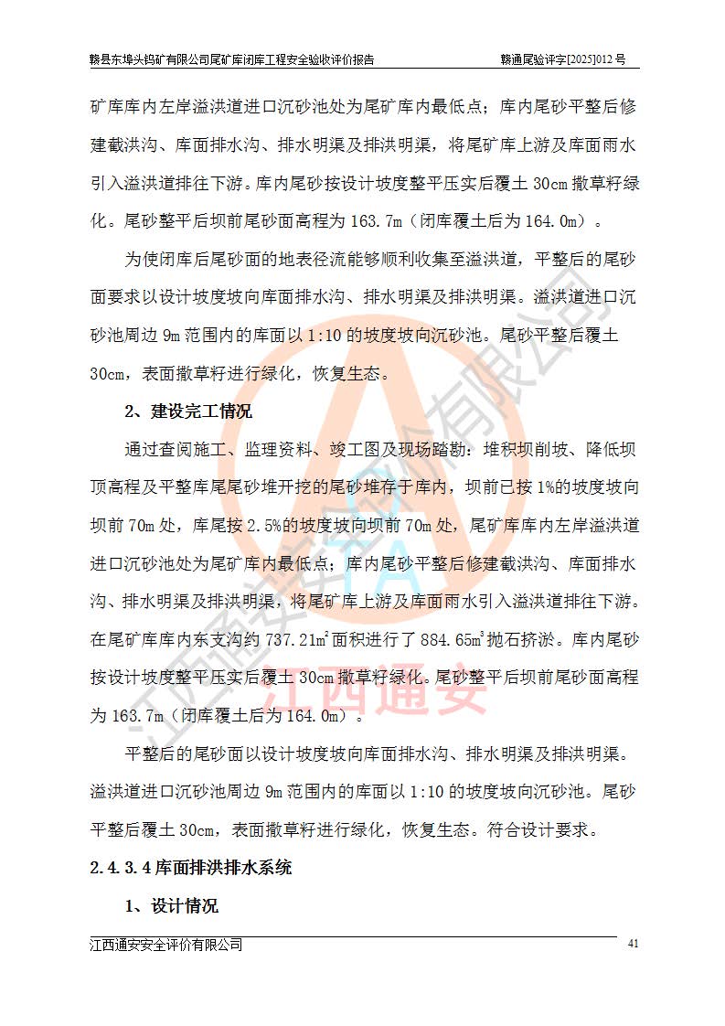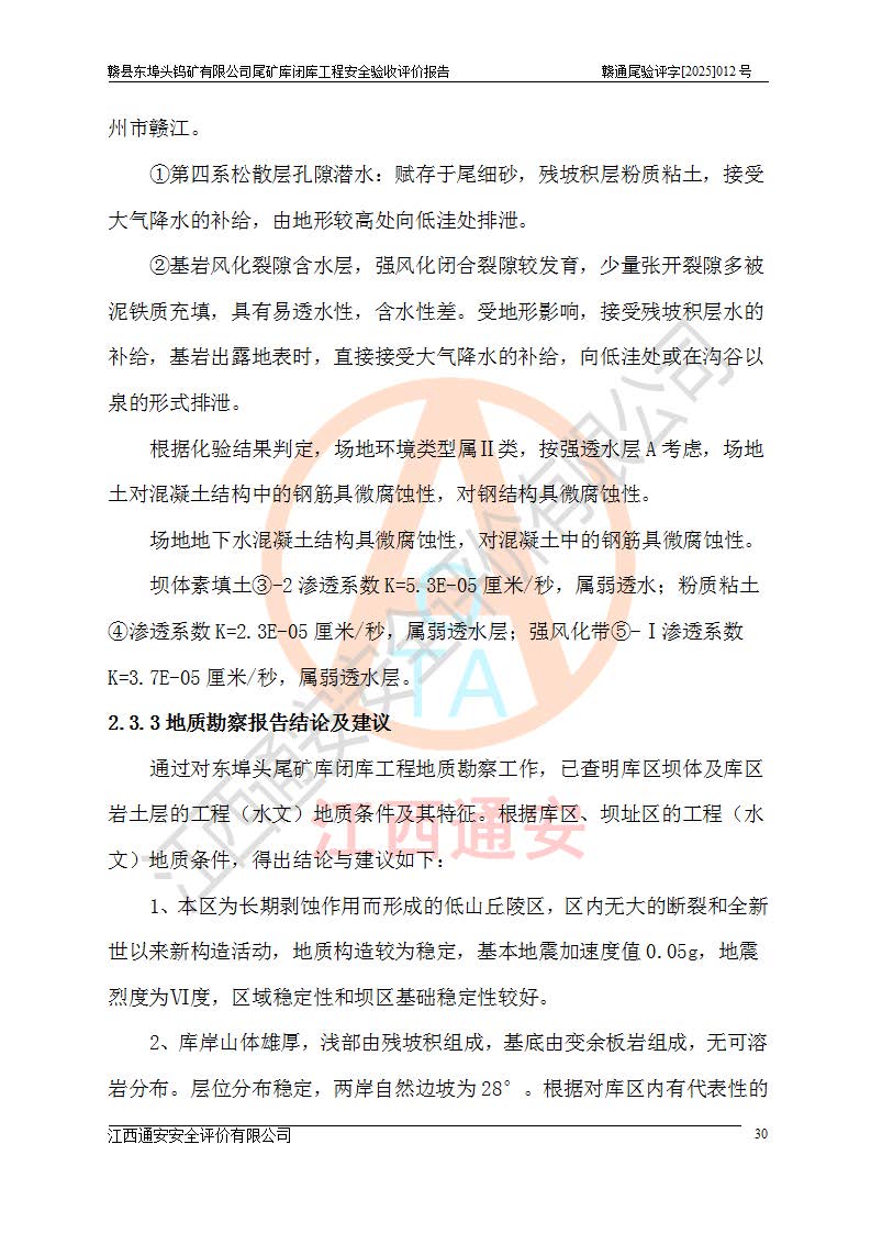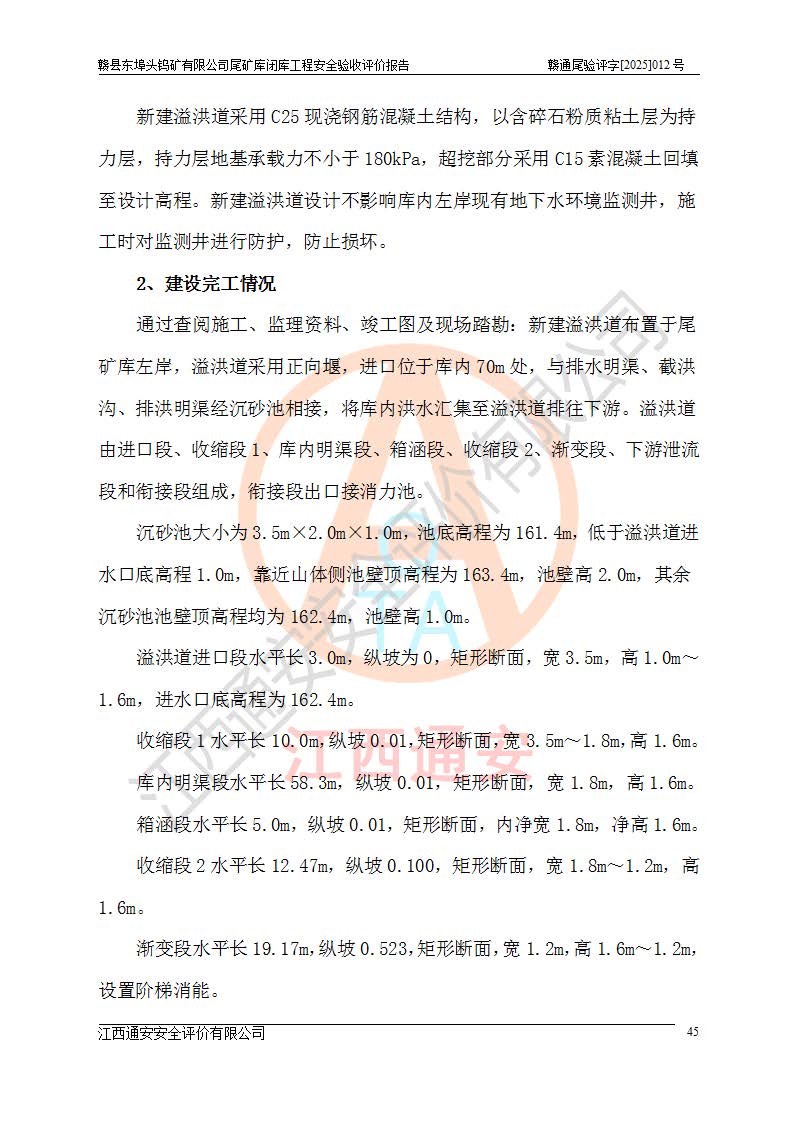 項(xiàng)目簡(jiǎn)介 | 贛縣東埠頭鎢礦有限公司尾礦庫(kù)位于江西省贛州市贛縣區(qū)王母渡鎮(zhèn),屬王母渡鎮(zhèn)行政管轄。北距大埠圩15km,南距桃江圩2.5km,礦區(qū)有三級(jí)公路經(jīng)過王母渡鎮(zhèn),王母渡鎮(zhèn)至尾礦庫(kù)有礦區(qū)公路與三級(jí)公路連接,即通往王母渡鎮(zhèn)的三級(jí)公路從尾礦壩前通過,尾礦庫(kù)下游為桃江河,交通較為便利。 贛縣東埠頭鎢礦有限公司尾礦庫(kù)于2007年6月由化工部長(zhǎng)沙設(shè)計(jì)研究院設(shè)計(jì),設(shè)計(jì)為初期風(fēng)化料壩+上游式尾礦堆積壩,初期壩頂高程162.0m,初期壩高20.8m,*終堆積壩頂高程為180.0m,總壩高38.8m,設(shè)計(jì)總庫(kù)容24.05×104m3,為四等庫(kù);尾礦庫(kù)2008年4月完成建設(shè),2009年12月首次取得了安全生產(chǎn)許可證,2013年3月礦山停產(chǎn)尾礦庫(kù)停止使用,2015年12月安全生產(chǎn)許可證到期;2016年3月由江西省煤礦設(shè)計(jì)院編制了尾砂回采利用設(shè)計(jì),經(jīng)原江西省安監(jiān)局批準(zhǔn)進(jìn)行尾砂回采,尾砂回采于2019年期滿后未申請(qǐng)延續(xù),尾礦庫(kù)一直停用至今。根據(jù)相關(guān)規(guī)定,停用時(shí)間*過3年的尾礦庫(kù),**在1年內(nèi)完成閉庫(kù)治理并銷號(hào),因此決定對(duì)東埠頭尾礦庫(kù)進(jìn)行閉庫(kù)。 2024年8月9日,江西省安全生產(chǎn)委員會(huì)辦公室下發(fā)了《江西省安委會(huì)辦公室關(guān)于對(duì)贛縣東埠頭鎢礦尾礦庫(kù)閉庫(kù)治理實(shí)行掛牌督辦的函》, 2024年8月22日,贛州市安全生產(chǎn)委員會(huì)辦公室下發(fā)了《關(guān)于轉(zhuǎn)發(fā)江西省安委會(huì)辦公室關(guān)于對(duì)贛縣東埠頭鎢礦尾礦庫(kù)閉庫(kù)治理實(shí)行掛牌督辦的函》,要求立即開展尾礦庫(kù)閉庫(kù)治理工程相關(guān)工作,于2025年6月前完成閉庫(kù)治理并銷號(hào)。 贛縣東埠頭鎢礦有限公司主體尚存,但瀕臨破產(chǎn),實(shí)質(zhì)上沒有能力履行尾礦庫(kù)閉庫(kù)主體責(zé)任,根據(jù)贛縣區(qū)人民**2024年12月6日區(qū)長(zhǎng)辦公會(huì)議記要精神,由贛州市贛縣區(qū)鄉(xiāng)村振興發(fā)展有限公司作為業(yè)主,實(shí)施贛縣東埠頭鎢礦有限公司尾礦庫(kù)閉庫(kù)工程。 2025年1月多貝建筑設(shè)計(jì)(西安)有限公司提交了《贛縣東埠頭鎢礦有限公司尾礦庫(kù)閉庫(kù)工程(水文)地質(zhì)勘察報(bào)告》,2025年2月江西通安安全評(píng)價(jià)有限公司提交了《贛縣東埠頭鎢礦有限公司尾礦庫(kù)閉庫(kù)工程安全現(xiàn)狀評(píng)價(jià)報(bào)告》,2025年3月金建工程設(shè)計(jì)有限公司出具了《贛縣東埠頭鎢礦有限公司尾礦庫(kù)閉庫(kù)工程安全設(shè)施設(shè)計(jì)》,并于2025年3月13日取得《江西省應(yīng)急管理廳關(guān)于贛縣東埠頭鎢礦有限公司尾礦庫(kù)閉庫(kù)工程安全設(shè)施設(shè)計(jì)審查的批復(fù)》(贛應(yīng)急非煤項(xiàng)目設(shè)審[2025]9號(hào)),該閉庫(kù)工程由山西華陸建設(shè)工程有限公司進(jìn)行施工,榮泰工程管理咨詢有限公司進(jìn)行監(jiān)理,該工程已2025年7月7日完工,現(xiàn)進(jìn)入驗(yàn)收程序。 根據(jù)《中華人民共和國(guó)安全生產(chǎn)法》,按照原**安全生產(chǎn)監(jiān)督管理總局《**安全監(jiān)管總局關(guān)于規(guī)范金屬非金屬礦山建設(shè)項(xiàng)目安全設(shè)施竣工驗(yàn)收工作的通知》(安監(jiān)總管一〔2016〕14號(hào))和《**安全監(jiān)管總局關(guān)于印發(fā)金屬非金屬礦山建設(shè)項(xiàng)目安全評(píng)價(jià)報(bào)告編寫提綱的通知》(安監(jiān)總管一〔2016〕49號(hào))的具體要求,受贛州市贛縣區(qū)鄉(xiāng)村振興發(fā)展有限公司委托,我公司承擔(dān)該尾礦庫(kù)閉庫(kù)工程的安全驗(yàn)收評(píng)價(jià)工作。 | |||