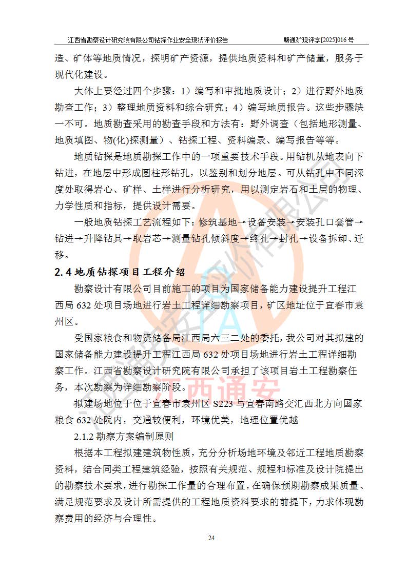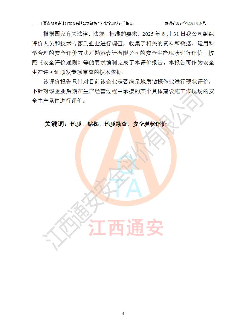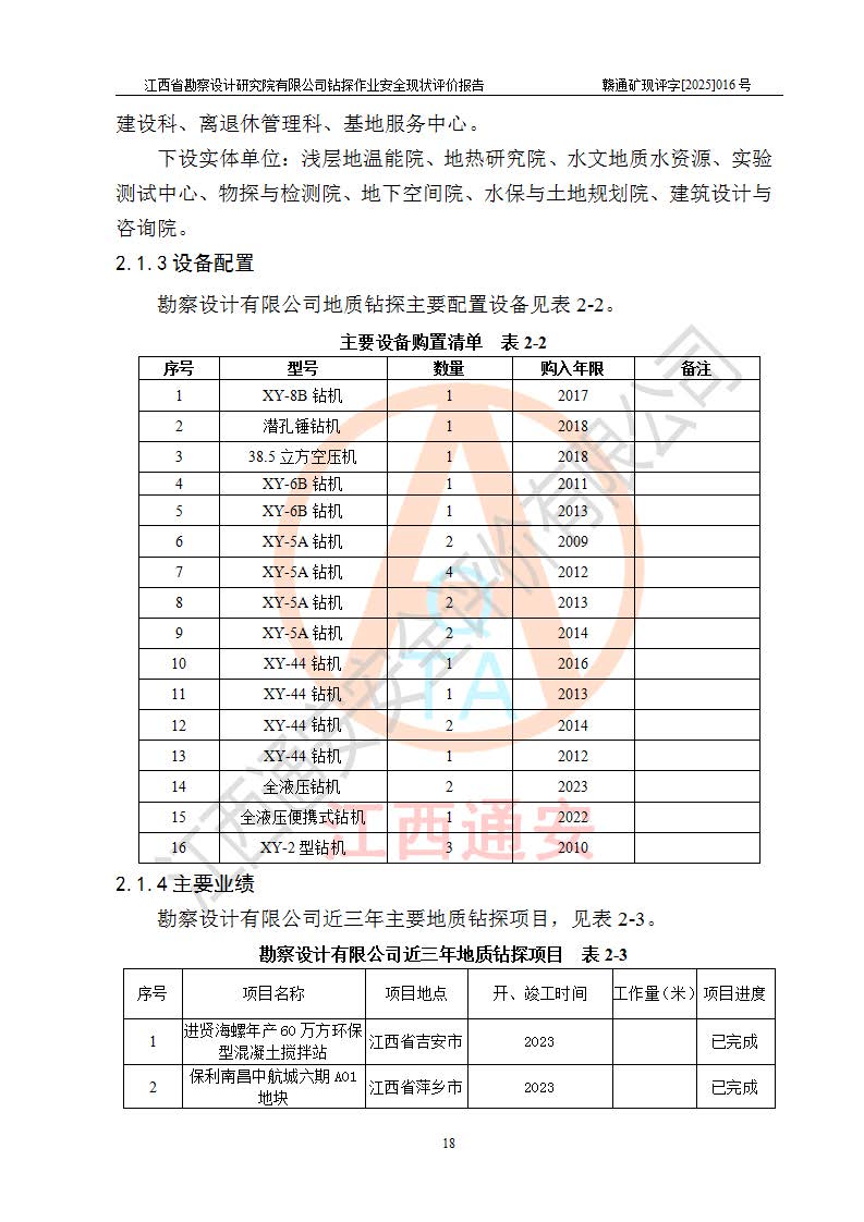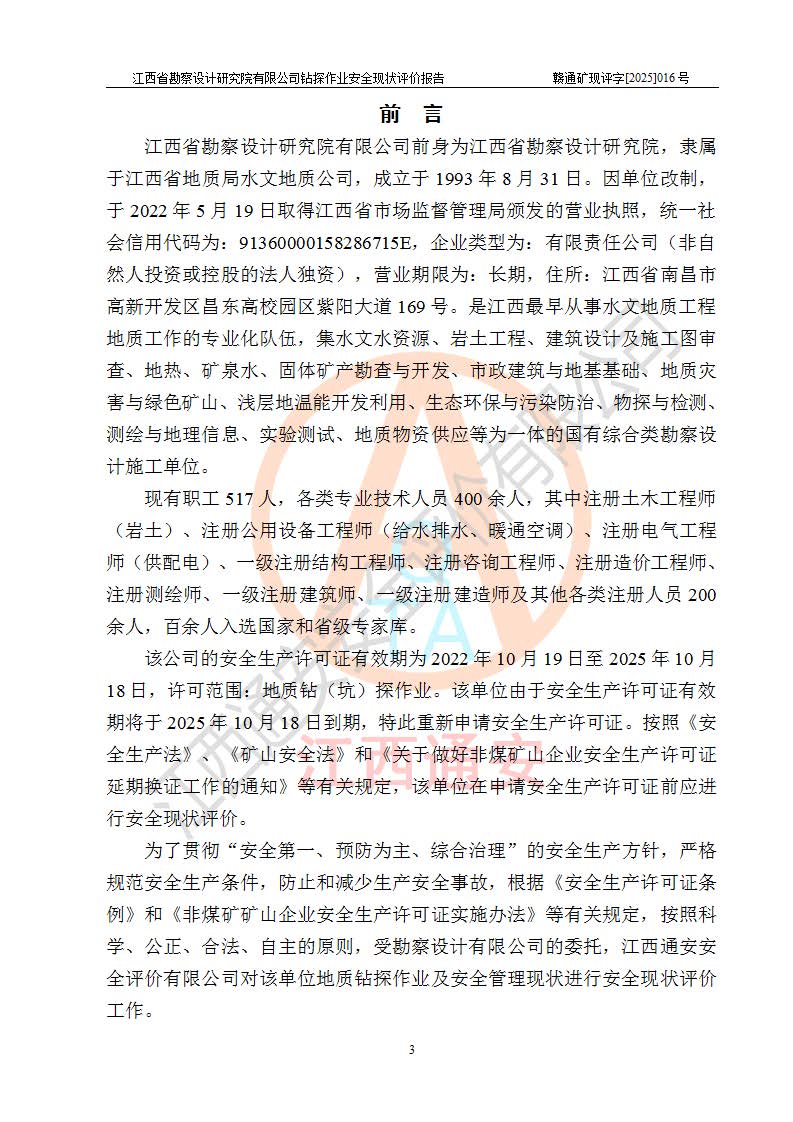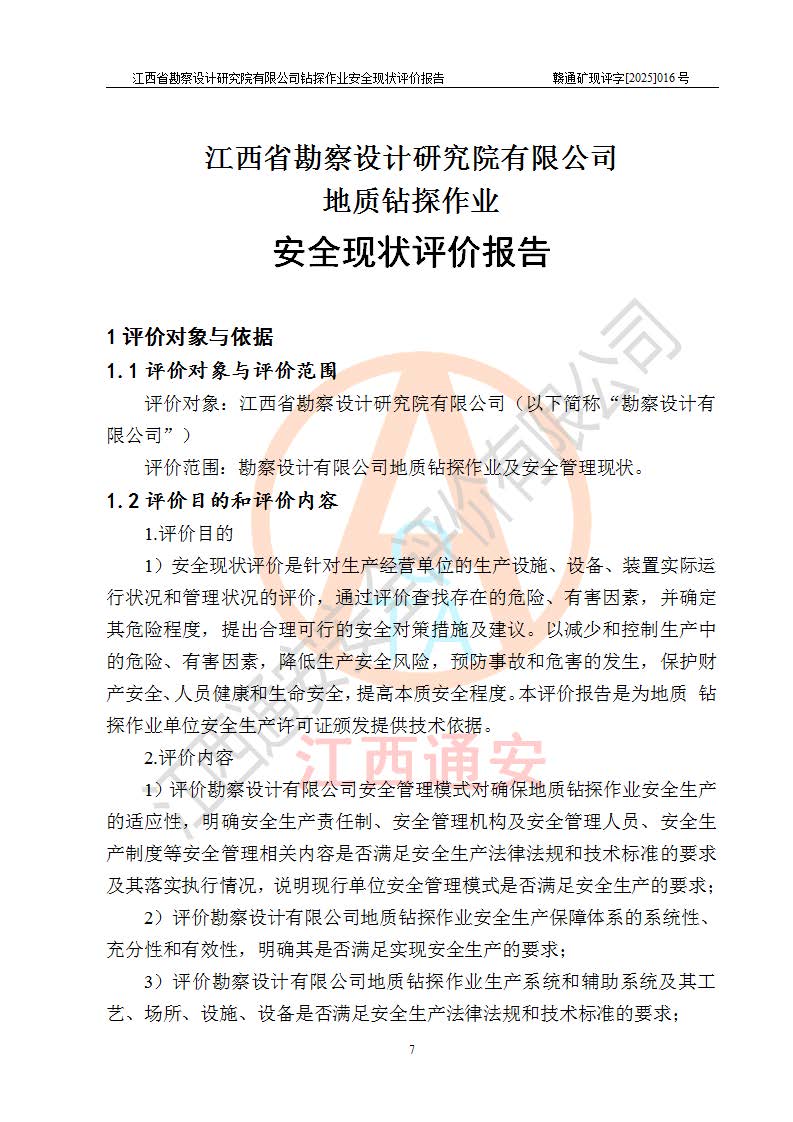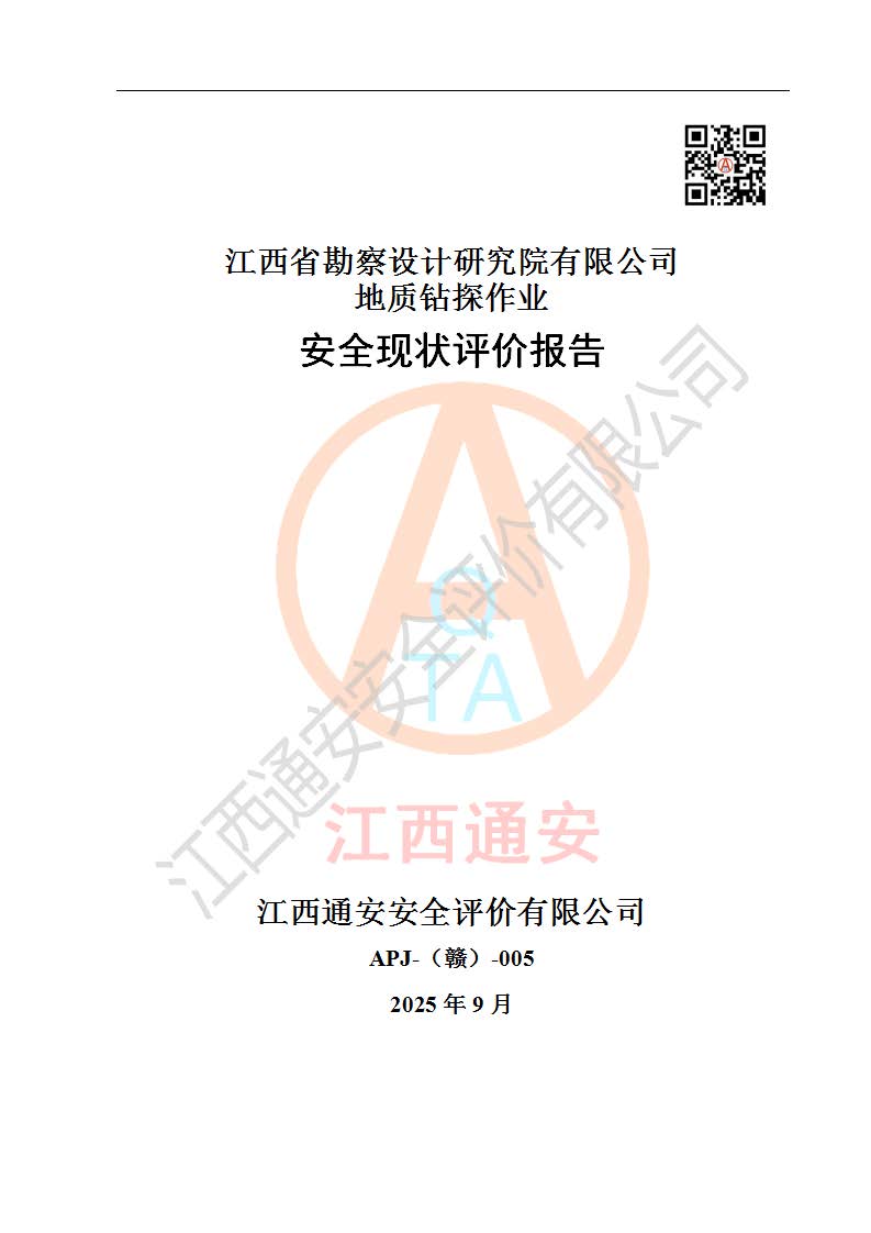 報告名稱 | 江西省勘察設(shè)計研究院有限公司地質(zhì)鉆探作業(yè)安全現(xiàn)狀評價報告 | |||||