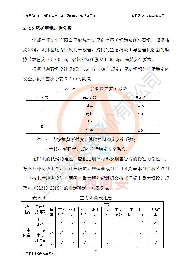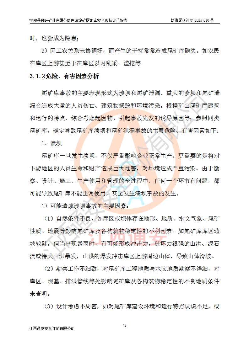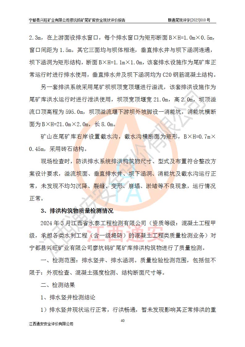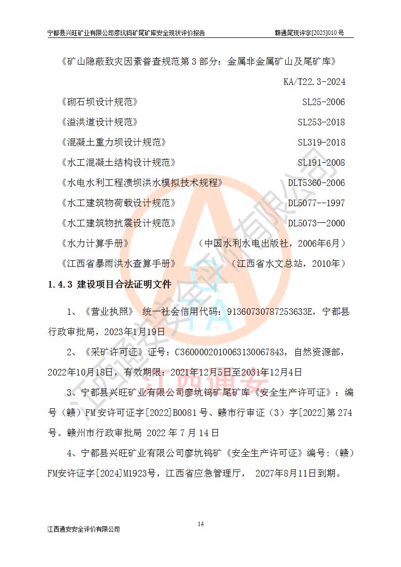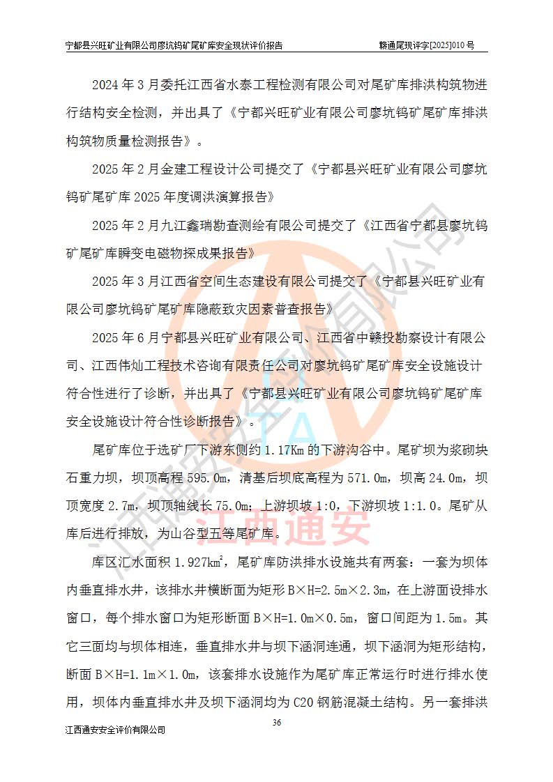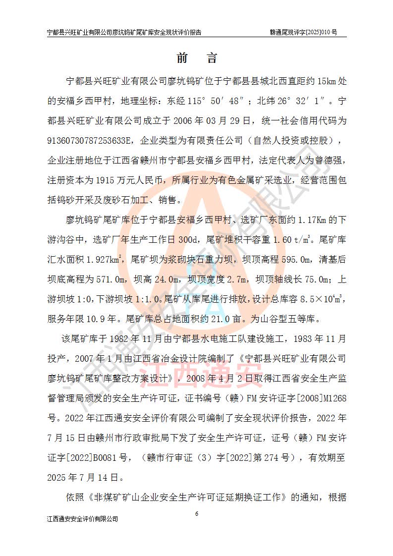 寧都縣興旺礦業(yè)有限公司廖坑鎢礦位于寧都縣縣城北西直距約15km處的安福鄉(xiāng)西甲村,地理坐標(biāo):東經(jīng)115°50′48″;北緯26°32′1″。寧都縣興旺礦業(yè)有限公司成立于2006年03月29日,統(tǒng)一社會信用代碼為91360730787253633E,企業(yè)類型為有限責(zé)任公司(自然人投資或控股),企業(yè)注冊地位于江西省贛州市寧都縣安福鄉(xiāng)西甲村,法定**人為曾德強(qiáng),注冊資本為1915萬元人民幣,所屬行業(yè)為有色金屬礦采選業(yè),經(jīng)營范圍包括鎢砂開采及廢砂石加工、銷售。 廖坑鎢礦尾礦庫位于寧都縣安福鄉(xiāng)西甲村、選礦廠東面約1.17Km的下游溝谷中,選礦廠年生產(chǎn)工作日300d,尾礦堆積干容重1.60 t/m3。尾礦庫匯水面積1.927km2,尾礦壩為漿砌塊石重力壩,壩頂高程595.0m,清基后壩底高程為571.0m,壩高24.0m,壩頂寬度2.7m,壩頂軸線長75.0m;上游壩坡1:0,下游壩坡1:1.0。尾礦從庫尾進(jìn)行排放,設(shè)計總庫容8.5×104m3,服務(wù)年限10.9年。尾礦庫總占地面積約21.0畝。為山谷型五等庫。 該尾礦庫于1982年11月由寧都縣水電施工隊建設(shè)施工,1983年11月投產(chǎn),2007年1月由江西省冶金設(shè)計院編制了《寧都縣興旺礦業(yè)有限公司廖坑鎢礦尾礦庫整改方案設(shè)計》,2008年4月2日取得江西省安全生產(chǎn)監(jiān)督管理局頒發(fā)的安全生產(chǎn)許可證,證書編號(贛)FM安許證字[2008]M1268號。2022年江西通安安全評價有限公司編制了安全現(xiàn)狀評價報告,2022年7月15日由贛州市行政審批局下發(fā)了安全生產(chǎn)許可證,證號(贛)FM安許證字[2022]B0081號,(贛市行審證(3)字[2022]第274號),**期至2025年7月14日。 依照《非煤礦礦山企業(yè)安全生產(chǎn)許可證延期換證工作》的通知,根據(jù)***《安全生產(chǎn)許可證條例》、《江西省安全生產(chǎn)條例》、《非煤礦山安全生產(chǎn)許可證實施辦法》、《江西省非煤礦礦山企業(yè)安全生產(chǎn)許可證辦法》規(guī)定及非煤礦山安全評價導(dǎo)則的要求,受寧都縣興旺礦業(yè)有限公司的委托,我公司承擔(dān)廖坑鎢礦尾礦庫延期換證的安全現(xiàn)狀評價工作。 |
