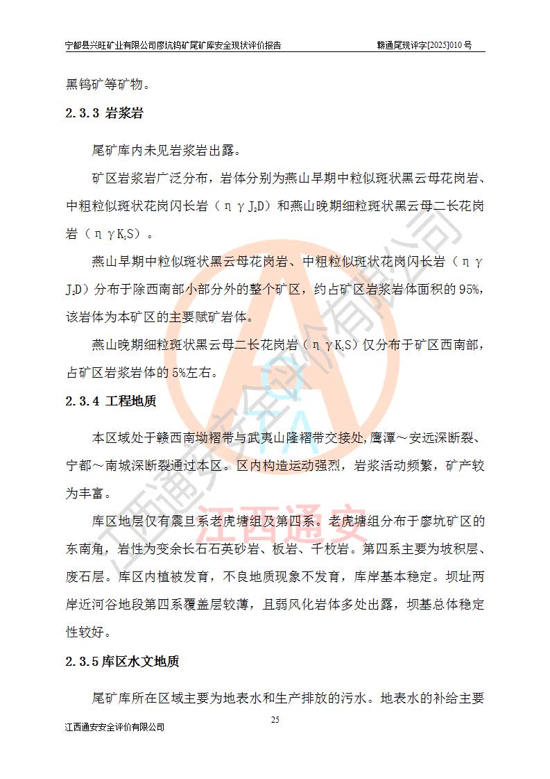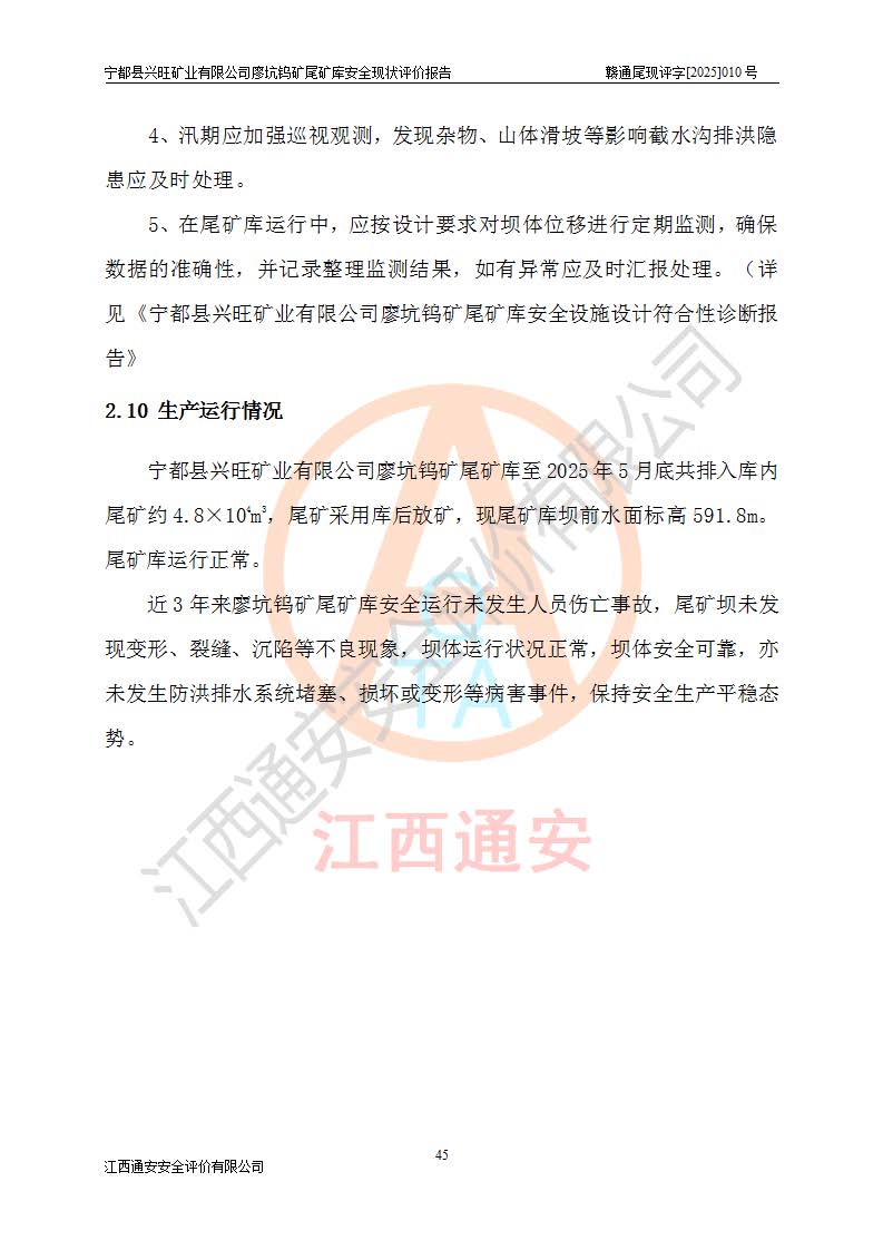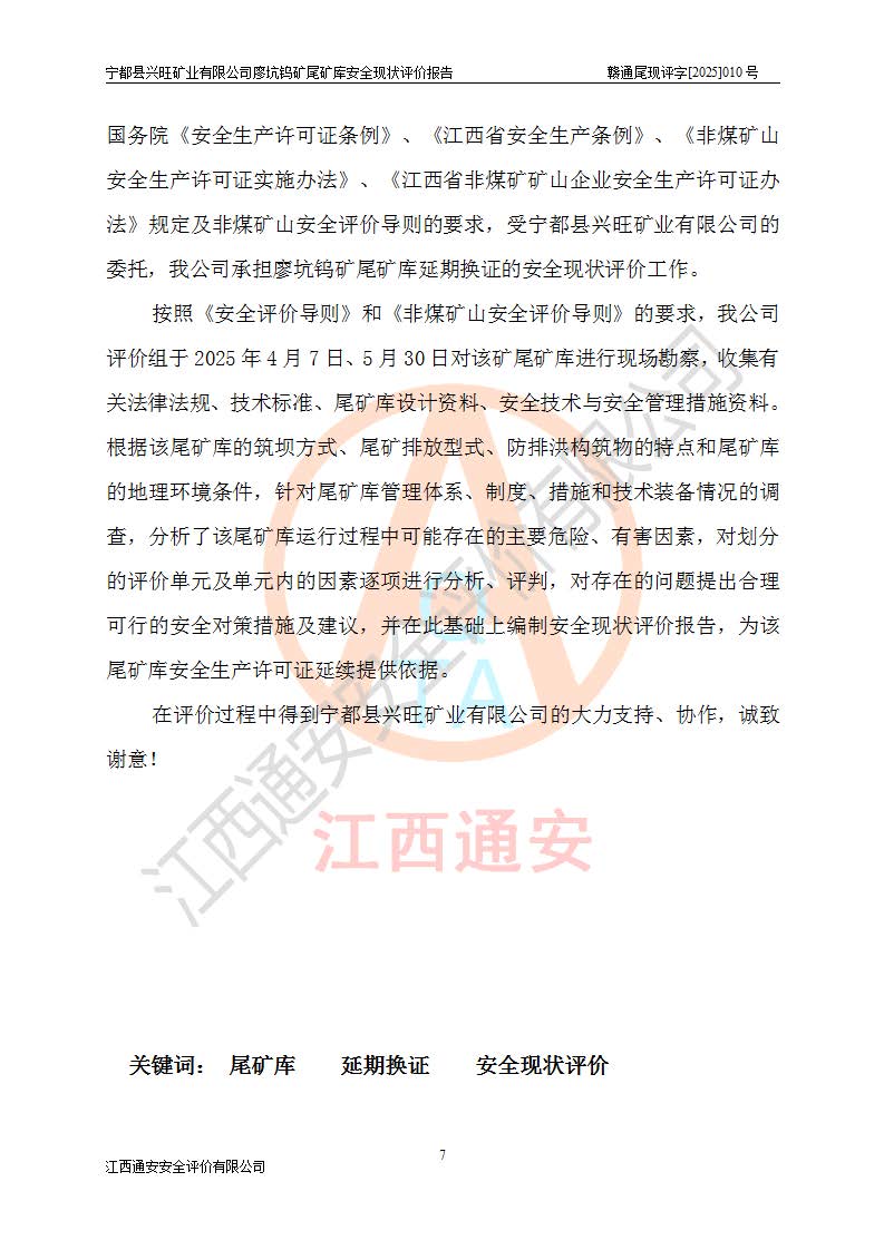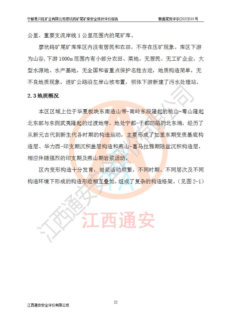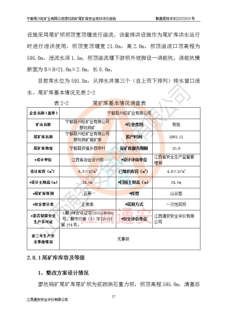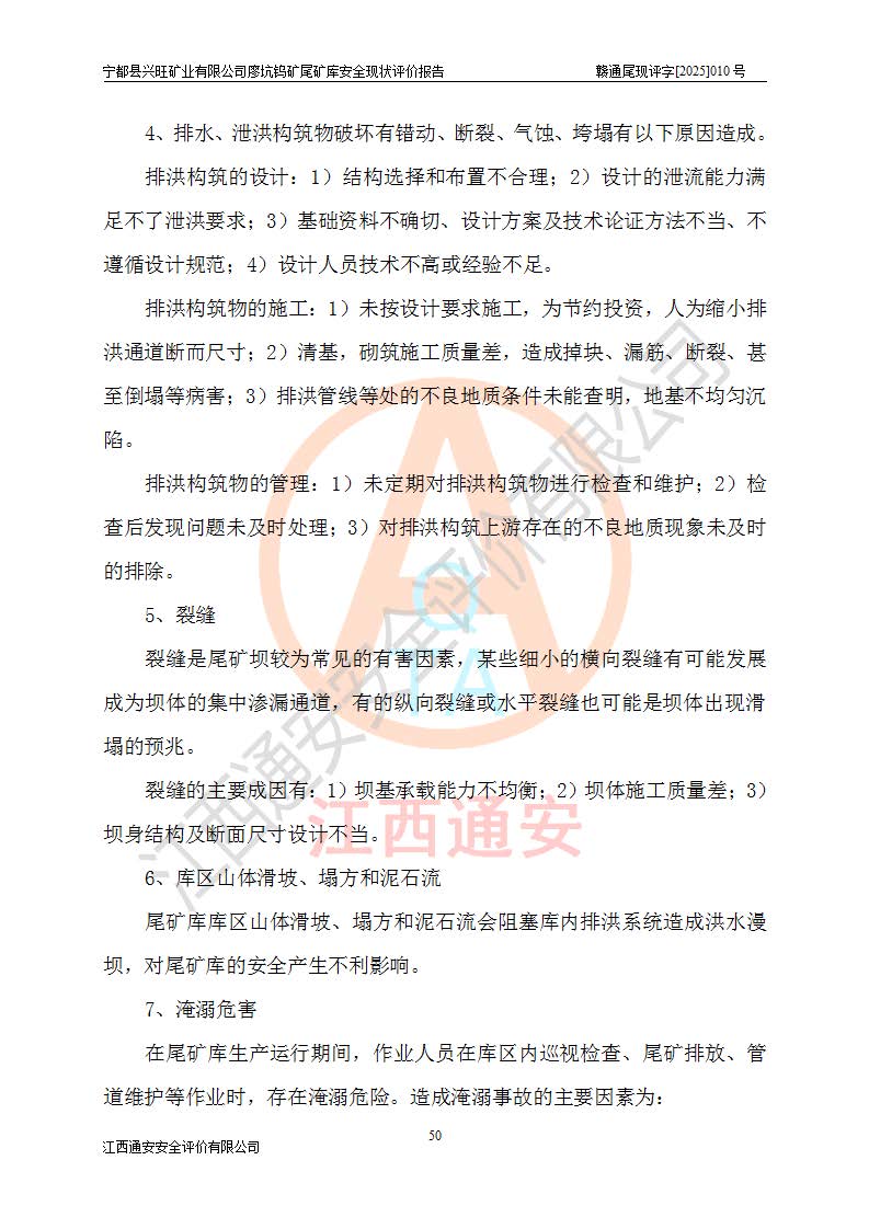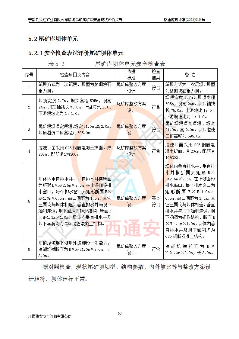 寧都縣興旺礦業(yè)有限公司廖坑鎢礦位于寧都縣縣城北西直距約15km處的安福鄉(xiāng)西甲村,地理坐標(biāo):東經(jīng)115°50′48″;北緯26°32′1″。寧都縣興旺礦業(yè)有限公司成立于2006年03月29日,統(tǒng)一社會信用代碼為91360730787253633E,企業(yè)類型為有限責(zé)任公司(自然人投資或控股),企業(yè)注冊地位于江西省贛州市寧都縣安福鄉(xiāng)西甲村,法定**人為曾德強(qiáng),注冊資本為1915萬元人民幣,所屬行業(yè)為有色金屬礦采選業(yè),經(jīng)營范圍包括鎢砂開采及廢砂石加工、銷售。 廖坑鎢礦尾礦庫位于寧都縣安福鄉(xiāng)西甲村、選礦廠東面約1.17Km的下游溝谷中,選礦廠年生產(chǎn)工作日300d,尾礦堆積干容重1.60 t/m3。尾礦庫匯水面積1.927km2,尾礦壩為漿砌塊石重力壩,壩頂高程595.0m,清基后壩底高程為571.0m,壩高24.0m,壩頂寬度2.7m,壩頂軸線長75.0m;上游壩坡1:0,下游壩坡1:1.0。尾礦從庫尾進(jìn)行排放,設(shè)計總庫容8.5×104m3,服務(wù)年限10.9年。尾礦庫總占地面積約21.0畝。為山谷型五等庫。 該尾礦庫于1982年11月由寧都縣水電施工隊建設(shè)施工,1983年11月投產(chǎn),2007年1月由江西省冶金設(shè)計院編制了《寧都縣興旺礦業(yè)有限公司廖坑鎢礦尾礦庫整改方案設(shè)計》,2008年4月2日取得江西省安全生產(chǎn)監(jiān)督管理局頒發(fā)的安全生產(chǎn)許可證,證書編號(贛)FM安許證字[2008]M1268號。2022年江西通安安全評價有限公司編制了安全現(xiàn)狀評價報告,2022年7月15日由贛州市行政審批局下發(fā)了安全生產(chǎn)許可證,證號(贛)FM安許證字[2022]B0081號,(贛市行審證(3)字[2022]第274號),**期至2025年7月14日。 依照《非煤礦礦山企業(yè)安全生產(chǎn)許可證延期換證工作》的通知,根據(jù)***《安全生產(chǎn)許可證條例》、《江西省安全生產(chǎn)條例》、《非煤礦山安全生產(chǎn)許可證實施辦法》、《江西省非煤礦礦山企業(yè)安全生產(chǎn)許可證辦法》規(guī)定及非煤礦山安全評價導(dǎo)則的要求,受寧都縣興旺礦業(yè)有限公司的委托,我公司承擔(dān)廖坑鎢礦尾礦庫延期換證的安全現(xiàn)狀評價工作。 |