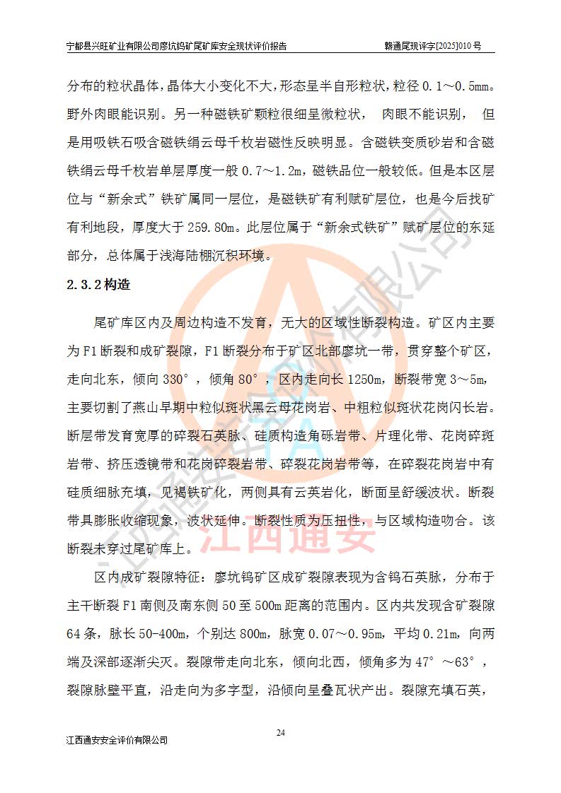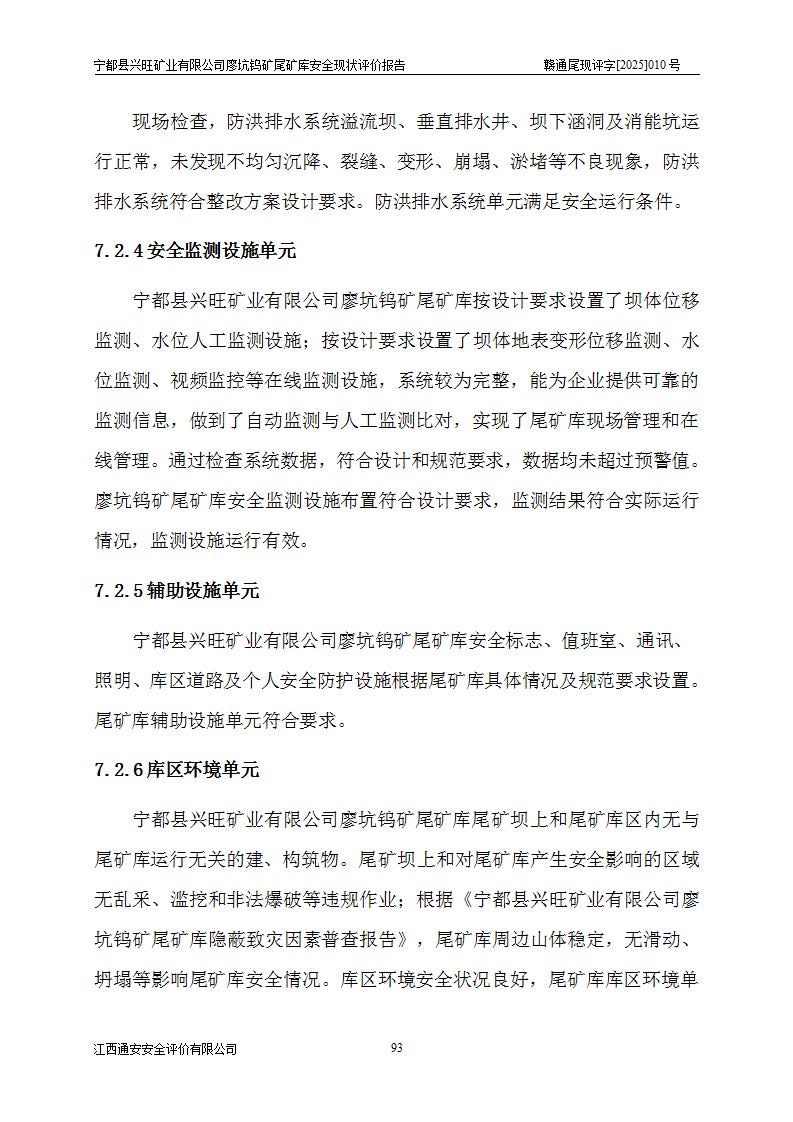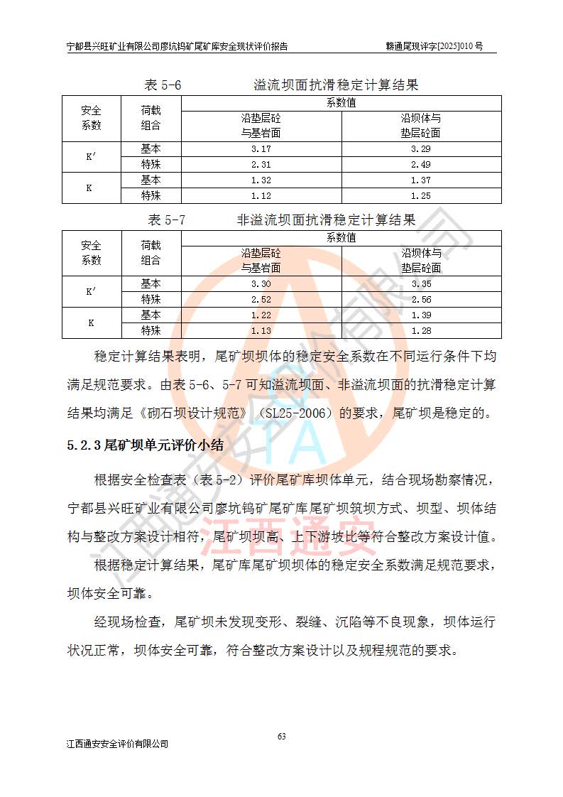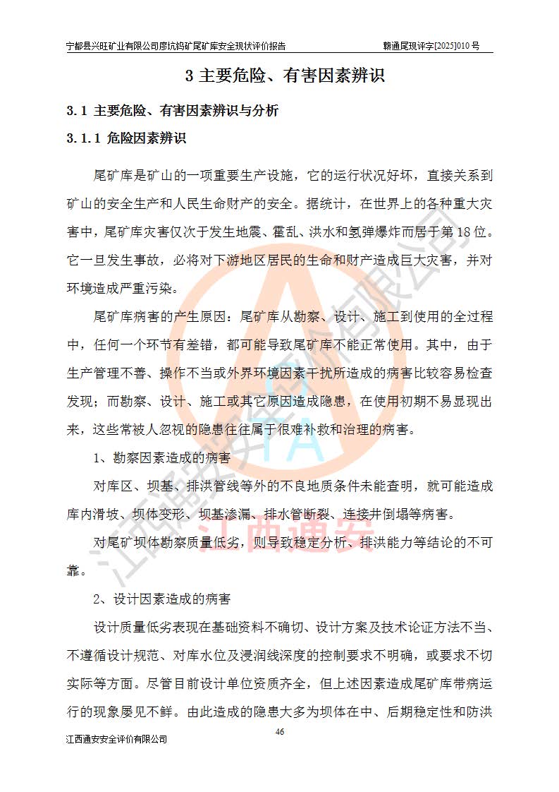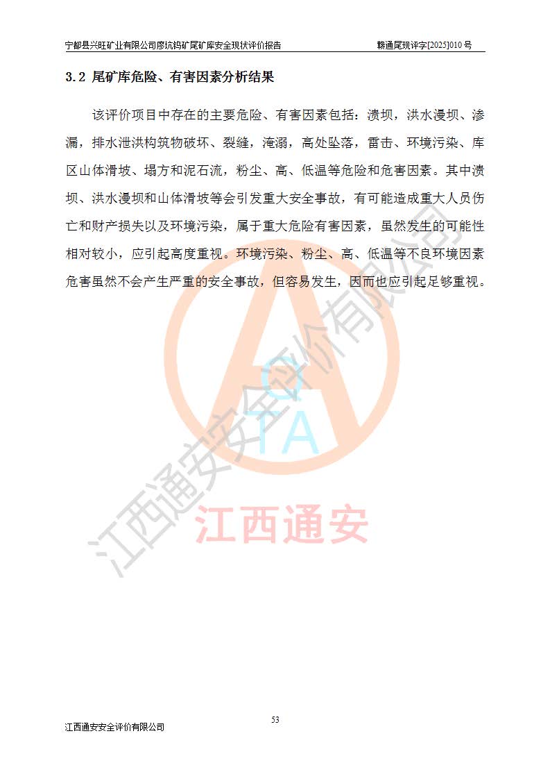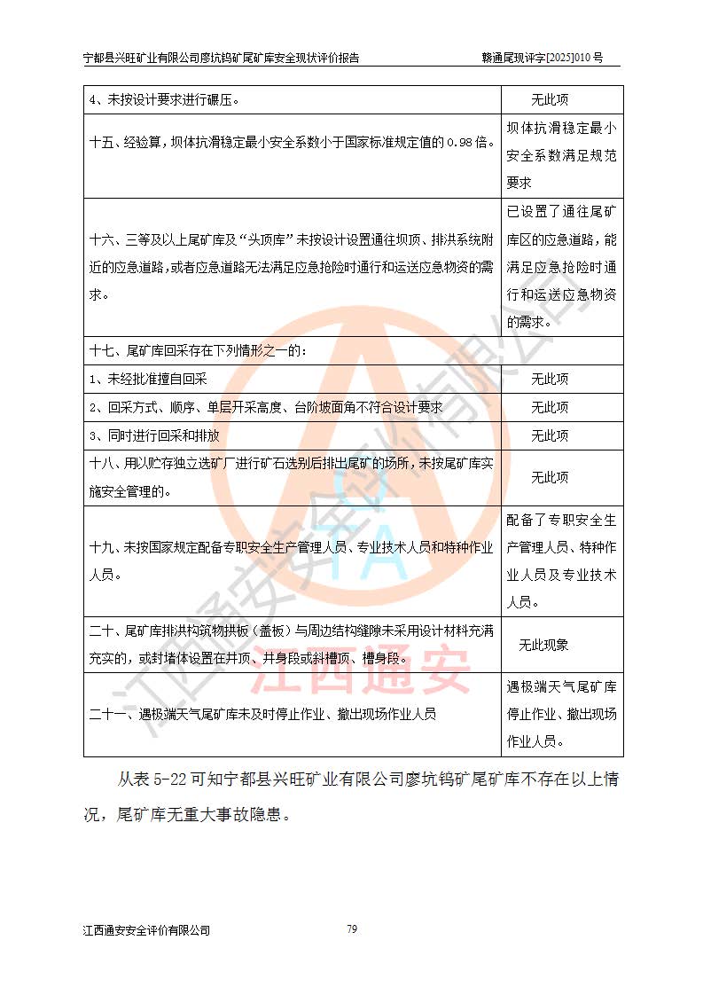 寧都縣興旺礦業(yè)有限公司廖坑鎢礦位于寧都縣縣城北西直距約15km處的安福鄉(xiāng)西甲村,地理坐標(biāo):東經(jīng)115°50′48″;北緯26°32′1″。寧都縣興旺礦業(yè)有限公司成立于2006年03月29日,統(tǒng)一社會信用代碼為91360730787253633E,企業(yè)類型為有限責(zé)任公司(自然人投資或控股),企業(yè)注冊地位于江西省贛州市寧都縣安福鄉(xiāng)西甲村,法定**人為曾德強(qiáng),注冊資本為1915萬元人民幣,所屬行業(yè)為有色金屬礦采選業(yè),經(jīng)營范圍包括鎢砂開采及廢砂石加工、銷售。 廖坑鎢礦尾礦庫位于寧都縣安福鄉(xiāng)西甲村、選礦廠東面約1.17Km的下游溝谷中,選礦廠年生產(chǎn)工作日300d,尾礦堆積干容重1.60 t/m3。尾礦庫匯水面積1.927km2,尾礦壩為漿砌塊石重力壩,壩頂高程595.0m,清基后壩底高程為571.0m,壩高24.0m,壩頂寬度2.7m,壩頂軸線長75.0m;上游壩坡1:0,下游壩坡1:1.0。尾礦從庫尾進(jìn)行排放,設(shè)計總庫容8.5×104m3,服務(wù)年限10.9年。尾礦庫總占地面積約21.0畝。為山谷型五等庫。 該尾礦庫于1982年11月由寧都縣水電施工隊建設(shè)施工,1983年11月投產(chǎn),2007年1月由江西省冶金設(shè)計院編制了《寧都縣興旺礦業(yè)有限公司廖坑鎢礦尾礦庫整改方案設(shè)計》,2008年4月2日取得江西省安全生產(chǎn)監(jiān)督管理局頒發(fā)的安全生產(chǎn)許可證,證書編號(贛)FM安許證字[2008]M1268號。2022年江西通安安全評價有限公司編制了安全現(xiàn)狀評價報告,2022年7月15日由贛州市行政審批局下發(fā)了安全生產(chǎn)許可證,證號(贛)FM安許證字[2022]B0081號,(贛市行審證(3)字[2022]第274號),**期至2025年7月14日。 依照《非煤礦礦山企業(yè)安全生產(chǎn)許可證延期換證工作》的通知,根據(jù)***《安全生產(chǎn)許可證條例》、《江西省安全生產(chǎn)條例》、《非煤礦山安全生產(chǎn)許可證實施辦法》、《江西省非煤礦礦山企業(yè)安全生產(chǎn)許可證辦法》規(guī)定及非煤礦山安全評價導(dǎo)則的要求,受寧都縣興旺礦業(yè)有限公司的委托,我公司承擔(dān)廖坑鎢礦尾礦庫延期換證的安全現(xiàn)狀評價工作。 |