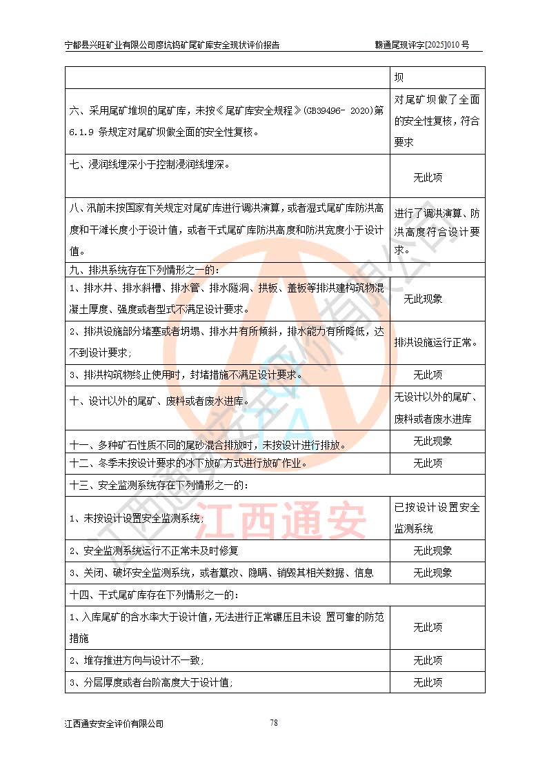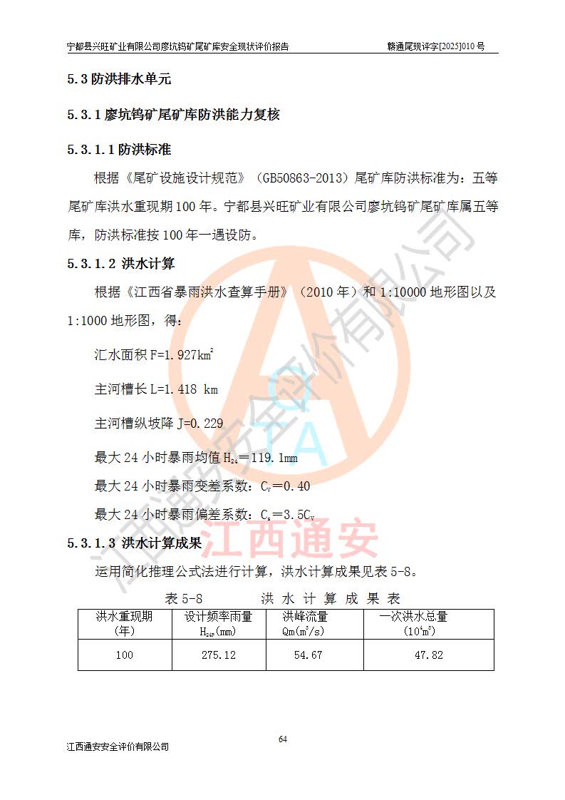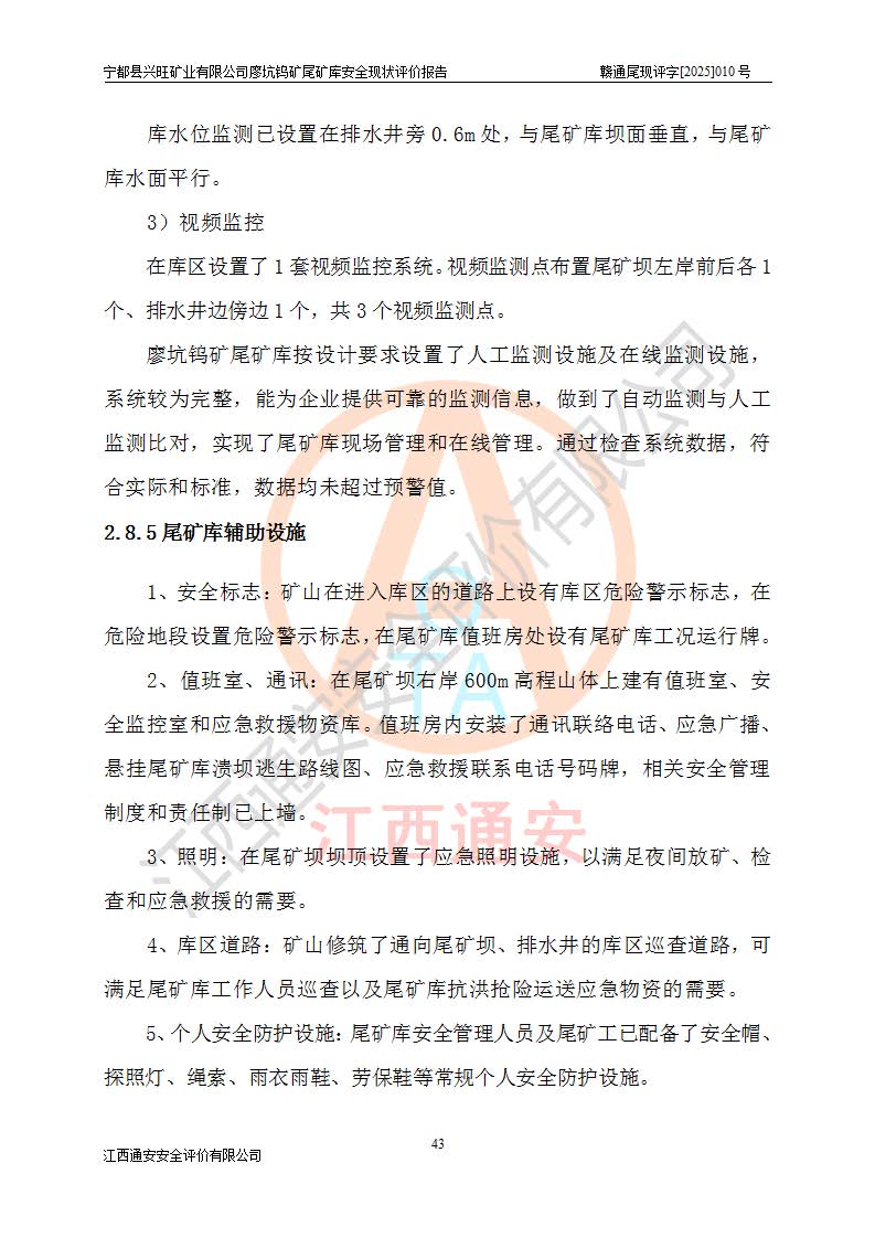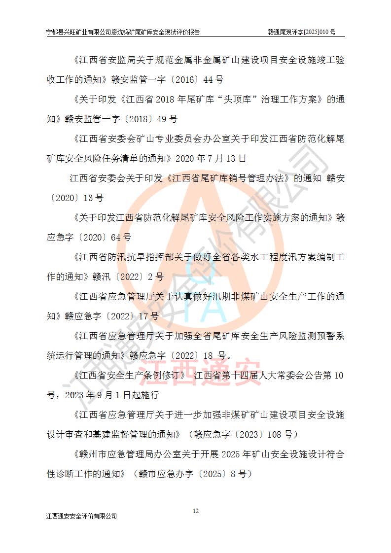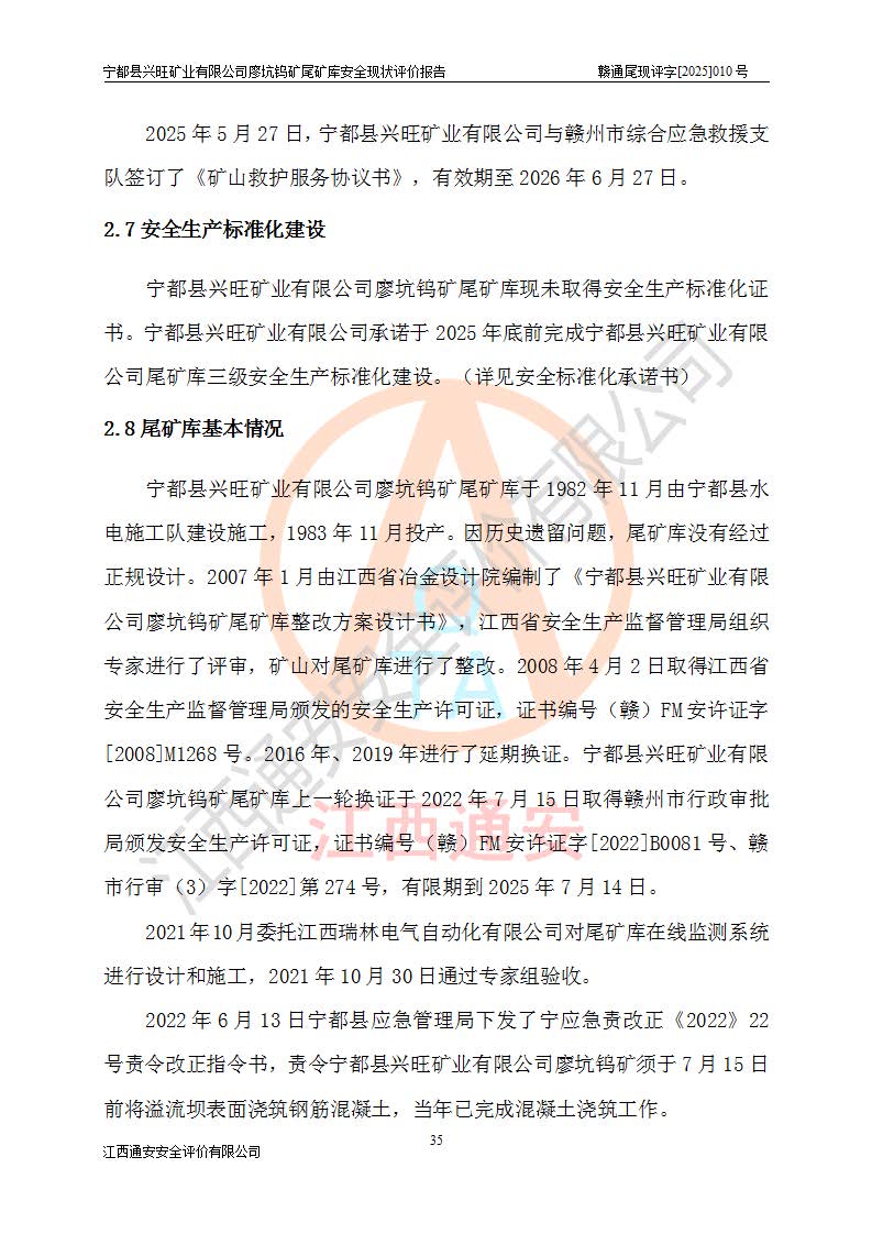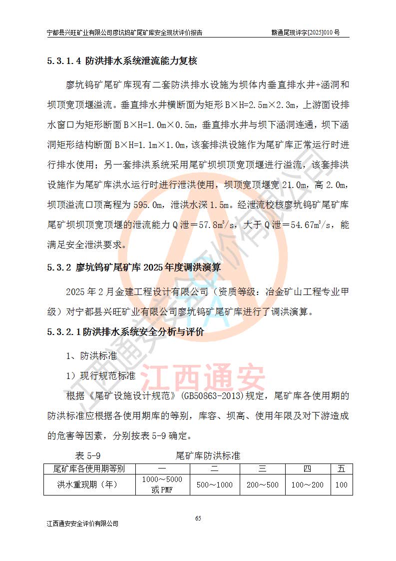 寧都縣興旺礦業(yè)有限公司廖坑鎢礦位于寧都縣縣城北西直距約15km處的安福鄉(xiāng)西甲村,地理坐標(biāo):東經(jīng)115°50′48″;北緯26°32′1″。寧都縣興旺礦業(yè)有限公司成立于2006年03月29日,統(tǒng)一社會信用代碼為91360730787253633E,企業(yè)類型為有限責(zé)任公司(自然人投資或控股),企業(yè)注冊地位于江西省贛州市寧都縣安福鄉(xiāng)西甲村,法定**人為曾德強(qiáng),注冊資本為1915萬元人民幣,所屬行業(yè)為有色金屬礦采選業(yè),經(jīng)營范圍包括鎢砂開采及廢砂石加工、銷售。 廖坑鎢礦尾礦庫位于寧都縣安福鄉(xiāng)西甲村、選礦廠東面約1.17Km的下游溝谷中,選礦廠年生產(chǎn)工作日300d,尾礦堆積干容重1.60 t/m3。尾礦庫匯水面積1.927km2,尾礦壩為漿砌塊石重力壩,壩頂高程595.0m,清基后壩底高程為571.0m,壩高24.0m,壩頂寬度2.7m,壩頂軸線長75.0m;上游壩坡1:0,下游壩坡1:1.0。尾礦從庫尾進(jìn)行排放,設(shè)計總庫容8.5×104m3,服務(wù)年限10.9年。尾礦庫總占地面積約21.0畝。為山谷型五等庫。 該尾礦庫于1982年11月由寧都縣水電施工隊建設(shè)施工,1983年11月投產(chǎn),2007年1月由江西省冶金設(shè)計院編制了《寧都縣興旺礦業(yè)有限公司廖坑鎢礦尾礦庫整改方案設(shè)計》,2008年4月2日取得江西省安全生產(chǎn)監(jiān)督管理局頒發(fā)的安全生產(chǎn)許可證,證書編號(贛)FM安許證字[2008]M1268號。2022年江西通安安全評價有限公司編制了安全現(xiàn)狀評價報告,2022年7月15日由贛州市行政審批局下發(fā)了安全生產(chǎn)許可證,證號(贛)FM安許證字[2022]B0081號,(贛市行審證(3)字[2022]第274號),**期至2025年7月14日。 依照《非煤礦礦山企業(yè)安全生產(chǎn)許可證延期換證工作》的通知,根據(jù)***《安全生產(chǎn)許可證條例》、《江西省安全生產(chǎn)條例》、《非煤礦山安全生產(chǎn)許可證實施辦法》、《江西省非煤礦礦山企業(yè)安全生產(chǎn)許可證辦法》規(guī)定及非煤礦山安全評價導(dǎo)則的要求,受寧都縣興旺礦業(yè)有限公司的委托,我公司承擔(dān)廖坑鎢礦尾礦庫延期換證的安全現(xiàn)狀評價工作。 |