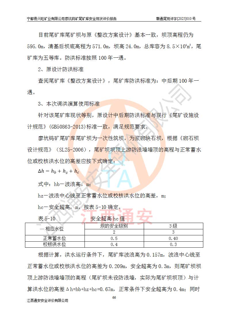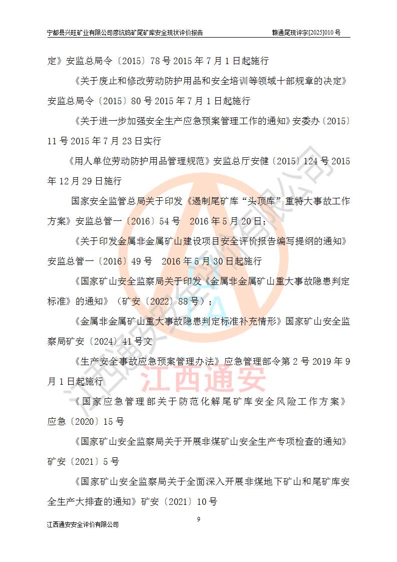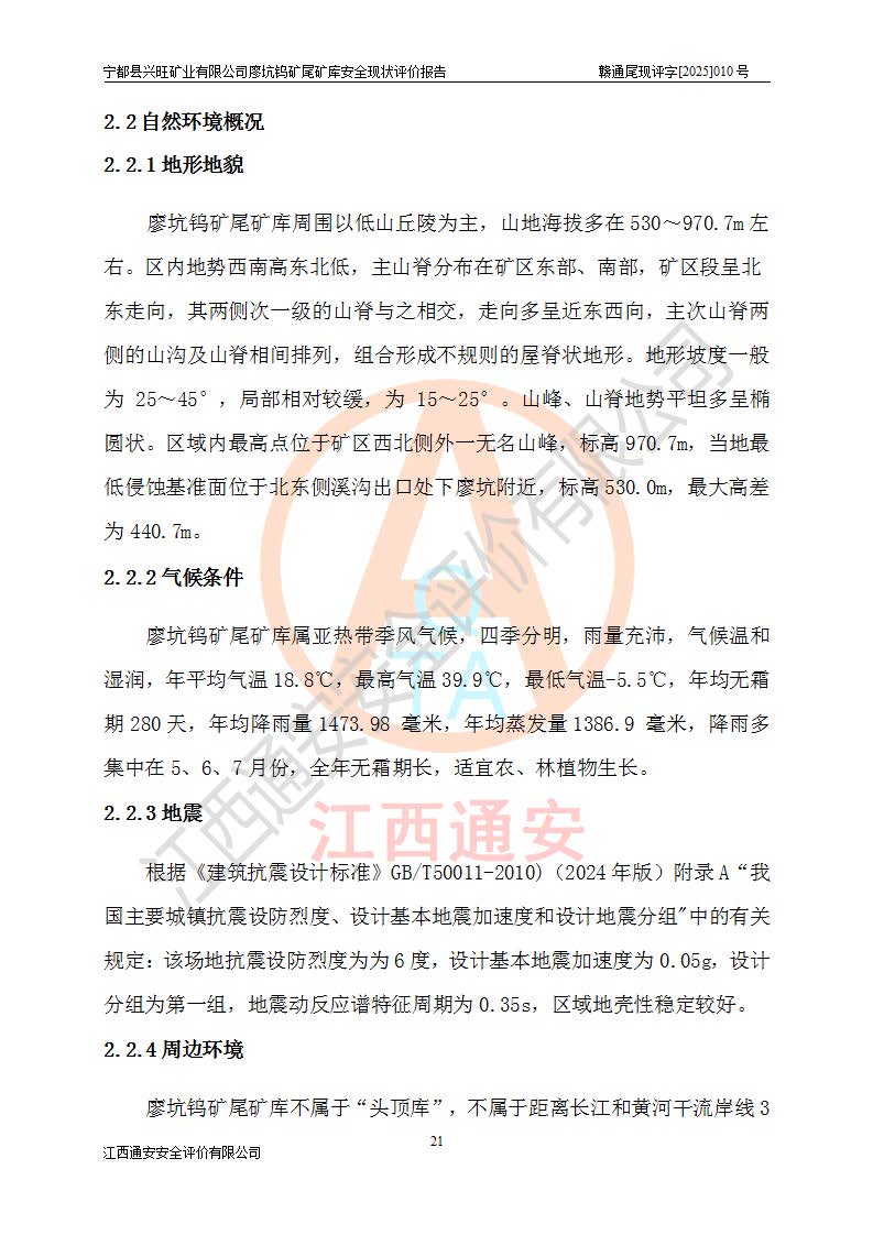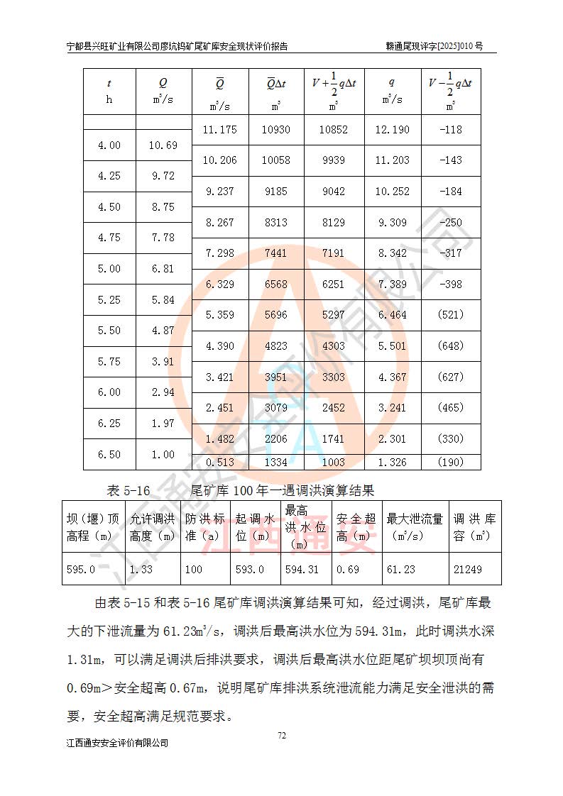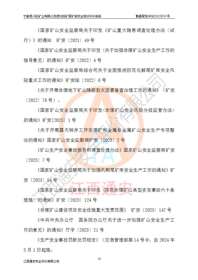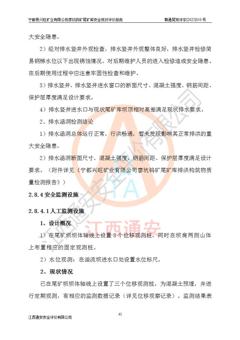 寧都縣興旺礦業(yè)有限公司廖坑鎢礦位于寧都縣縣城北西直距約15km處的安福鄉(xiāng)西甲村,地理坐標(biāo):東經(jīng)115°50′48″;北緯26°32′1″。寧都縣興旺礦業(yè)有限公司成立于2006年03月29日,統(tǒng)一社會信用代碼為91360730787253633E,企業(yè)類型為有限責(zé)任公司(自然人投資或控股),企業(yè)注冊地位于江西省贛州市寧都縣安福鄉(xiāng)西甲村,法定**人為曾德強(qiáng),注冊資本為1915萬元人民幣,所屬行業(yè)為有色金屬礦采選業(yè),經(jīng)營范圍包括鎢砂開采及廢砂石加工、銷售。 廖坑鎢礦尾礦庫位于寧都縣安福鄉(xiāng)西甲村、選礦廠東面約1.17Km的下游溝谷中,選礦廠年生產(chǎn)工作日300d,尾礦堆積干容重1.60 t/m3。尾礦庫匯水面積1.927km2,尾礦壩為漿砌塊石重力壩,壩頂高程595.0m,清基后壩底高程為571.0m,壩高24.0m,壩頂寬度2.7m,壩頂軸線長75.0m;上游壩坡1:0,下游壩坡1:1.0。尾礦從庫尾進(jìn)行排放,設(shè)計總庫容8.5×104m3,服務(wù)年限10.9年。尾礦庫總占地面積約21.0畝。為山谷型五等庫。 該尾礦庫于1982年11月由寧都縣水電施工隊建設(shè)施工,1983年11月投產(chǎn),2007年1月由江西省冶金設(shè)計院編制了《寧都縣興旺礦業(yè)有限公司廖坑鎢礦尾礦庫整改方案設(shè)計》,2008年4月2日取得江西省安全生產(chǎn)監(jiān)督管理局頒發(fā)的安全生產(chǎn)許可證,證書編號(贛)FM安許證字[2008]M1268號。2022年江西通安安全評價有限公司編制了安全現(xiàn)狀評價報告,2022年7月15日由贛州市行政審批局下發(fā)了安全生產(chǎn)許可證,證號(贛)FM安許證字[2022]B0081號,(贛市行審證(3)字[2022]第274號),**期至2025年7月14日。 依照《非煤礦礦山企業(yè)安全生產(chǎn)許可證延期換證工作》的通知,根據(jù)***《安全生產(chǎn)許可證條例》、《江西省安全生產(chǎn)條例》、《非煤礦山安全生產(chǎn)許可證實施辦法》、《江西省非煤礦礦山企業(yè)安全生產(chǎn)許可證辦法》規(guī)定及非煤礦山安全評價導(dǎo)則的要求,受寧都縣興旺礦業(yè)有限公司的委托,我公司承擔(dān)廖坑鎢礦尾礦庫延期換證的安全現(xiàn)狀評價工作。 |