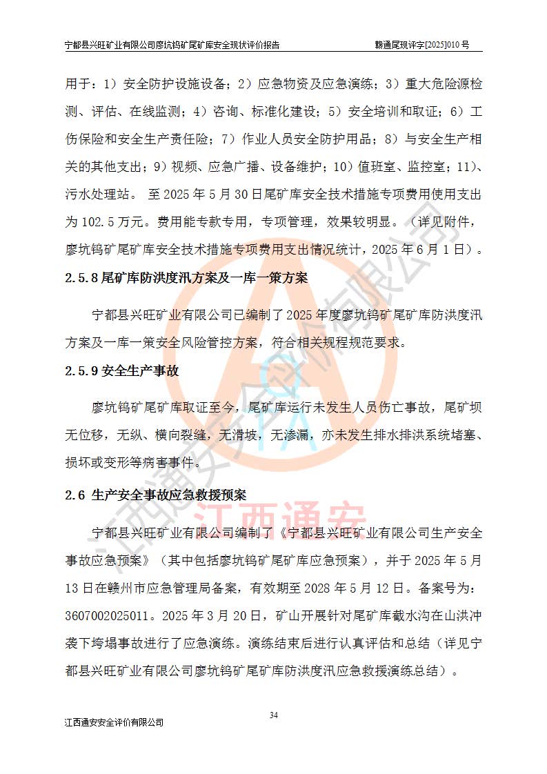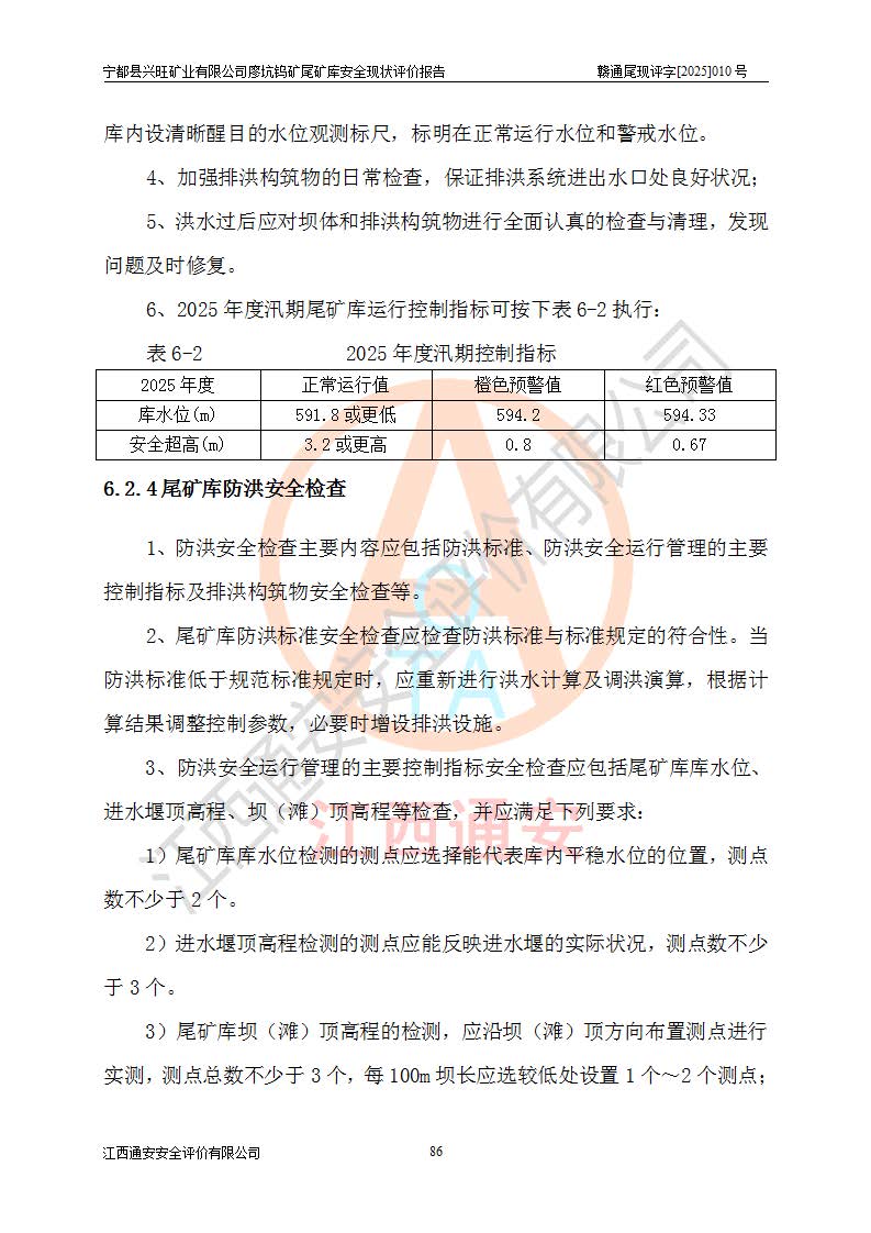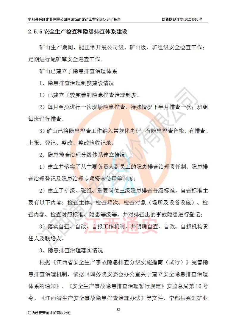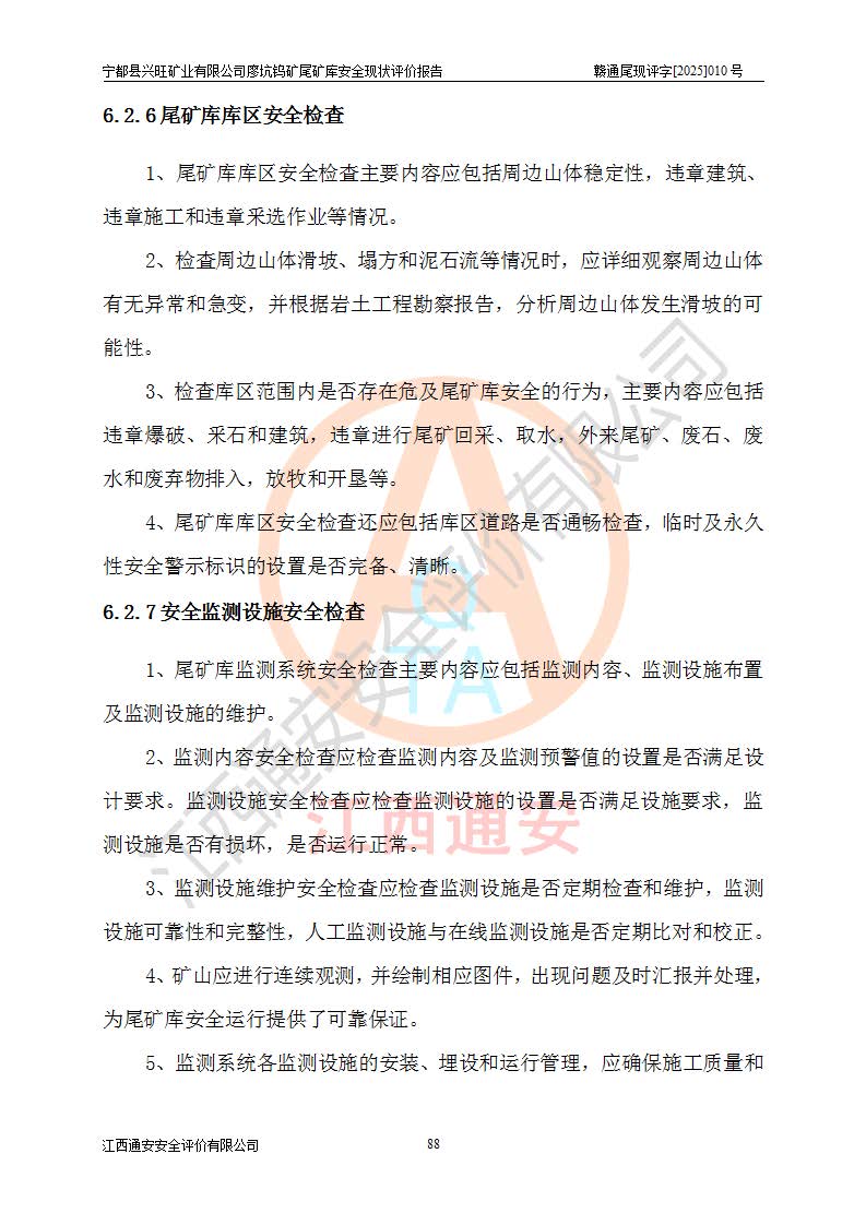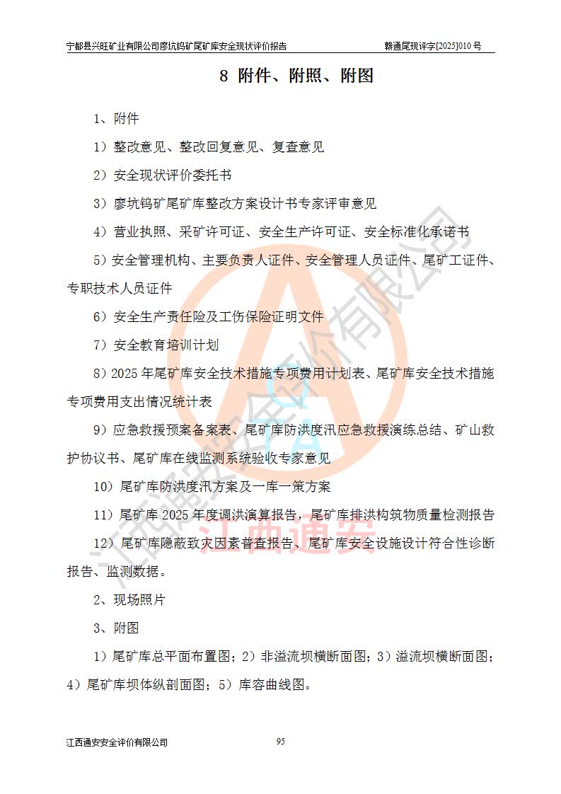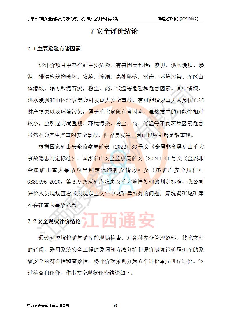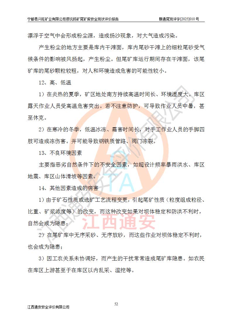 寧都縣興旺礦業(yè)有限公司廖坑鎢礦位于寧都縣縣城北西直距約15km處的安福鄉(xiāng)西甲村,地理坐標(biāo):東經(jīng)115°50′48″;北緯26°32′1″。寧都縣興旺礦業(yè)有限公司成立于2006年03月29日,統(tǒng)一社會信用代碼為91360730787253633E,企業(yè)類型為有限責(zé)任公司(自然人投資或控股),企業(yè)注冊地位于江西省贛州市寧都縣安福鄉(xiāng)西甲村,法定**人為曾德強(qiáng),注冊資本為1915萬元人民幣,所屬行業(yè)為有色金屬礦采選業(yè),經(jīng)營范圍包括鎢砂開采及廢砂石加工、銷售。 廖坑鎢礦尾礦庫位于寧都縣安福鄉(xiāng)西甲村、選礦廠東面約1.17Km的下游溝谷中,選礦廠年生產(chǎn)工作日300d,尾礦堆積干容重1.60 t/m3。尾礦庫匯水面積1.927km2,尾礦壩為漿砌塊石重力壩,壩頂高程595.0m,清基后壩底高程為571.0m,壩高24.0m,壩頂寬度2.7m,壩頂軸線長75.0m;上游壩坡1:0,下游壩坡1:1.0。尾礦從庫尾進(jìn)行排放,設(shè)計總庫容8.5×104m3,服務(wù)年限10.9年。尾礦庫總占地面積約21.0畝。為山谷型五等庫。 該尾礦庫于1982年11月由寧都縣水電施工隊建設(shè)施工,1983年11月投產(chǎn),2007年1月由江西省冶金設(shè)計院編制了《寧都縣興旺礦業(yè)有限公司廖坑鎢礦尾礦庫整改方案設(shè)計》,2008年4月2日取得江西省安全生產(chǎn)監(jiān)督管理局頒發(fā)的安全生產(chǎn)許可證,證書編號(贛)FM安許證字[2008]M1268號。2022年江西通安安全評價有限公司編制了安全現(xiàn)狀評價報告,2022年7月15日由贛州市行政審批局下發(fā)了安全生產(chǎn)許可證,證號(贛)FM安許證字[2022]B0081號,(贛市行審證(3)字[2022]第274號),**期至2025年7月14日。 依照《非煤礦礦山企業(yè)安全生產(chǎn)許可證延期換證工作》的通知,根據(jù)***《安全生產(chǎn)許可證條例》、《江西省安全生產(chǎn)條例》、《非煤礦山安全生產(chǎn)許可證實施辦法》、《江西省非煤礦礦山企業(yè)安全生產(chǎn)許可證辦法》規(guī)定及非煤礦山安全評價導(dǎo)則的要求,受寧都縣興旺礦業(yè)有限公司的委托,我公司承擔(dān)廖坑鎢礦尾礦庫延期換證的安全現(xiàn)狀評價工作。 |