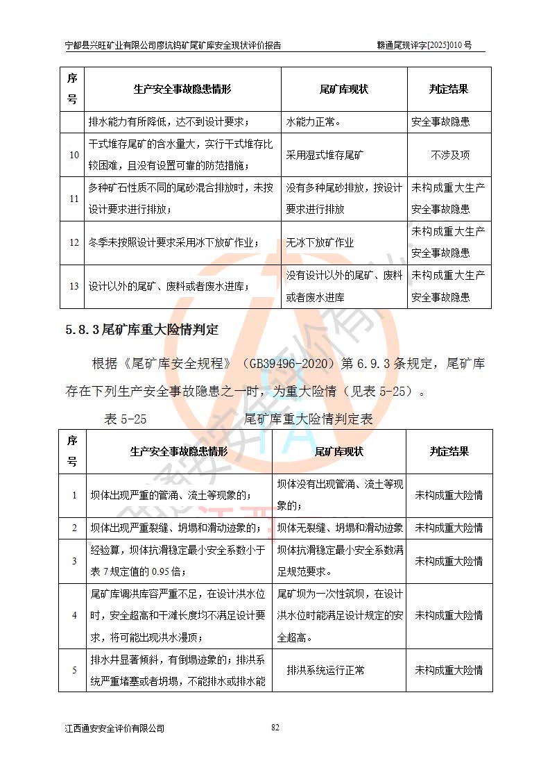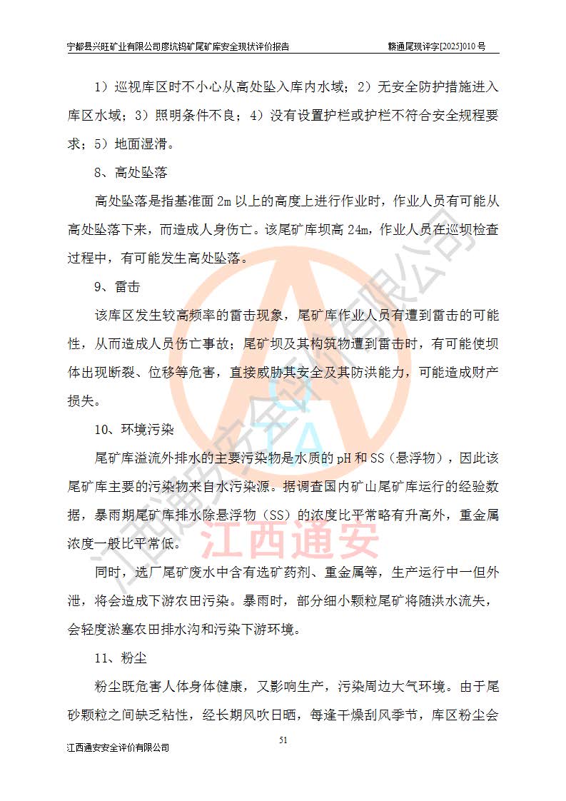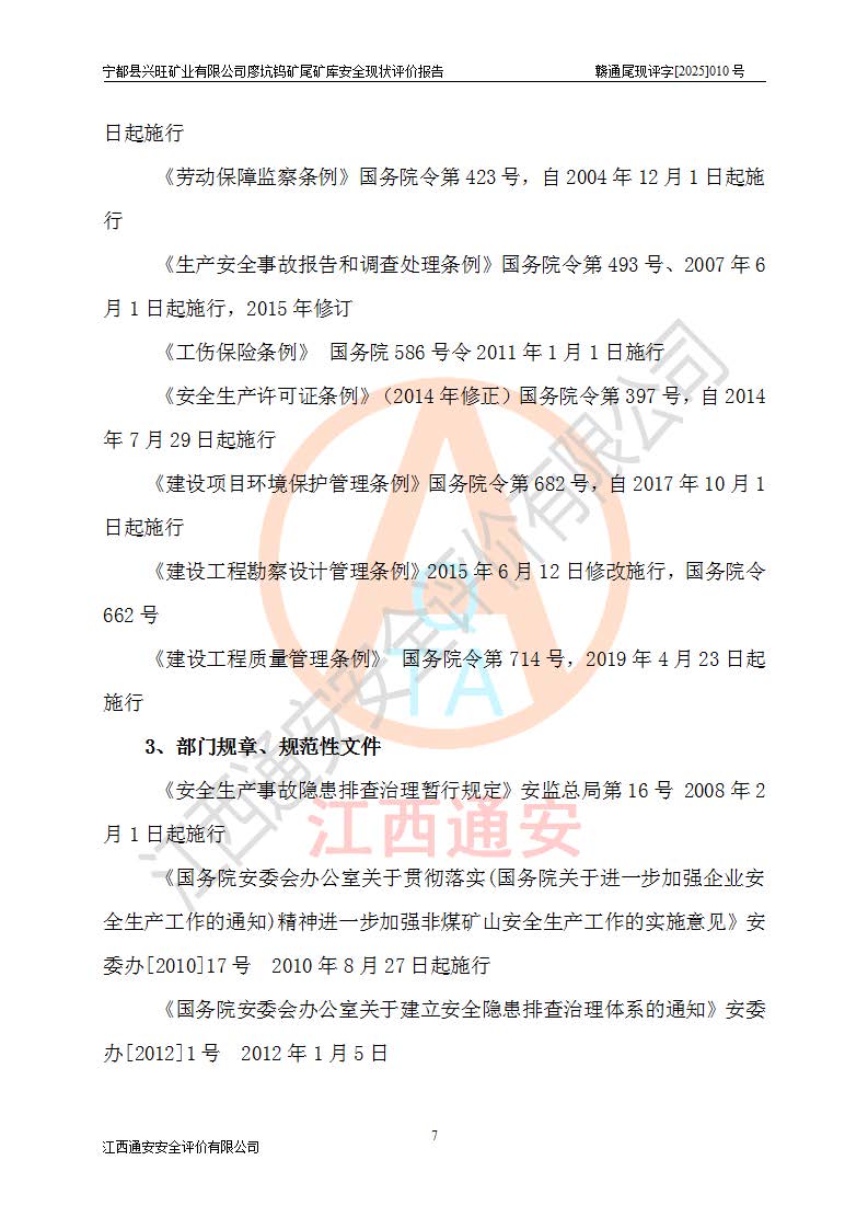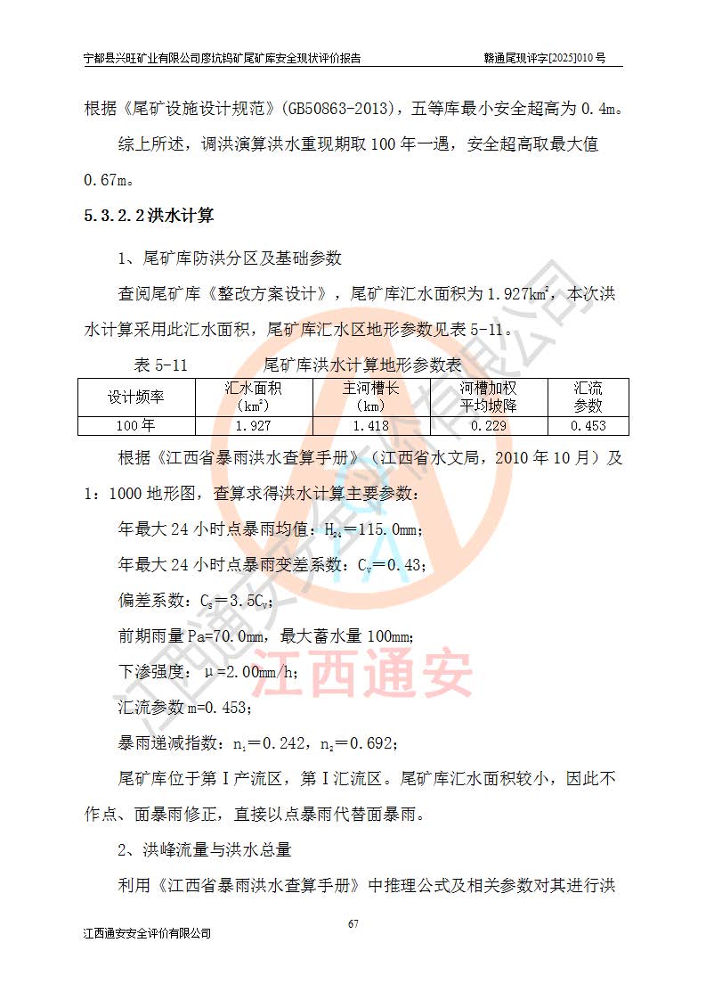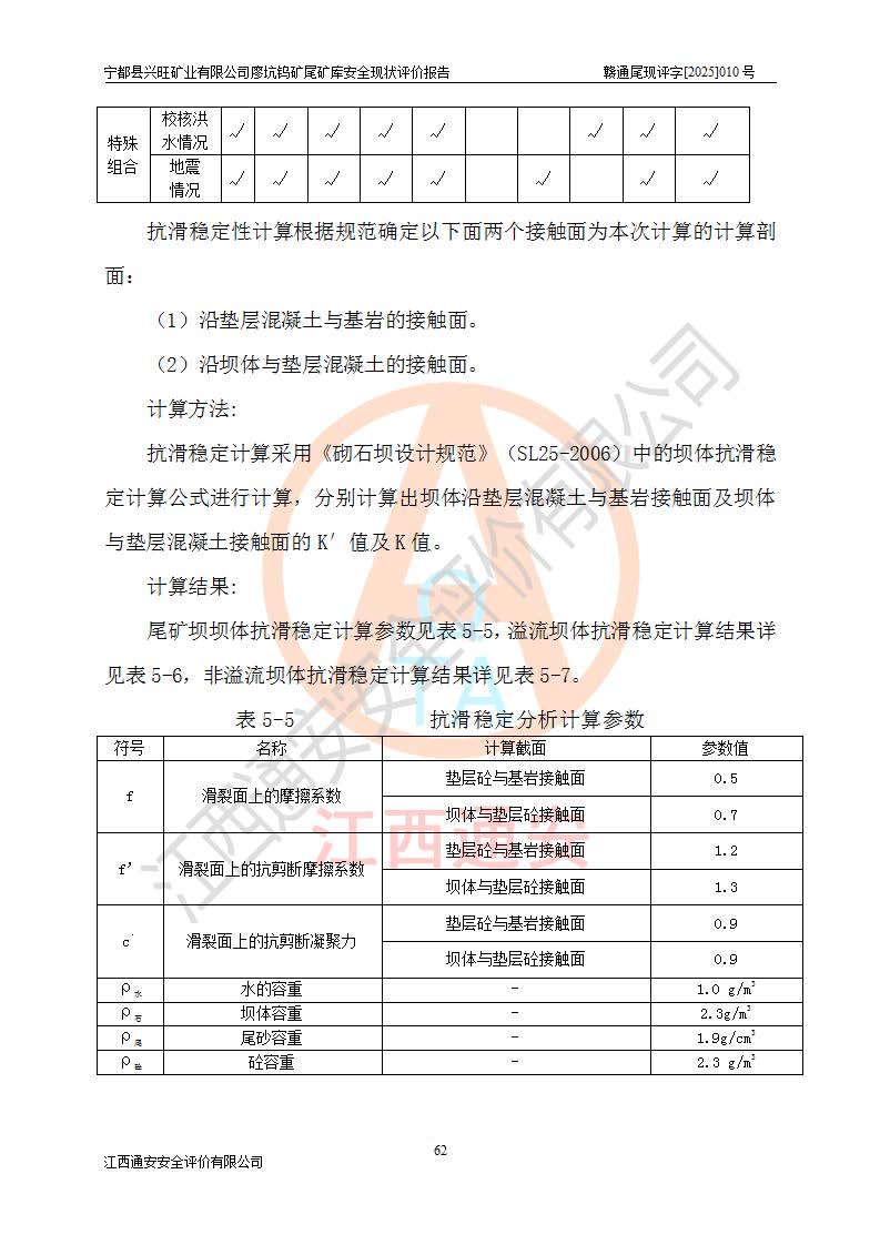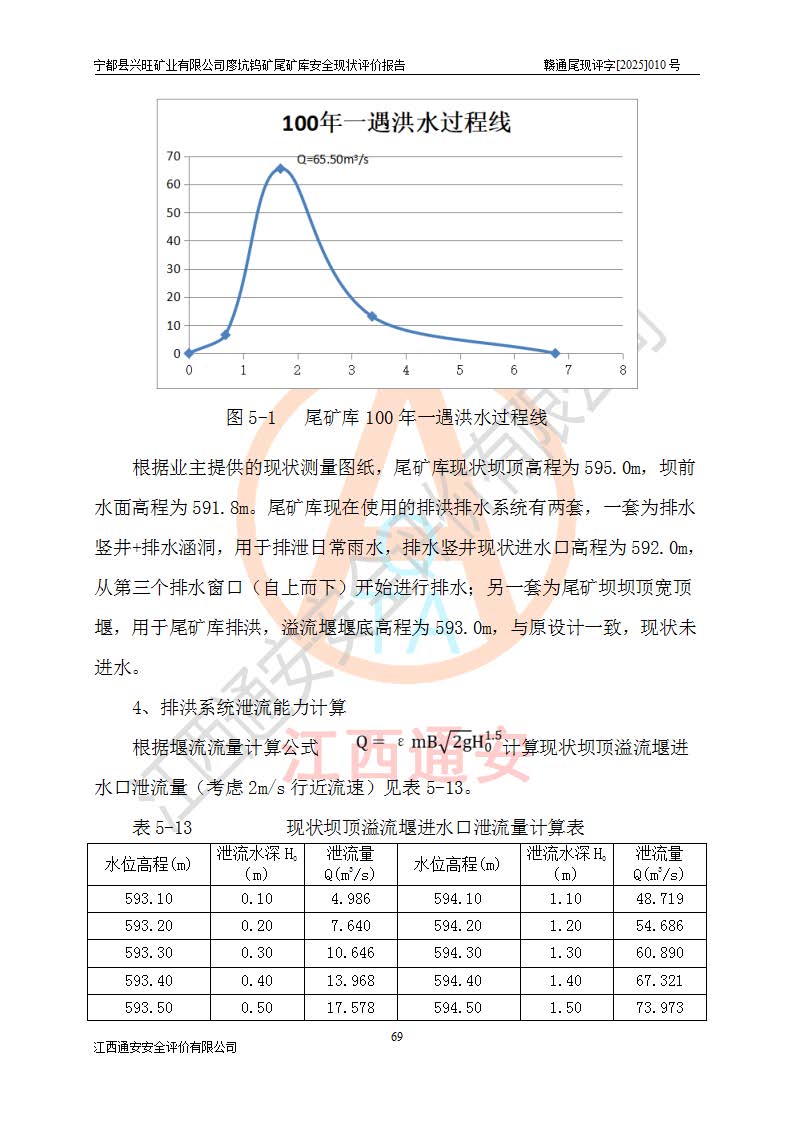 寧都縣興旺礦業(yè)有限公司廖坑鎢礦位于寧都縣縣城北西直距約15km處的安福鄉(xiāng)西甲村,地理坐標(biāo):東經(jīng)115°50′48″;北緯26°32′1″。寧都縣興旺礦業(yè)有限公司成立于2006年03月29日,統(tǒng)一社會信用代碼為91360730787253633E,企業(yè)類型為有限責(zé)任公司(自然人投資或控股),企業(yè)注冊地位于江西省贛州市寧都縣安福鄉(xiāng)西甲村,法定**人為曾德強(qiáng),注冊資本為1915萬元人民幣,所屬行業(yè)為有色金屬礦采選業(yè),經(jīng)營范圍包括鎢砂開采及廢砂石加工、銷售。 廖坑鎢礦尾礦庫位于寧都縣安福鄉(xiāng)西甲村、選礦廠東面約1.17Km的下游溝谷中,選礦廠年生產(chǎn)工作日300d,尾礦堆積干容重1.60 t/m3。尾礦庫匯水面積1.927km2,尾礦壩為漿砌塊石重力壩,壩頂高程595.0m,清基后壩底高程為571.0m,壩高24.0m,壩頂寬度2.7m,壩頂軸線長75.0m;上游壩坡1:0,下游壩坡1:1.0。尾礦從庫尾進(jìn)行排放,設(shè)計總庫容8.5×104m3,服務(wù)年限10.9年。尾礦庫總占地面積約21.0畝。為山谷型五等庫。 該尾礦庫于1982年11月由寧都縣水電施工隊建設(shè)施工,1983年11月投產(chǎn),2007年1月由江西省冶金設(shè)計院編制了《寧都縣興旺礦業(yè)有限公司廖坑鎢礦尾礦庫整改方案設(shè)計》,2008年4月2日取得江西省安全生產(chǎn)監(jiān)督管理局頒發(fā)的安全生產(chǎn)許可證,證書編號(贛)FM安許證字[2008]M1268號。2022年江西通安安全評價有限公司編制了安全現(xiàn)狀評價報告,2022年7月15日由贛州市行政審批局下發(fā)了安全生產(chǎn)許可證,證號(贛)FM安許證字[2022]B0081號,(贛市行審證(3)字[2022]第274號),**期至2025年7月14日。 依照《非煤礦礦山企業(yè)安全生產(chǎn)許可證延期換證工作》的通知,根據(jù)***《安全生產(chǎn)許可證條例》、《江西省安全生產(chǎn)條例》、《非煤礦山安全生產(chǎn)許可證實施辦法》、《江西省非煤礦礦山企業(yè)安全生產(chǎn)許可證辦法》規(guī)定及非煤礦山安全評價導(dǎo)則的要求,受寧都縣興旺礦業(yè)有限公司的委托,我公司承擔(dān)廖坑鎢礦尾礦庫延期換證的安全現(xiàn)狀評價工作。 |
