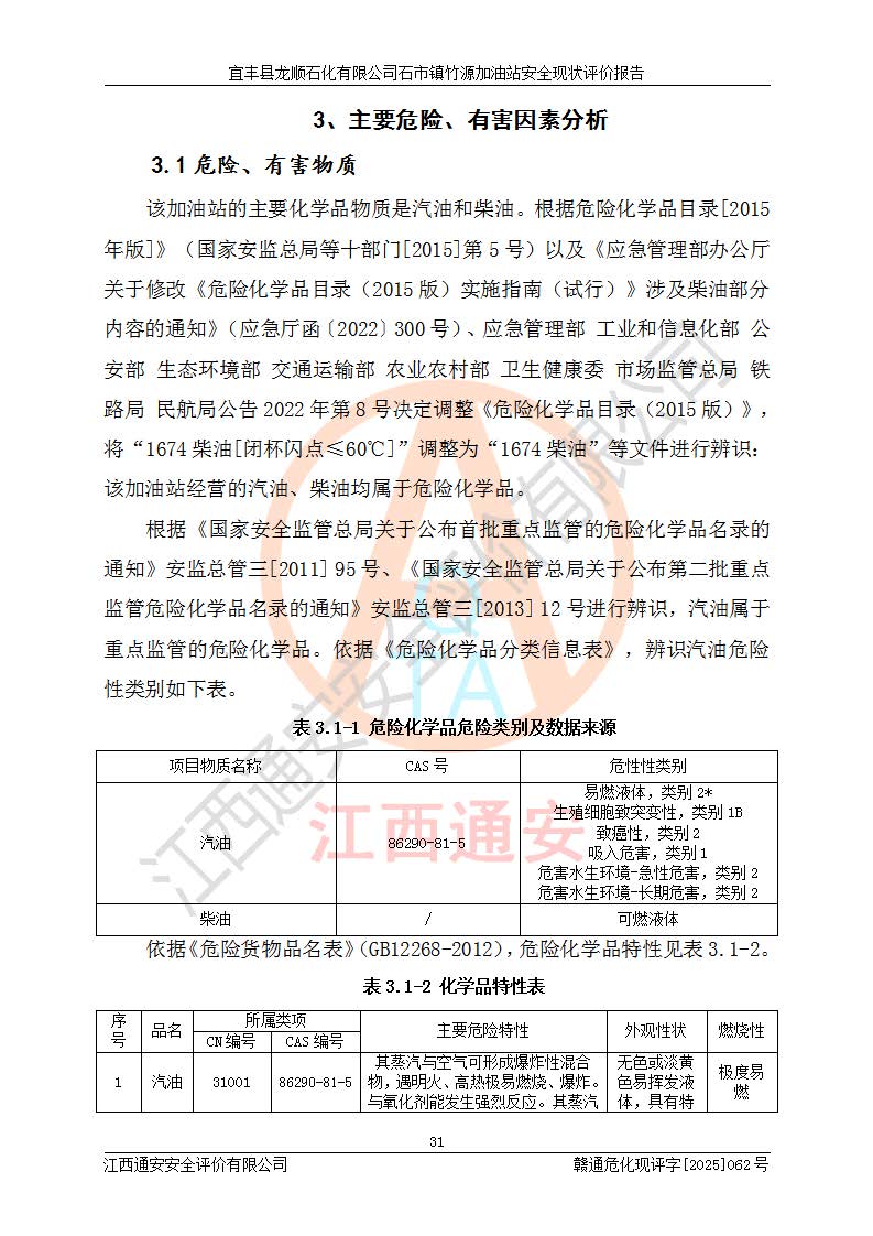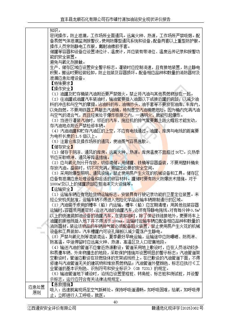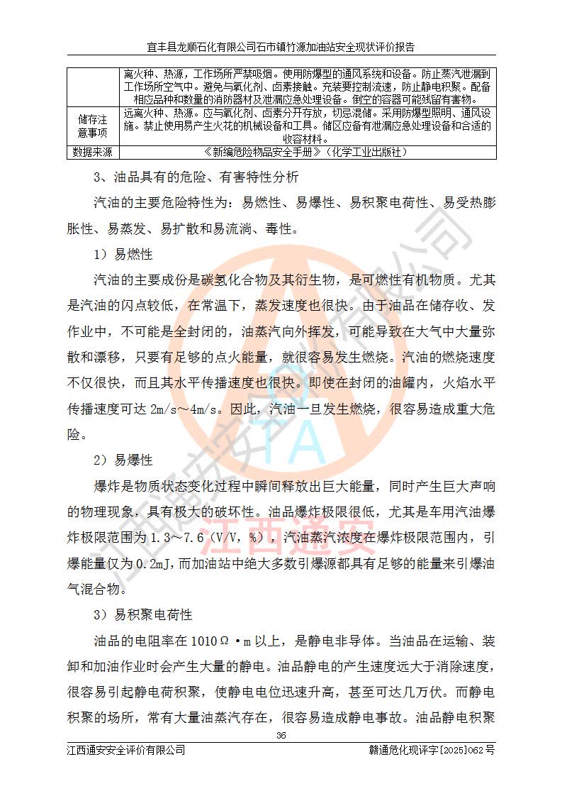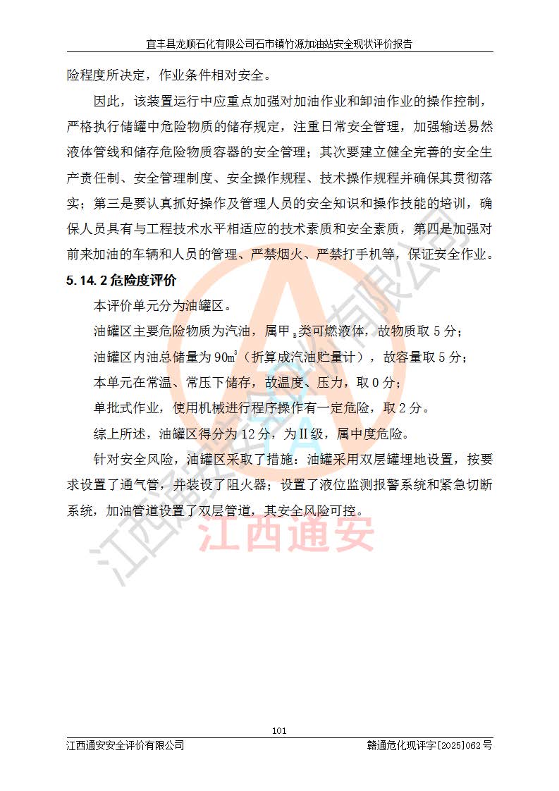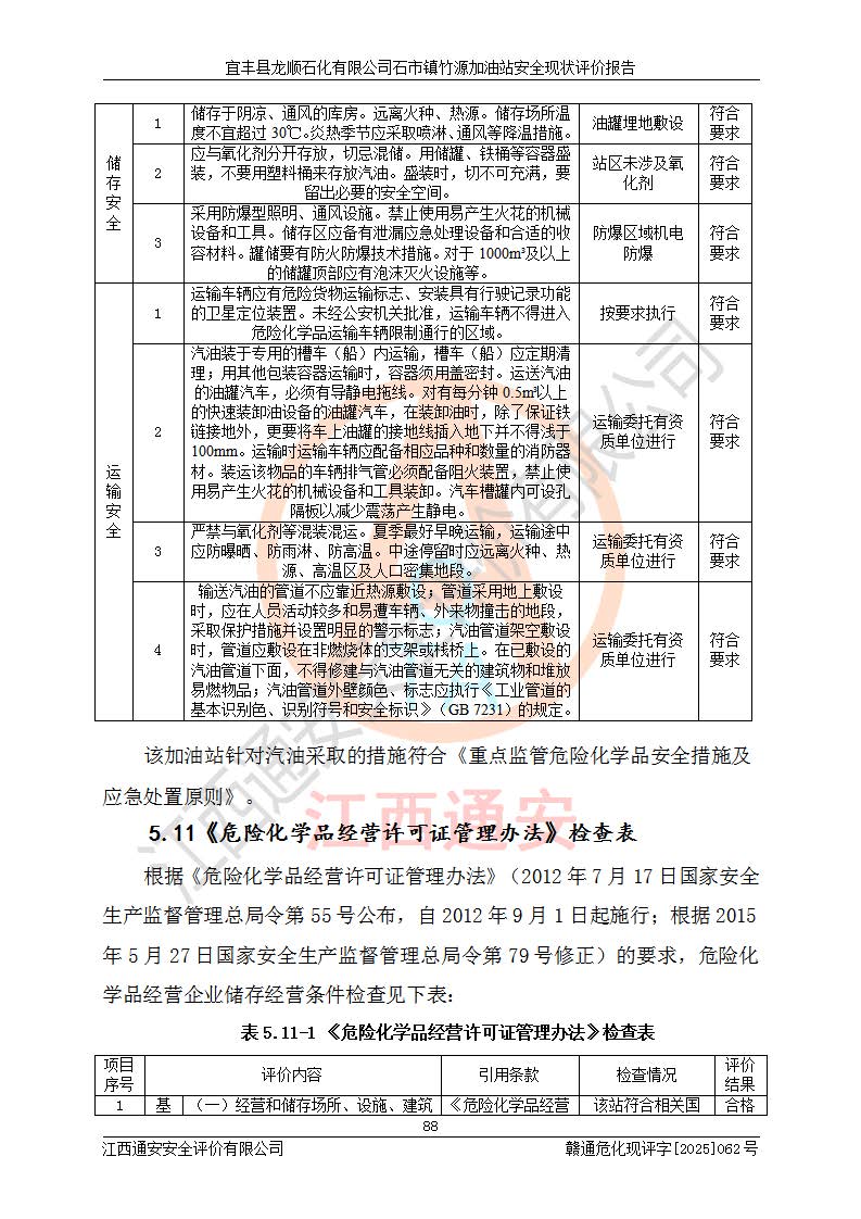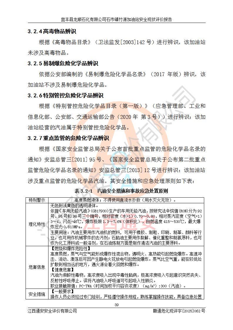 其它 | 1、該加油站的主要化學(xué)品物質(zhì)是汽油和柴油。根據(jù)危險化學(xué)品目錄[2015年版]》(**安監(jiān)總局等十部門[2015]第5號)以及《應(yīng)急管理部辦公廳關(guān)于修改《危險化學(xué)品目錄(2015版)實施指南(試行)》涉及柴油部分內(nèi)容的通知》(應(yīng)急廳函〔2022〕300號)、應(yīng)急管理部 工業(yè)和信息化部 公安部 生態(tài)環(huán)境部 交通運輸部 農(nóng)業(yè)農(nóng)村部 衛(wèi)生健康委 市場監(jiān)管總局 鐵路局 民航局公告2022年第8號決定調(diào)整《危險化學(xué)品目錄(2015版)》,將“1674柴油[閉杯閃點≤60℃]”調(diào)整為“1674柴油”等文件進(jìn)行辨識:該加油站經(jīng)營的汽油、柴油均屬于危險化學(xué)品。 2、經(jīng)按照《危險化學(xué)品重大危險源辨識》GB18218-2018進(jìn)行辨識,該加油站生產(chǎn)單元、儲存單元均不構(gòu)成危險化學(xué)品重大危險源。 3、根據(jù)《**安全監(jiān)管總局關(guān)于公布首批重點監(jiān)管的危險化學(xué)品名錄的通知》安監(jiān)總管三[2011] 95號、《**安全監(jiān)管總局關(guān)于公布第二批重點監(jiān)管危險化學(xué)品名錄的通知》安監(jiān)總管三[2013] 12號進(jìn)行辨識:該加油站涉及重點監(jiān)管的危險化學(xué)品汽油。經(jīng)根據(jù)根據(jù)“汽油安全措施和應(yīng)急處理原則”要求的措施進(jìn)行檢查,該加油站員工經(jīng)安全培訓(xùn)后上崗,油罐區(qū)設(shè)置了液位監(jiān)測監(jiān)控報警系統(tǒng)、油罐泄漏檢測系統(tǒng)和視頻監(jiān)控系統(tǒng),當(dāng)液位*限時報警,觸動防溢閥,切斷進(jìn)油管路。加油站設(shè)置了急停開關(guān),可在緊急情況下一鍵切斷加油系統(tǒng)。 4、該加油站未涉及易制毒化學(xué)品。 5、根據(jù)《中華人民共和國監(jiān)控化學(xué)品管理條例》(中華人民共和國***令第588號修改)及《各類監(jiān)控化學(xué)品名錄》(中華人民共和國工業(yè)和信息化部令第52號;2020年)、《列入第三類監(jiān)控化學(xué)品的新增品種清單》(**石油和化學(xué)工業(yè)局令第1號)等規(guī)定進(jìn)行辨識:該加油站未涉及監(jiān)控化學(xué)品。 6、根據(jù)《危險化學(xué)品目錄(2015版)》(**安全生產(chǎn)監(jiān)督管理局等十部門公告[2015]第5號)辨識,該加油站未涉及劇毒化學(xué)品。 7、根據(jù)《高毒物品目錄》(衛(wèi)法監(jiān)發(fā)[2003]142號)進(jìn)行辨識,該加油站未涉及高毒物品。 8、依據(jù)公安部編制的《易制爆危險化學(xué)品名錄》(2017 年版)辨識,該加油站不涉及易制爆危險化學(xué)品。 9、根據(jù)《特別管控危險化學(xué)品目錄(**版)》(應(yīng)急管理部、工業(yè)和信息化部、公安部、交通運輸部公告(2020年 第3號))進(jìn)行辨識:該加油站經(jīng)營的汽油屬于特別管控危險化學(xué)品。 10、經(jīng)采用作業(yè)條件危險性評價法(LEC)進(jìn)行分析,該加油站的作業(yè)條件相對比較安全。在選定的加油作業(yè)、卸油作業(yè)、維修作業(yè)、配電作業(yè)等4個單元中均為“一般危險、需要注意”作業(yè)環(huán)境,且一般危險作業(yè)環(huán)境的出現(xiàn)均由物料的危險程度所決定,作業(yè)條件相對安全。 11、經(jīng)采用危險度評價法分析,油罐區(qū)主要危險物質(zhì)為汽油,屬甲B類可燃液體,故物質(zhì)取5分;油罐區(qū)內(nèi)油總儲量為90m3(折算成汽油貯量計)),故容量取5分;本單元在常溫、常壓下儲存,故溫度、壓力,取0分;單批式作業(yè),使用機械進(jìn)行程序操作有**危險,取2分。油罐區(qū)得分為12分,為Ⅱ級,屬中度危險。針對安全風(fēng)險,油罐區(qū)采取了措施:油罐采用雙層罐埋地設(shè)置,按要求設(shè)置了通氣管,并裝設(shè)了阻火器;設(shè)置了液位監(jiān)測報警系統(tǒng)和緊急切斷系統(tǒng),加油管道設(shè)置了雙層管道,其安全風(fēng)險可控。 12、采用檢查表評價法對該加油站進(jìn)行檢查分析,經(jīng)整改后,該加油站涉及的強制條款和其他項均符合要求。該加油站的站址符合城鄉(xiāng)總體規(guī)劃和安全要求,經(jīng)營和儲存場所、設(shè)施、建筑物的內(nèi)外部防火間距符合《汽車加油加氣加氫站技術(shù)標(biāo)準(zhǔn)》GB50156-2021等相關(guān)標(biāo)準(zhǔn)規(guī)范的要求。該加油站設(shè)置了消防安全設(shè)施、防雷防靜電設(shè)施、液位監(jiān)測措施、油罐泄漏檢測措施、電氣防爆措施等安全防護設(shè)施,取得了消防驗收意見書和防雷檢測合格報告,符合**法律法規(guī)、標(biāo)準(zhǔn)規(guī)范的要求。該加油站公用工程能夠滿足安全經(jīng)營的基本需要,符合安全經(jīng)營的條件。 13、該加油站相關(guān)證照齊全,成立了安全生產(chǎn)**小組,配備了安全管理人員,制定了安全管理制度、操作規(guī)程和事故應(yīng)急預(yù)案,加油站的安全管理機構(gòu)工作有力,加油站安全經(jīng)營管理處于正常有序開展范圍。 評價結(jié)論 宜豐縣龍順石化有限公司石市鎮(zhèn)竹源加油站站址合理,周邊環(huán)境良好,與敏感防護目標(biāo)間距符合規(guī)范要求,站區(qū)建構(gòu)筑物之間的防火間距、耐火等級符合標(biāo)準(zhǔn)要求,與總平面布置圖一致,加油卸油工藝及設(shè)備設(shè)施合理,工藝布置得當(dāng),防雷設(shè)施經(jīng)檢測合格,采取的工