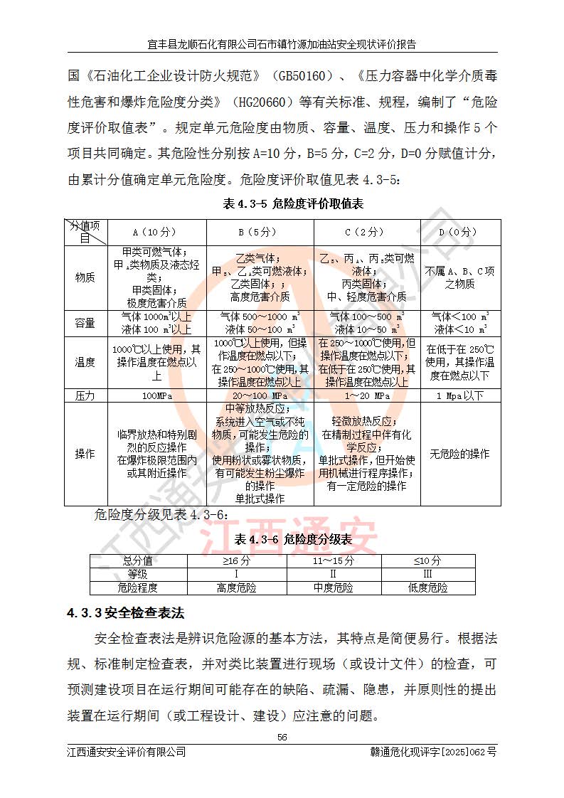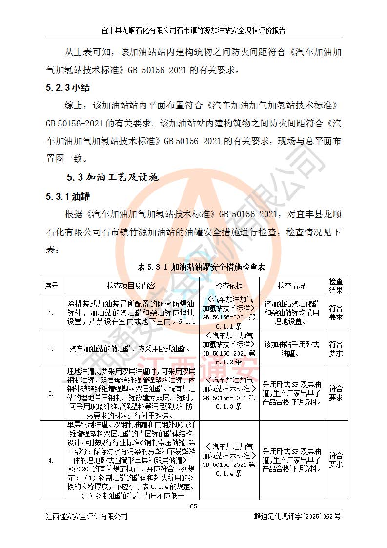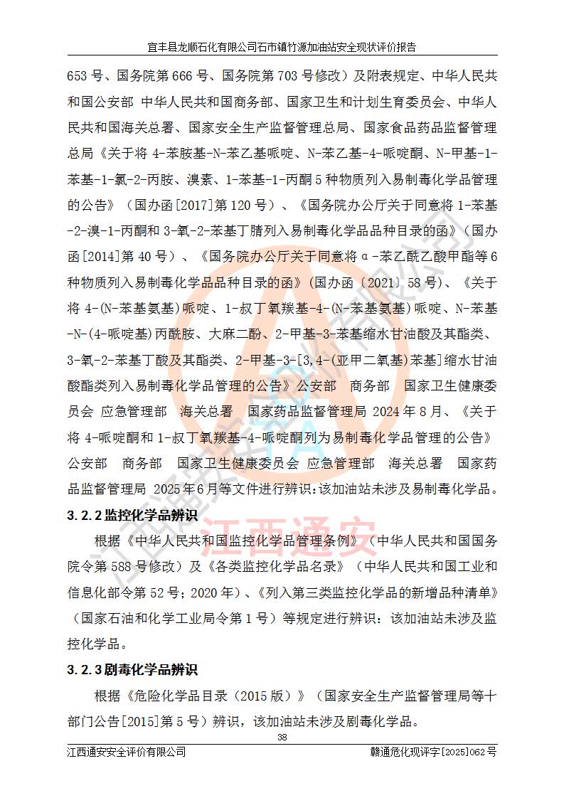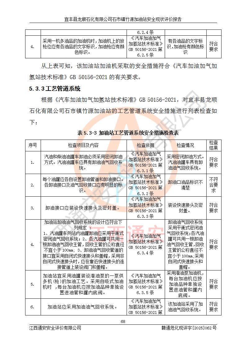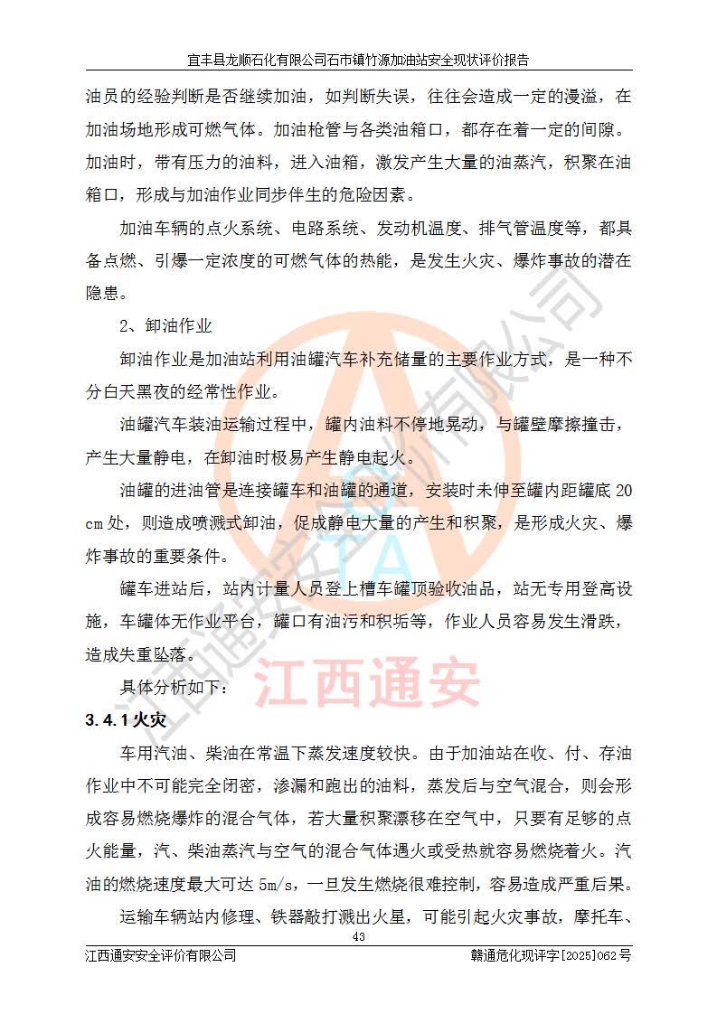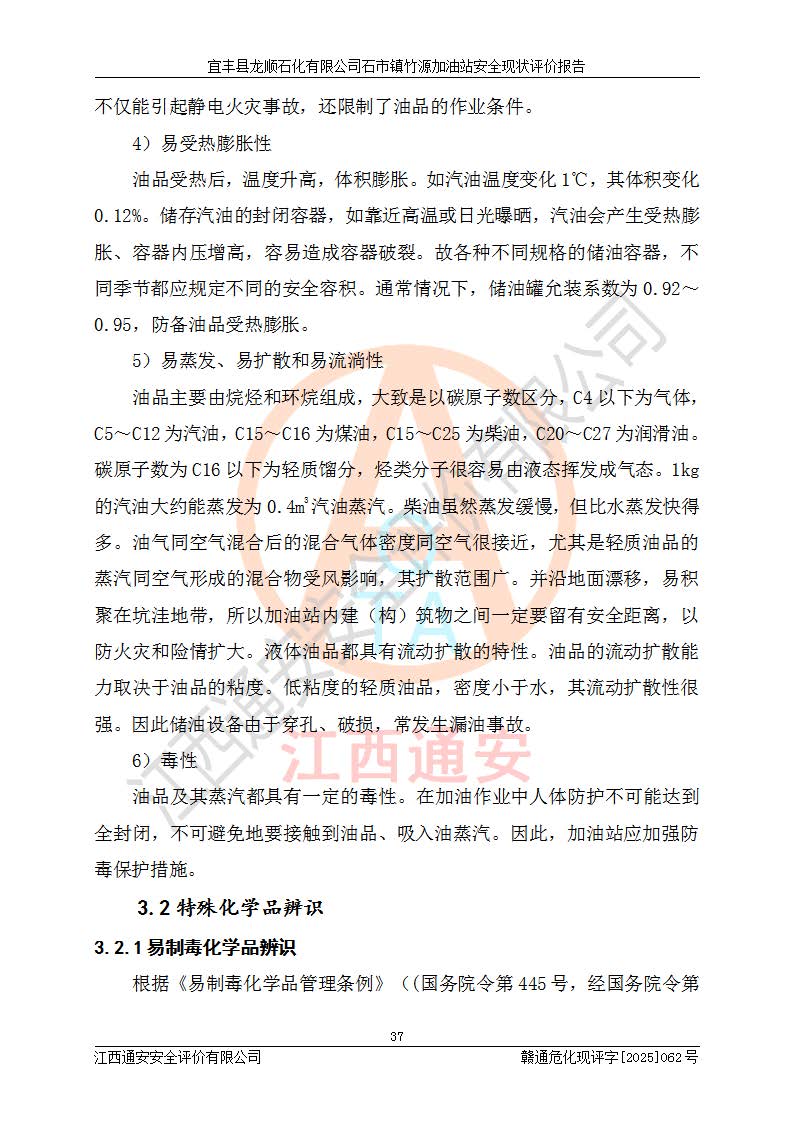 其它 | 1、該加油站的主要化學(xué)品物質(zhì)是汽油和柴油。根據(jù)危險化學(xué)品目錄[2015年版]》(**安監(jiān)總局等十部門[2015]第5號)以及《應(yīng)急管理部辦公廳關(guān)于修改《危險化學(xué)品目錄(2015版)實施指南(試行)》涉及柴油部分內(nèi)容的通知》(應(yīng)急廳函〔2022〕300號)、應(yīng)急管理部 工業(yè)和信息化部 公安部 生態(tài)環(huán)境部 交通運輸部 農(nóng)業(yè)農(nóng)村部 衛(wèi)生健康委 市場監(jiān)管總局 鐵路局 民航局公告2022年第8號決定調(diào)整《危險化學(xué)品目錄(2015版)》,將“1674柴油[閉杯閃點≤60℃]”調(diào)整為“1674柴油”等文件進(jìn)行辨識:該加油站經(jīng)營的汽油、柴油均屬于危險化學(xué)品。 2、經(jīng)按照《危險化學(xué)品重大危險源辨識》GB18218-2018進(jìn)行辨識,該加油站生產(chǎn)單元、儲存單元均不構(gòu)成危險化學(xué)品重大危險源。 3、根據(jù)《**安全監(jiān)管總局關(guān)于公布首批重點監(jiān)管的危險化學(xué)品名錄的通知》安監(jiān)總管三[2011] 95號、《**安全監(jiān)管總局關(guān)于公布第二批重點監(jiān)管危險化學(xué)品名錄的通知》安監(jiān)總管三[2013] 12號進(jìn)行辨識:該加油站涉及重點監(jiān)管的危險化學(xué)品汽油。經(jīng)根據(jù)根據(jù)“汽油安全措施和應(yīng)急處理原則”要求的措施進(jìn)行檢查,該加油站員工經(jīng)安全培訓(xùn)后上崗,油罐區(qū)設(shè)置了液位監(jiān)測監(jiān)控報警系統(tǒng)、油罐泄漏檢測系統(tǒng)和視頻監(jiān)控系統(tǒng),當(dāng)液位*限時報警,觸動防溢閥,切斷進(jìn)油管路。加油站設(shè)置了急停開關(guān),可在緊急情況下一鍵切斷加油系統(tǒng)。 4、該加油站未涉及易制毒化學(xué)品。 5、根據(jù)《中華人民共和國監(jiān)控化學(xué)品管理條例》(中華人民共和國***令第588號修改)及《各類監(jiān)控化學(xué)品名錄》(中華人民共和國工業(yè)和信息化部令第52號;2020年)、《列入第三類監(jiān)控化學(xué)品的新增品種清單》(**石油和化學(xué)工業(yè)局令第1號)等規(guī)定進(jìn)行辨識:該加油站未涉及監(jiān)控化學(xué)品。 6、根據(jù)《危險化學(xué)品目錄(2015版)》(**安全生產(chǎn)監(jiān)督管理局等十部門公告[2015]第5號)辨識,該加油站未涉及劇毒化學(xué)品。 7、根據(jù)《高毒物品目錄》(衛(wèi)法監(jiān)發(fā)[2003]142號)進(jìn)行辨識,該加油站未涉及高毒物品。 8、依據(jù)公安部編制的《易制爆危險化學(xué)品名錄》(2017 年版)辨識,該加油站不涉及易制爆危險化學(xué)品。 9、根據(jù)《特別管控危險化學(xué)品目錄(**版)》(應(yīng)急管理部、工業(yè)和信息化部、公安部、交通運輸部公告(2020年 第3號))進(jìn)行辨識:該加油站經(jīng)營的汽油屬于特別管控危險化學(xué)品。 10、經(jīng)采用作業(yè)條件危險性評價法(LEC)進(jìn)行分析,該加油站的作業(yè)條件相對比較安全。在選定的加油作業(yè)、卸油作業(yè)、維修作業(yè)、配電作業(yè)等4個單元中均為“一般危險、需要注意”作業(yè)環(huán)境,且一般危險作業(yè)環(huán)境的出現(xiàn)均由物料的危險程度所決定,作業(yè)條件相對安全。 11、經(jīng)采用危險度評價法分析,油罐區(qū)主要危險物質(zhì)為汽油,屬甲B類可燃液體,故物質(zhì)取5分;油罐區(qū)內(nèi)油總儲量為90m3(折算成汽油貯量計)),故容量取5分;本單元在常溫、常壓下儲存,故溫度、壓力,取0分;單批式作業(yè),使用機械進(jìn)行程序操作有**危險,取2分。油罐區(qū)得分為12分,為Ⅱ級,屬中度危險。針對安全風(fēng)險,油罐區(qū)采取了措施:油罐采用雙層罐埋地設(shè)置,按要求設(shè)置了通氣管,并裝設(shè)了阻火器;設(shè)置了液位監(jiān)測報警系統(tǒng)和緊急切斷系統(tǒng),加油管道設(shè)置了雙層管道,其安全風(fēng)險可控。 12、采用檢查表評價法對該加油站進(jìn)行檢查分析,經(jīng)整改后,該加油站涉及的強制條款和其他項均符合要求。該加油站的站址符合城鄉(xiāng)總體規(guī)劃和安全要求,經(jīng)營和儲存場所、設(shè)施、建筑物的內(nèi)外部防火間距符合《汽車加油加氣加氫站技術(shù)標(biāo)準(zhǔn)》GB50156-2021等相關(guān)標(biāo)準(zhǔn)規(guī)范的要求。該加油站設(shè)置了消防安全設(shè)施、防雷防靜電設(shè)施、液位監(jiān)測措施、油罐泄漏檢測措施、電氣防爆措施等安全防護設(shè)施,取得了消防驗收意見書和防雷檢測合格報告,符合**法律法規(guī)、標(biāo)準(zhǔn)規(guī)范的要求。該加油站公用工程能夠滿足安全經(jīng)營的基本需要,符合安全經(jīng)營的條件。 13、該加油站相關(guān)證照齊全,成立了安全生產(chǎn)**小組,配備了安全管理人員,制定了安全管理制度、操作規(guī)程和事故應(yīng)急預(yù)案,加油站的安全管理機構(gòu)工作有力,加油站安全經(jīng)營管理處于正常有序開展范圍。 評價結(jié)論 宜豐縣龍順石化有限公司石市鎮(zhèn)竹源加油站站址合理,周邊環(huán)境良好,與敏感防護目標(biāo)間距符合規(guī)范要求,站區(qū)建構(gòu)筑物之間的防火間距、耐火等級符合標(biāo)準(zhǔn)要求,與總平面布置圖一致,加油卸油工藝及設(shè)備設(shè)施合理,工藝布置得當(dāng),防雷設(shè)施經(jīng)檢測合格,采取的工