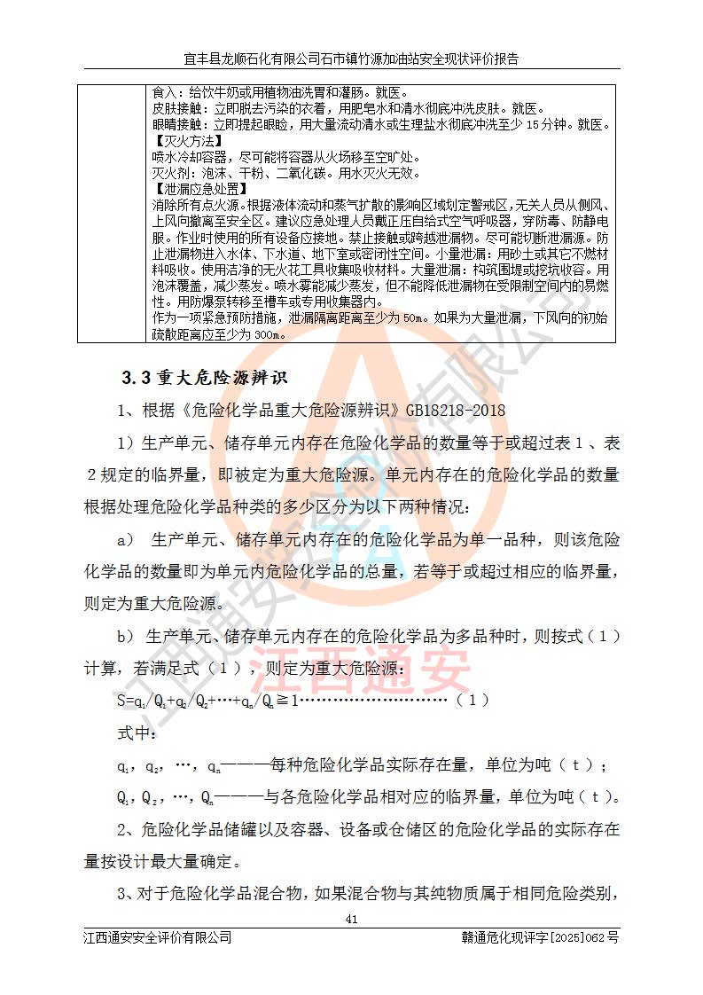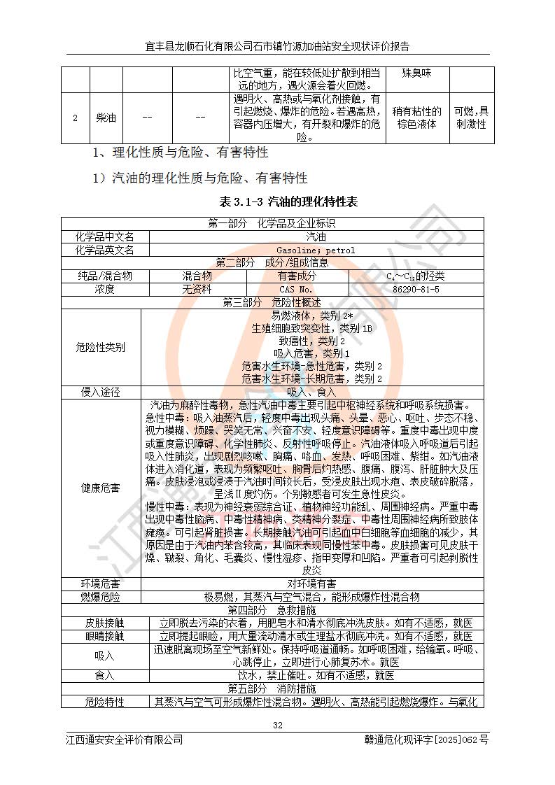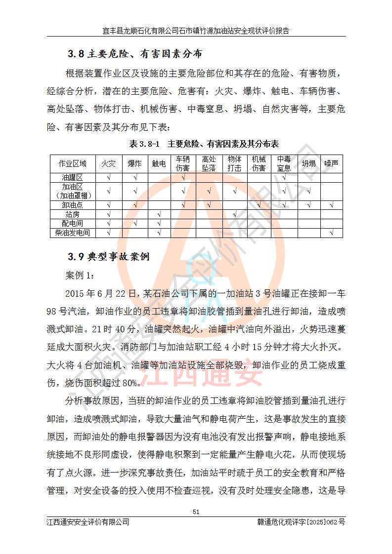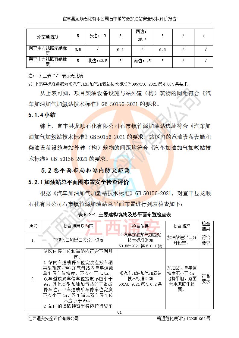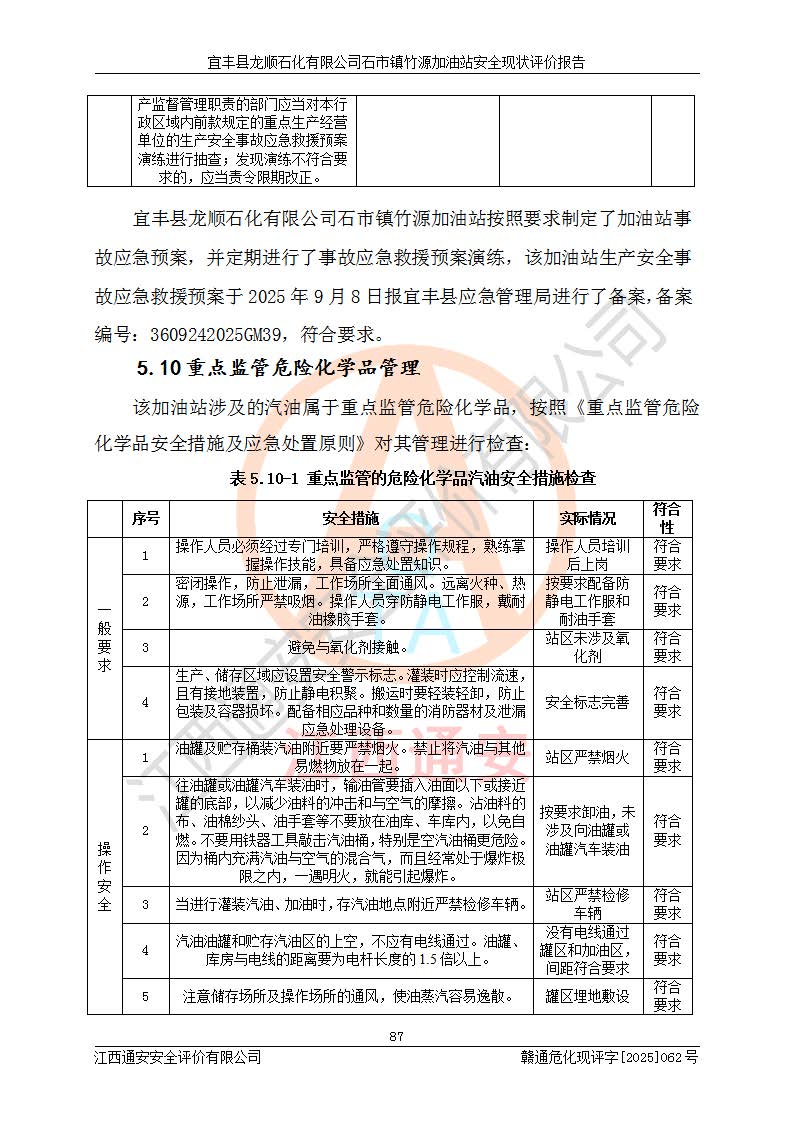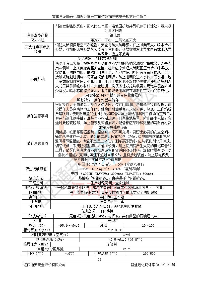其它 | 1、該加油站的主要化學(xué)品物質(zhì)是汽油和柴油。根據(jù)危險化學(xué)品目錄[2015年版]》(**安監(jiān)總局等十部門[2015]第5號)以及《應(yīng)急管理部辦公廳關(guān)于修改《危險化學(xué)品目錄(2015版)實施指南(試行)》涉及柴油部分內(nèi)容的通知》(應(yīng)急廳函〔2022〕300號)、應(yīng)急管理部 工業(yè)和信息化部 公安部 生態(tài)環(huán)境部 交通運輸部 農(nóng)業(yè)農(nóng)村部 衛(wèi)生健康委 市場監(jiān)管總局 鐵路局 民航局公告2022年第8號決定調(diào)整《危險化學(xué)品目錄(2015版)》,將“1674柴油[閉杯閃點≤60℃]”調(diào)整為“1674柴油”等文件進(jìn)行辨識:該加油站經(jīng)營的汽油、柴油均屬于危險化學(xué)品。 2、經(jīng)按照《危險化學(xué)品重大危險源辨識》GB18218-2018進(jìn)行辨識,該加油站生產(chǎn)單元、儲存單元均不構(gòu)成危險化學(xué)品重大危險源。 3、根據(jù)《**安全監(jiān)管總局關(guān)于公布首批重點監(jiān)管的危險化學(xué)品名錄的通知》安監(jiān)總管三[2011] 95號、《**安全監(jiān)管總局關(guān)于公布第二批重點監(jiān)管危險化學(xué)品名錄的通知》安監(jiān)總管三[2013] 12號進(jìn)行辨識:該加油站涉及重點監(jiān)管的危險化學(xué)品汽油。經(jīng)根據(jù)根據(jù)“汽油安全措施和應(yīng)急處理原則”要求的措施進(jìn)行檢查,該加油站員工經(jīng)安全培訓(xùn)后上崗,油罐區(qū)設(shè)置了液位監(jiān)測監(jiān)控報警系統(tǒng)、油罐泄漏檢測系統(tǒng)和視頻監(jiān)控系統(tǒng),當(dāng)液位*限時報警,觸動防溢閥,切斷進(jìn)油管路。加油站設(shè)置了急停開關(guān),可在緊急情況下一鍵切斷加油系統(tǒng)。 4、該加油站未涉及易制毒化學(xué)品。 5、根據(jù)《中華人民共和國監(jiān)控化學(xué)品管理條例》(中華人民共和國***令第588號修改)及《各類監(jiān)控化學(xué)品名錄》(中華人民共和國工業(yè)和信息化部令第52號;2020年)、《列入第三類監(jiān)控化學(xué)品的新增品種清單》(**石油和化學(xué)工業(yè)局令第1號)等規(guī)定進(jìn)行辨識:該加油站未涉及監(jiān)控化學(xué)品。 6、根據(jù)《危險化學(xué)品目錄(2015版)》(**安全生產(chǎn)監(jiān)督管理局等十部門公告[2015]第5號)辨識,該加油站未涉及劇毒化學(xué)品。 7、根據(jù)《高毒物品目錄》(衛(wèi)法監(jiān)發(fā)[2003]142號)進(jìn)行辨識,該加油站未涉及高毒物品。 8、依據(jù)公安部編制的《易制爆危險化學(xué)品名錄》(2017 年版)辨識,該加油站不涉及易制爆危險化學(xué)品。 9、根據(jù)《特別管控危險化學(xué)品目錄(**版)》(應(yīng)急管理部、工業(yè)和信息化部、公安部、交通運輸部公告(2020年 第3號))進(jìn)行辨識:該加油站經(jīng)營的汽油屬于特別管控危險化學(xué)品。 10、經(jīng)采用作業(yè)條件危險性評價法(LEC)進(jìn)行分析,該加油站的作業(yè)條件相對比較安全。在選定的加油作業(yè)、卸油作業(yè)、維修作業(yè)、配電作業(yè)等4個單元中均為“一般危險、需要注意”作業(yè)環(huán)境,且一般危險作業(yè)環(huán)境的出現(xiàn)均由物料的危險程度所決定,作業(yè)條件相對安全。 11、經(jīng)采用危險度評價法分析,油罐區(qū)主要危險物質(zhì)為汽油,屬甲B類可燃液體,故物質(zhì)取5分;油罐區(qū)內(nèi)油總儲量為90m3(折算成汽油貯量計)),故容量取5分;本單元在常溫、常壓下儲存,故溫度、壓力,取0分;單批式作業(yè),使用機械進(jìn)行程序操作有**危險,取2分。油罐區(qū)得分為12分,為Ⅱ級,屬中度危險。針對安全風(fēng)險,油罐區(qū)采取了措施:油罐采用雙層罐埋地設(shè)置,按要求設(shè)置了通氣管,并裝設(shè)了阻火器;設(shè)置了液位監(jiān)測報警系統(tǒng)和緊急切斷系統(tǒng),加油管道設(shè)置了雙層管道,其安全風(fēng)險可控。 12、采用檢查表評價法對該加油站進(jìn)行檢查分析,經(jīng)整改后,該加油站涉及的強制條款和其他項均符合要求。該加油站的站址符合城鄉(xiāng)總體規(guī)劃和安全要求,經(jīng)營和儲存場所、設(shè)施、建筑物的內(nèi)外部防火間距符合《汽車加油加氣加氫站技術(shù)標(biāo)準(zhǔn)》GB50156-2021等相關(guān)標(biāo)準(zhǔn)規(guī)范的要求。該加油站設(shè)置了消防安全設(shè)施、防雷防靜電設(shè)施、液位監(jiān)測措施、油罐泄漏檢測措施、電氣防爆措施等安全防護設(shè)施,取得了消防驗收意見書和防雷檢測合格報告,符合**法律法規(guī)、標(biāo)準(zhǔn)規(guī)范的要求。該加油站公用工程能夠滿足安全經(jīng)營的基本需要,符合安全經(jīng)營的條件。 13、該加油站相關(guān)證照齊全,成立了安全生產(chǎn)**小組,配備了安全管理人員,制定了安全管理制度、操作規(guī)程和事故應(yīng)急預(yù)案,加油站的安全管理機構(gòu)工作有力,加油站安全經(jīng)營管理處于正常有序開展范圍。 評價結(jié)論 宜豐縣龍順石化有限公司石市鎮(zhèn)竹源加油站站址合理,周邊環(huán)境良好,與敏感防護目標(biāo)間距符合規(guī)范要求,站區(qū)建構(gòu)筑物之間的防火間距、耐火等級符合標(biāo)準(zhǔn)要求,與總平面布置圖一致,加油卸油工藝及設(shè)備設(shè)施合理,工藝布置得當(dāng),防雷設(shè)施經(jīng)檢測合格,采取的工