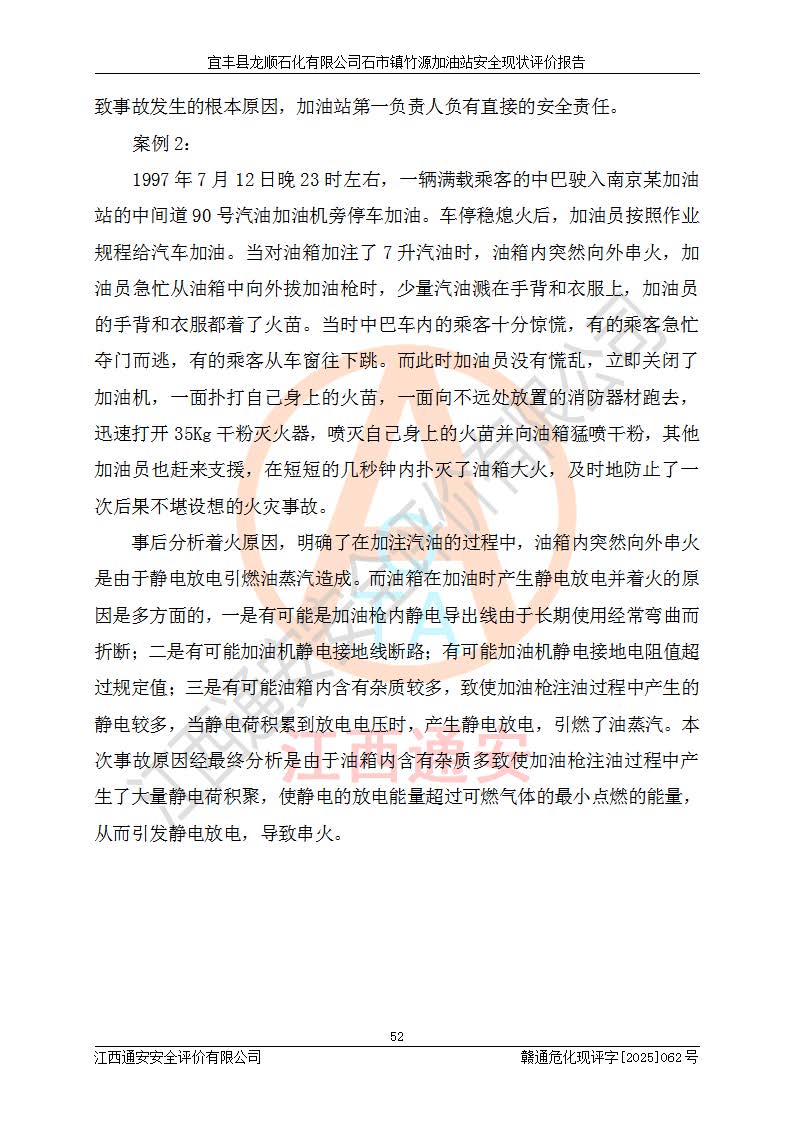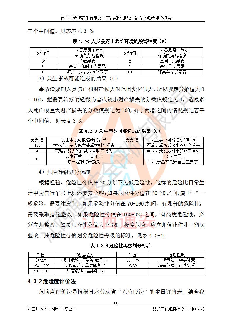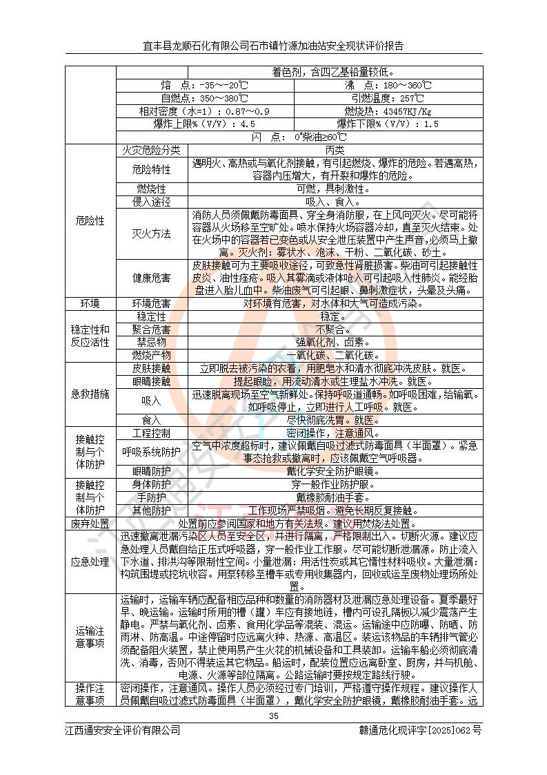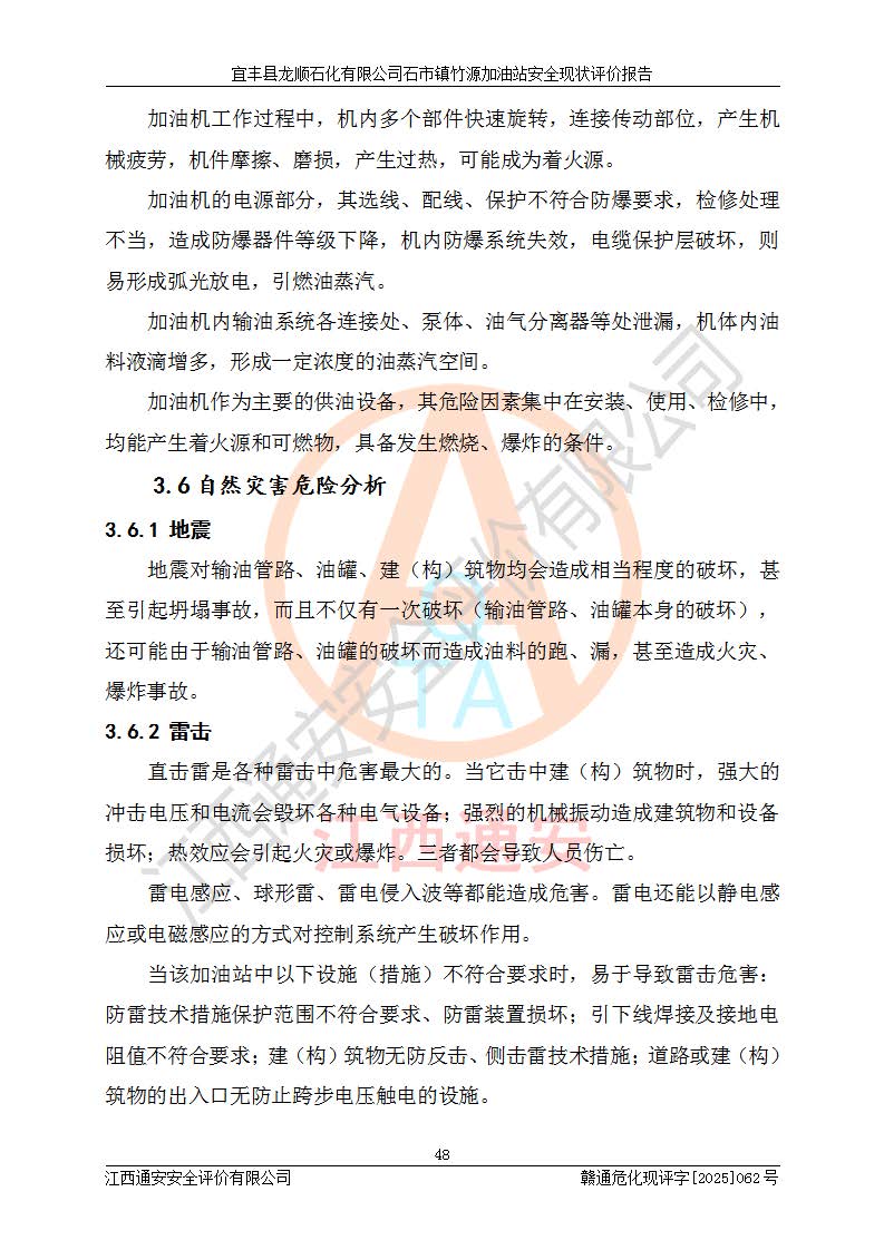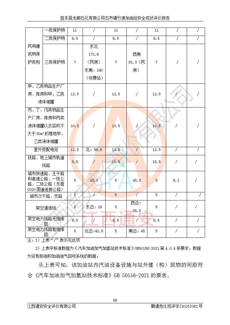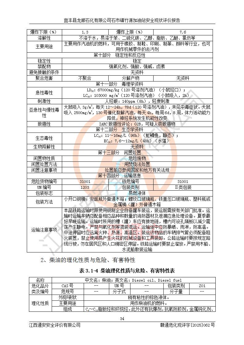 其它 | 1、該加油站的主要化學(xué)品物質(zhì)是汽油和柴油。根據(jù)危險化學(xué)品目錄[2015年版]》(**安監(jiān)總局等十部門[2015]第5號)以及《應(yīng)急管理部辦公廳關(guān)于修改《危險化學(xué)品目錄(2015版)實施指南(試行)》涉及柴油部分內(nèi)容的通知》(應(yīng)急廳函〔2022〕300號)、應(yīng)急管理部 工業(yè)和信息化部 公安部 生態(tài)環(huán)境部 交通運輸部 農(nóng)業(yè)農(nóng)村部 衛(wèi)生健康委 市場監(jiān)管總局 鐵路局 民航局公告2022年第8號決定調(diào)整《危險化學(xué)品目錄(2015版)》,將“1674柴油[閉杯閃點≤60℃]”調(diào)整為“1674柴油”等文件進(jìn)行辨識:該加油站經(jīng)營的汽油、柴油均屬于危險化學(xué)品。 2、經(jīng)按照《危險化學(xué)品重大危險源辨識》GB18218-2018進(jìn)行辨識,該加油站生產(chǎn)單元、儲存單元均不構(gòu)成危險化學(xué)品重大危險源。 3、根據(jù)《**安全監(jiān)管總局關(guān)于公布首批重點監(jiān)管的危險化學(xué)品名錄的通知》安監(jiān)總管三[2011] 95號、《**安全監(jiān)管總局關(guān)于公布第二批重點監(jiān)管危險化學(xué)品名錄的通知》安監(jiān)總管三[2013] 12號進(jìn)行辨識:該加油站涉及重點監(jiān)管的危險化學(xué)品汽油。經(jīng)根據(jù)根據(jù)“汽油安全措施和應(yīng)急處理原則”要求的措施進(jìn)行檢查,該加油站員工經(jīng)安全培訓(xùn)后上崗,油罐區(qū)設(shè)置了液位監(jiān)測監(jiān)控報警系統(tǒng)、油罐泄漏檢測系統(tǒng)和視頻監(jiān)控系統(tǒng),當(dāng)液位*限時報警,觸動防溢閥,切斷進(jìn)油管路。加油站設(shè)置了急停開關(guān),可在緊急情況下一鍵切斷加油系統(tǒng)。 4、該加油站未涉及易制毒化學(xué)品。 5、根據(jù)《中華人民共和國監(jiān)控化學(xué)品管理條例》(中華人民共和國***令第588號修改)及《各類監(jiān)控化學(xué)品名錄》(中華人民共和國工業(yè)和信息化部令第52號;2020年)、《列入第三類監(jiān)控化學(xué)品的新增品種清單》(**石油和化學(xué)工業(yè)局令第1號)等規(guī)定進(jìn)行辨識:該加油站未涉及監(jiān)控化學(xué)品。 6、根據(jù)《危險化學(xué)品目錄(2015版)》(**安全生產(chǎn)監(jiān)督管理局等十部門公告[2015]第5號)辨識,該加油站未涉及劇毒化學(xué)品。 7、根據(jù)《高毒物品目錄》(衛(wèi)法監(jiān)發(fā)[2003]142號)進(jìn)行辨識,該加油站未涉及高毒物品。 8、依據(jù)公安部編制的《易制爆危險化學(xué)品名錄》(2017 年版)辨識,該加油站不涉及易制爆危險化學(xué)品。 9、根據(jù)《特別管控危險化學(xué)品目錄(**版)》(應(yīng)急管理部、工業(yè)和信息化部、公安部、交通運輸部公告(2020年 第3號))進(jìn)行辨識:該加油站經(jīng)營的汽油屬于特別管控危險化學(xué)品。 10、經(jīng)采用作業(yè)條件危險性評價法(LEC)進(jìn)行分析,該加油站的作業(yè)條件相對比較安全。在選定的加油作業(yè)、卸油作業(yè)、維修作業(yè)、配電作業(yè)等4個單元中均為“一般危險、需要注意”作業(yè)環(huán)境,且一般危險作業(yè)環(huán)境的出現(xiàn)均由物料的危險程度所決定,作業(yè)條件相對安全。 11、經(jīng)采用危險度評價法分析,油罐區(qū)主要危險物質(zhì)為汽油,屬甲B類可燃液體,故物質(zhì)取5分;油罐區(qū)內(nèi)油總儲量為90m3(折算成汽油貯量計)),故容量取5分;本單元在常溫、常壓下儲存,故溫度、壓力,取0分;單批式作業(yè),使用機械進(jìn)行程序操作有**危險,取2分。油罐區(qū)得分為12分,為Ⅱ級,屬中度危險。針對安全風(fēng)險,油罐區(qū)采取了措施:油罐采用雙層罐埋地設(shè)置,按要求設(shè)置了通氣管,并裝設(shè)了阻火器;設(shè)置了液位監(jiān)測報警系統(tǒng)和緊急切斷系統(tǒng),加油管道設(shè)置了雙層管道,其安全風(fēng)險可控。 12、采用檢查表評價法對該加油站進(jìn)行檢查分析,經(jīng)整改后,該加油站涉及的強制條款和其他項均符合要求。該加油站的站址符合城鄉(xiāng)總體規(guī)劃和安全要求,經(jīng)營和儲存場所、設(shè)施、建筑物的內(nèi)外部防火間距符合《汽車加油加氣加氫站技術(shù)標(biāo)準(zhǔn)》GB50156-2021等相關(guān)標(biāo)準(zhǔn)規(guī)范的要求。該加油站設(shè)置了消防安全設(shè)施、防雷防靜電設(shè)施、液位監(jiān)測措施、油罐泄漏檢測措施、電氣防爆措施等安全防護設(shè)施,取得了消防驗收意見書和防雷檢測合格報告,符合**法律法規(guī)、標(biāo)準(zhǔn)規(guī)范的要求。該加油站公用工程能夠滿足安全經(jīng)營的基本需要,符合安全經(jīng)營的條件。 13、該加油站相關(guān)證照齊全,成立了安全生產(chǎn)**小組,配備了安全管理人員,制定了安全管理制度、操作規(guī)程和事故應(yīng)急預(yù)案,加油站的安全管理機構(gòu)工作有力,加油站安全經(jīng)營管理處于正常有序開展范圍。 評價結(jié)論 宜豐縣龍順石化有限公司石市鎮(zhèn)竹源加油站站址合理,周邊環(huán)境良好,與敏感防護目標(biāo)間距符合規(guī)范要求,站區(qū)建構(gòu)筑物之間的防火間距、耐火等級符合標(biāo)準(zhǔn)要求,與總平面布置圖一致,加油卸油工藝及設(shè)備設(shè)施合理,工藝布置得當(dāng),防雷設(shè)施經(jīng)檢測合格,采取的工