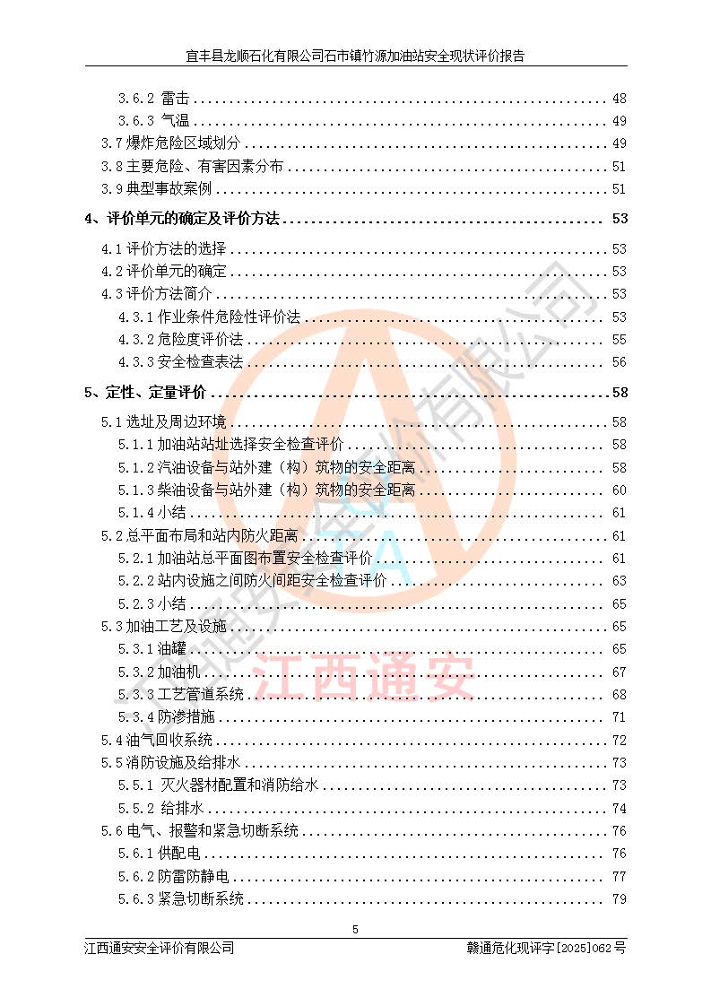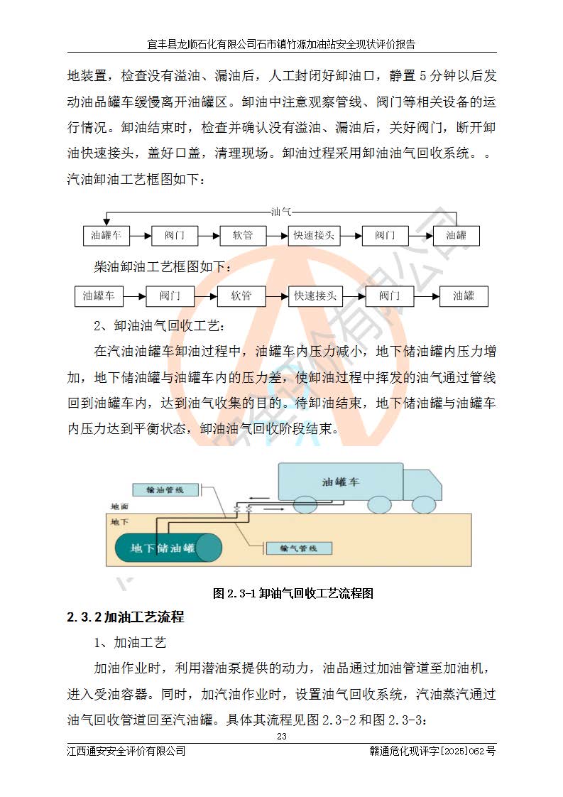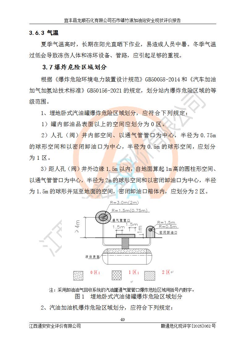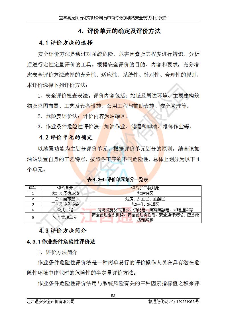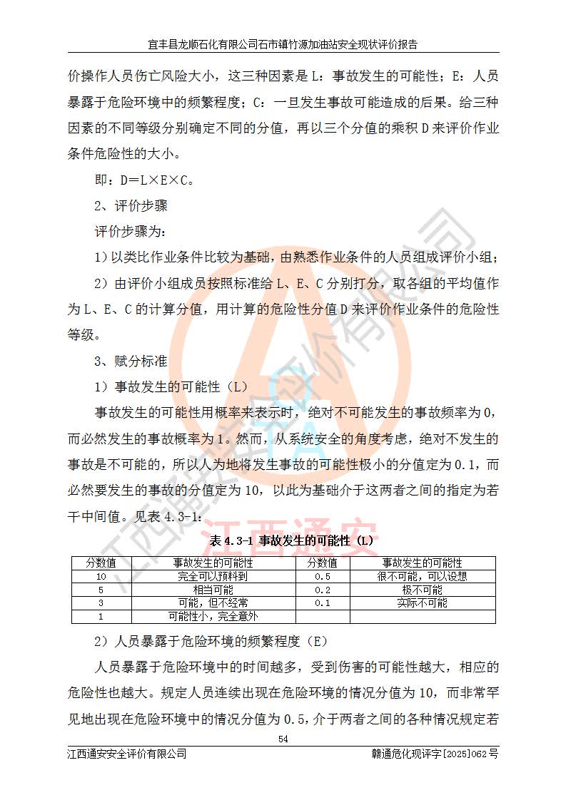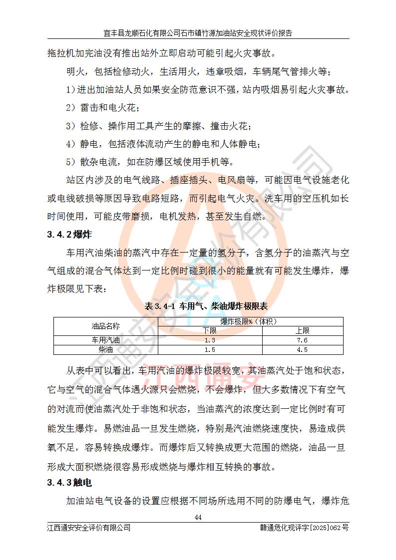 其它 | 1、該加油站的主要化學(xué)品物質(zhì)是汽油和柴油。根據(jù)危險化學(xué)品目錄[2015年版]》(**安監(jiān)總局等十部門[2015]第5號)以及《應(yīng)急管理部辦公廳關(guān)于修改《危險化學(xué)品目錄(2015版)實施指南(試行)》涉及柴油部分內(nèi)容的通知》(應(yīng)急廳函〔2022〕300號)、應(yīng)急管理部 工業(yè)和信息化部 公安部 生態(tài)環(huán)境部 交通運輸部 農(nóng)業(yè)農(nóng)村部 衛(wèi)生健康委 市場監(jiān)管總局 鐵路局 民航局公告2022年第8號決定調(diào)整《危險化學(xué)品目錄(2015版)》,將“1674柴油[閉杯閃點≤60℃]”調(diào)整為“1674柴油”等文件進(jìn)行辨識:該加油站經(jīng)營的汽油、柴油均屬于危險化學(xué)品。 2、經(jīng)按照《危險化學(xué)品重大危險源辨識》GB18218-2018進(jìn)行辨識,該加油站生產(chǎn)單元、儲存單元均不構(gòu)成危險化學(xué)品重大危險源。 3、根據(jù)《**安全監(jiān)管總局關(guān)于公布首批重點監(jiān)管的危險化學(xué)品名錄的通知》安監(jiān)總管三[2011] 95號、《**安全監(jiān)管總局關(guān)于公布第二批重點監(jiān)管危險化學(xué)品名錄的通知》安監(jiān)總管三[2013] 12號進(jìn)行辨識:該加油站涉及重點監(jiān)管的危險化學(xué)品汽油。經(jīng)根據(jù)根據(jù)“汽油安全措施和應(yīng)急處理原則”要求的措施進(jìn)行檢查,該加油站員工經(jīng)安全培訓(xùn)后上崗,油罐區(qū)設(shè)置了液位監(jiān)測監(jiān)控報警系統(tǒng)、油罐泄漏檢測系統(tǒng)和視頻監(jiān)控系統(tǒng),當(dāng)液位*限時報警,觸動防溢閥,切斷進(jìn)油管路。加油站設(shè)置了急停開關(guān),可在緊急情況下一鍵切斷加油系統(tǒng)。 4、該加油站未涉及易制毒化學(xué)品。 5、根據(jù)《中華人民共和國監(jiān)控化學(xué)品管理條例》(中華人民共和國***令第588號修改)及《各類監(jiān)控化學(xué)品名錄》(中華人民共和國工業(yè)和信息化部令第52號;2020年)、《列入第三類監(jiān)控化學(xué)品的新增品種清單》(**石油和化學(xué)工業(yè)局令第1號)等規(guī)定進(jìn)行辨識:該加油站未涉及監(jiān)控化學(xué)品。 6、根據(jù)《危險化學(xué)品目錄(2015版)》(**安全生產(chǎn)監(jiān)督管理局等十部門公告[2015]第5號)辨識,該加油站未涉及劇毒化學(xué)品。 7、根據(jù)《高毒物品目錄》(衛(wèi)法監(jiān)發(fā)[2003]142號)進(jìn)行辨識,該加油站未涉及高毒物品。 8、依據(jù)公安部編制的《易制爆危險化學(xué)品名錄》(2017 年版)辨識,該加油站不涉及易制爆危險化學(xué)品。 9、根據(jù)《特別管控危險化學(xué)品目錄(**版)》(應(yīng)急管理部、工業(yè)和信息化部、公安部、交通運輸部公告(2020年 第3號))進(jìn)行辨識:該加油站經(jīng)營的汽油屬于特別管控危險化學(xué)品。 10、經(jīng)采用作業(yè)條件危險性評價法(LEC)進(jìn)行分析,該加油站的作業(yè)條件相對比較安全。在選定的加油作業(yè)、卸油作業(yè)、維修作業(yè)、配電作業(yè)等4個單元中均為“一般危險、需要注意”作業(yè)環(huán)境,且一般危險作業(yè)環(huán)境的出現(xiàn)均由物料的危險程度所決定,作業(yè)條件相對安全。 11、經(jīng)采用危險度評價法分析,油罐區(qū)主要危險物質(zhì)為汽油,屬甲B類可燃液體,故物質(zhì)取5分;油罐區(qū)內(nèi)油總儲量為90m3(折算成汽油貯量計)),故容量取5分;本單元在常溫、常壓下儲存,故溫度、壓力,取0分;單批式作業(yè),使用機械進(jìn)行程序操作有**危險,取2分。油罐區(qū)得分為12分,為Ⅱ級,屬中度危險。針對安全風(fēng)險,油罐區(qū)采取了措施:油罐采用雙層罐埋地設(shè)置,按要求設(shè)置了通氣管,并裝設(shè)了阻火器;設(shè)置了液位監(jiān)測報警系統(tǒng)和緊急切斷系統(tǒng),加油管道設(shè)置了雙層管道,其安全風(fēng)險可控。 12、采用檢查表評價法對該加油站進(jìn)行檢查分析,經(jīng)整改后,該加油站涉及的強制條款和其他項均符合要求。該加油站的站址符合城鄉(xiāng)總體規(guī)劃和安全要求,經(jīng)營和儲存場所、設(shè)施、建筑物的內(nèi)外部防火間距符合《汽車加油加氣加氫站技術(shù)標(biāo)準(zhǔn)》GB50156-2021等相關(guān)標(biāo)準(zhǔn)規(guī)范的要求。該加油站設(shè)置了消防安全設(shè)施、防雷防靜電設(shè)施、液位監(jiān)測措施、油罐泄漏檢測措施、電氣防爆措施等安全防護設(shè)施,取得了消防驗收意見書和防雷檢測合格報告,符合**法律法規(guī)、標(biāo)準(zhǔn)規(guī)范的要求。該加油站公用工程能夠滿足安全經(jīng)營的基本需要,符合安全經(jīng)營的條件。 13、該加油站相關(guān)證照齊全,成立了安全生產(chǎn)**小組,配備了安全管理人員,制定了安全管理制度、操作規(guī)程和事故應(yīng)急預(yù)案,加油站的安全管理機構(gòu)工作有力,加油站安全經(jīng)營管理處于正常有序開展范圍。 評價結(jié)論 宜豐縣龍順石化有限公司石市鎮(zhèn)竹源加油站站址合理,周邊環(huán)境良好,與敏感防護目標(biāo)間距符合規(guī)范要求,站區(qū)建構(gòu)筑物之間的防火間距、耐火等級符合標(biāo)準(zhǔn)要求,與總平面布置圖一致,加油卸油工藝及設(shè)備設(shè)施合理,工藝布置得當(dāng),防雷設(shè)施經(jīng)檢測合格,采取的工