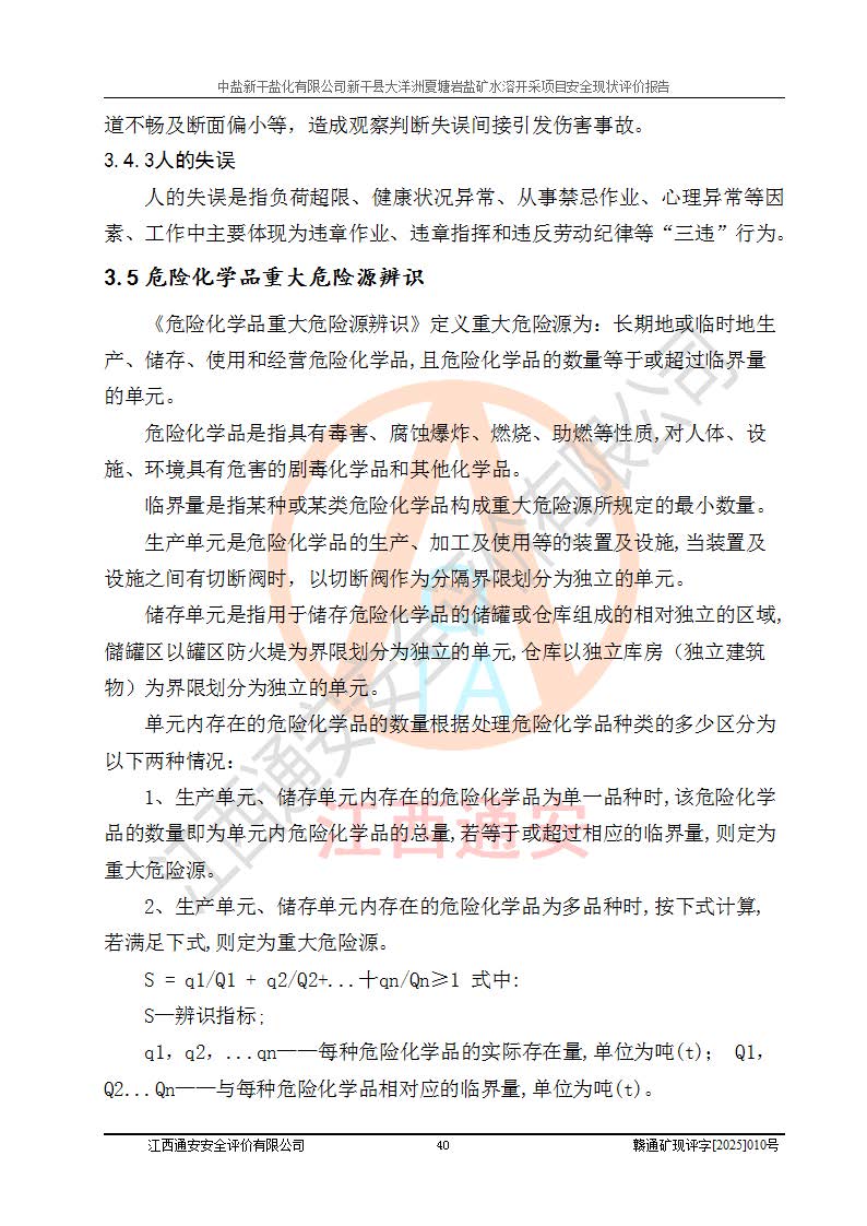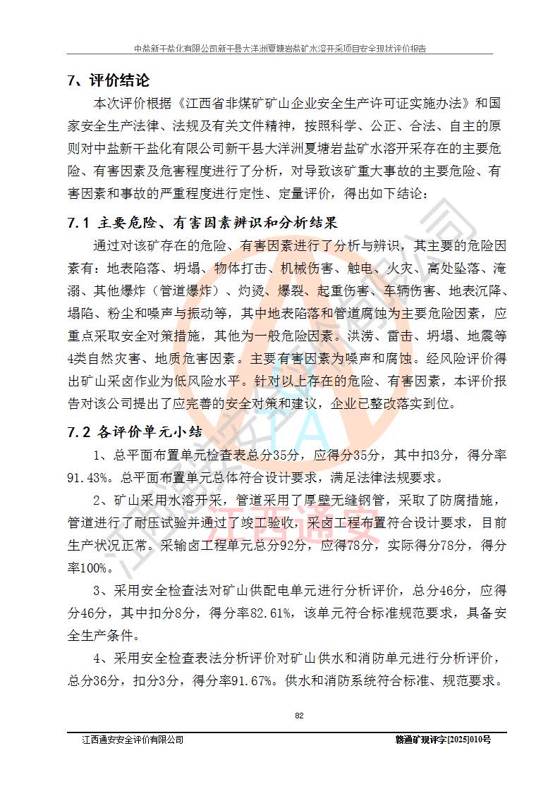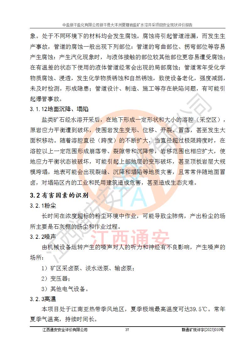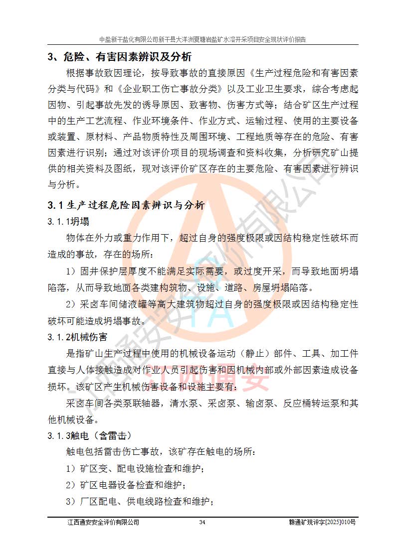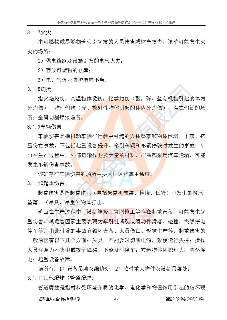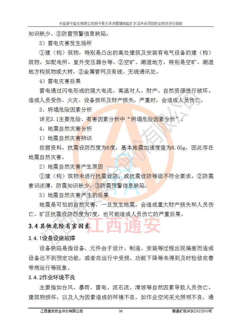 其它 | 通過對該礦存在的危險、有害因素進行了分析與辨識,其主要的危險因素有:地表陷落、坍塌、物體打擊、機械傷害、觸電、火災、高處墜落、淹溺、其他爆炸(管道爆炸)、灼燙、爆裂、起重傷害、**傷害、地表沉降、塌陷、粉塵和噪聲與振動等,其中地表陷落和管道腐蝕為主要危險因素,應重點采取安全對策措施,其他為一般危險因素。洪澇、雷擊、坍塌、地震等4類自然災害、地質危害因素。主要有害因素為噪聲和腐蝕。經(jīng)風險評價得出礦山采鹵作業(yè)為低風險水平。針對以上存在的危險、有害因素,本評價報告對該公司提出了應完善的安全對策和建議,企業(yè)已整改落實到位。 評價結論: 中鹽新干鹽化有限公司新干縣大洋洲夏塘巖鹽礦能滿足基本安全生產(chǎn)活動,風險在可接受范圍內(nèi),具備安全生產(chǎn)條件。 | ||||
