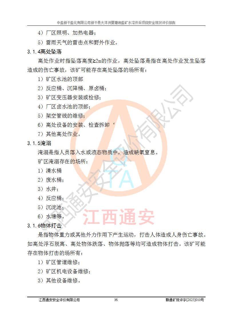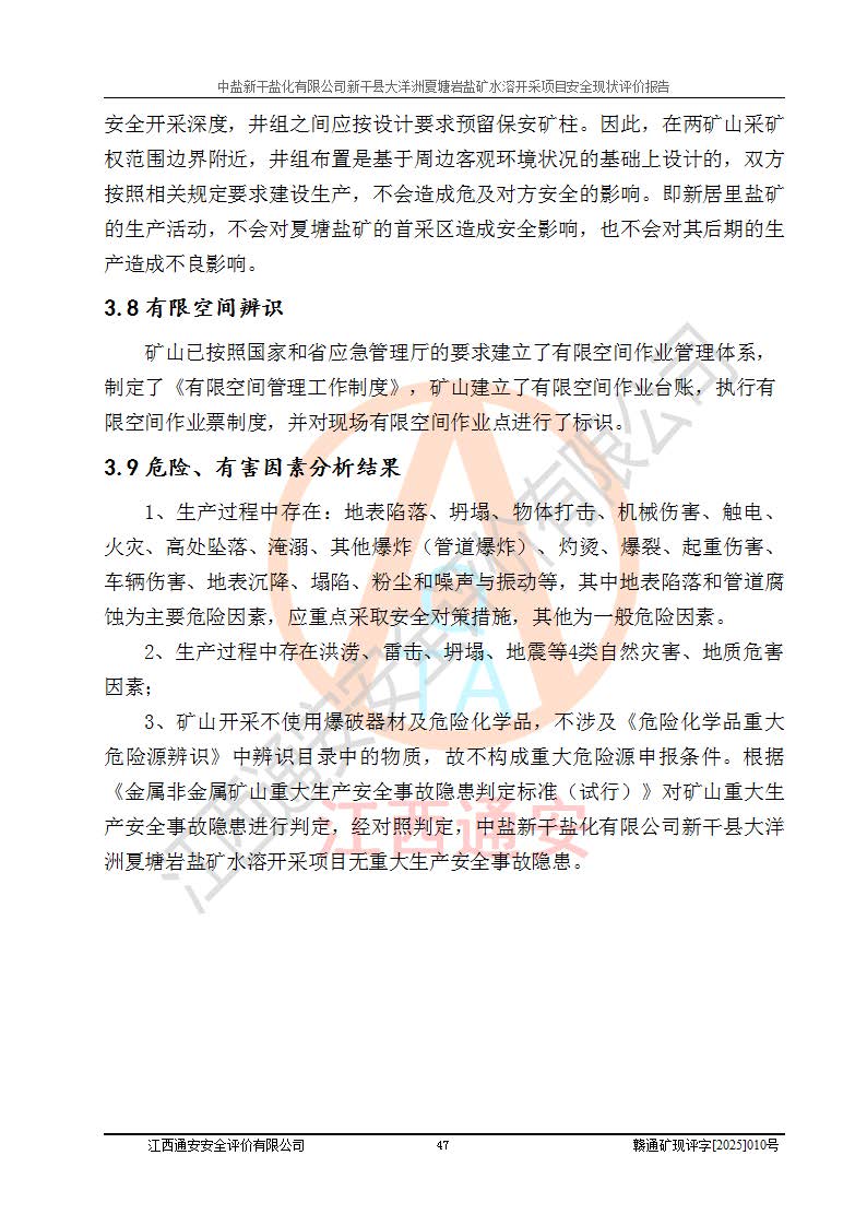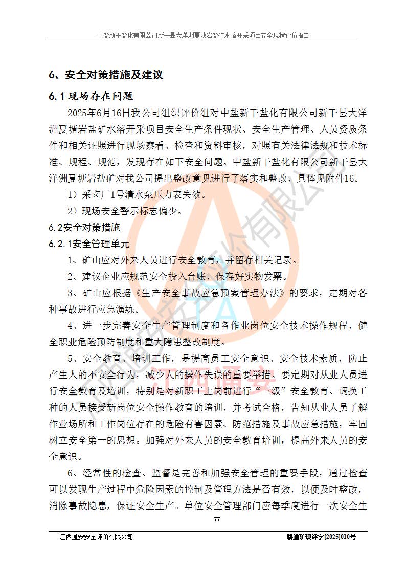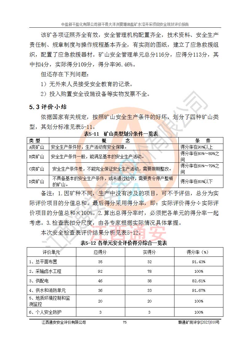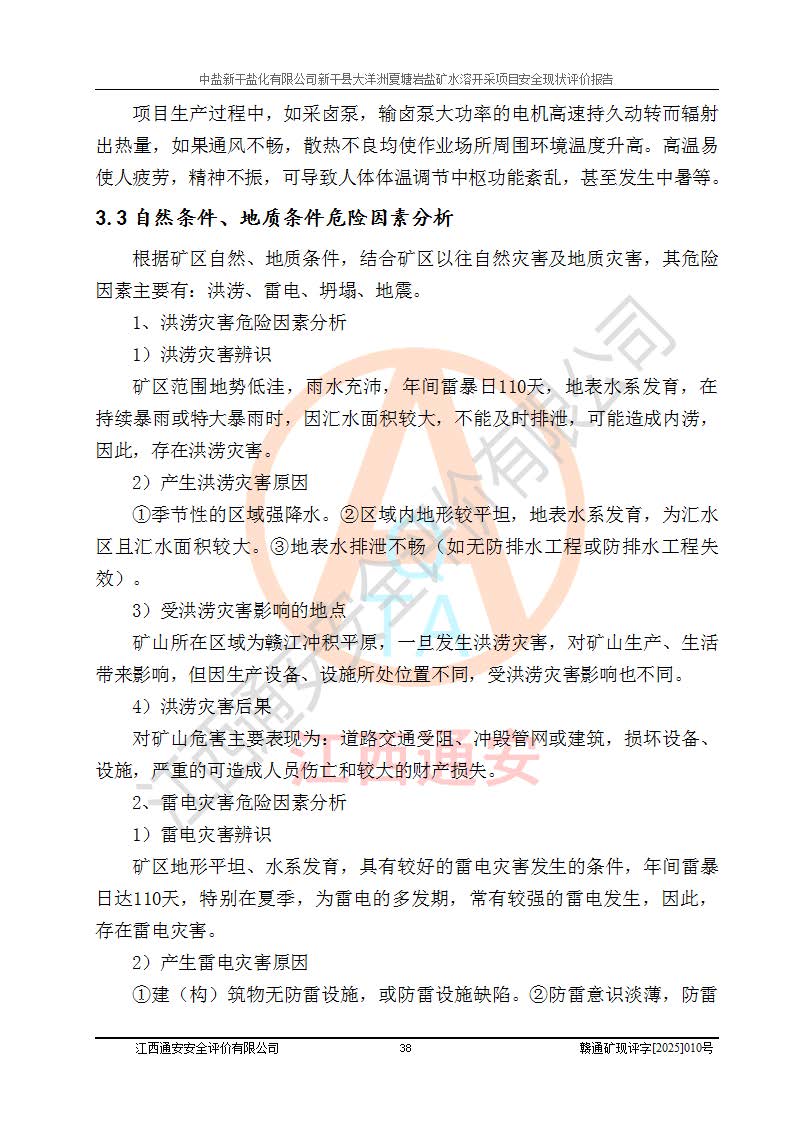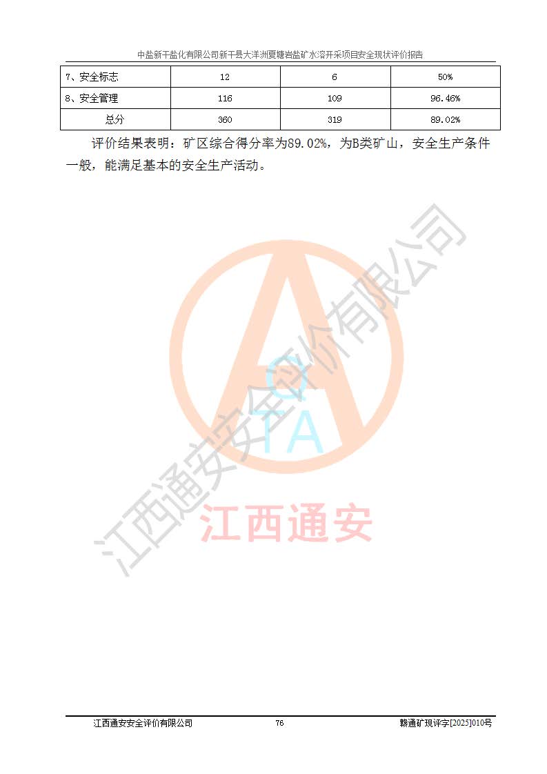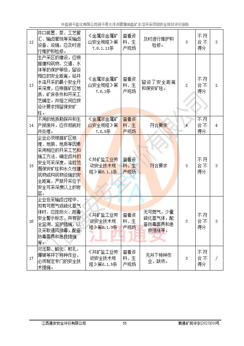 其它 | 通過對該礦存在的危險、有害因素進行了分析與辨識,其主要的危險因素有:地表陷落、坍塌、物體打擊、機械傷害、觸電、火災、高處墜落、淹溺、其他爆炸(管道爆炸)、灼燙、爆裂、起重傷害、**傷害、地表沉降、塌陷、粉塵和噪聲與振動等,其中地表陷落和管道腐蝕為主要危險因素,應重點采取安全對策措施,其他為一般危險因素。洪澇、雷擊、坍塌、地震等4類自然災害、地質危害因素。主要有害因素為噪聲和腐蝕。經(jīng)風險評價得出礦山采鹵作業(yè)為低風險水平。針對以上存在的危險、有害因素,本評價報告對該公司提出了應完善的安全對策和建議,企業(yè)已整改落實到位。 評價結論: 中鹽新干鹽化有限公司新干縣大洋洲夏塘巖鹽礦能滿足基本安全生產(chǎn)活動,風險在可接受范圍內(nèi),具備安全生產(chǎn)條件。 | ||||