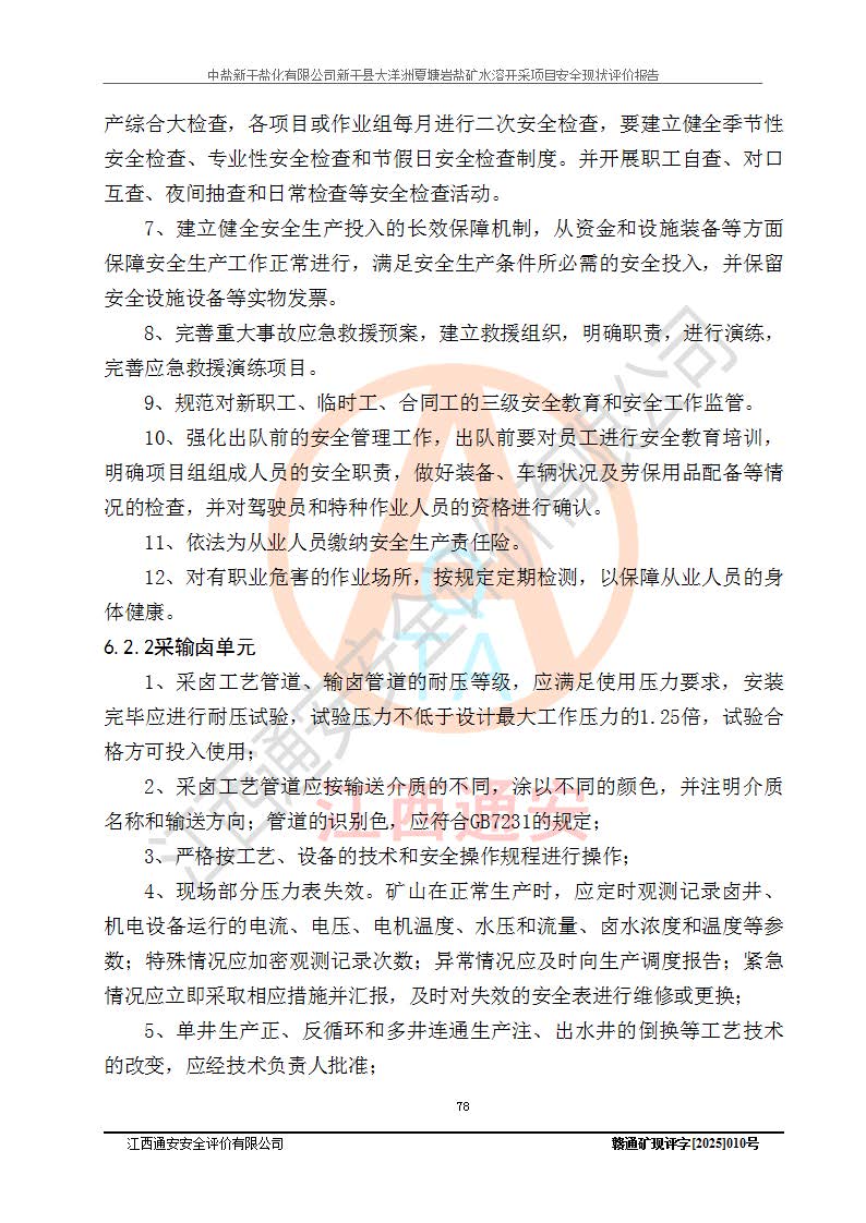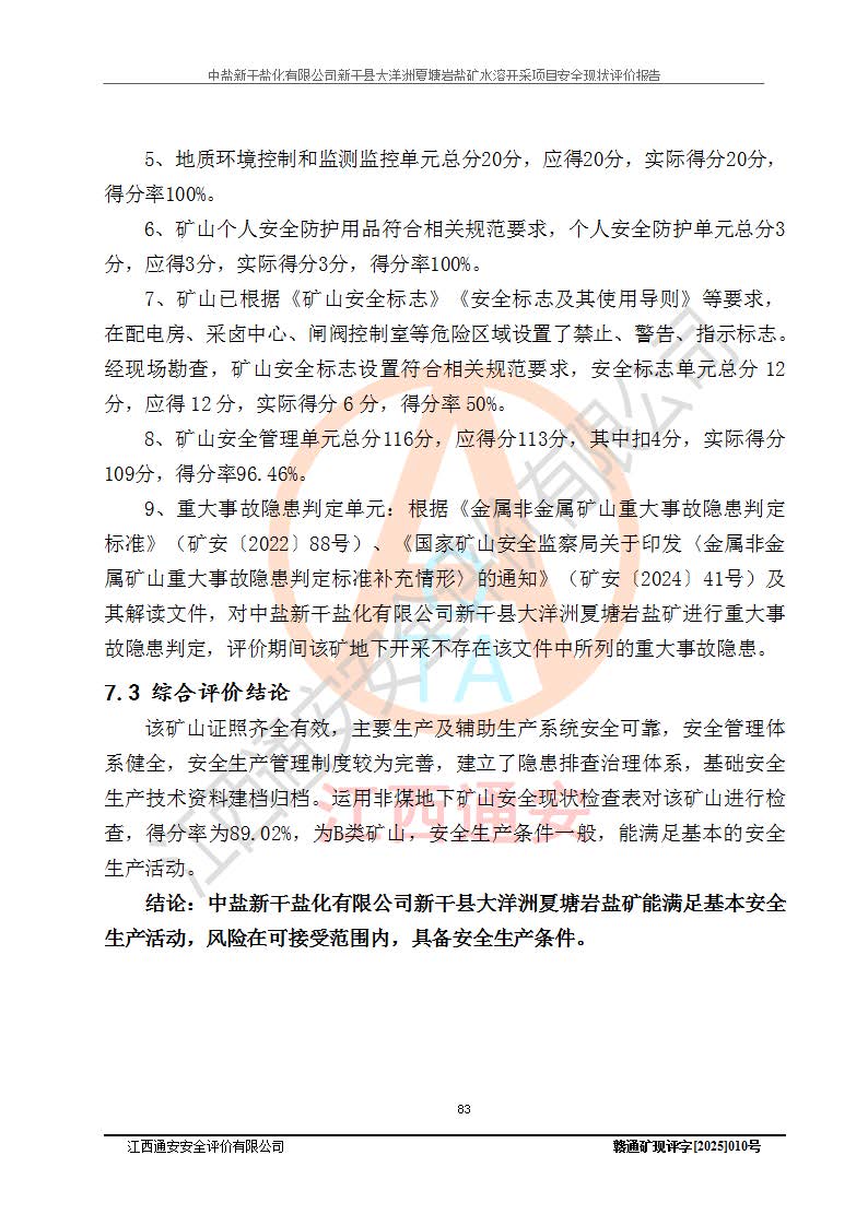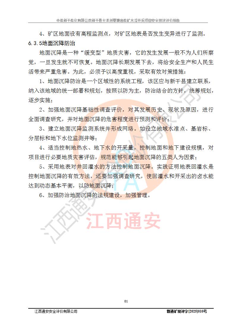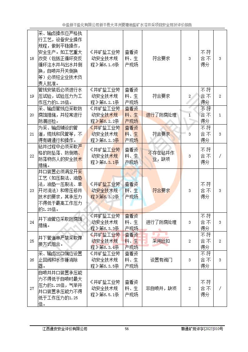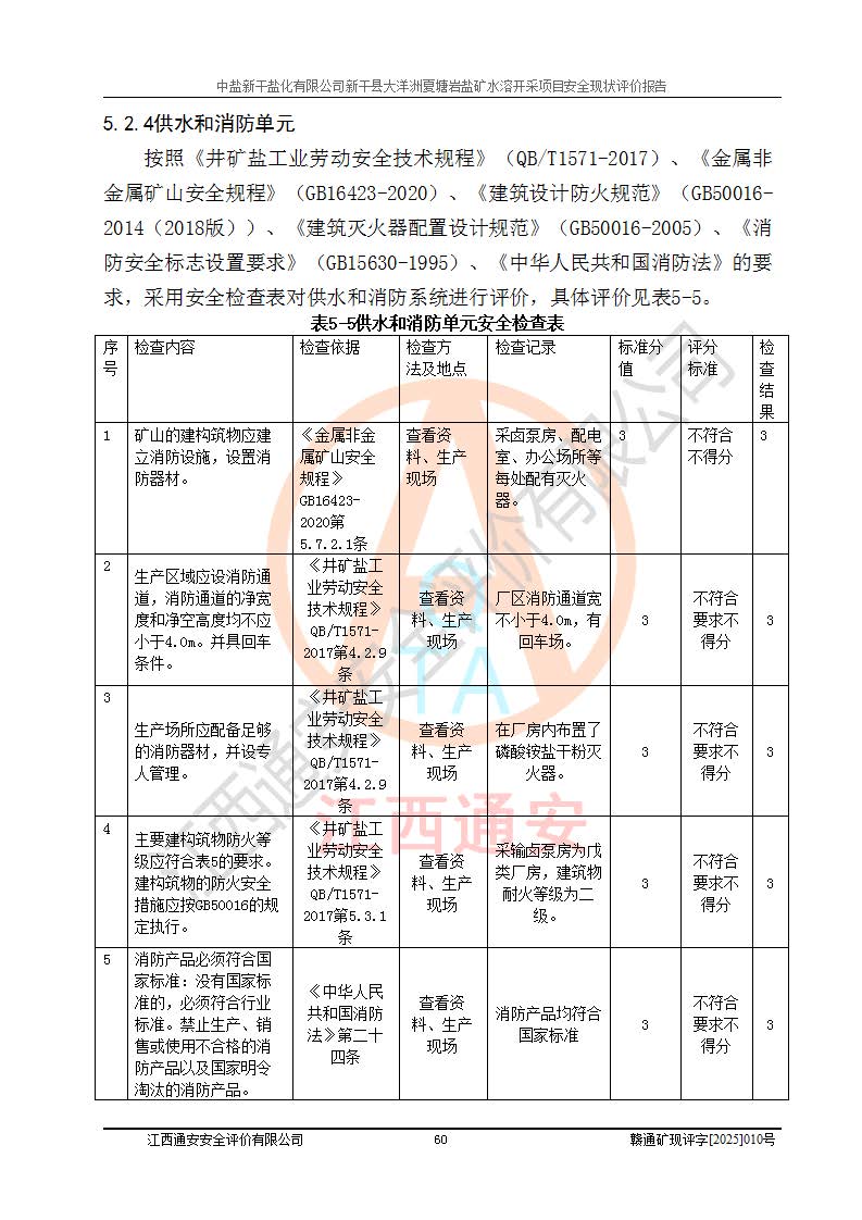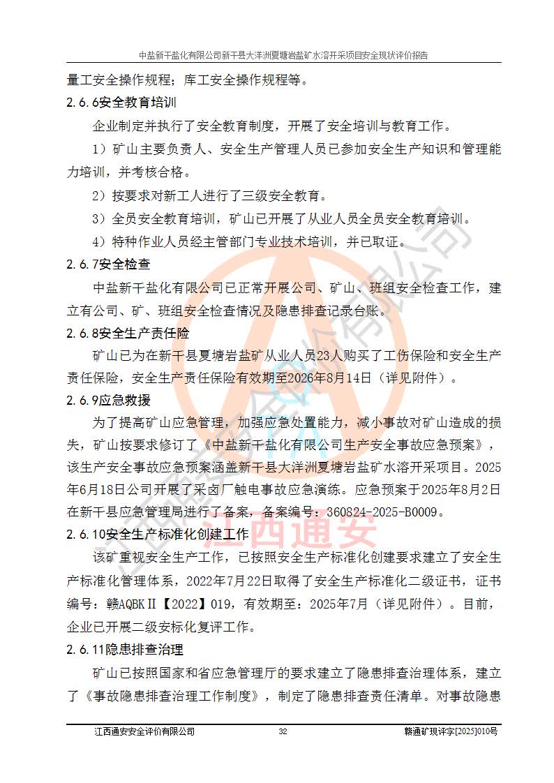 其它 | 通過對該礦存在的危險、有害因素進行了分析與辨識,其主要的危險因素有:地表陷落、坍塌、物體打擊、機械傷害、觸電、火災、高處墜落、淹溺、其他爆炸(管道爆炸)、灼燙、爆裂、起重傷害、**傷害、地表沉降、塌陷、粉塵和噪聲與振動等,其中地表陷落和管道腐蝕為主要危險因素,應重點采取安全對策措施,其他為一般危險因素。洪澇、雷擊、坍塌、地震等4類自然災害、地質危害因素。主要有害因素為噪聲和腐蝕。經(jīng)風險評價得出礦山采鹵作業(yè)為低風險水平。針對以上存在的危險、有害因素,本評價報告對該公司提出了應完善的安全對策和建議,企業(yè)已整改落實到位。 評價結論: 中鹽新干鹽化有限公司新干縣大洋洲夏塘巖鹽礦能滿足基本安全生產(chǎn)活動,風險在可接受范圍內(nèi),具備安全生產(chǎn)條件。 | ||||