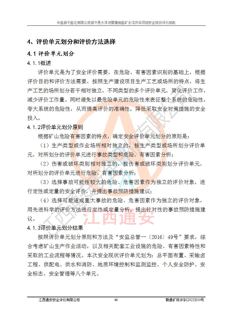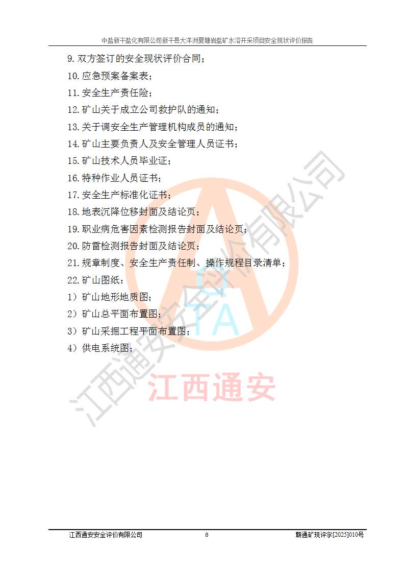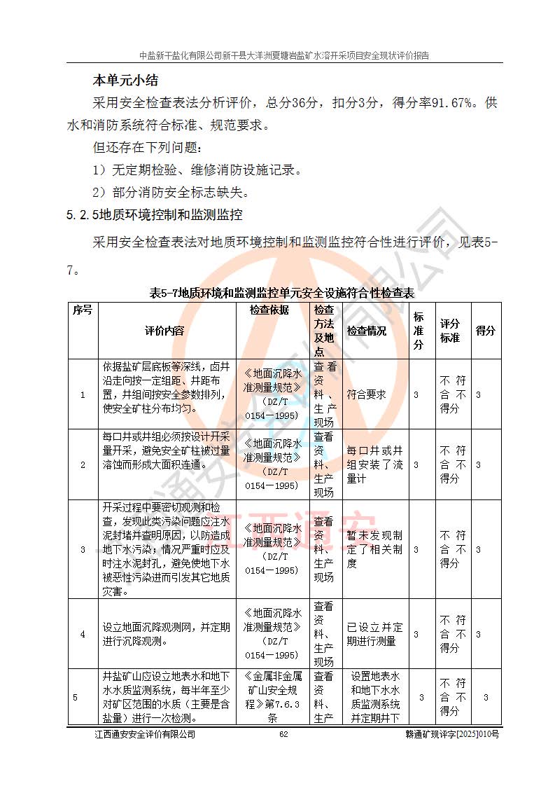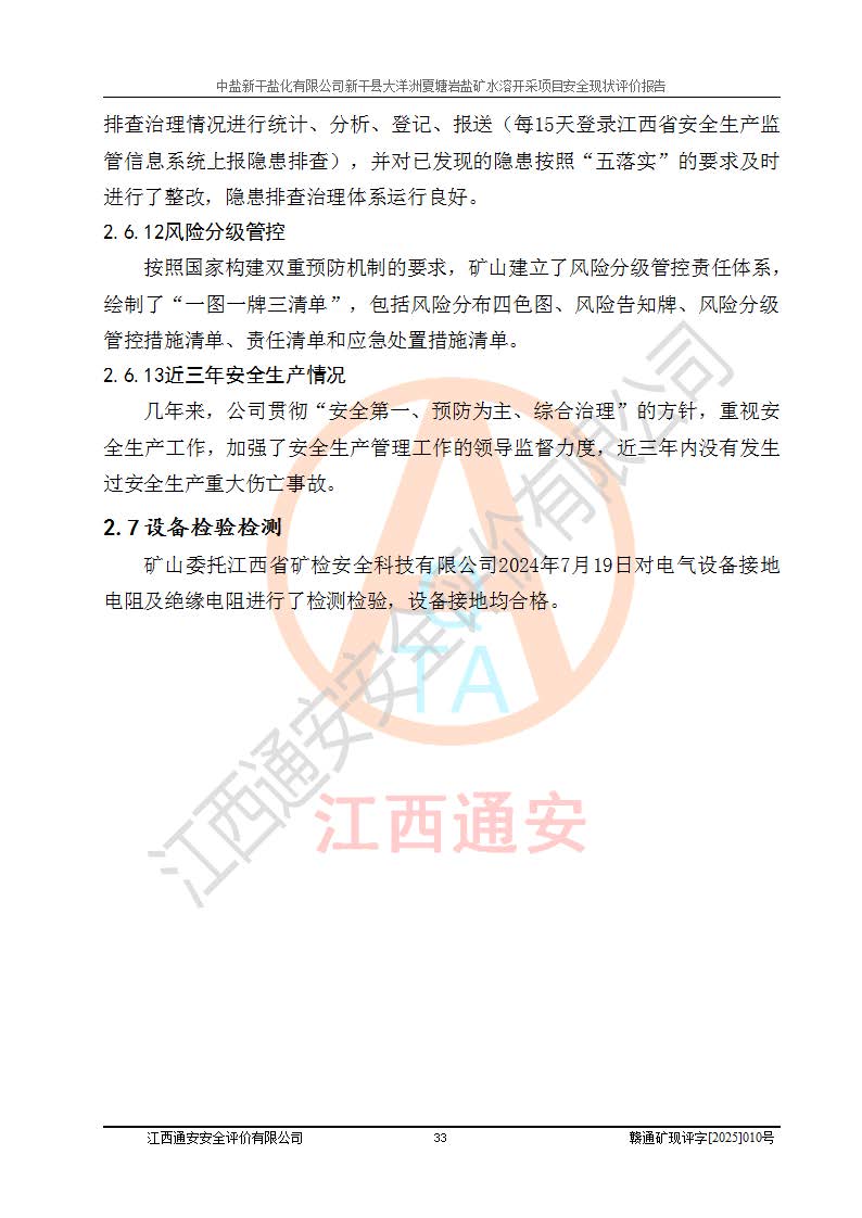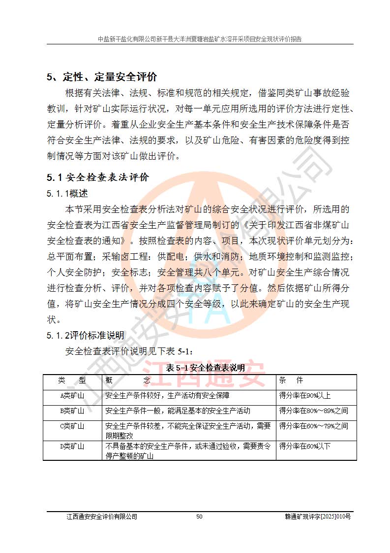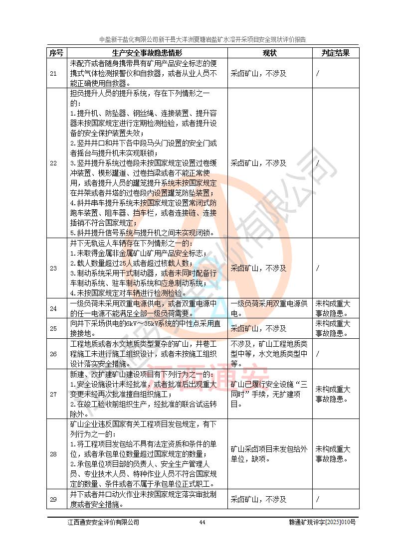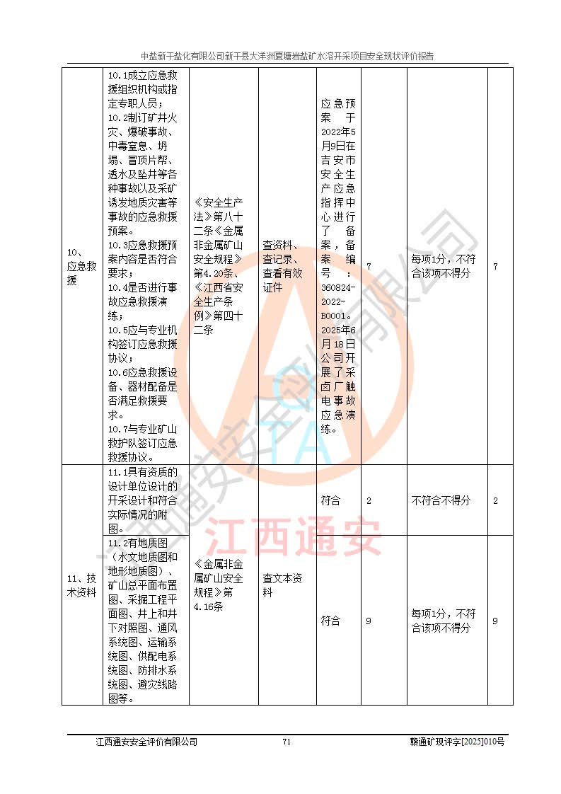 其它 | 通過對該礦存在的危險、有害因素進行了分析與辨識,其主要的危險因素有:地表陷落、坍塌、物體打擊、機械傷害、觸電、火災、高處墜落、淹溺、其他爆炸(管道爆炸)、灼燙、爆裂、起重傷害、**傷害、地表沉降、塌陷、粉塵和噪聲與振動等,其中地表陷落和管道腐蝕為主要危險因素,應重點采取安全對策措施,其他為一般危險因素。洪澇、雷擊、坍塌、地震等4類自然災害、地質危害因素。主要有害因素為噪聲和腐蝕。經(jīng)風險評價得出礦山采鹵作業(yè)為低風險水平。針對以上存在的危險、有害因素,本評價報告對該公司提出了應完善的安全對策和建議,企業(yè)已整改落實到位。 評價結論: 中鹽新干鹽化有限公司新干縣大洋洲夏塘巖鹽礦能滿足基本安全生產(chǎn)活動,風險在可接受范圍內(nèi),具備安全生產(chǎn)條件。 | ||||