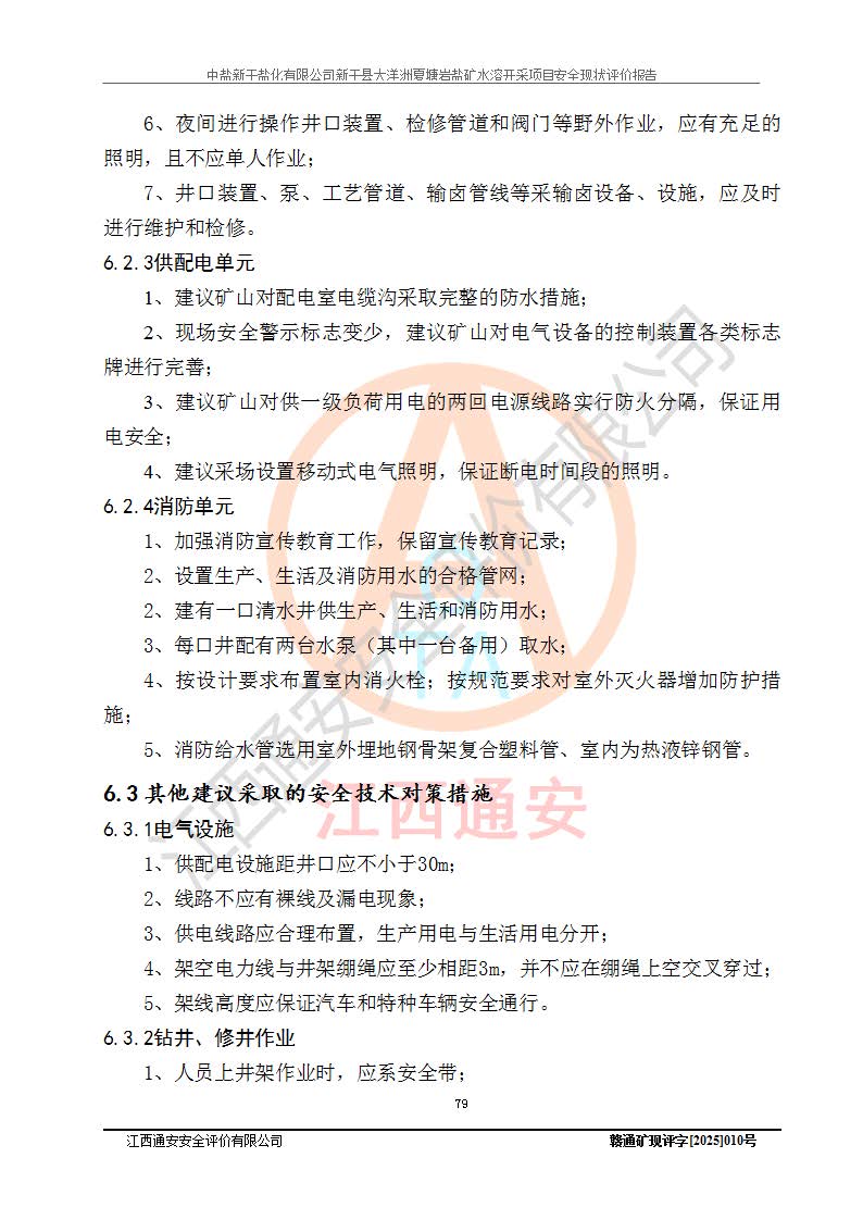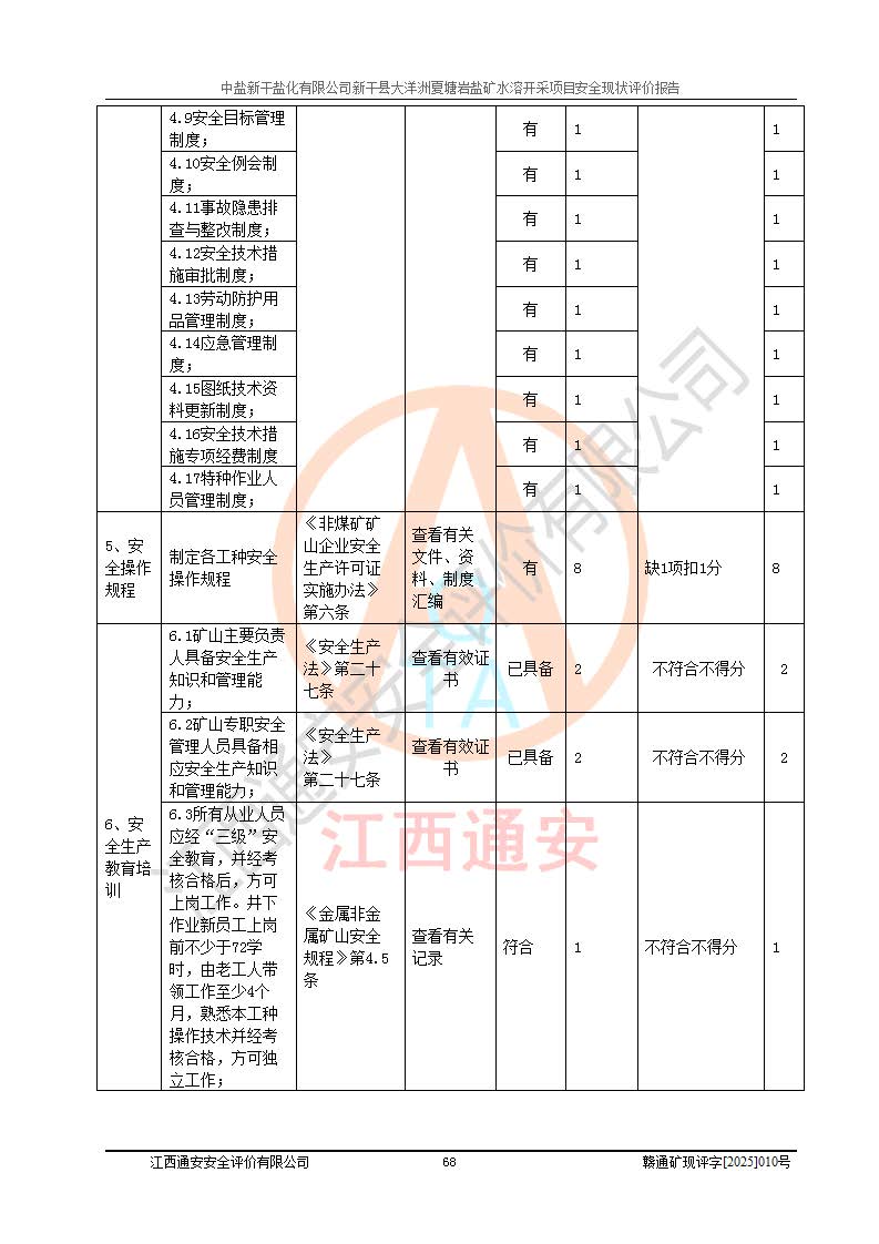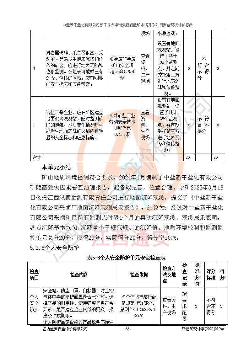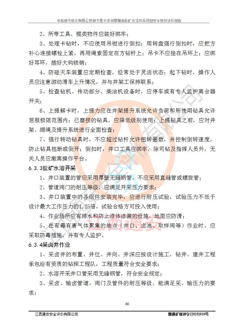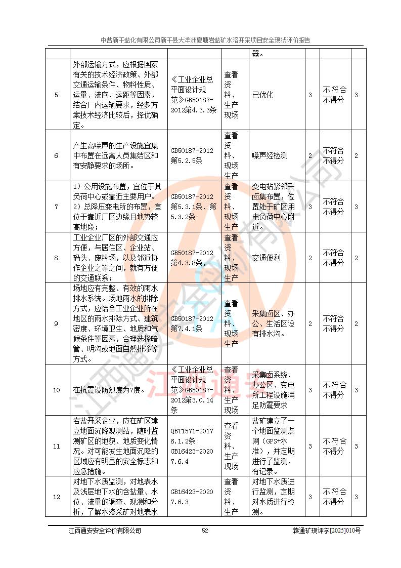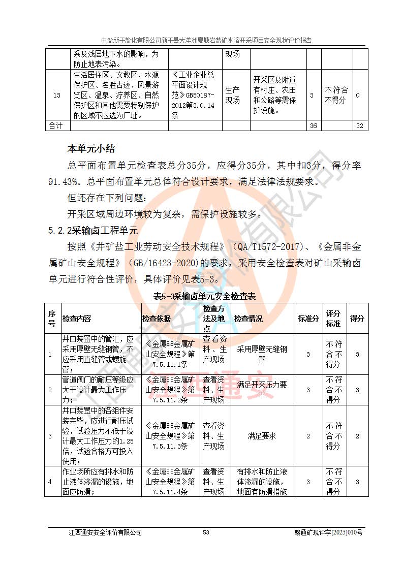 其它 | 通過對該礦存在的危險、有害因素進行了分析與辨識,其主要的危險因素有:地表陷落、坍塌、物體打擊、機械傷害、觸電、火災、高處墜落、淹溺、其他爆炸(管道爆炸)、灼燙、爆裂、起重傷害、**傷害、地表沉降、塌陷、粉塵和噪聲與振動等,其中地表陷落和管道腐蝕為主要危險因素,應重點采取安全對策措施,其他為一般危險因素。洪澇、雷擊、坍塌、地震等4類自然災害、地質危害因素。主要有害因素為噪聲和腐蝕。經(jīng)風險評價得出礦山采鹵作業(yè)為低風險水平。針對以上存在的危險、有害因素,本評價報告對該公司提出了應完善的安全對策和建議,企業(yè)已整改落實到位。 評價結論: 中鹽新干鹽化有限公司新干縣大洋洲夏塘巖鹽礦能滿足基本安全生產(chǎn)活動,風險在可接受范圍內(nèi),具備安全生產(chǎn)條件。 | ||||