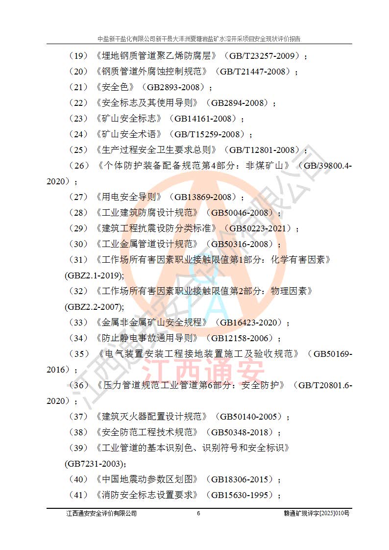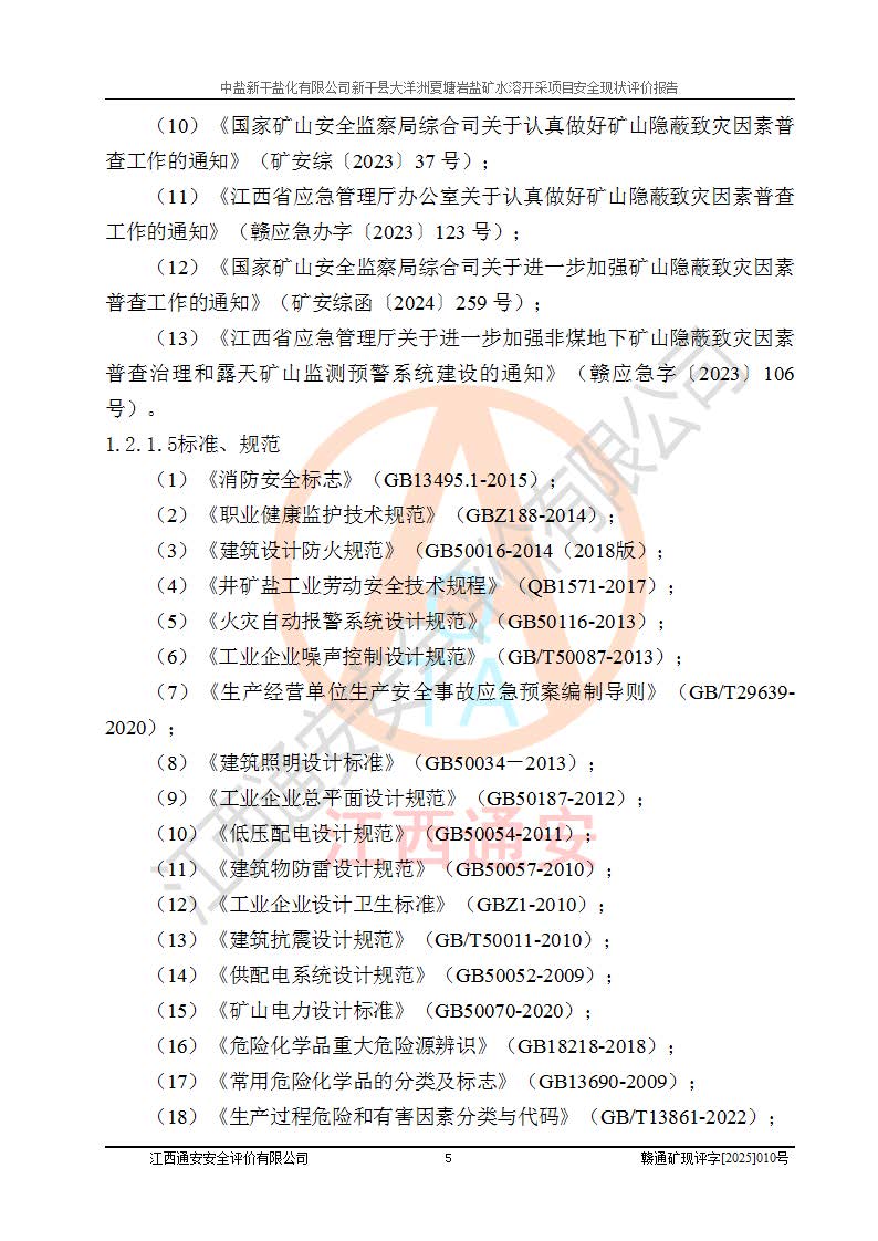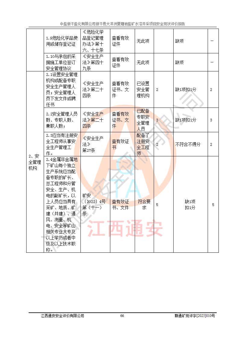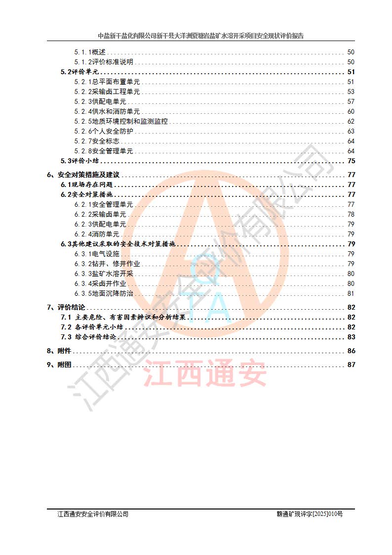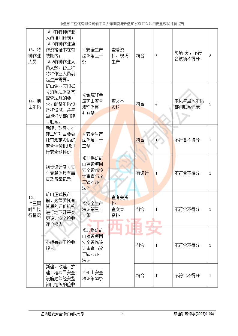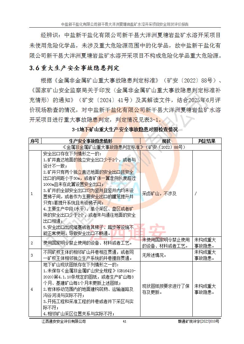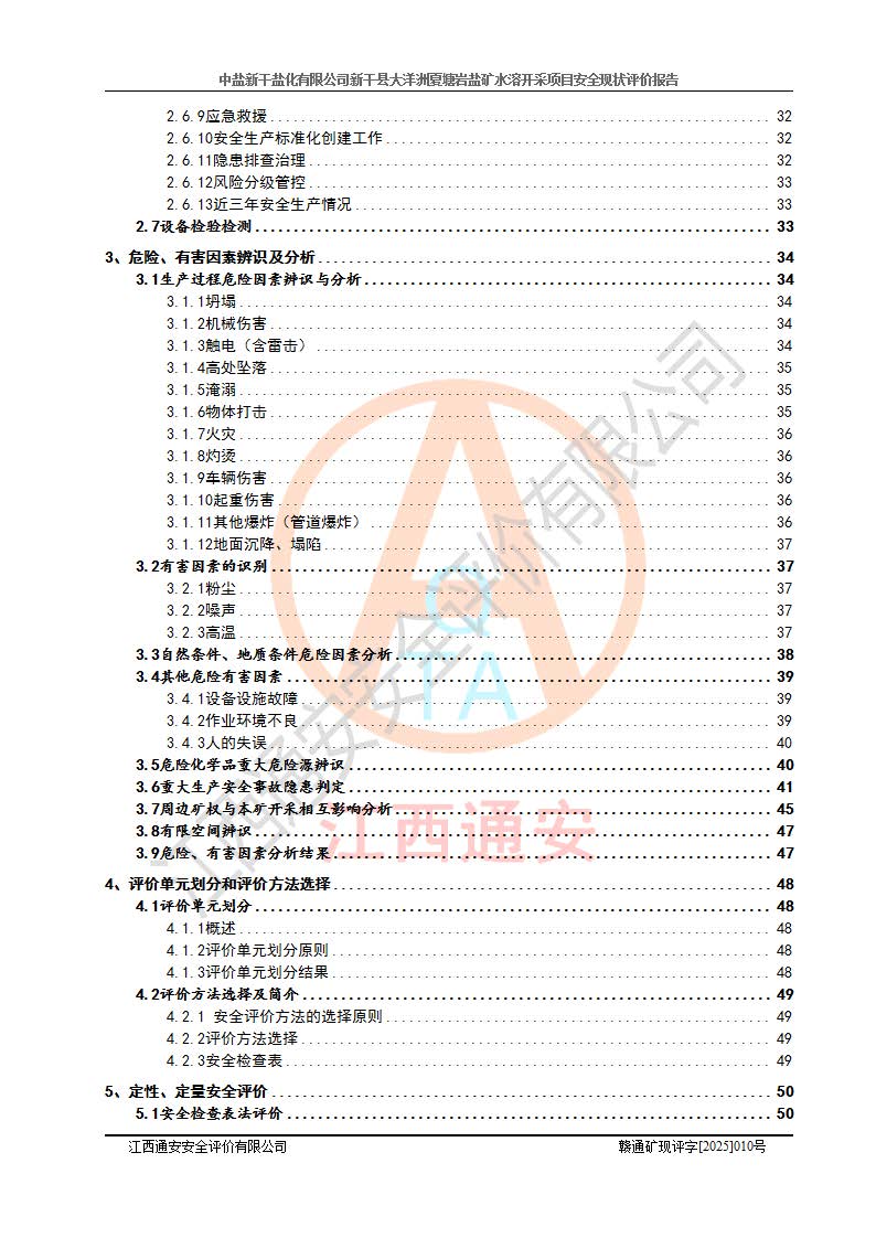 其它 | 通過對該礦存在的危險、有害因素進行了分析與辨識,其主要的危險因素有:地表陷落、坍塌、物體打擊、機械傷害、觸電、火災、高處墜落、淹溺、其他爆炸(管道爆炸)、灼燙、爆裂、起重傷害、**傷害、地表沉降、塌陷、粉塵和噪聲與振動等,其中地表陷落和管道腐蝕為主要危險因素,應重點采取安全對策措施,其他為一般危險因素。洪澇、雷擊、坍塌、地震等4類自然災害、地質危害因素。主要有害因素為噪聲和腐蝕。經(jīng)風險評價得出礦山采鹵作業(yè)為低風險水平。針對以上存在的危險、有害因素,本評價報告對該公司提出了應完善的安全對策和建議,企業(yè)已整改落實到位。 評價結論: 中鹽新干鹽化有限公司新干縣大洋洲夏塘巖鹽礦能滿足基本安全生產(chǎn)活動,風險在可接受范圍內(nèi),具備安全生產(chǎn)條件。 | ||||