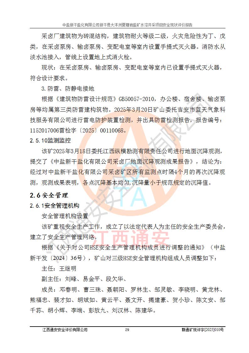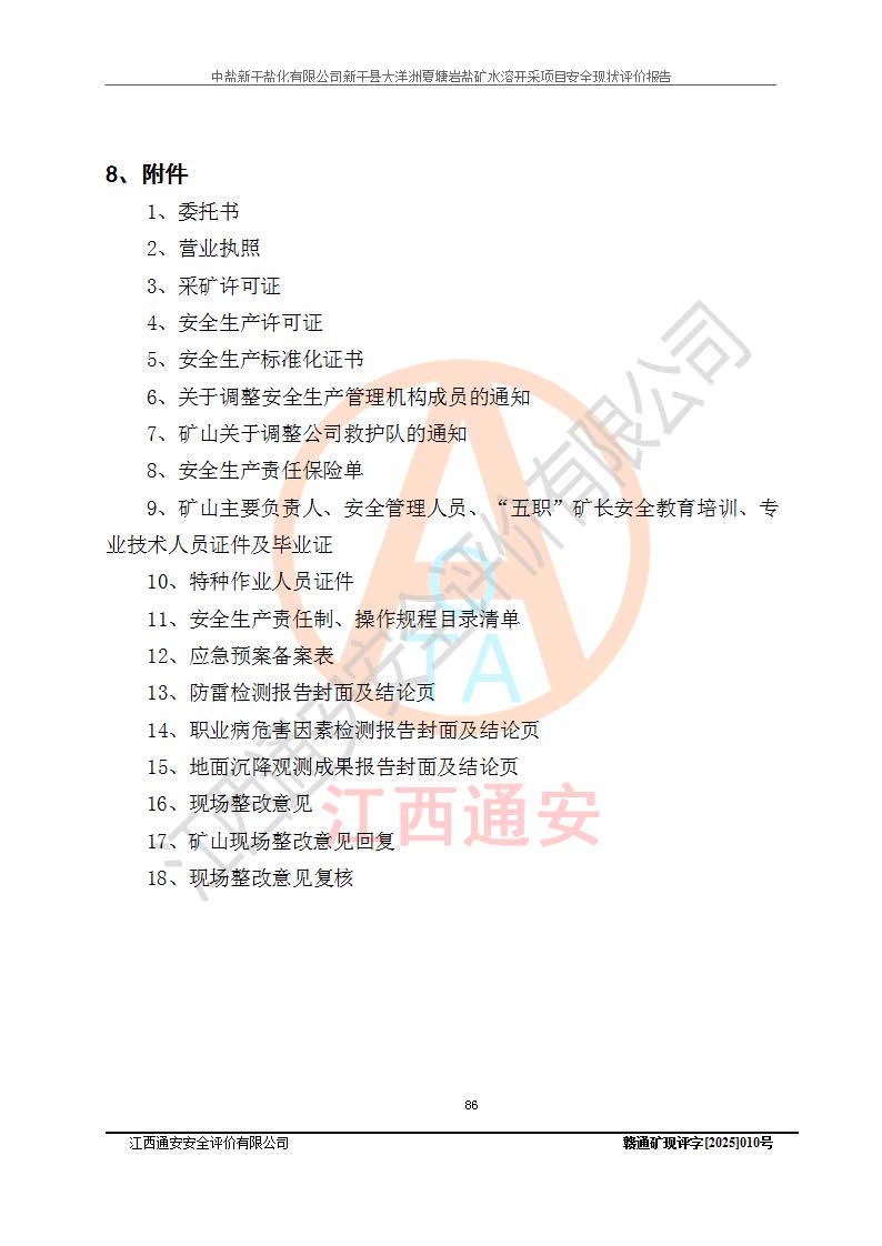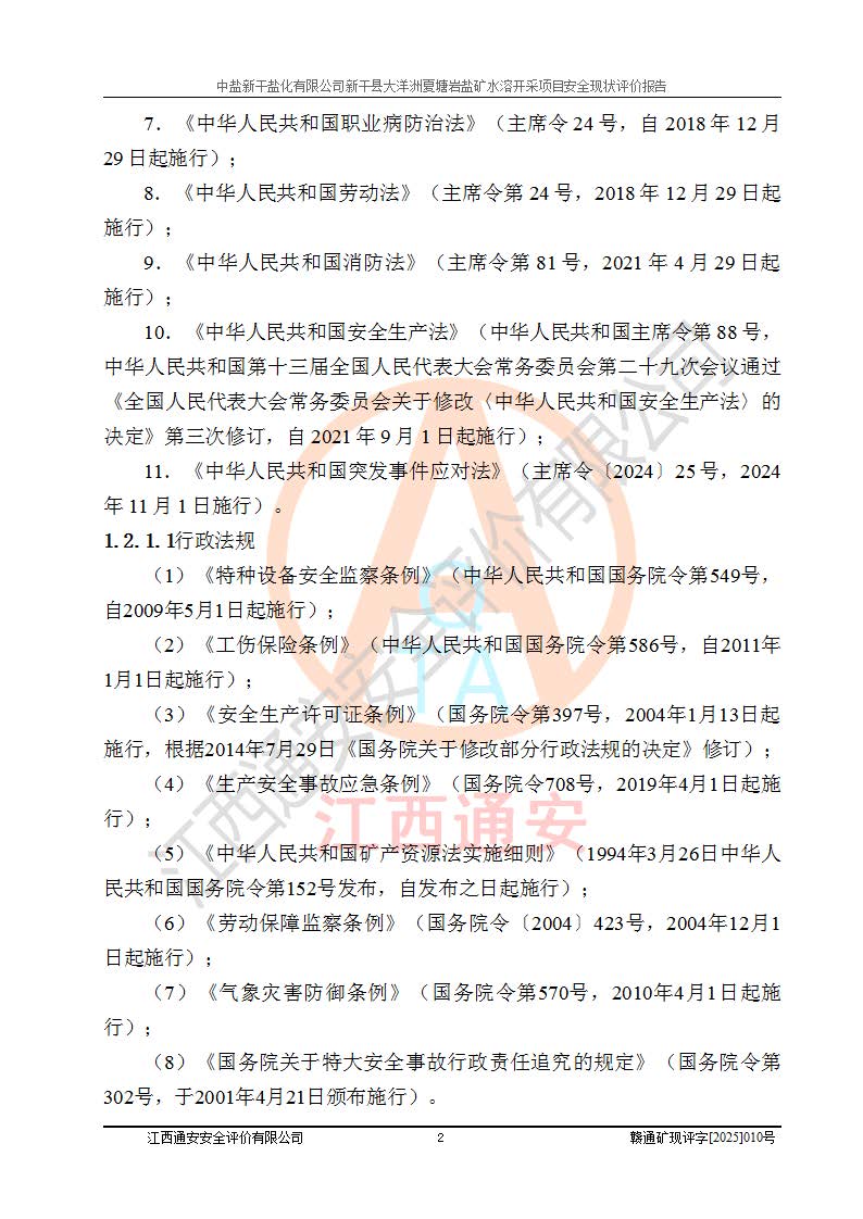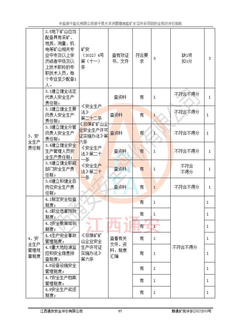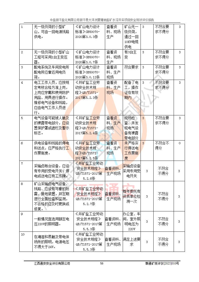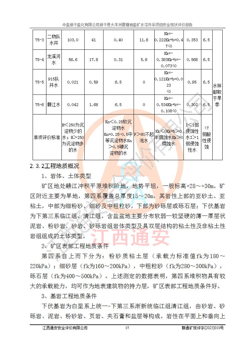 其它 | 通過對該礦存在的危險、有害因素進行了分析與辨識,其主要的危險因素有:地表陷落、坍塌、物體打擊、機械傷害、觸電、火災、高處墜落、淹溺、其他爆炸(管道爆炸)、灼燙、爆裂、起重傷害、**傷害、地表沉降、塌陷、粉塵和噪聲與振動等,其中地表陷落和管道腐蝕為主要危險因素,應重點采取安全對策措施,其他為一般危險因素。洪澇、雷擊、坍塌、地震等4類自然災害、地質危害因素。主要有害因素為噪聲和腐蝕。經(jīng)風險評價得出礦山采鹵作業(yè)為低風險水平。針對以上存在的危險、有害因素,本評價報告對該公司提出了應完善的安全對策和建議,企業(yè)已整改落實到位。 評價結論: 中鹽新干鹽化有限公司新干縣大洋洲夏塘巖鹽礦能滿足基本安全生產(chǎn)活動,風險在可接受范圍內(nèi),具備安全生產(chǎn)條件。 | ||||