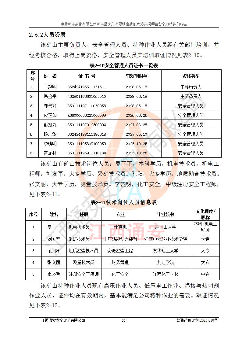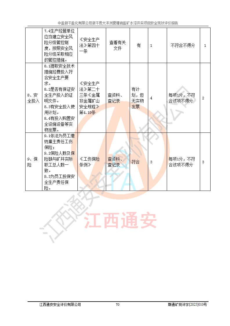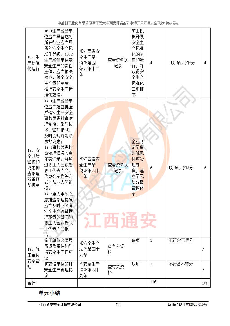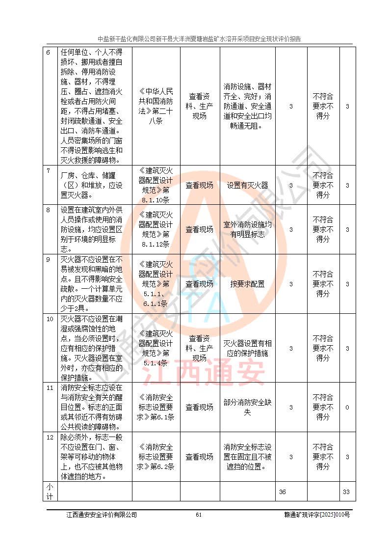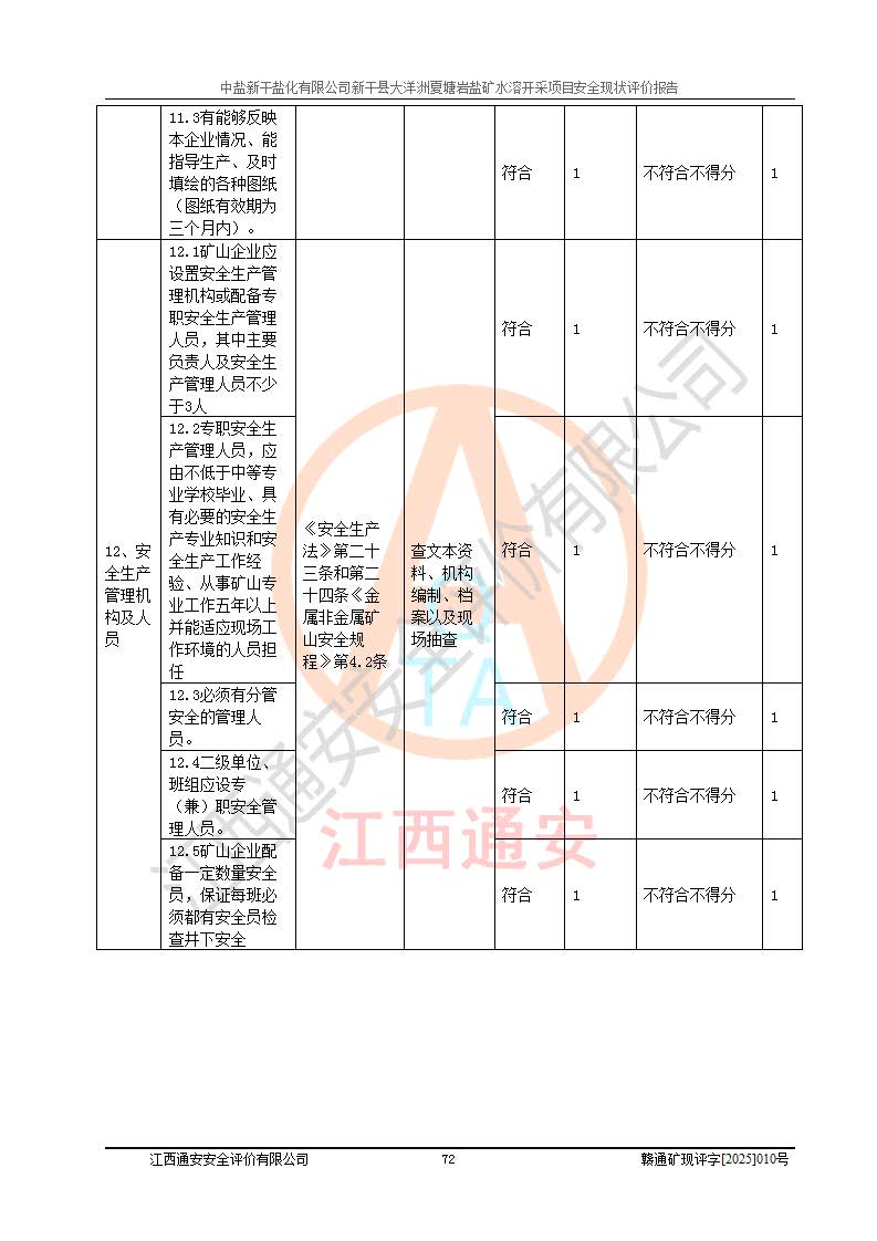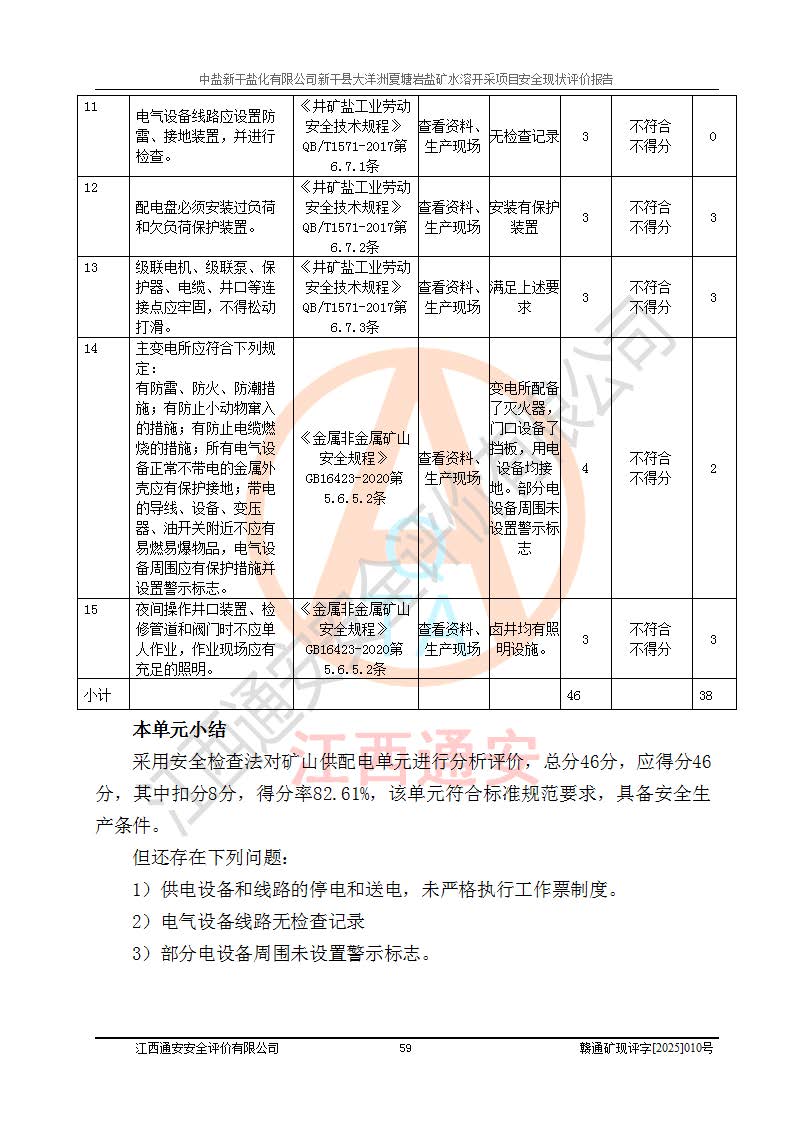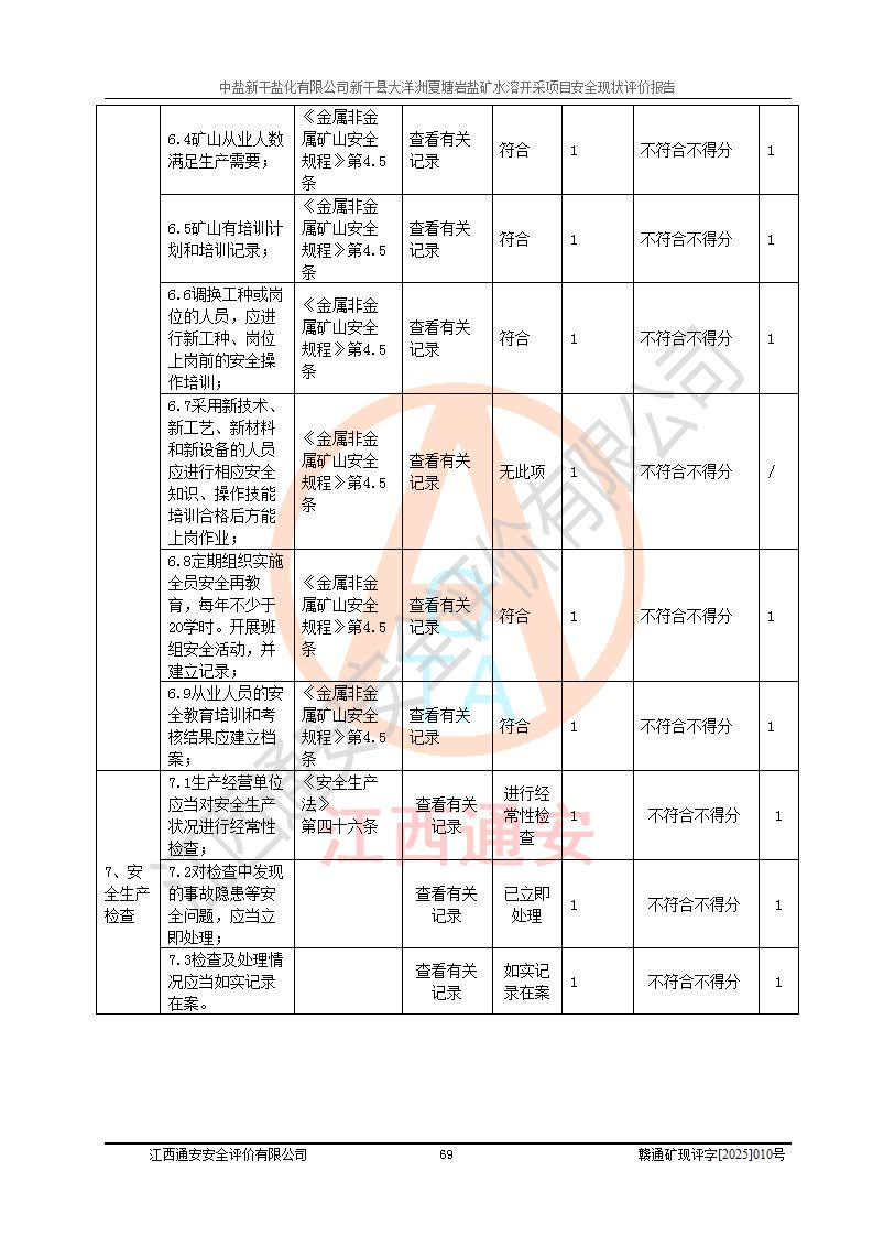 其它 | 通過對該礦存在的危險、有害因素進行了分析與辨識,其主要的危險因素有:地表陷落、坍塌、物體打擊、機械傷害、觸電、火災、高處墜落、淹溺、其他爆炸(管道爆炸)、灼燙、爆裂、起重傷害、**傷害、地表沉降、塌陷、粉塵和噪聲與振動等,其中地表陷落和管道腐蝕為主要危險因素,應重點采取安全對策措施,其他為一般危險因素。洪澇、雷擊、坍塌、地震等4類自然災害、地質危害因素。主要有害因素為噪聲和腐蝕。經(jīng)風險評價得出礦山采鹵作業(yè)為低風險水平。針對以上存在的危險、有害因素,本評價報告對該公司提出了應完善的安全對策和建議,企業(yè)已整改落實到位。 評價結論: 中鹽新干鹽化有限公司新干縣大洋洲夏塘巖鹽礦能滿足基本安全生產(chǎn)活動,風險在可接受范圍內(nèi),具備安全生產(chǎn)條件。 | ||||