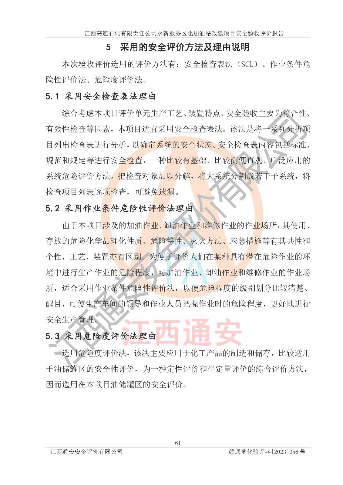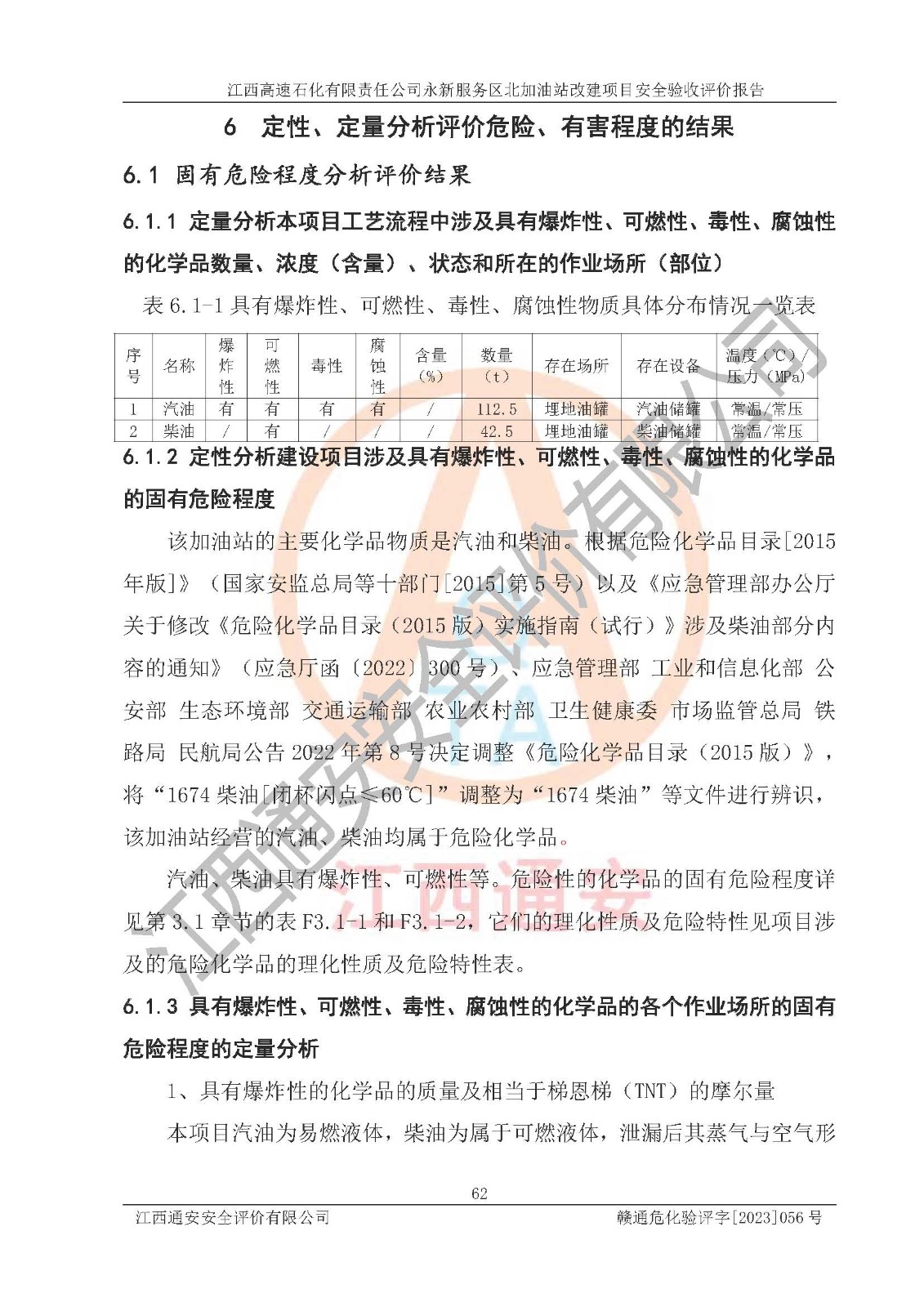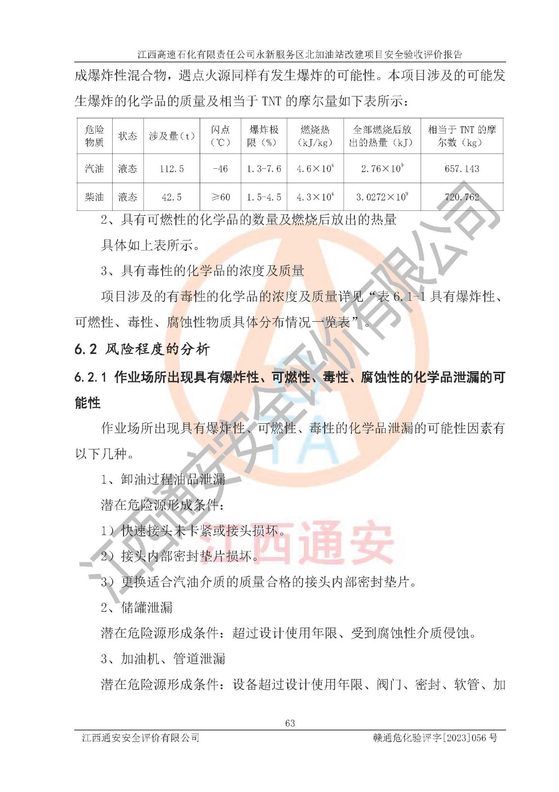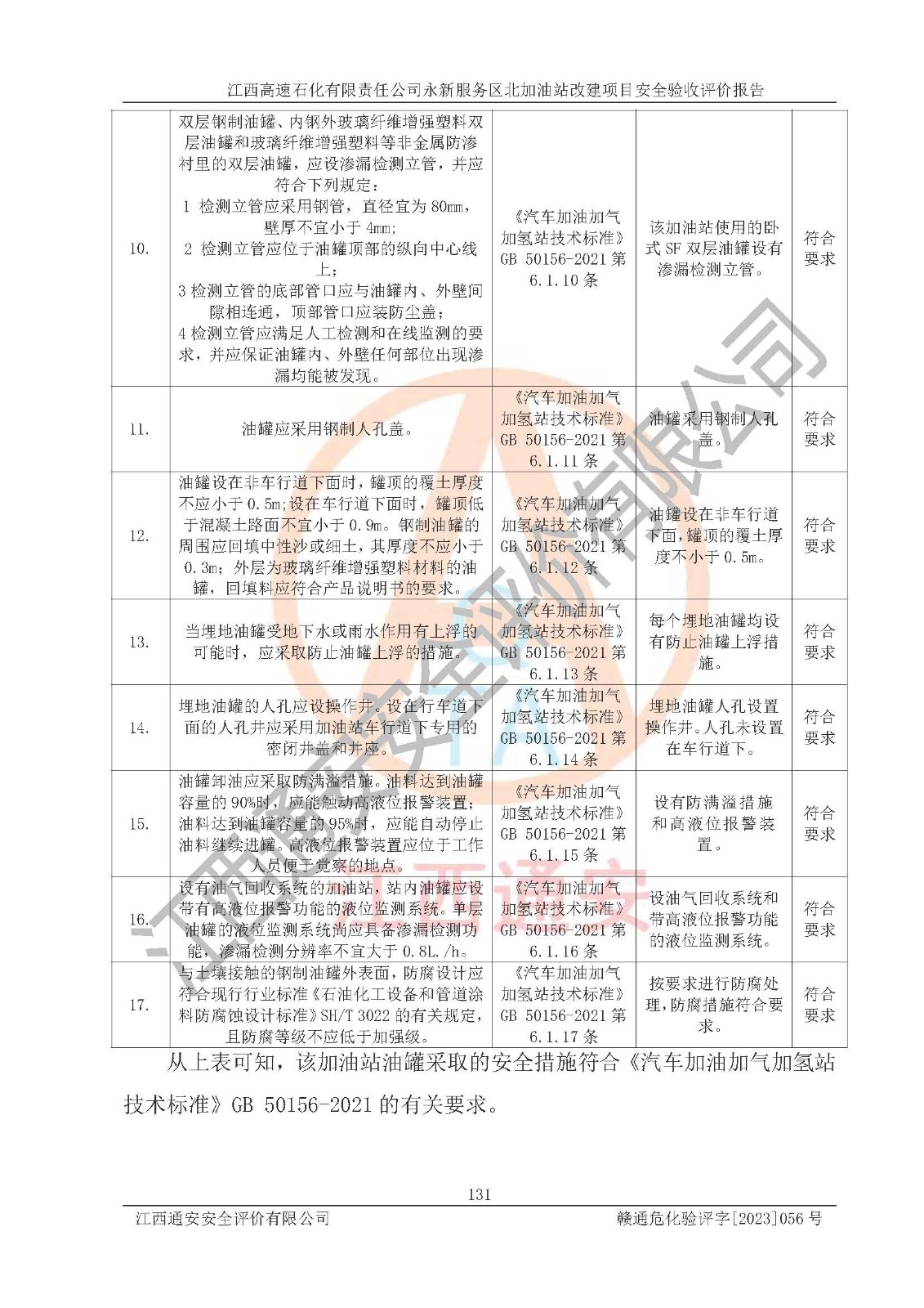 其它 | 在對該項目危險、有害因素辨識分析的基礎上,運用安全檢查表、預作業(yè)條件危險性分析法、危險度評價、重大事故后果分析結果等評價方法對該項目進行了分析評價,評價結果如下: 1、該項目位于江西省吉安市永新縣吉蓮高速永新服務區(qū)北,符合當地規(guī)劃,與周邊環(huán)境的距離符合有關標準、規(guī)范的要求。 2、總圖布置分區(qū)明確,布局合理,各建構筑物的防火間距滿足規(guī)范要求。 3、該項目無**明令淘汰的工藝,設備、設施與工藝條件、內部介質相適應,特種設備及設施較齊全,按規(guī)定設置防雷、防靜電接地,爆炸危險環(huán)境加油機按要求采用防爆型,符合相關標準規(guī)范要求。 5、企業(yè)設置了安全生產管理機構,配備了專職安全生產管理人員,建立了安全生產責任制和安全生產管理制度,編制了崗位操作規(guī)程,編制了生產安全事故應急預案,人員經過相應的培訓,企業(yè)的安全生產管理正常。 6、作業(yè)條件危險性評價結果:在選定的評價單元中,作業(yè)危險程度均為“一般危險,需要注意”,作業(yè)條件相對安全。 7、危險度評價結果:汽油儲罐的危險程度為**危險。其設置了儲油罐安裝高液位報警功能的液位監(jiān)測系統(tǒng),當油料達到油罐容量90%時,觸動高液位報警裝置,油料達到油罐容量95%時,自動停止油料繼續(xù)進罐。同時,也采取了防止油品滲漏的保護措施,如采用雙層油罐,埋地加油管道采用雙層管道,滲漏檢測在線檢測系統(tǒng)等,可以滿足安全生產條件要求。 評價結論: 江西高速石化有限責任公司永新服務區(qū)北加油站工藝設備和安全設施運行正常,安全管理機制運行正常,安全設施、措施達到設計要求和預期結果,可以滿足建設項目安全生產的要求,安全生產管理**,項目具備危險化學品經營單位安全經營條件的要求。 | ||||