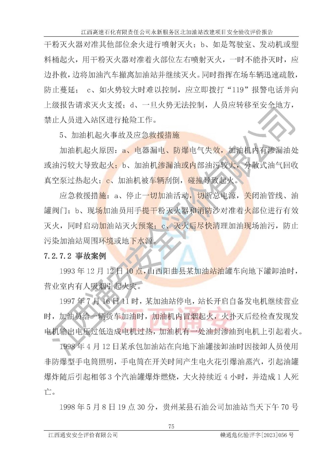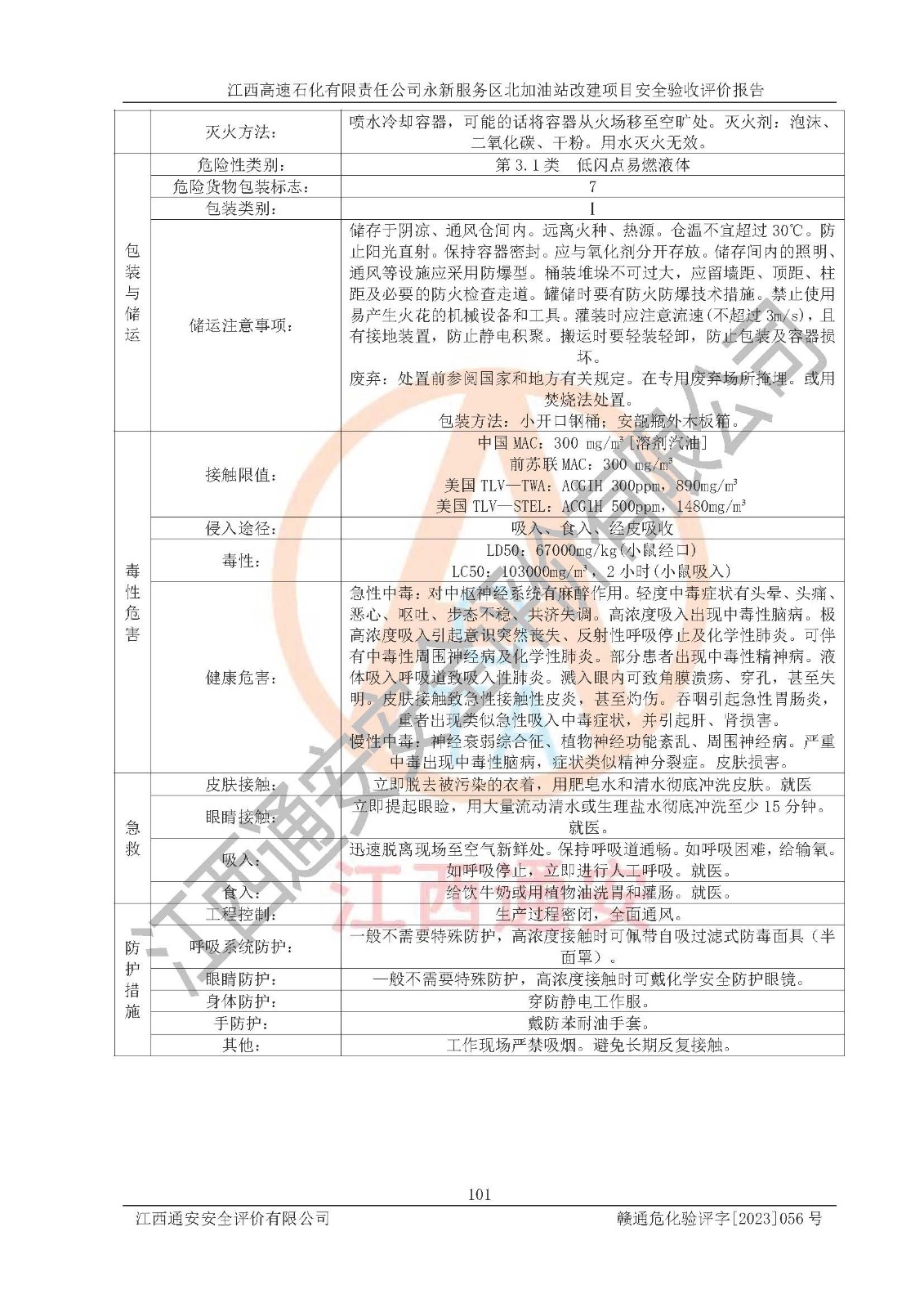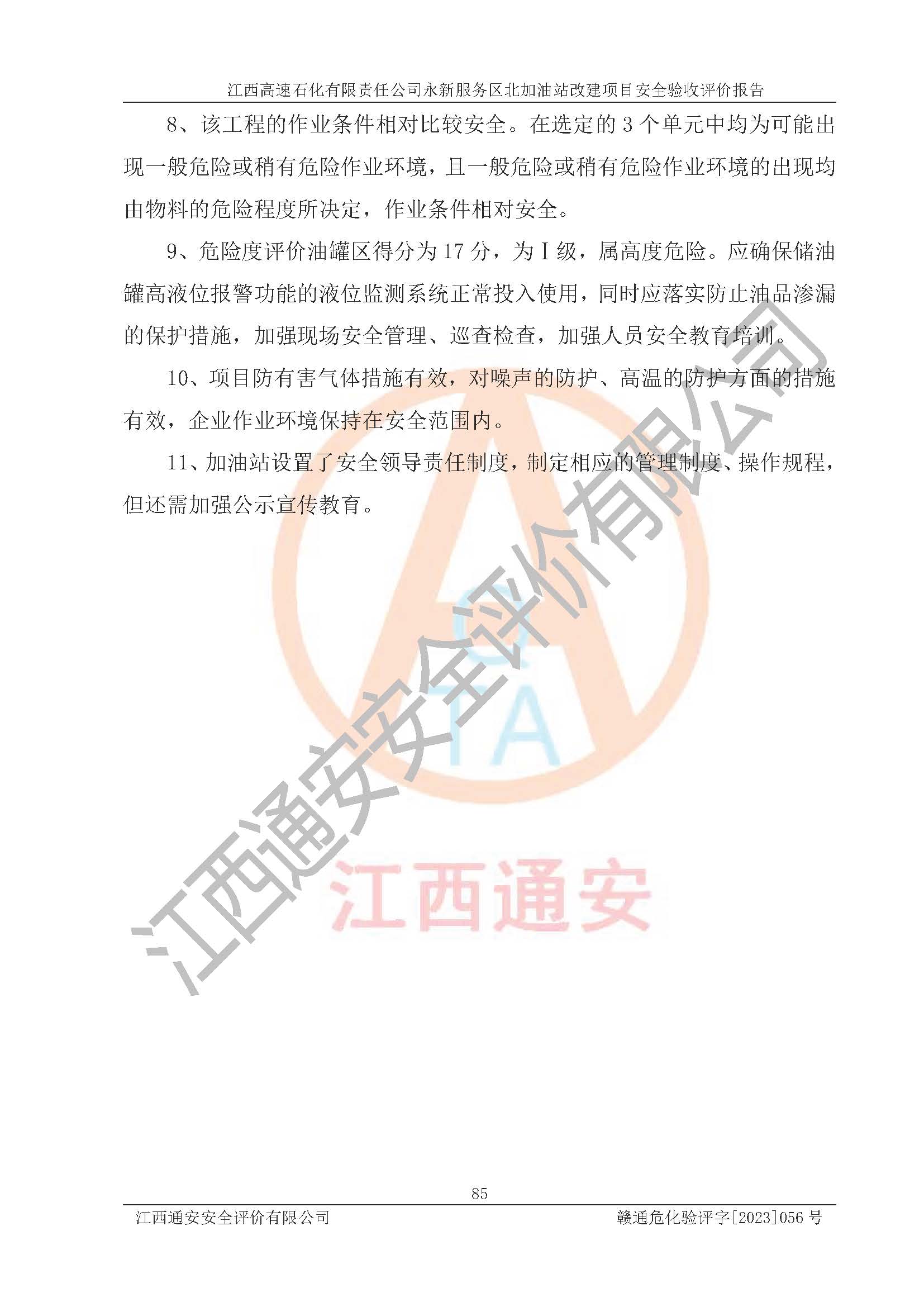 其它 | 在對該項目危險、有害因素辨識分析的基礎上,運用安全檢查表、預作業(yè)條件危險性分析法、危險度評價、重大事故后果分析結果等評價方法對該項目進行了分析評價,評價結果如下: 1、該項目位于江西省吉安市永新縣吉蓮高速永新服務區(qū)北,符合當地規(guī)劃,與周邊環(huán)境的距離符合有關標準、規(guī)范的要求。 2、總圖布置分區(qū)明確,布局合理,各建構筑物的防火間距滿足規(guī)范要求。 3、該項目無**明令淘汰的工藝,設備、設施與工藝條件、內部介質相適應,特種設備及設施較齊全,按規(guī)定設置防雷、防靜電接地,爆炸危險環(huán)境加油機按要求采用防爆型,符合相關標準規(guī)范要求。 5、企業(yè)設置了安全生產管理機構,配備了專職安全生產管理人員,建立了安全生產責任制和安全生產管理制度,編制了崗位操作規(guī)程,編制了生產安全事故應急預案,人員經過相應的培訓,企業(yè)的安全生產管理正常。 6、作業(yè)條件危險性評價結果:在選定的評價單元中,作業(yè)危險程度均為“一般危險,需要注意”,作業(yè)條件相對安全。 7、危險度評價結果:汽油儲罐的危險程度為**危險。其設置了儲油罐安裝高液位報警功能的液位監(jiān)測系統(tǒng),當油料達到油罐容量90%時,觸動高液位報警裝置,油料達到油罐容量95%時,自動停止油料繼續(xù)進罐。同時,也采取了防止油品滲漏的保護措施,如采用雙層油罐,埋地加油管道采用雙層管道,滲漏檢測在線檢測系統(tǒng)等,可以滿足安全生產條件要求。 評價結論: 江西高速石化有限責任公司永新服務區(qū)北加油站工藝設備和安全設施運行正常,安全管理機制運行正常,安全設施、措施達到設計要求和預期結果,可以滿足建設項目安全生產的要求,安全生產管理**,項目具備危險化學品經營單位安全經營條件的要求。 | ||||