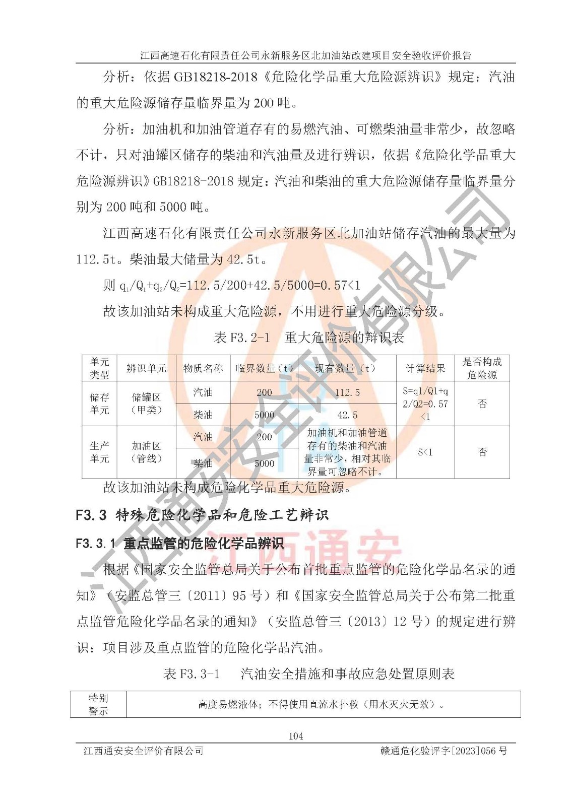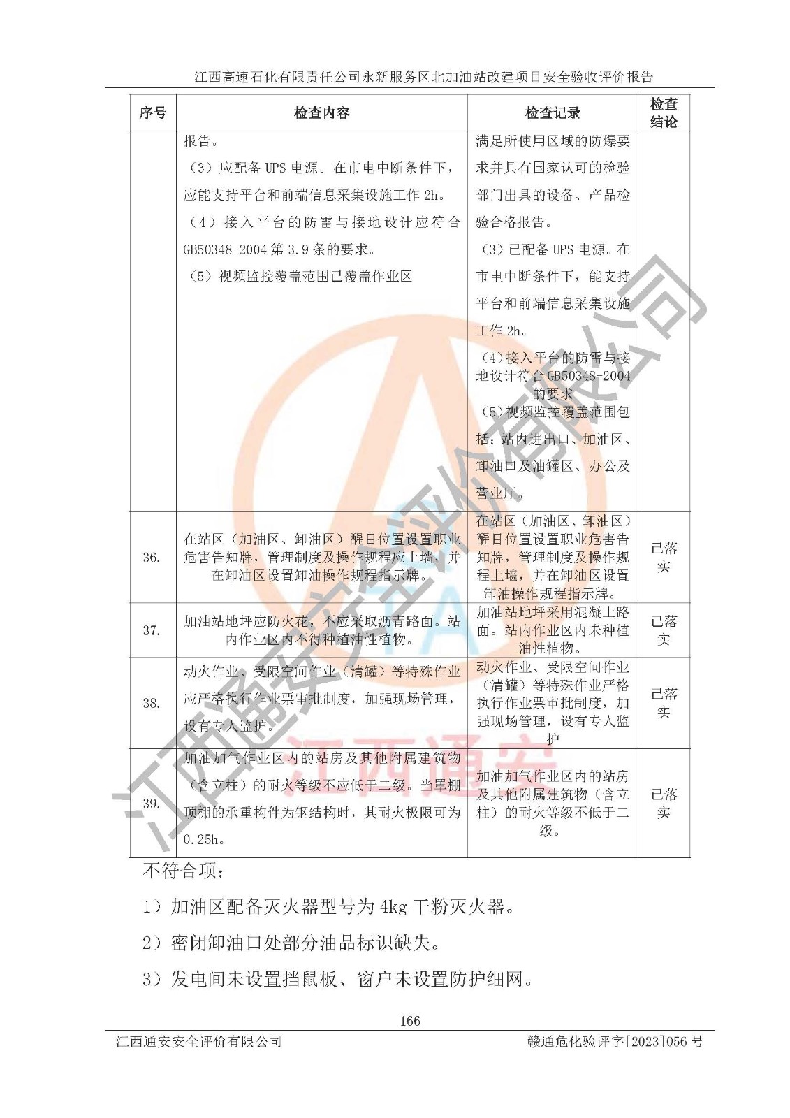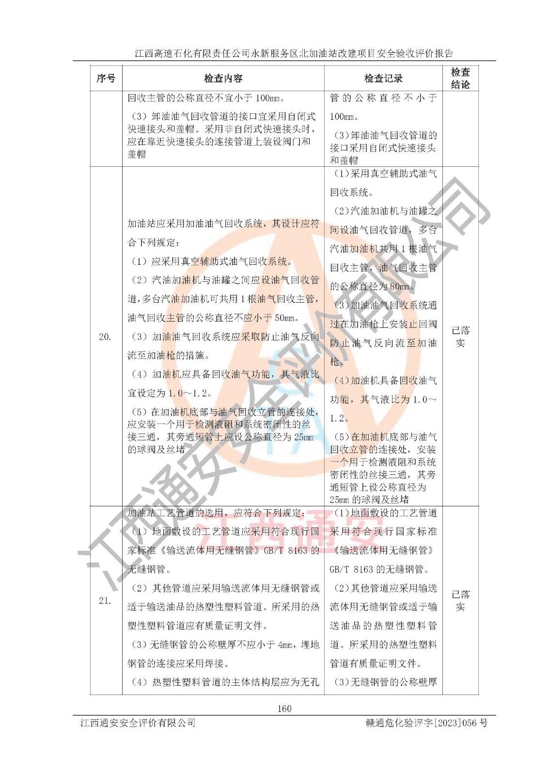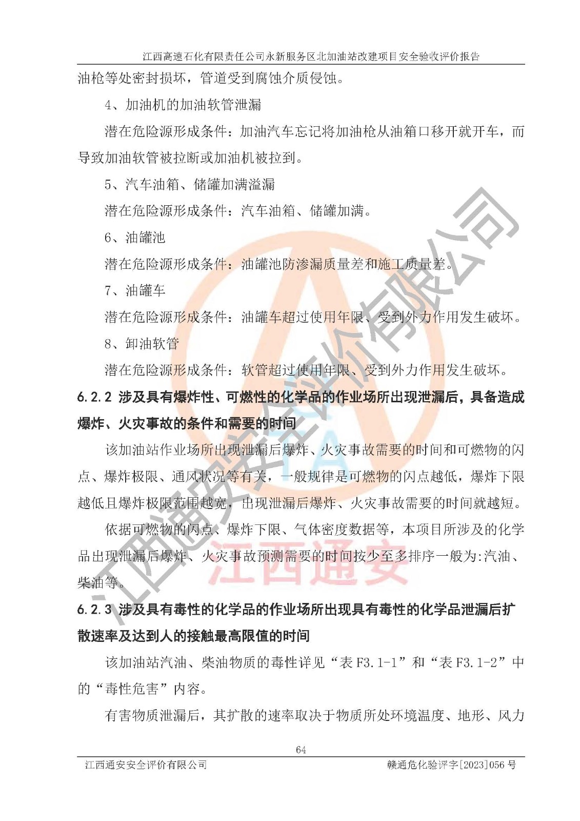 其它 | 在對該項目危險、有害因素辨識分析的基礎上,運用安全檢查表、預作業(yè)條件危險性分析法、危險度評價、重大事故后果分析結果等評價方法對該項目進行了分析評價,評價結果如下: 1、該項目位于江西省吉安市永新縣吉蓮高速永新服務區(qū)北,符合當地規(guī)劃,與周邊環(huán)境的距離符合有關標準、規(guī)范的要求。 2、總圖布置分區(qū)明確,布局合理,各建構筑物的防火間距滿足規(guī)范要求。 3、該項目無**明令淘汰的工藝,設備、設施與工藝條件、內部介質相適應,特種設備及設施較齊全,按規(guī)定設置防雷、防靜電接地,爆炸危險環(huán)境加油機按要求采用防爆型,符合相關標準規(guī)范要求。 5、企業(yè)設置了安全生產管理機構,配備了專職安全生產管理人員,建立了安全生產責任制和安全生產管理制度,編制了崗位操作規(guī)程,編制了生產安全事故應急預案,人員經過相應的培訓,企業(yè)的安全生產管理正常。 6、作業(yè)條件危險性評價結果:在選定的評價單元中,作業(yè)危險程度均為“一般危險,需要注意”,作業(yè)條件相對安全。 7、危險度評價結果:汽油儲罐的危險程度為**危險。其設置了儲油罐安裝高液位報警功能的液位監(jiān)測系統(tǒng),當油料達到油罐容量90%時,觸動高液位報警裝置,油料達到油罐容量95%時,自動停止油料繼續(xù)進罐。同時,也采取了防止油品滲漏的保護措施,如采用雙層油罐,埋地加油管道采用雙層管道,滲漏檢測在線檢測系統(tǒng)等,可以滿足安全生產條件要求。 評價結論: 江西高速石化有限責任公司永新服務區(qū)北加油站工藝設備和安全設施運行正常,安全管理機制運行正常,安全設施、措施達到設計要求和預期結果,可以滿足建設項目安全生產的要求,安全生產管理**,項目具備危險化學品經營單位安全經營條件的要求。 | ||||