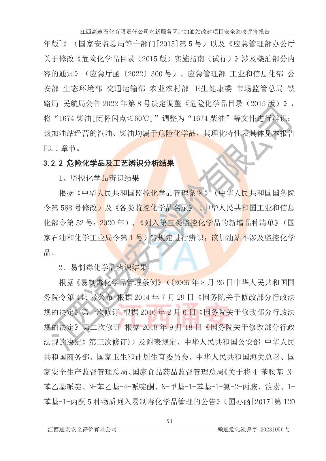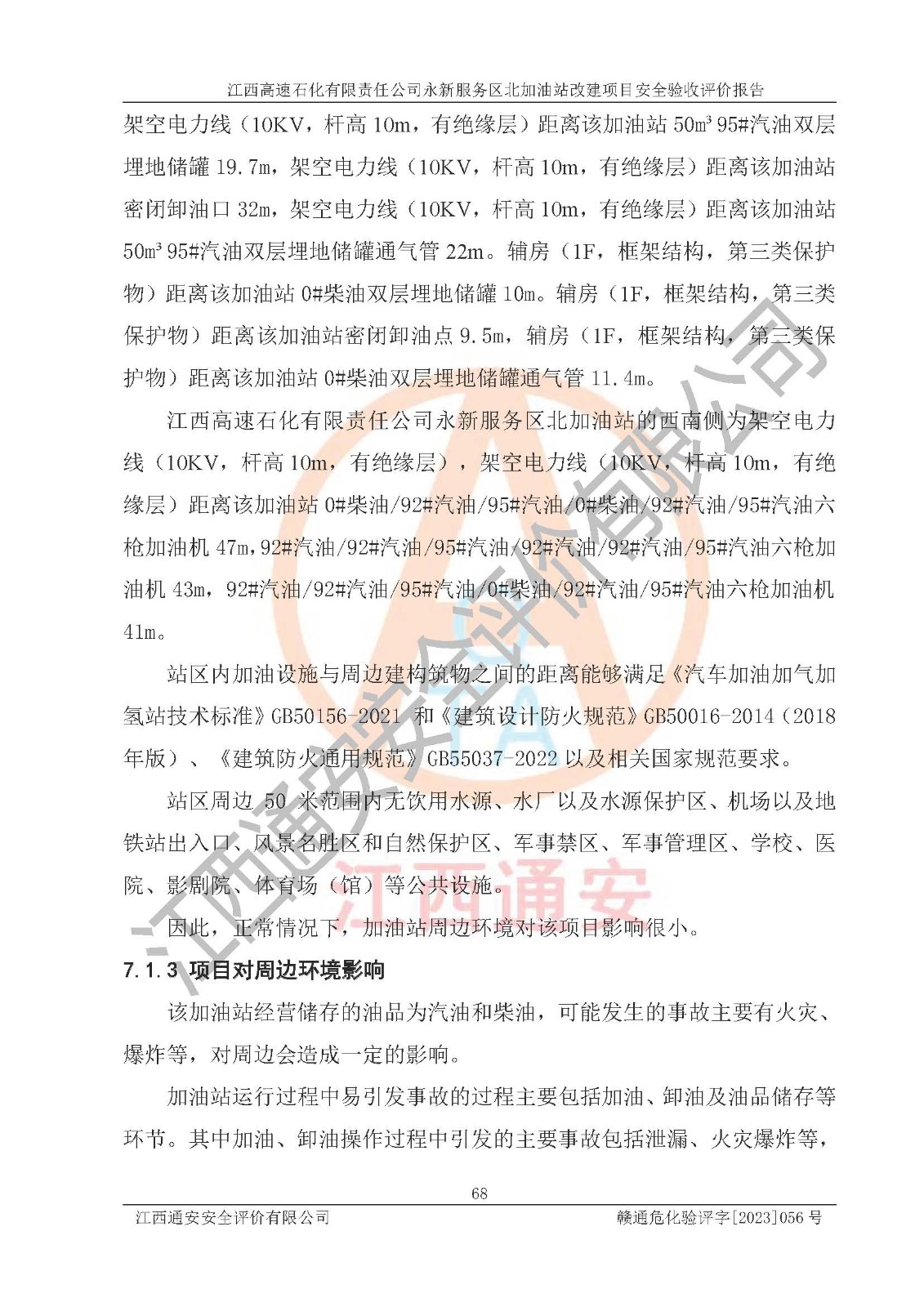 項目簡介 | 江西高速石化有限責任公司永新服務區(qū)北加油站成立于2019年2月2日,類型:其他有限責任公司分公司;負責人:陳志斌;經營場所為江西省吉安市永新縣吉蓮高速永新服務區(qū)北。該公司營業(yè)執(zhí)照經營范圍:石油、石油化工、化纖及其他化工產品的銷售;光伏、充電樁、日用百貨便利店經營:汽車清洗服務:廣告位出租:房屋租賃:食品、計生用品、零售卷煙、雪茄煙:委托代理收取水電費:銷售潤滑油、燃油料。(依法須經批準的項目,經相關部門批準后方可開展經營活動)。 該加油站于2023年12月4日經吉安市商務局核準變更換發(fā)成品油零售經營批準證書,證書編號:油零售證書第吉0300號。**期由2023年12月4日至2028年12月3日。于2023年11月16日由吉安市應急管理局變更發(fā)放危險化學品經營許可證,證書編號:贛吉?;涀帧?/span>2022】360800000011。**期由2022年1月31日至2025年1月30日。 為提升優(yōu)化加油站的整體布局,更好滿足運營服務的需求,同時迎合吉蓮高速日益增長的**,江西高速石化有限責任公司永新服務區(qū)北加油站決定在原址基礎上進行改建,并于2023年3月17日獲得永新縣工業(yè)和信息化局蓋章的《江西省工業(yè)企業(yè)技術改造項目備案通知書》,同意該站在原址上改建。 江西高速石化有限責任公司永新服務區(qū)北加油站改建項目位于江西省吉安市永新縣吉蓮高速永新服務區(qū)北,加油站用地面積約2000m2。 該加油站改建前設有4個SF雙層埋地儲罐,分別為:1臺50m392#汽油雙層埋地儲罐,1臺50m3的95#汽油雙層埋地儲罐;2 臺50m3的0#柴油雙層埋地儲罐;柴油折半后總容積為 150 m3,屬二級加油站。設有3個六槍3油品潛油泵加油機,分別為:1臺0#柴油/92#汽油/95#汽油/0#柴油/92#汽油/95#汽油6槍加油機,1臺0#柴油/92#汽油/95#汽油/0#柴油/92#汽油/95#汽油6槍加油機,1臺0#柴油/92#汽油/95#汽油/0#柴油/92#汽油/95#汽油6槍加油機。 改建后情況如下:在原有罐區(qū)位置上將1臺50m30#柴油雙層埋地儲罐改造為1臺50m3的92#汽油雙層埋地儲罐,更換后設置4臺SF雙層埋地儲罐,其中包括:2臺50m3的92#汽油雙層埋地儲罐;1臺50m3的95#汽油雙層埋地儲罐;1臺50m3的0#柴油雙層埋地儲罐;改建后*大總儲量為200m3,柴油折半后總容積為175m3,加油站等級由原來的二級變?yōu)?/span>一級,設有1臺92#汽油/92#汽油/95#汽油/0#柴油/92#汽油/95#汽油6槍3油品加油機,1臺0#柴油/92#汽油/95#汽油/0#柴油/92#汽油/95#汽油6槍3油品加油機,1臺92#汽油/92#汽油/95#汽油/92#汽油/92#汽油/95#汽油6槍雙油品加油機,設有1個尿素加注機(防爆,按柴油加油機確認)。加油站內其他設施利舊。 江西高速石化有限責任公司永新服務區(qū)北加油站2022年12月委托江西贛安安全生產科學技術咨詢服務中心編制《江西高速石化有限責任公司永新服務區(qū)北加油站改建項目安全預評價報告》,并于2023年4月12日取得《危險化學品建設項目安全條件備案告知意見書》(吉市?;椖堪矖l審字[2023]3號)。 江西高速石化有限責任公司永新服務區(qū)北加油站2023年4月委托哈爾濱天源石化工程設計有限責任公司編制《江西高速石化有限責任公司永新服務區(qū)北加油站改建項目安全設施設計》,并于2023年5月19日取得《危險化學品建設項目安全設施設計審查意見書》(吉市?;椖堪苍O審字〔2023〕11號)。