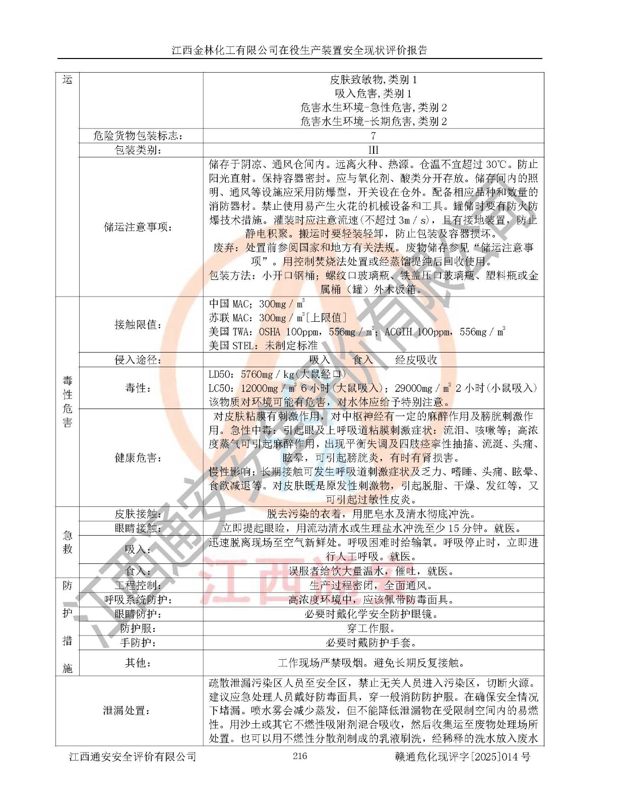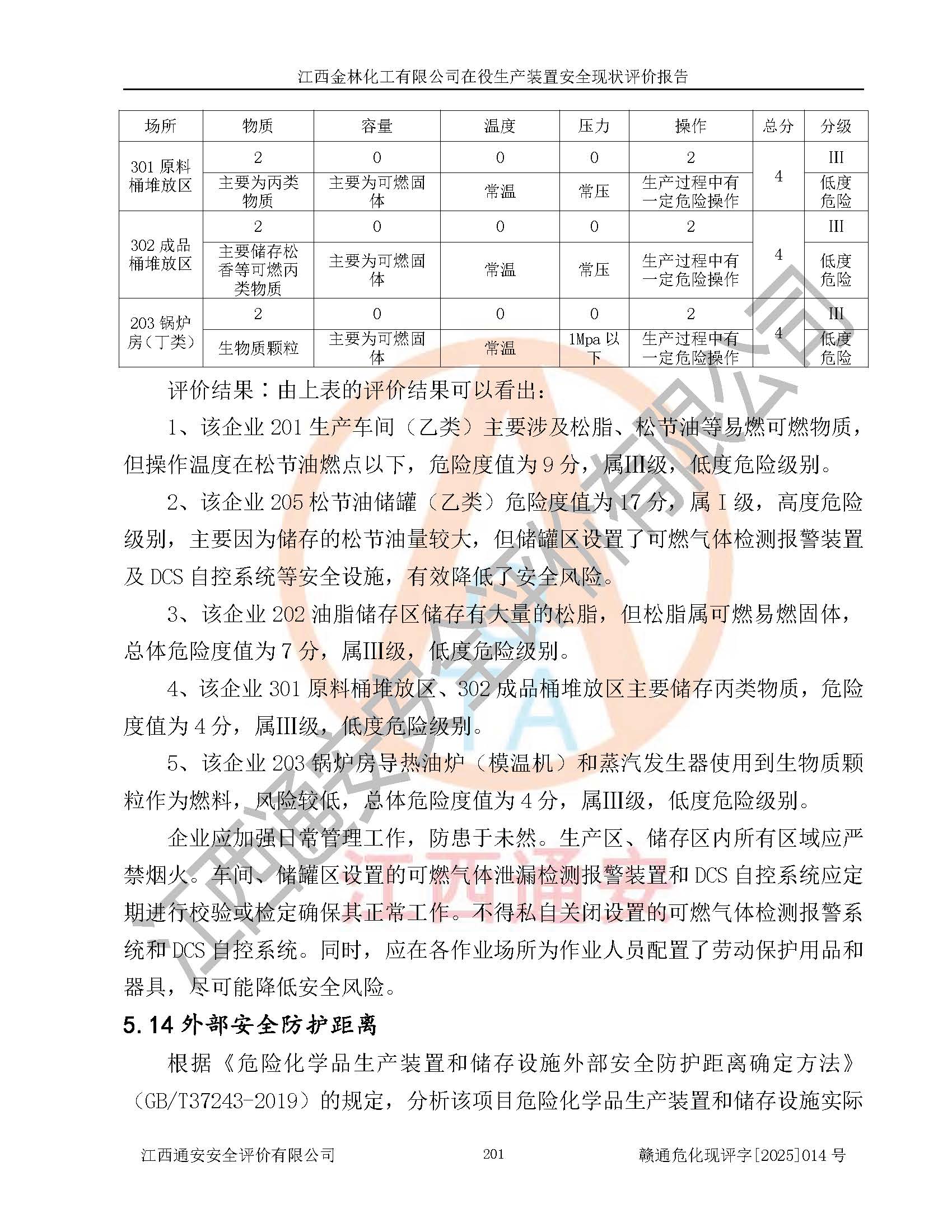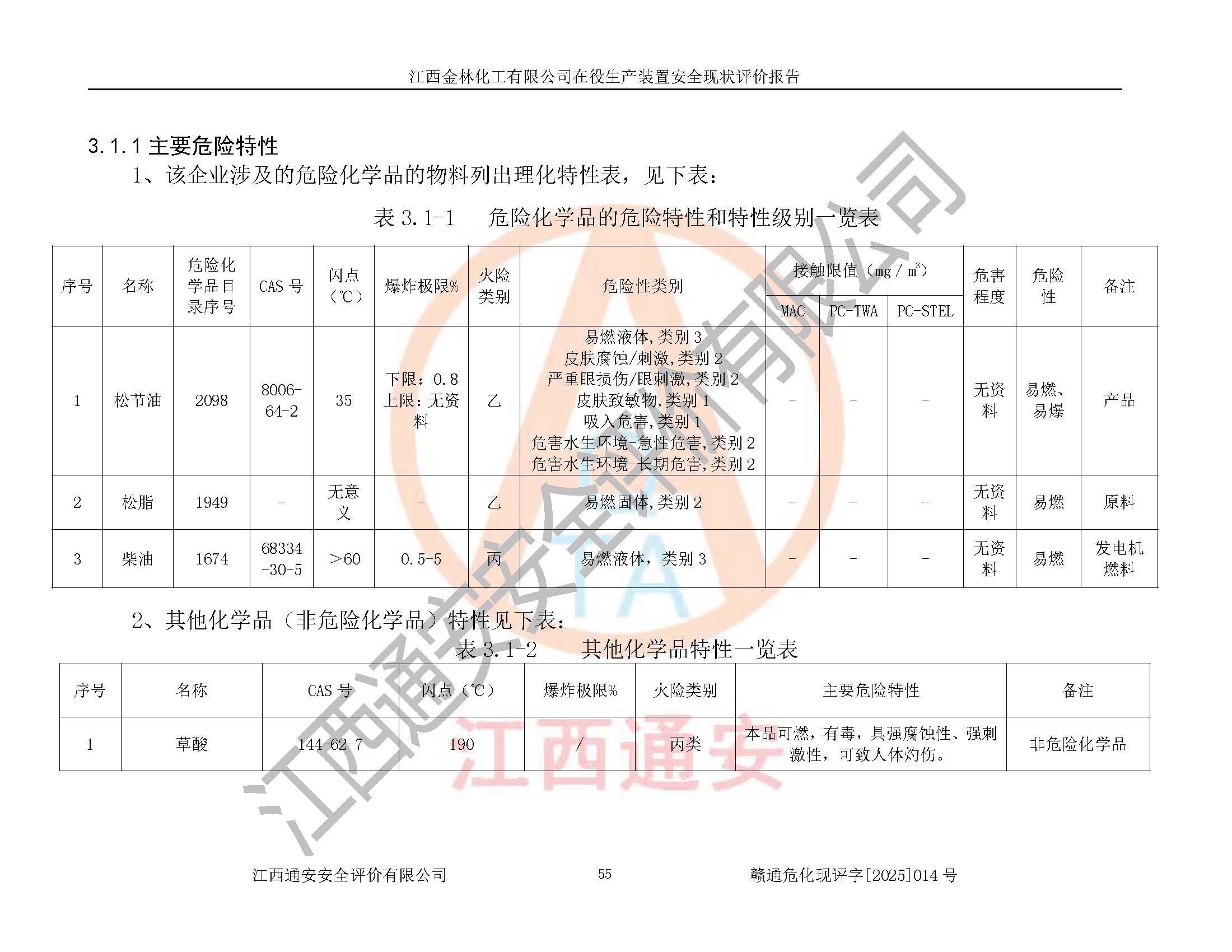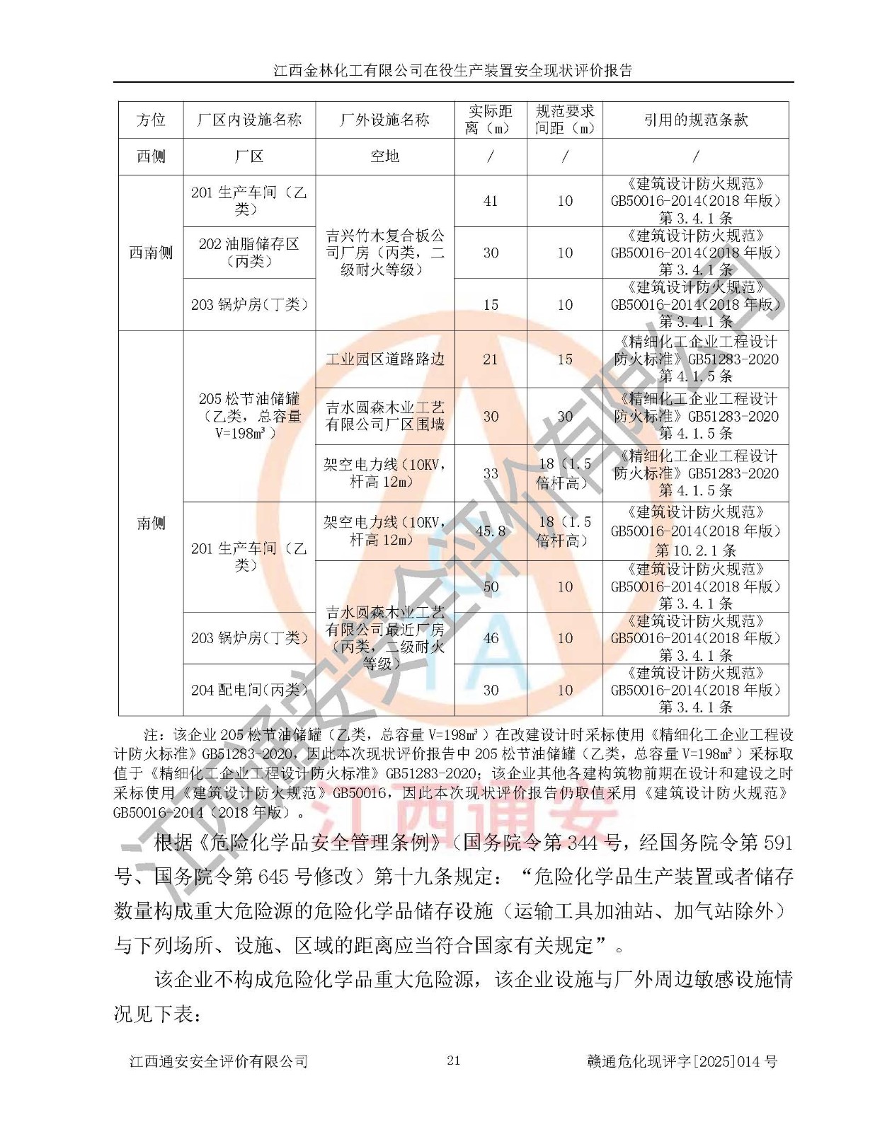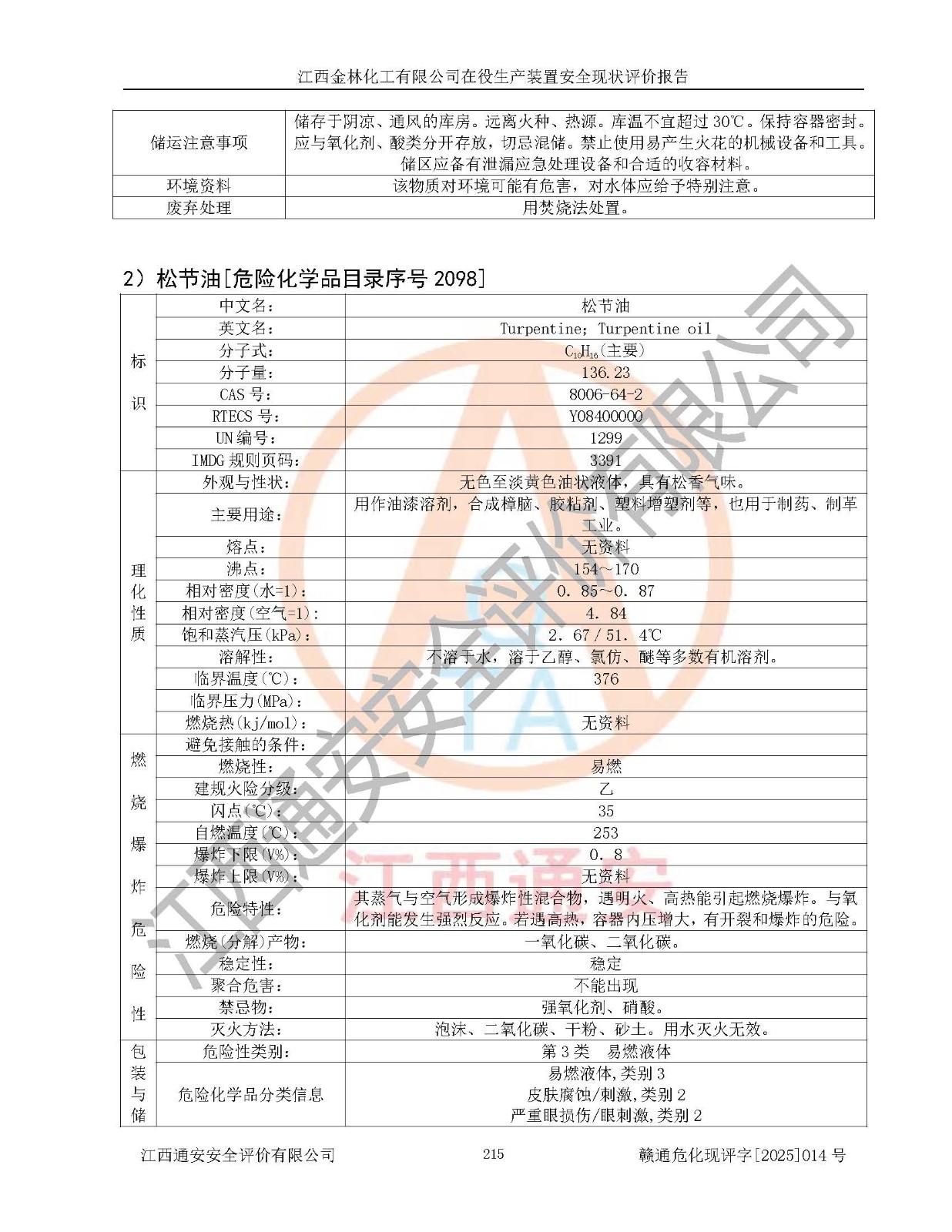 項目簡介 | 江西金林化工有限公司成立于2003年6月26日,并取得吉水縣市場監(jiān)督管理局頒發(fā)的《營業(yè)執(zhí)照》,營業(yè)執(zhí)照統(tǒng)一社會信用代碼:91360822748530538B。公司注冊住所:江西省吉安市吉水縣文峰工業(yè)城。法定**人:湯光耀,注冊資本:貳仟零壹拾玖萬元整。企業(yè)類型:有限責(zé)任公司(自然人投資或控股)。經(jīng)營范圍包括生產(chǎn)、銷售松節(jié)油、松香、林產(chǎn)化工產(chǎn)品、其它化工產(chǎn)品(含苯酚、甲醛)、橡膠產(chǎn)品、(憑化學(xué)危險品經(jīng)營許可證及消防安全檢查意見書經(jīng)營)、機械配件、紙張銷售。 江西金林化工有限公司于2022年8月23日進行了安全生產(chǎn)許可證換證,取得江西省應(yīng)急管理廳頒發(fā)的《安全生產(chǎn)許可證》,許可證編號為:(贛)WH安許證字[2005]0118號,許可范圍:松節(jié)油(2kt/a),**期2022年8月23日至2025年8月22日。 江西金林化工有限公司在役生產(chǎn)裝置為年產(chǎn)10000噸松香、2000噸松節(jié)油項目及其配套公用、輔助設(shè)施,主要產(chǎn)品有松香和松節(jié)油。 根據(jù)《危險化學(xué)品目錄》(2015年版)、應(yīng)急管理部辦公廳關(guān)于修改《危險化學(xué)品目錄(2015年版)實施指南(試行)》涉及柴油部分內(nèi)容的通知(應(yīng)急廳函〔2022〕300號)和《應(yīng)急管理部工業(yè)和信息化部公安部生態(tài)環(huán)境部交通運輸部農(nóng)業(yè)農(nóng)村部衛(wèi)生健康委市場監(jiān)管總局鐵路局民航局公告》2022年第8號《決定調(diào)整《危險化學(xué)品目錄(2015版)》,將“1674柴油〔閉杯閃點≤60℃〕”調(diào)整為“1674柴油”》的文件規(guī)定,對該企業(yè)生產(chǎn)過程中所涉及的化學(xué)品進行辨識:該企業(yè)涉及的危險化學(xué)品有:松脂、松節(jié)油、柴油(發(fā)電機燃料)等。 | |||