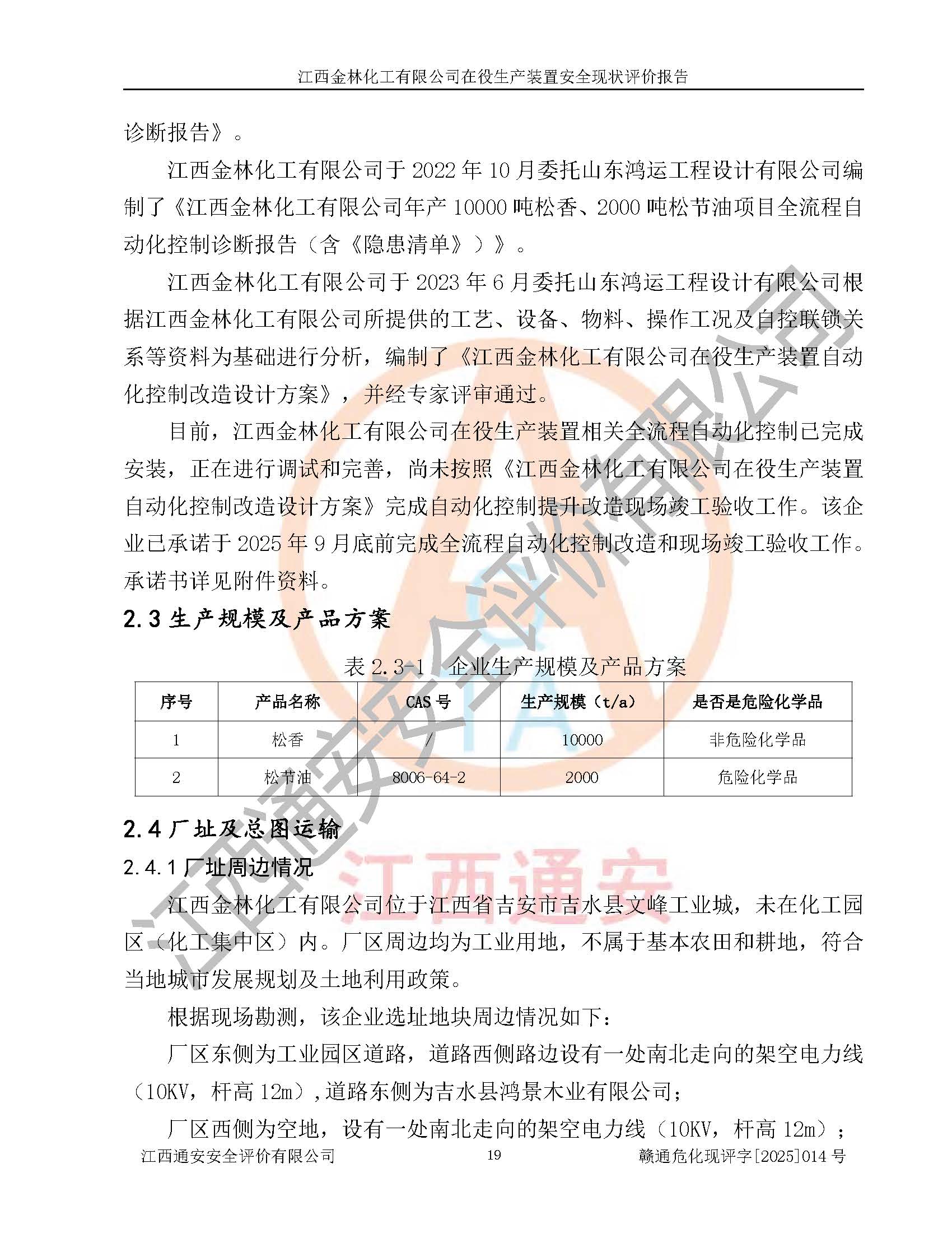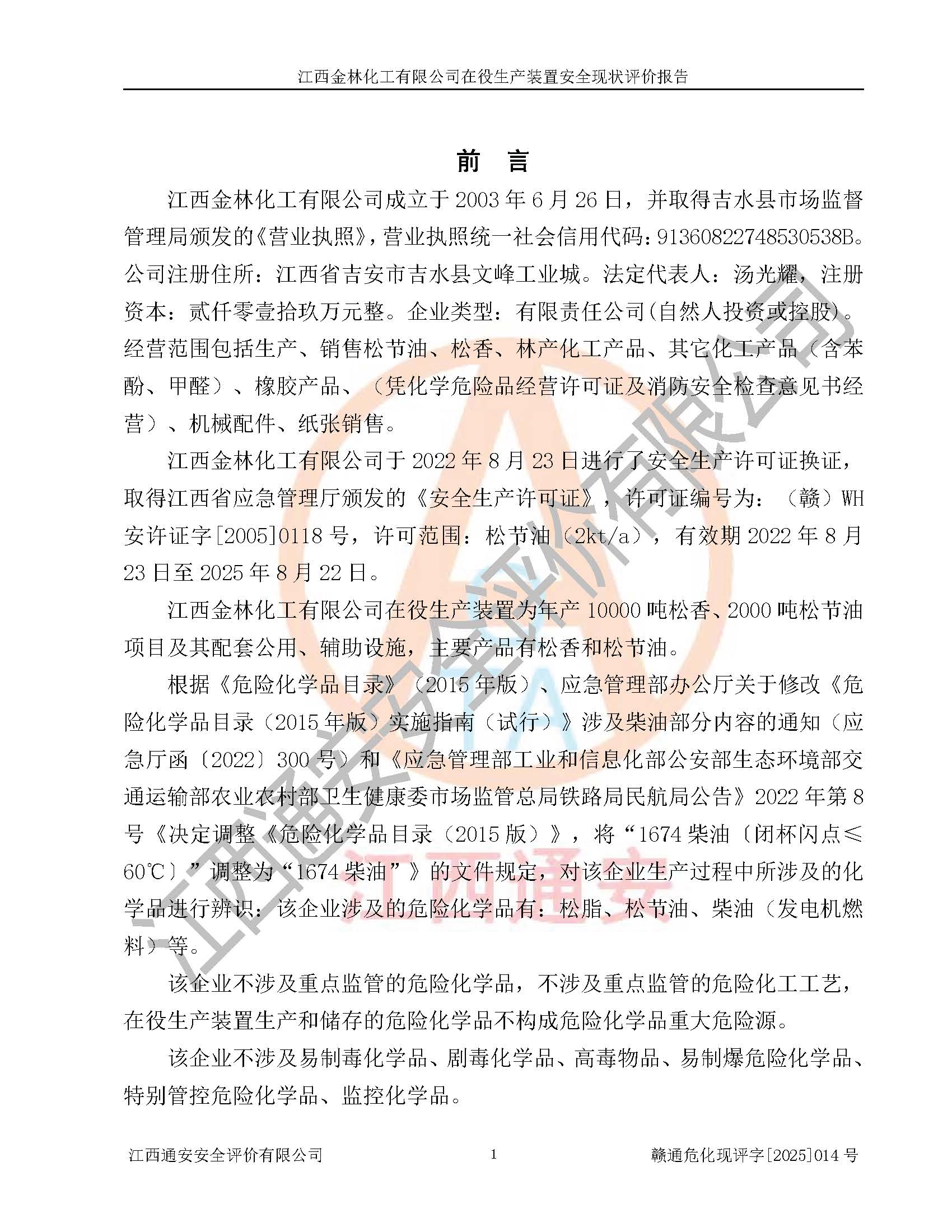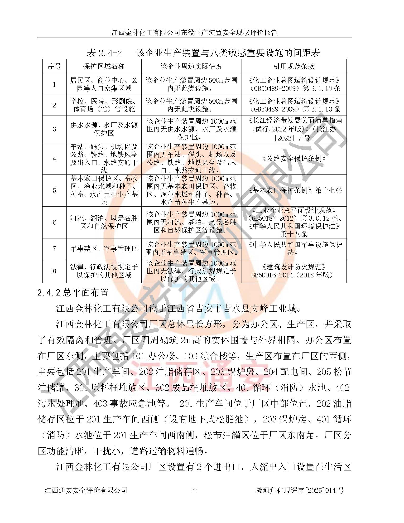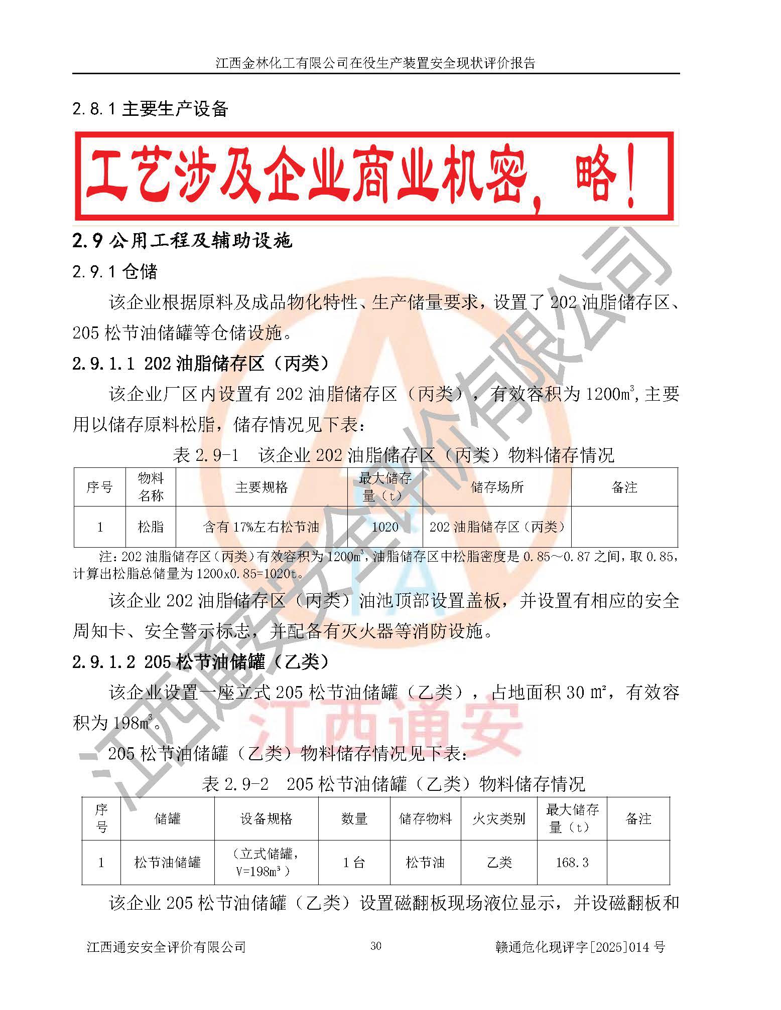 項目簡介 | 江西金林化工有限公司成立于2003年6月26日,并取得吉水縣市場監(jiān)督管理局頒發(fā)的《營業(yè)執(zhí)照》,營業(yè)執(zhí)照統(tǒng)一社會信用代碼:91360822748530538B。公司注冊住所:江西省吉安市吉水縣文峰工業(yè)城。法定**人:湯光耀,注冊資本:貳仟零壹拾玖萬元整。企業(yè)類型:有限責(zé)任公司(自然人投資或控股)。經(jīng)營范圍包括生產(chǎn)、銷售松節(jié)油、松香、林產(chǎn)化工產(chǎn)品、其它化工產(chǎn)品(含苯酚、甲醛)、橡膠產(chǎn)品、(憑化學(xué)危險品經(jīng)營許可證及消防安全檢查意見書經(jīng)營)、機械配件、紙張銷售。 江西金林化工有限公司于2022年8月23日進行了安全生產(chǎn)許可證換證,取得江西省應(yīng)急管理廳頒發(fā)的《安全生產(chǎn)許可證》,許可證編號為:(贛)WH安許證字[2005]0118號,許可范圍:松節(jié)油(2kt/a),**期2022年8月23日至2025年8月22日。 江西金林化工有限公司在役生產(chǎn)裝置為年產(chǎn)10000噸松香、2000噸松節(jié)油項目及其配套公用、輔助設(shè)施,主要產(chǎn)品有松香和松節(jié)油。 根據(jù)《危險化學(xué)品目錄》(2015年版)、應(yīng)急管理部辦公廳關(guān)于修改《危險化學(xué)品目錄(2015年版)實施指南(試行)》涉及柴油部分內(nèi)容的通知(應(yīng)急廳函〔2022〕300號)和《應(yīng)急管理部工業(yè)和信息化部公安部生態(tài)環(huán)境部交通運輸部農(nóng)業(yè)農(nóng)村部衛(wèi)生健康委市場監(jiān)管總局鐵路局民航局公告》2022年第8號《決定調(diào)整《危險化學(xué)品目錄(2015版)》,將“1674柴油〔閉杯閃點≤60℃〕”調(diào)整為“1674柴油”》的文件規(guī)定,對該企業(yè)生產(chǎn)過程中所涉及的化學(xué)品進行辨識:該企業(yè)涉及的危險化學(xué)品有:松脂、松節(jié)油、柴油(發(fā)電機燃料)等。 | |||