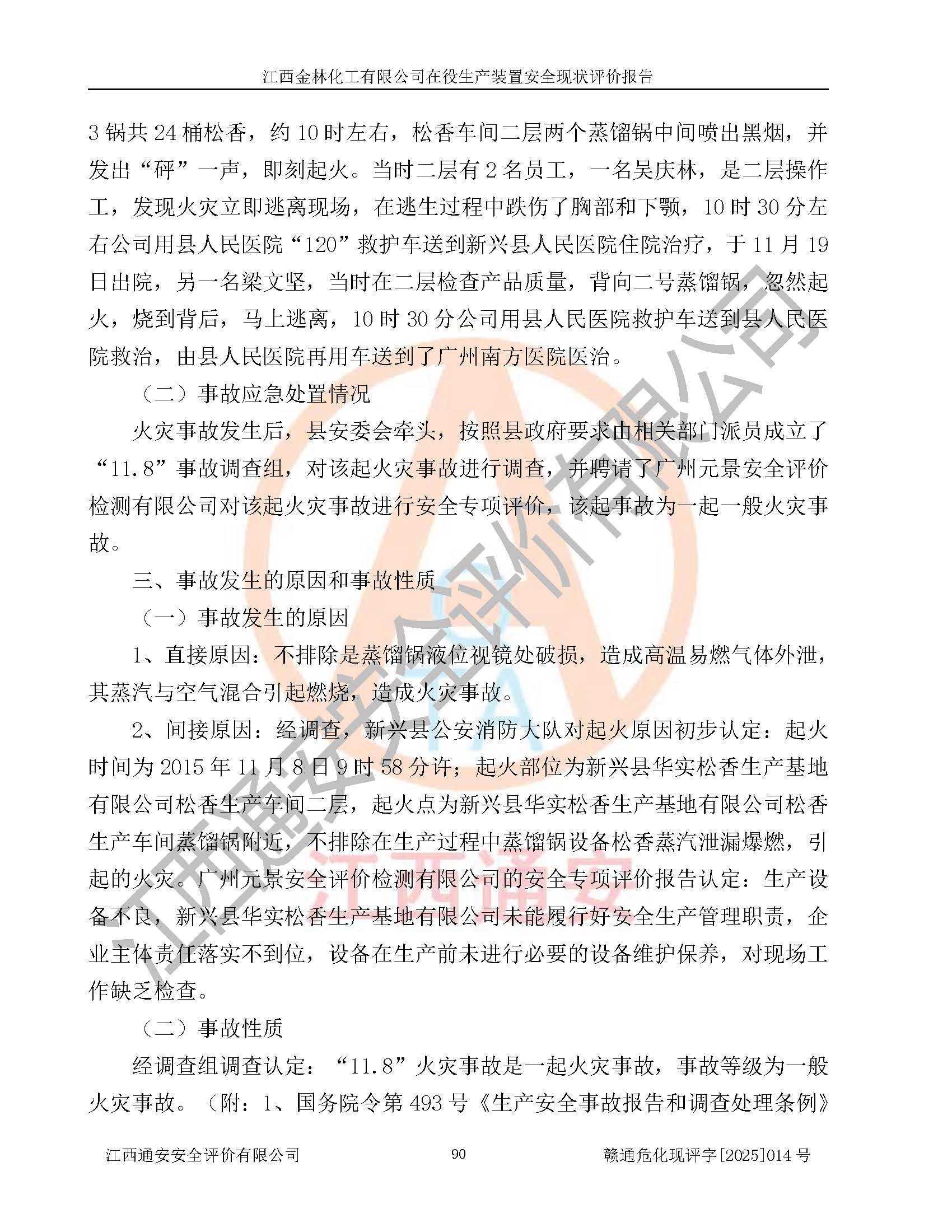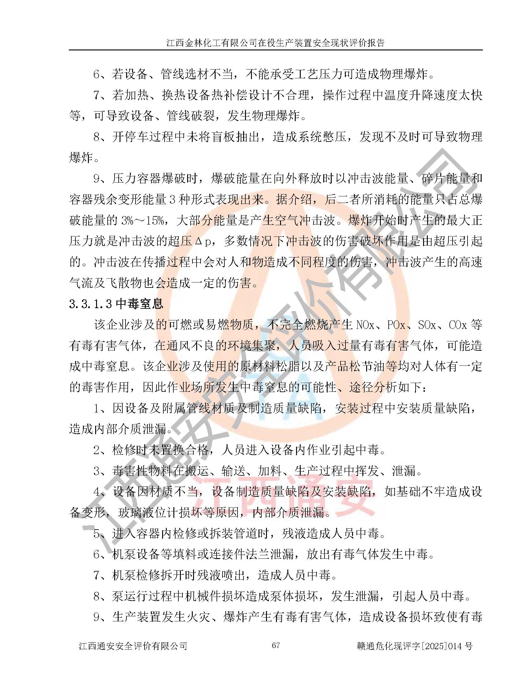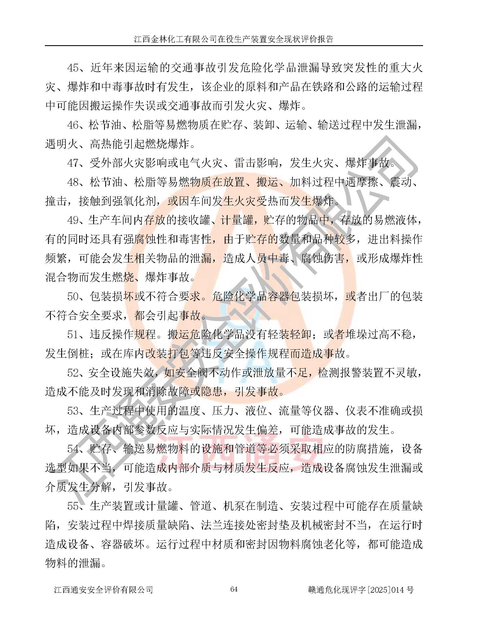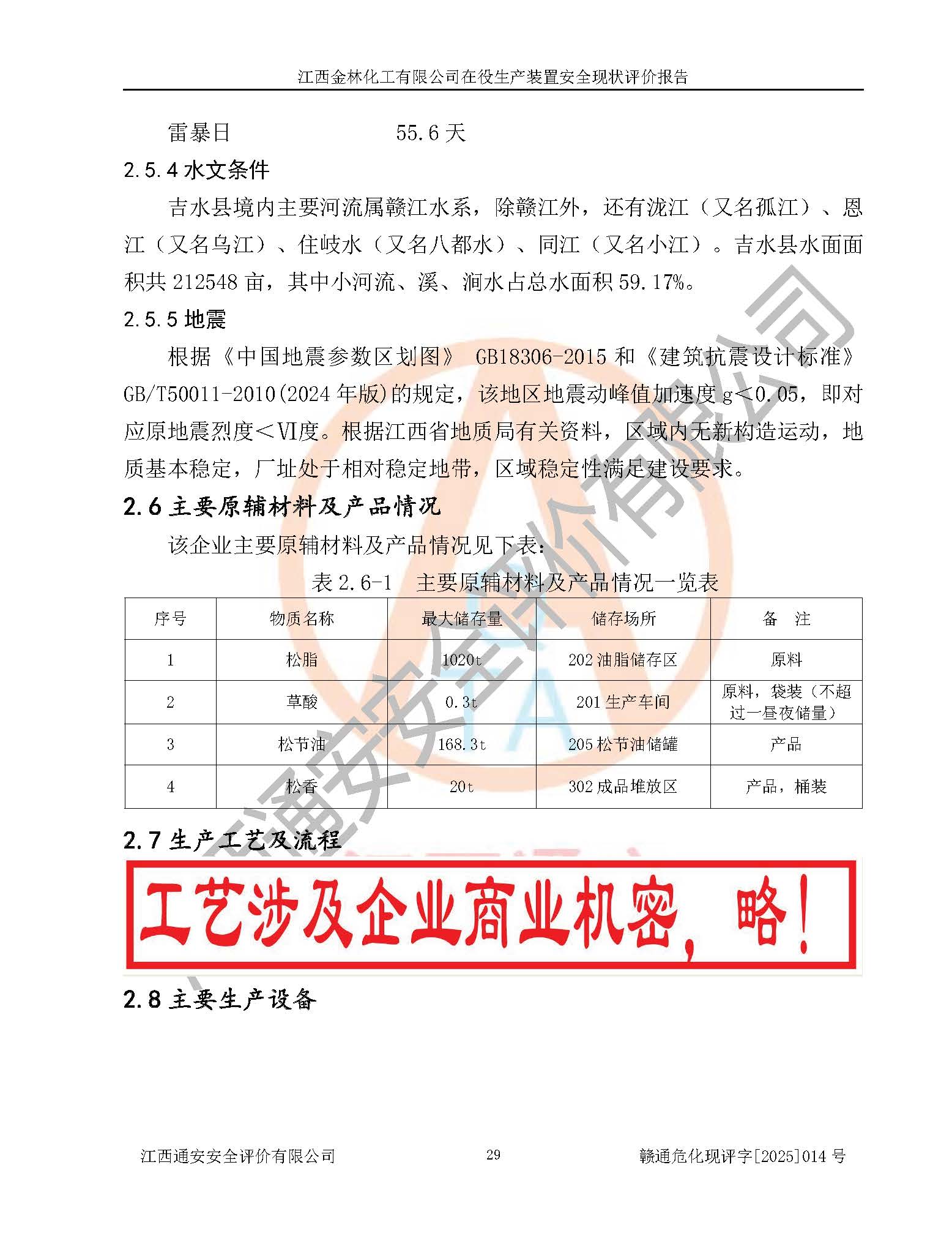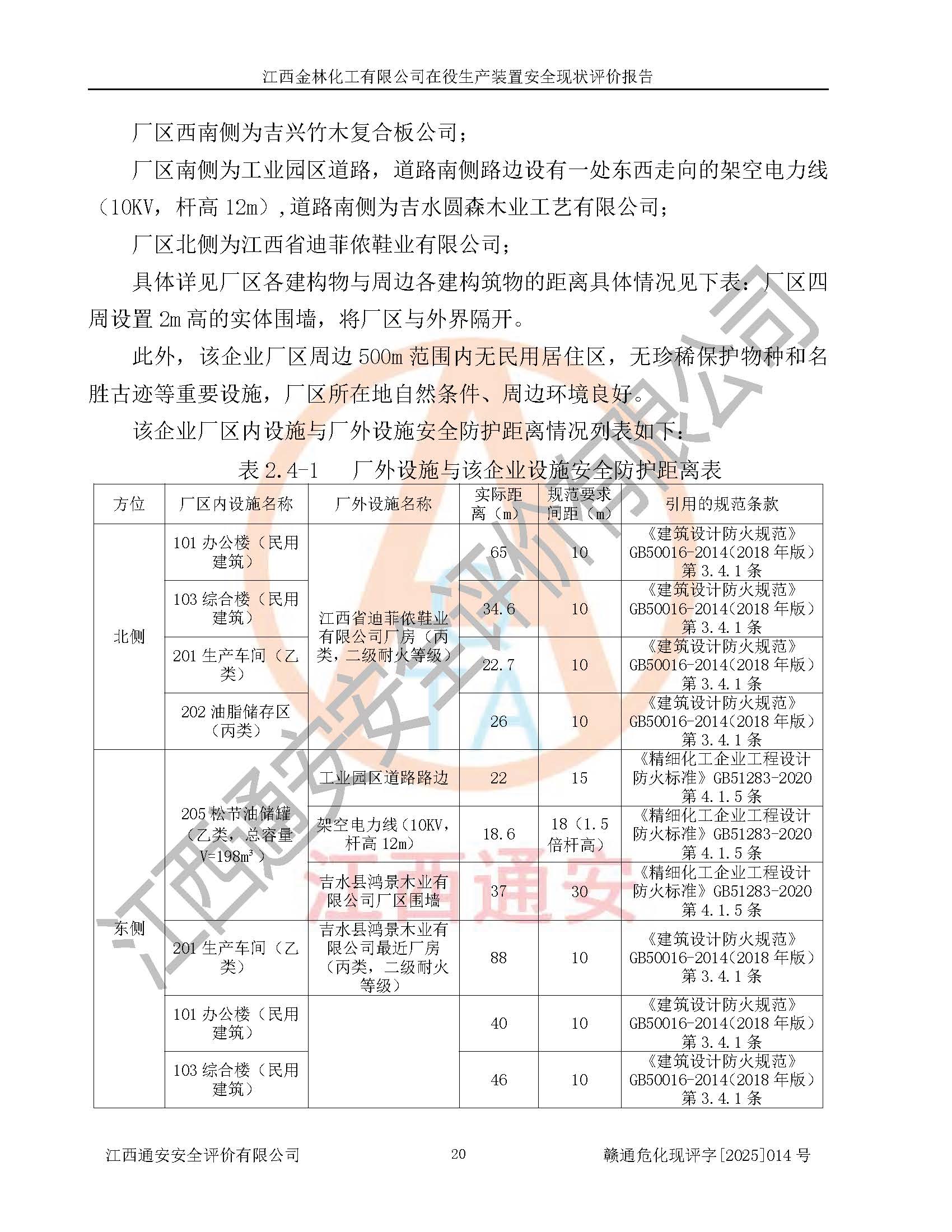 項目簡介 | 江西金林化工有限公司成立于2003年6月26日,并取得吉水縣市場監(jiān)督管理局頒發(fā)的《營業(yè)執(zhí)照》,營業(yè)執(zhí)照統(tǒng)一社會信用代碼:91360822748530538B。公司注冊住所:江西省吉安市吉水縣文峰工業(yè)城。法定**人:湯光耀,注冊資本:貳仟零壹拾玖萬元整。企業(yè)類型:有限責(zé)任公司(自然人投資或控股)。經(jīng)營范圍包括生產(chǎn)、銷售松節(jié)油、松香、林產(chǎn)化工產(chǎn)品、其它化工產(chǎn)品(含苯酚、甲醛)、橡膠產(chǎn)品、(憑化學(xué)危險品經(jīng)營許可證及消防安全檢查意見書經(jīng)營)、機械配件、紙張銷售。 江西金林化工有限公司于2022年8月23日進行了安全生產(chǎn)許可證換證,取得江西省應(yīng)急管理廳頒發(fā)的《安全生產(chǎn)許可證》,許可證編號為:(贛)WH安許證字[2005]0118號,許可范圍:松節(jié)油(2kt/a),**期2022年8月23日至2025年8月22日。 江西金林化工有限公司在役生產(chǎn)裝置為年產(chǎn)10000噸松香、2000噸松節(jié)油項目及其配套公用、輔助設(shè)施,主要產(chǎn)品有松香和松節(jié)油。 根據(jù)《危險化學(xué)品目錄》(2015年版)、應(yīng)急管理部辦公廳關(guān)于修改《危險化學(xué)品目錄(2015年版)實施指南(試行)》涉及柴油部分內(nèi)容的通知(應(yīng)急廳函〔2022〕300號)和《應(yīng)急管理部工業(yè)和信息化部公安部生態(tài)環(huán)境部交通運輸部農(nóng)業(yè)農(nóng)村部衛(wèi)生健康委市場監(jiān)管總局鐵路局民航局公告》2022年第8號《決定調(diào)整《危險化學(xué)品目錄(2015版)》,將“1674柴油〔閉杯閃點≤60℃〕”調(diào)整為“1674柴油”》的文件規(guī)定,對該企業(yè)生產(chǎn)過程中所涉及的化學(xué)品進行辨識:該企業(yè)涉及的危險化學(xué)品有:松脂、松節(jié)油、柴油(發(fā)電機燃料)等。 | |||