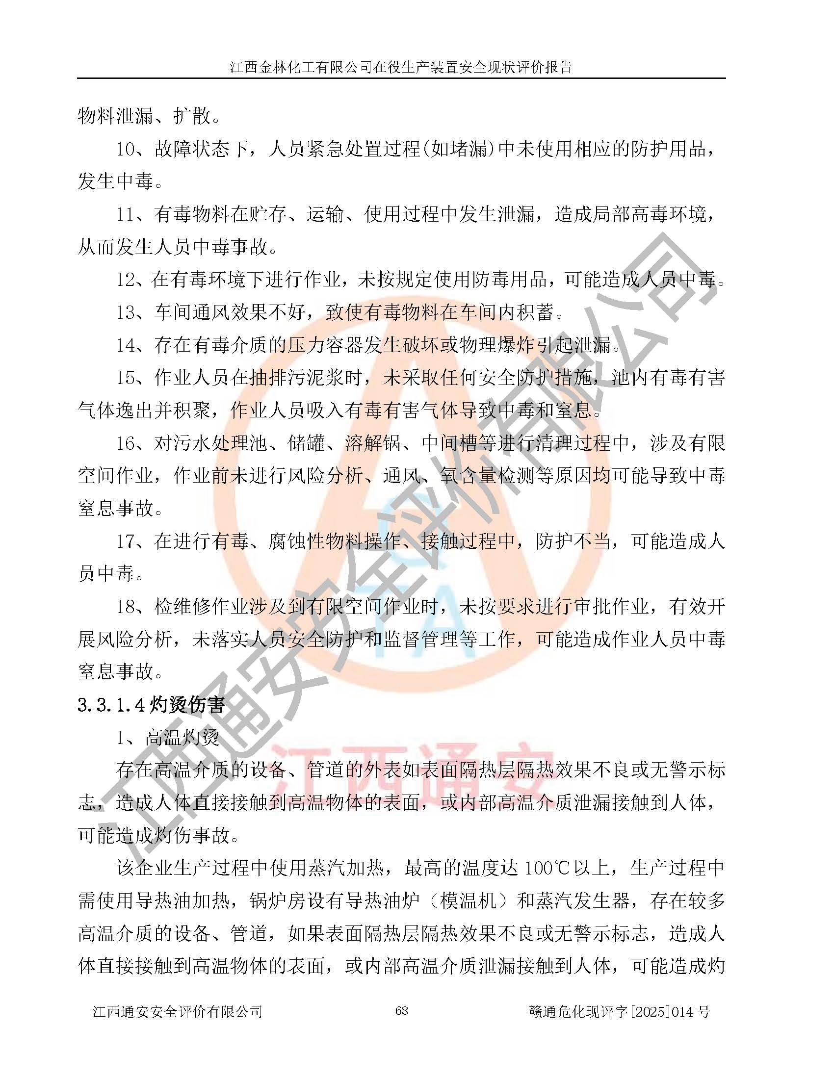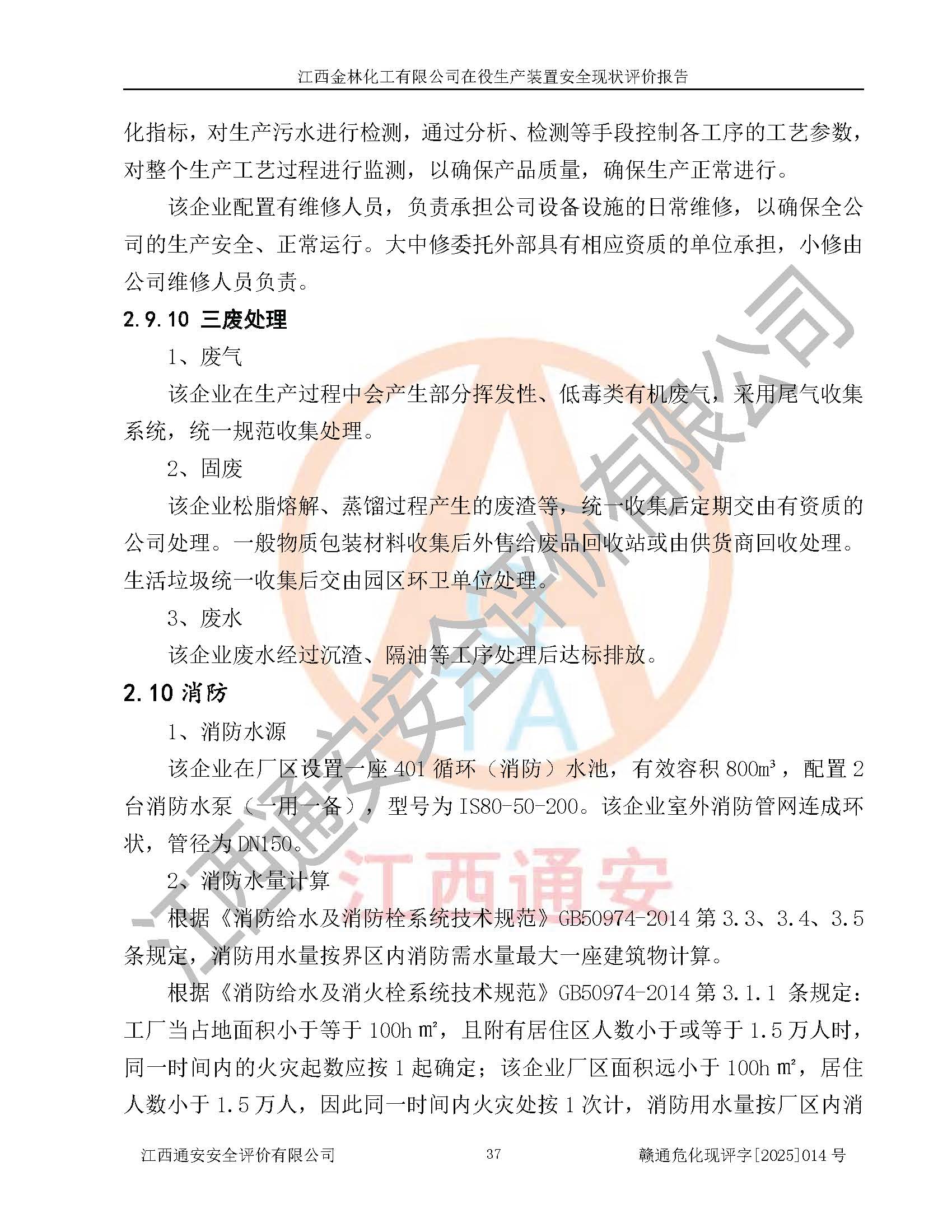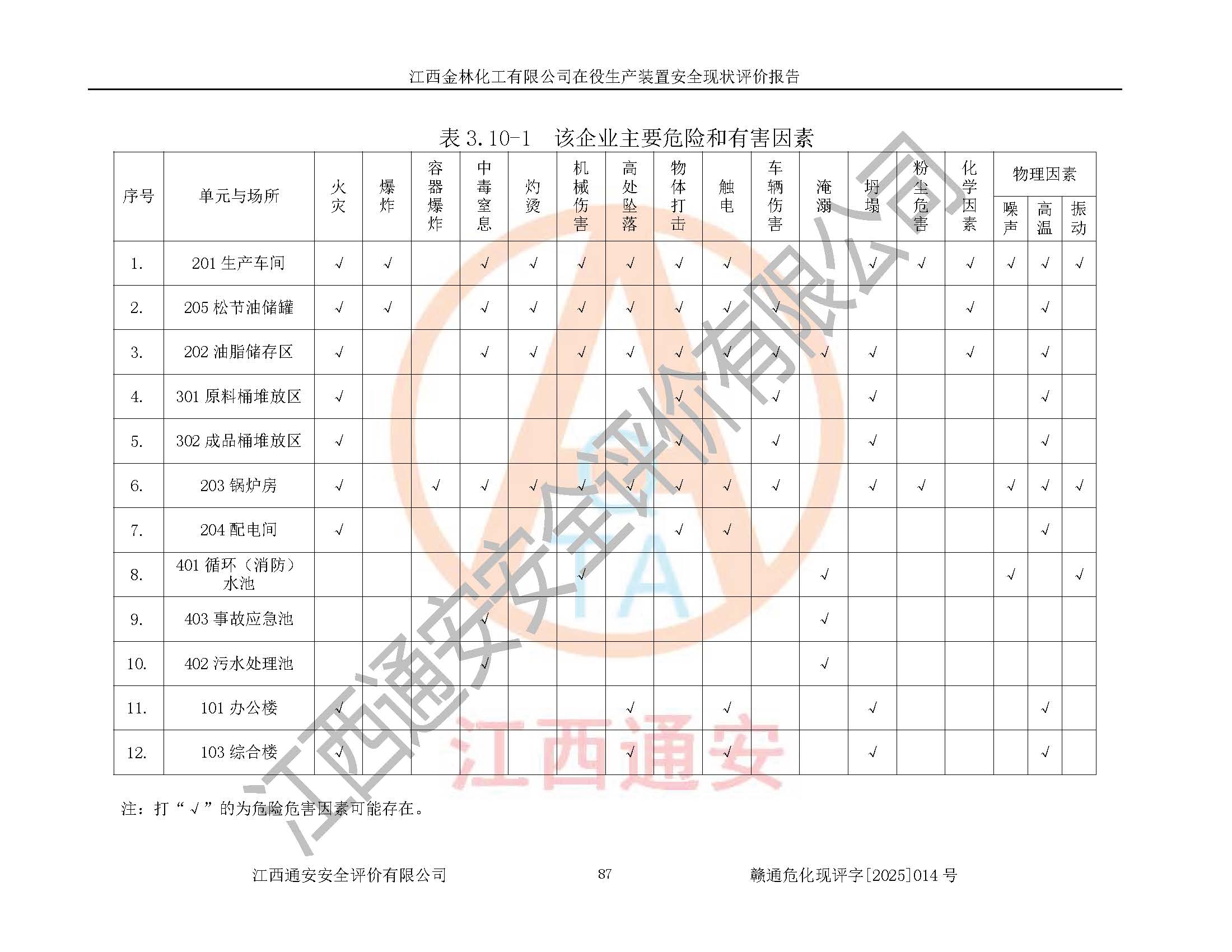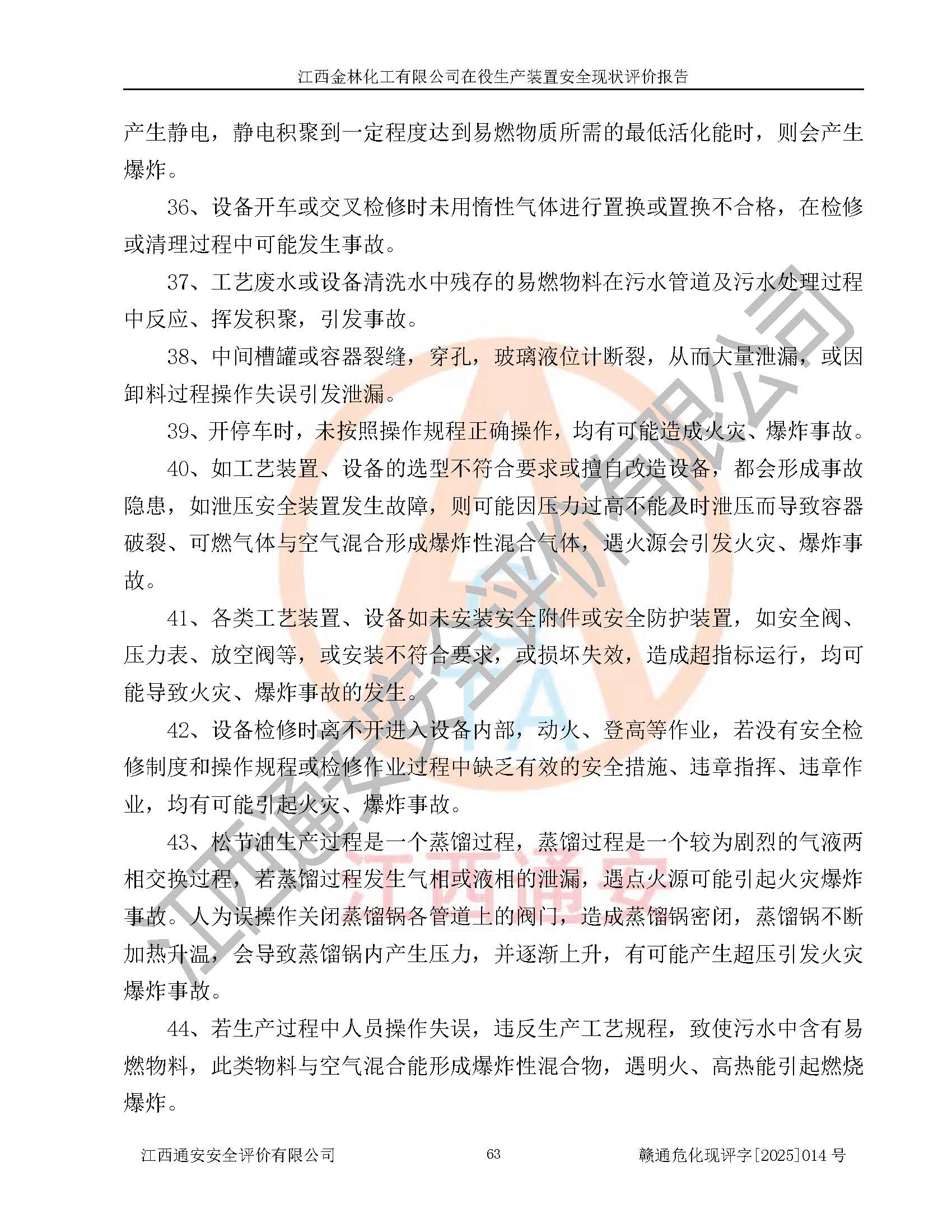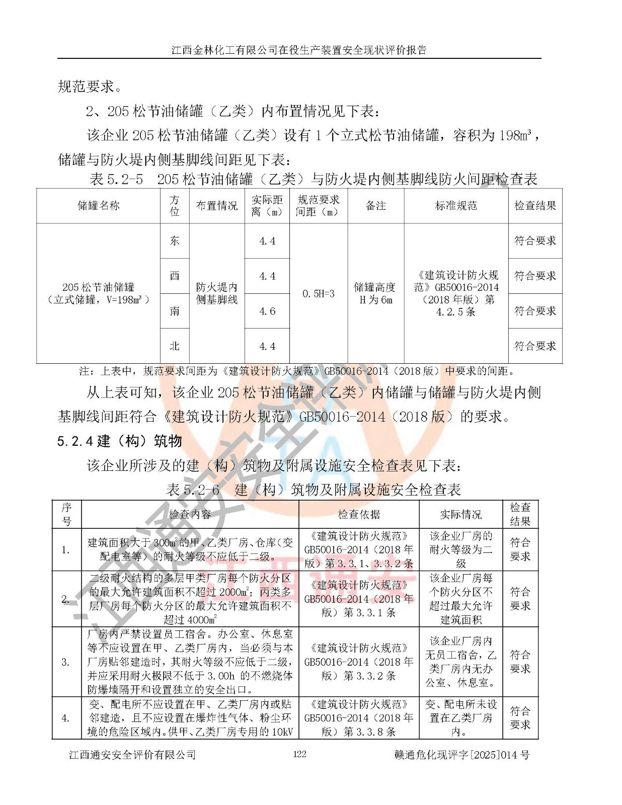 項目簡介 | 江西金林化工有限公司成立于2003年6月26日,并取得吉水縣市場監(jiān)督管理局頒發(fā)的《營業(yè)執(zhí)照》,營業(yè)執(zhí)照統(tǒng)一社會信用代碼:91360822748530538B。公司注冊住所:江西省吉安市吉水縣文峰工業(yè)城。法定**人:湯光耀,注冊資本:貳仟零壹拾玖萬元整。企業(yè)類型:有限責(zé)任公司(自然人投資或控股)。經(jīng)營范圍包括生產(chǎn)、銷售松節(jié)油、松香、林產(chǎn)化工產(chǎn)品、其它化工產(chǎn)品(含苯酚、甲醛)、橡膠產(chǎn)品、(憑化學(xué)危險品經(jīng)營許可證及消防安全檢查意見書經(jīng)營)、機械配件、紙張銷售。 江西金林化工有限公司于2022年8月23日進行了安全生產(chǎn)許可證換證,取得江西省應(yīng)急管理廳頒發(fā)的《安全生產(chǎn)許可證》,許可證編號為:(贛)WH安許證字[2005]0118號,許可范圍:松節(jié)油(2kt/a),**期2022年8月23日至2025年8月22日。 江西金林化工有限公司在役生產(chǎn)裝置為年產(chǎn)10000噸松香、2000噸松節(jié)油項目及其配套公用、輔助設(shè)施,主要產(chǎn)品有松香和松節(jié)油。 根據(jù)《危險化學(xué)品目錄》(2015年版)、應(yīng)急管理部辦公廳關(guān)于修改《危險化學(xué)品目錄(2015年版)實施指南(試行)》涉及柴油部分內(nèi)容的通知(應(yīng)急廳函〔2022〕300號)和《應(yīng)急管理部工業(yè)和信息化部公安部生態(tài)環(huán)境部交通運輸部農(nóng)業(yè)農(nóng)村部衛(wèi)生健康委市場監(jiān)管總局鐵路局民航局公告》2022年第8號《決定調(diào)整《危險化學(xué)品目錄(2015版)》,將“1674柴油〔閉杯閃點≤60℃〕”調(diào)整為“1674柴油”》的文件規(guī)定,對該企業(yè)生產(chǎn)過程中所涉及的化學(xué)品進行辨識:該企業(yè)涉及的危險化學(xué)品有:松脂、松節(jié)油、柴油(發(fā)電機燃料)等。 | |||