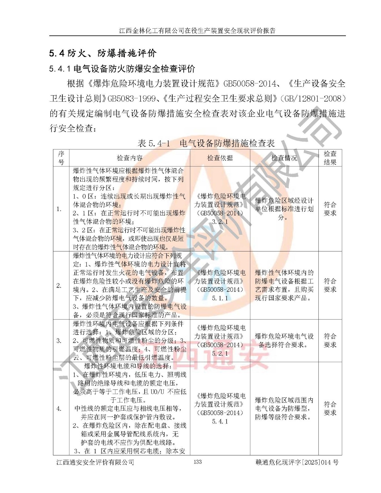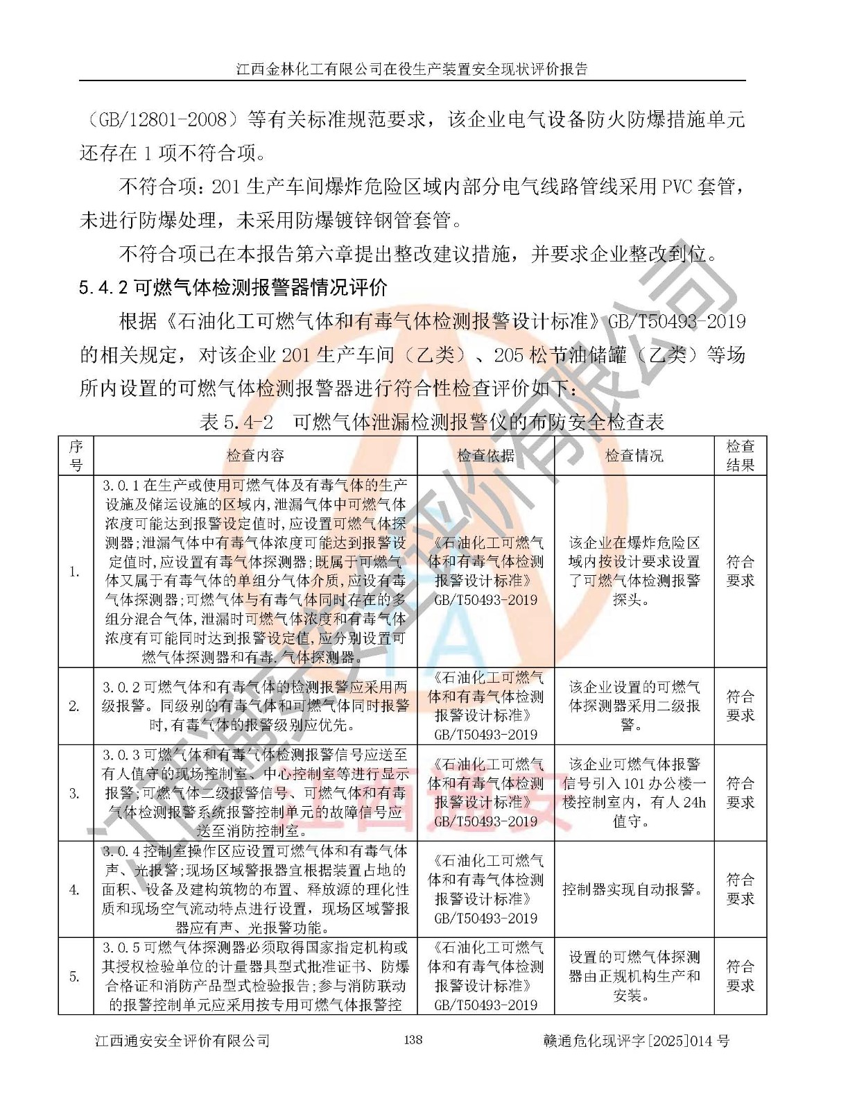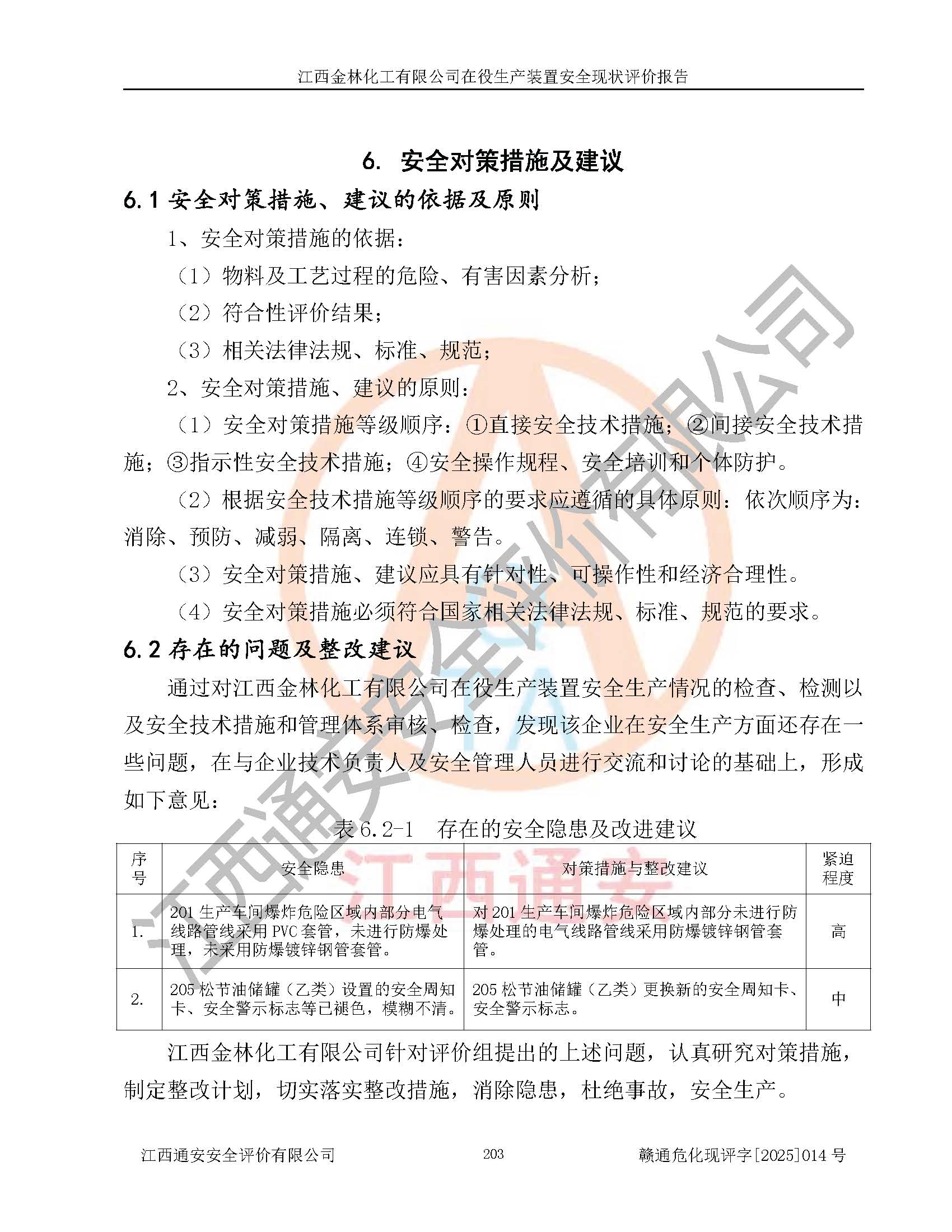 勘察現(xiàn)場發(fā)現(xiàn)的問題及安全對策措施 | 序號安全隱患對策措施與整改建議緊迫程度1. 201生產(chǎn)車間爆炸危險區(qū)域內(nèi)部分電氣線路管線采用PVC套管,未進行防爆處理,未采用防爆鍍鋅鋼管套管。對201生產(chǎn)車間爆炸危險區(qū)域內(nèi)部分未進行防爆處理的電氣線路管線采用防爆鍍鋅鋼管套管。高2. 205松節(jié)油儲罐(乙類)設(shè)置的安全周知卡、安全警示標志等已褪色,模糊不清。205松節(jié)油儲罐(乙類)更換新的安全周知卡、安全警示標志。中