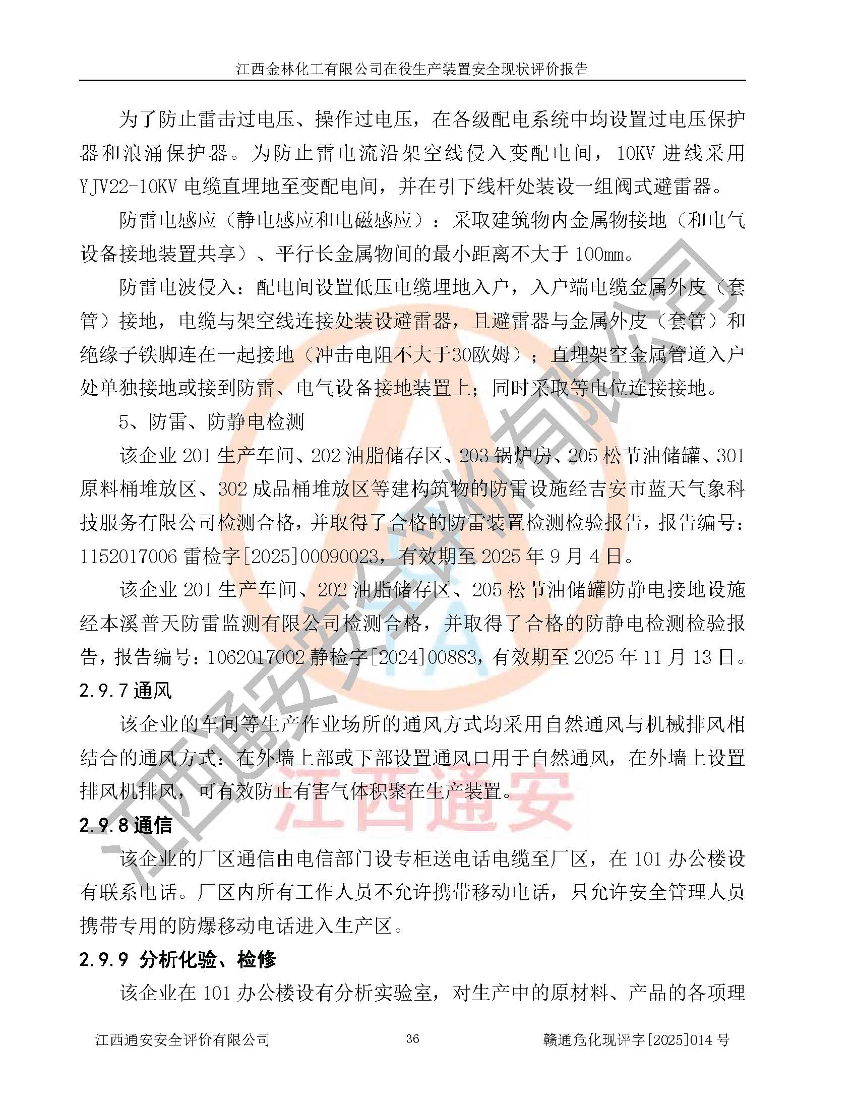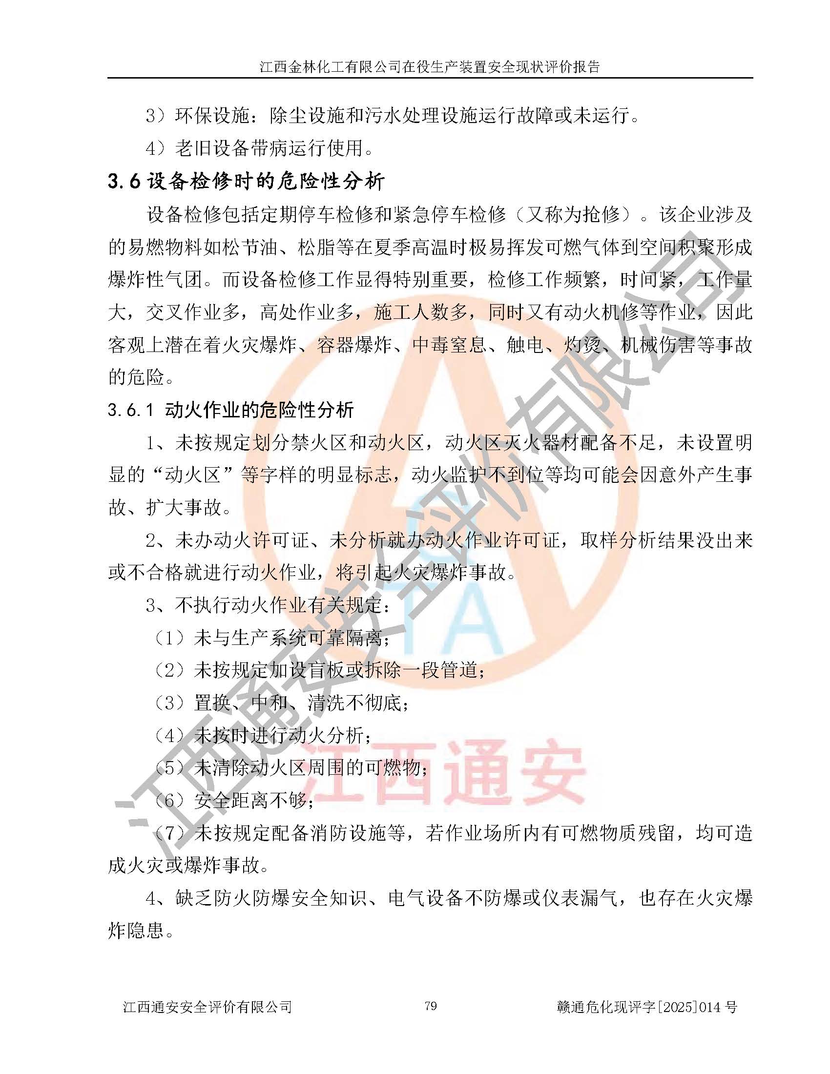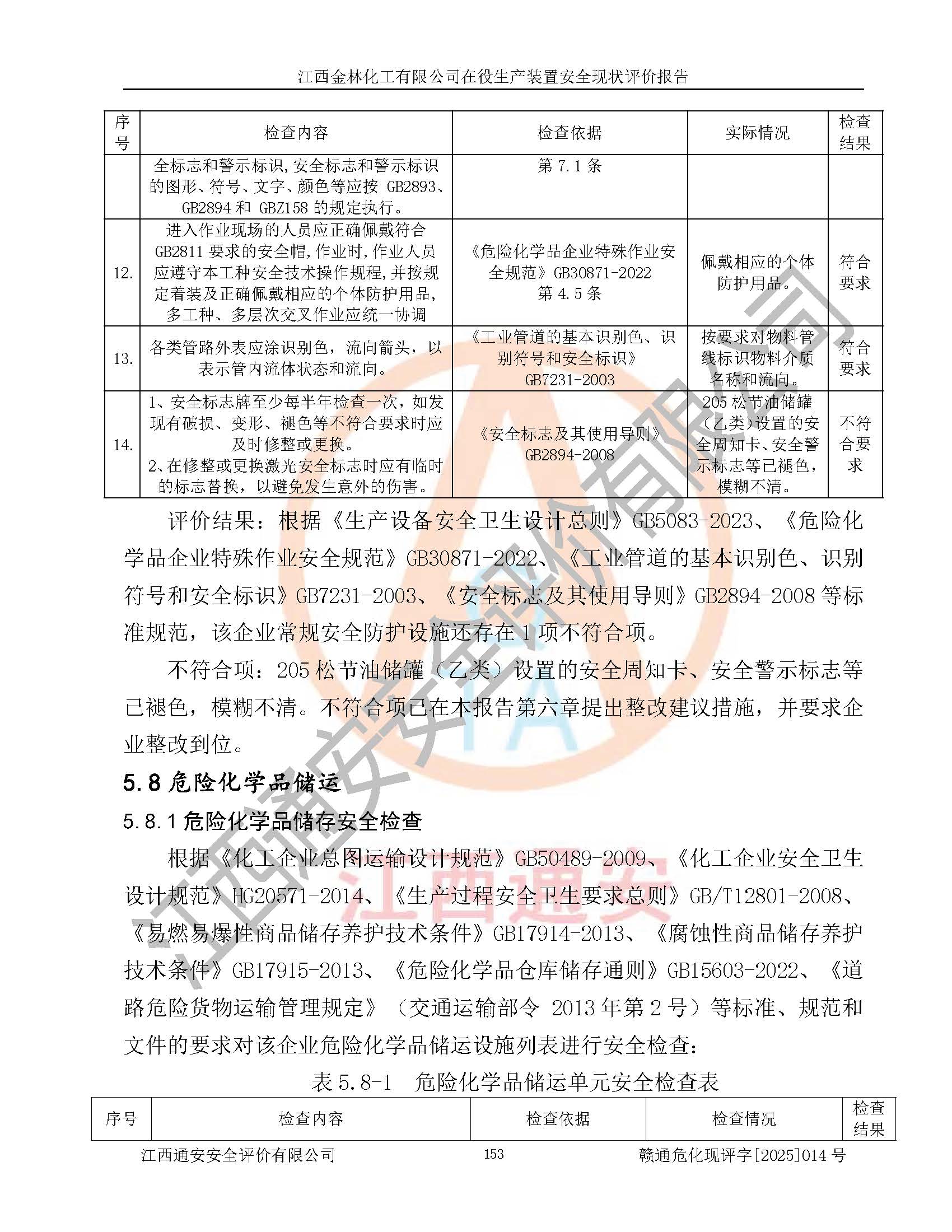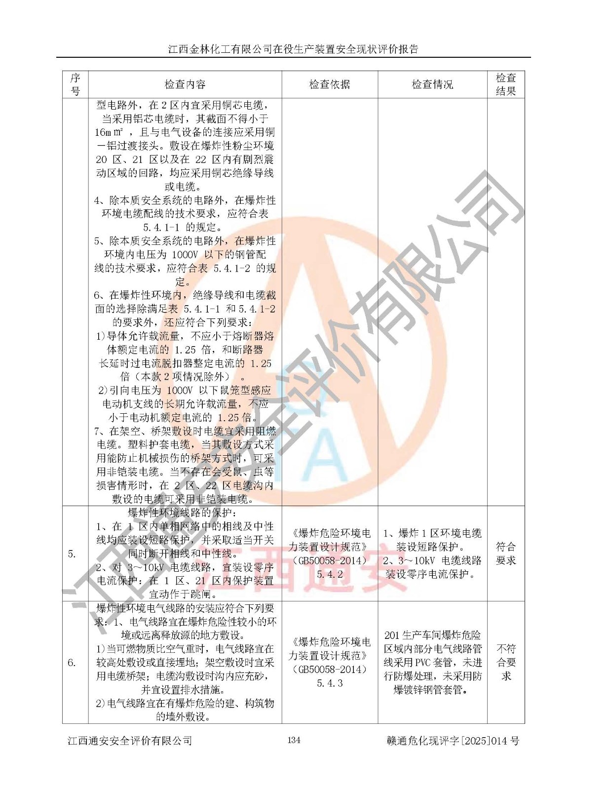 勘察現(xiàn)場發(fā)現(xiàn)的問題及安全對策措施 | 序號安全隱患對策措施與整改建議緊迫程度1. 201生產(chǎn)車間爆炸危險區(qū)域內(nèi)部分電氣線路管線采用PVC套管,未進行防爆處理,未采用防爆鍍鋅鋼管套管。對201生產(chǎn)車間爆炸危險區(qū)域內(nèi)部分未進行防爆處理的電氣線路管線采用防爆鍍鋅鋼管套管。高2. 205松節(jié)油儲罐(乙類)設(shè)置的安全周知卡、安全警示標志等已褪色,模糊不清。205松節(jié)油儲罐(乙類)更換新的安全周知卡、安全警示標志。中
