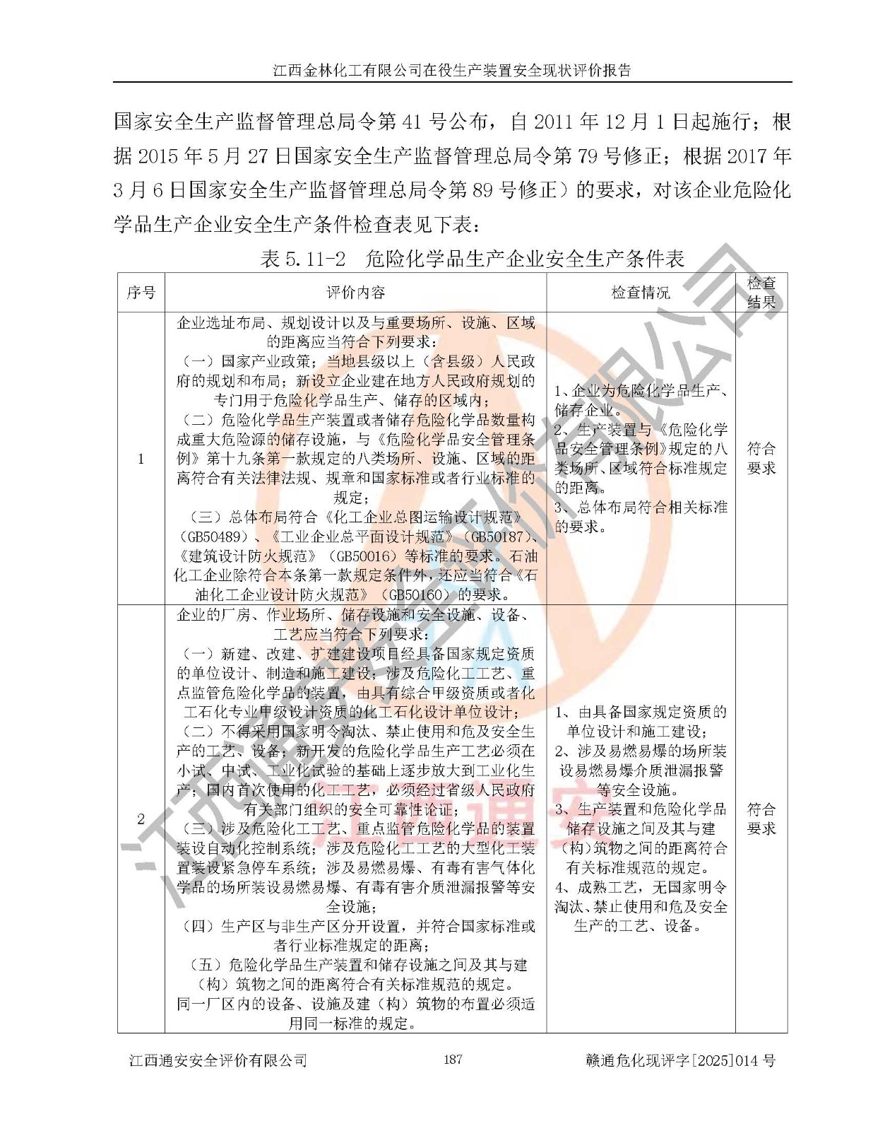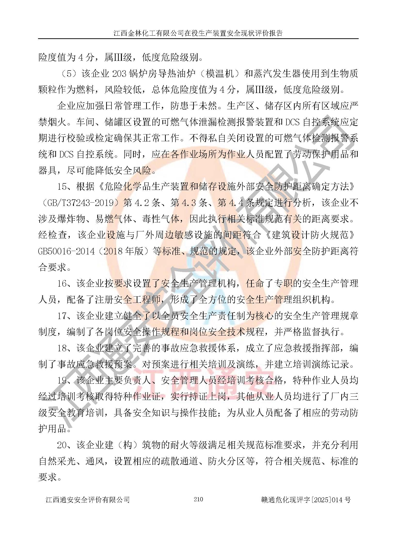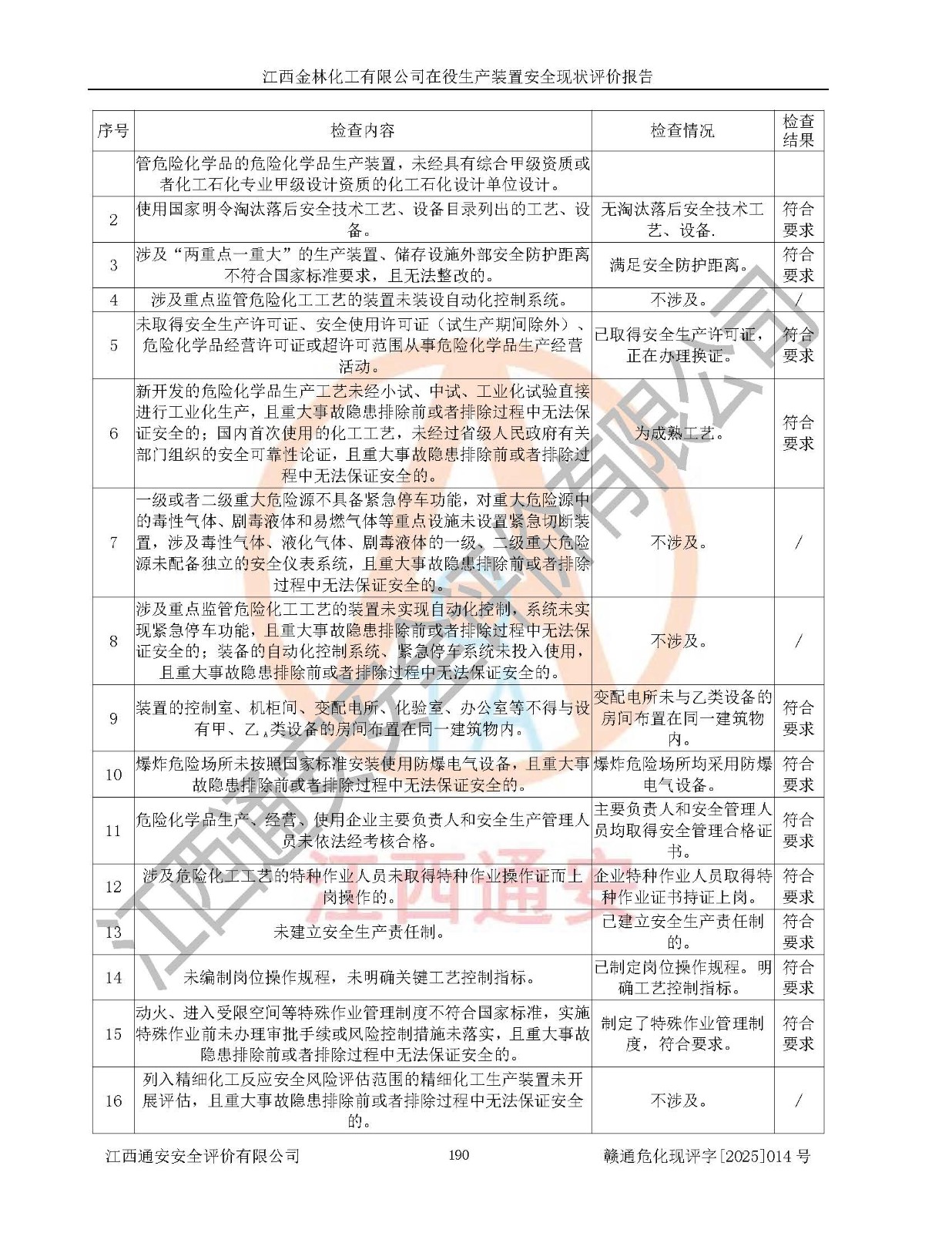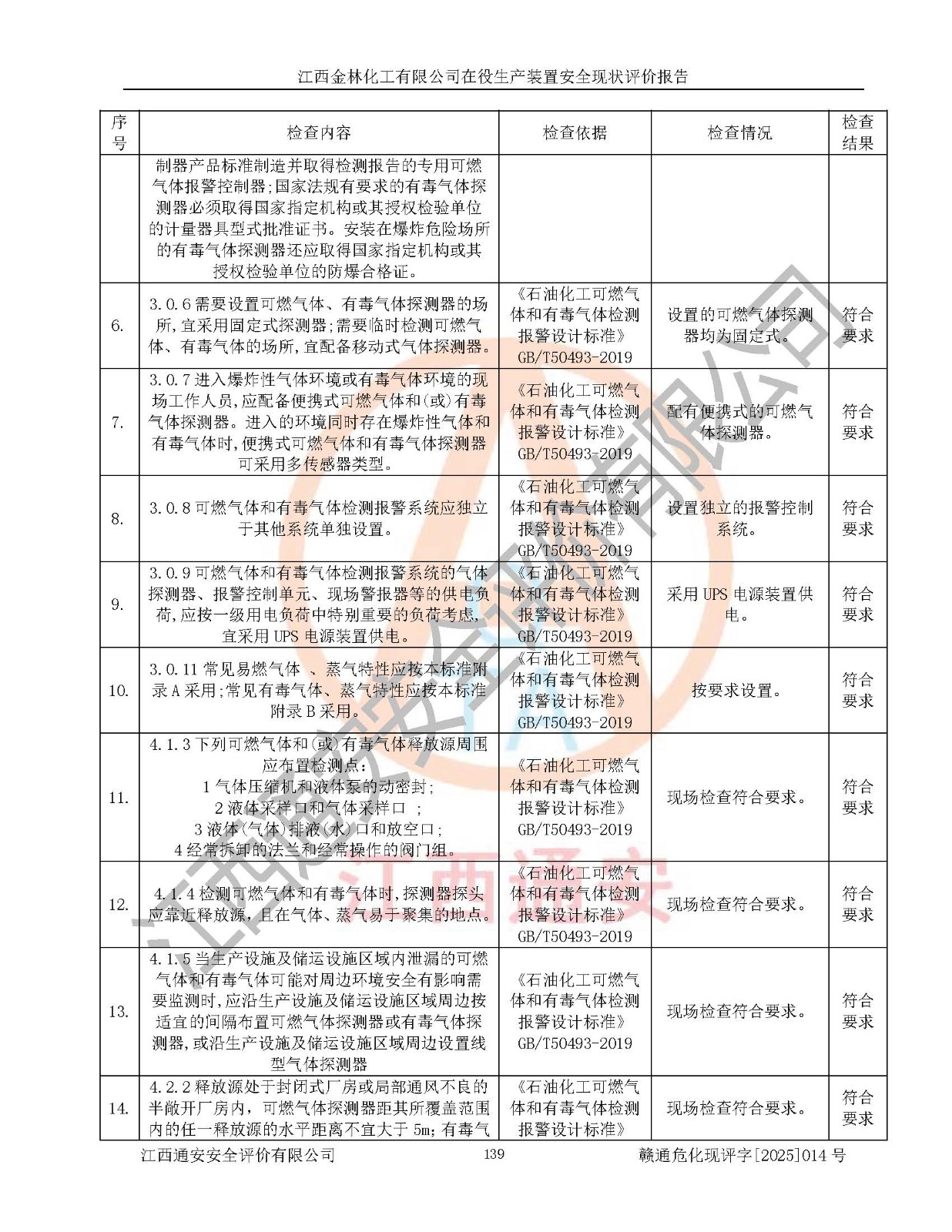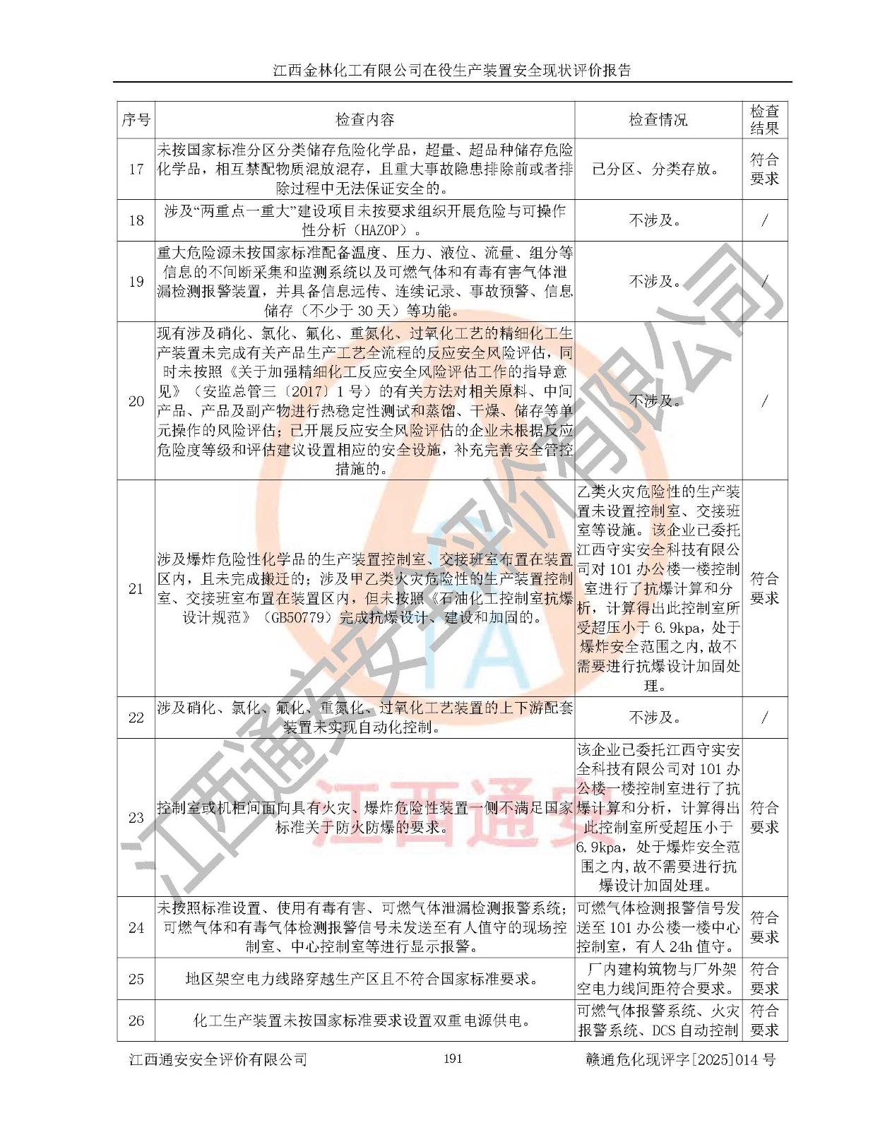 評價結(jié)論 | 江西金林化工有限公司在役生產(chǎn)裝置現(xiàn)場情況與設(shè)計圖紙一致,安全監(jiān)測監(jiān)控系統(tǒng)與設(shè)計一致,并**運行,有關(guān)從業(yè)人員資格符合《江西省危險化學(xué)品安全專項整治三年行動實施方案》要求,安全設(shè)施及安全管理符合**及有關(guān)部門關(guān)于安全生產(chǎn)法律法規(guī)、標準的要求,安全設(shè)施正常投用且運行**,安全風(fēng)險是可以控制的,其風(fēng)險程度是可以接受的,安全現(xiàn)狀符合安全生產(chǎn)條件,能夠滿足安全生產(chǎn)的要求。 | |||