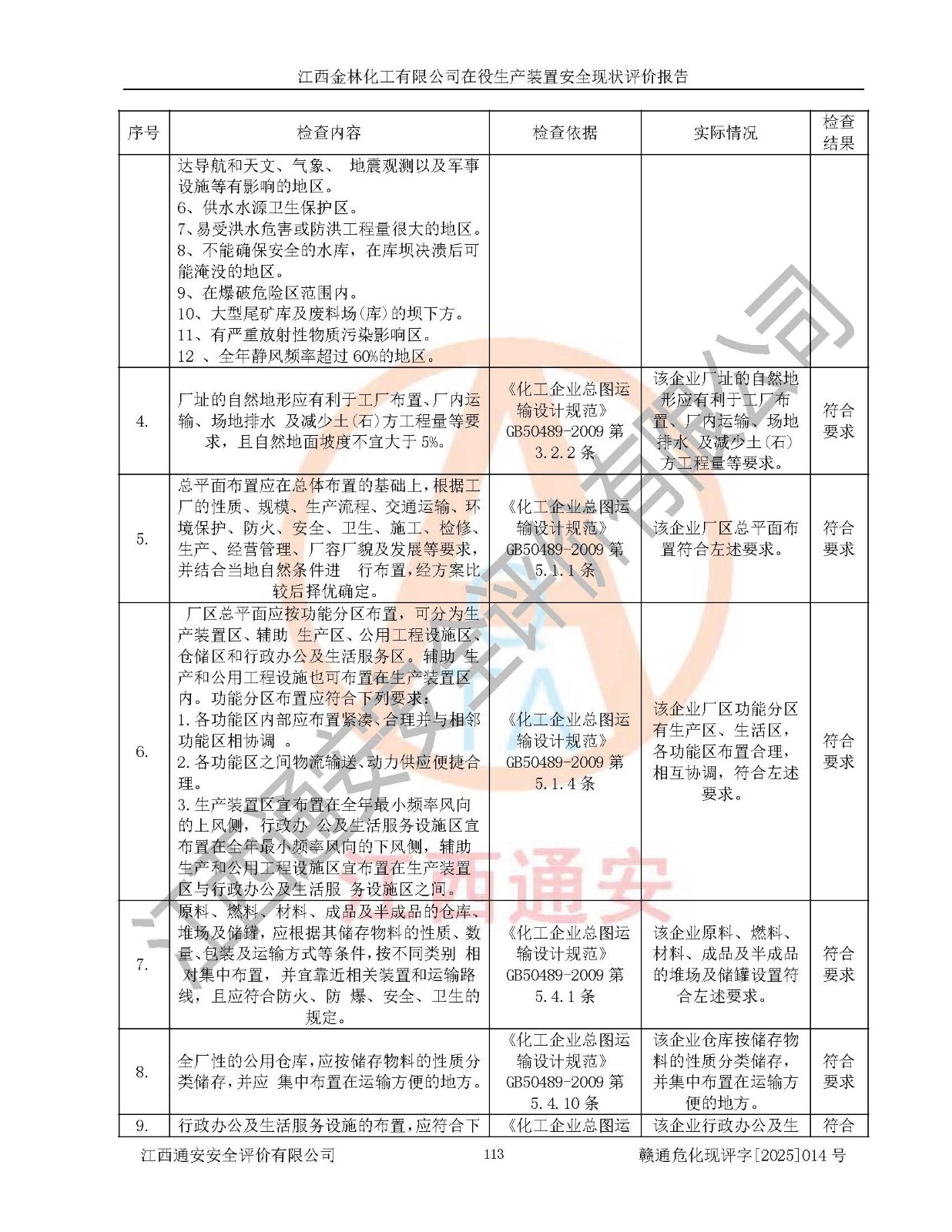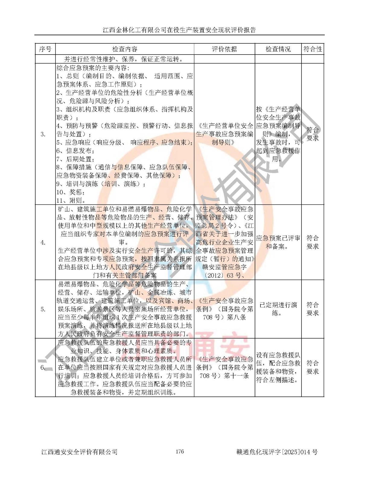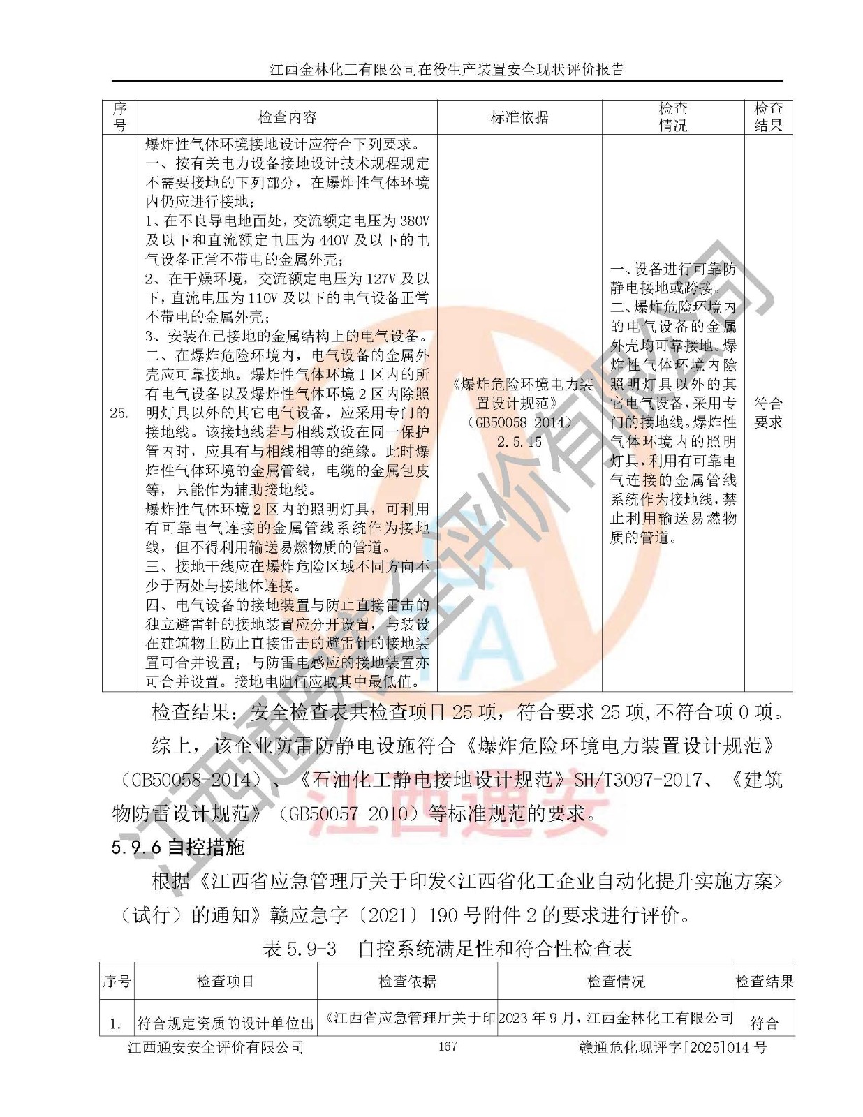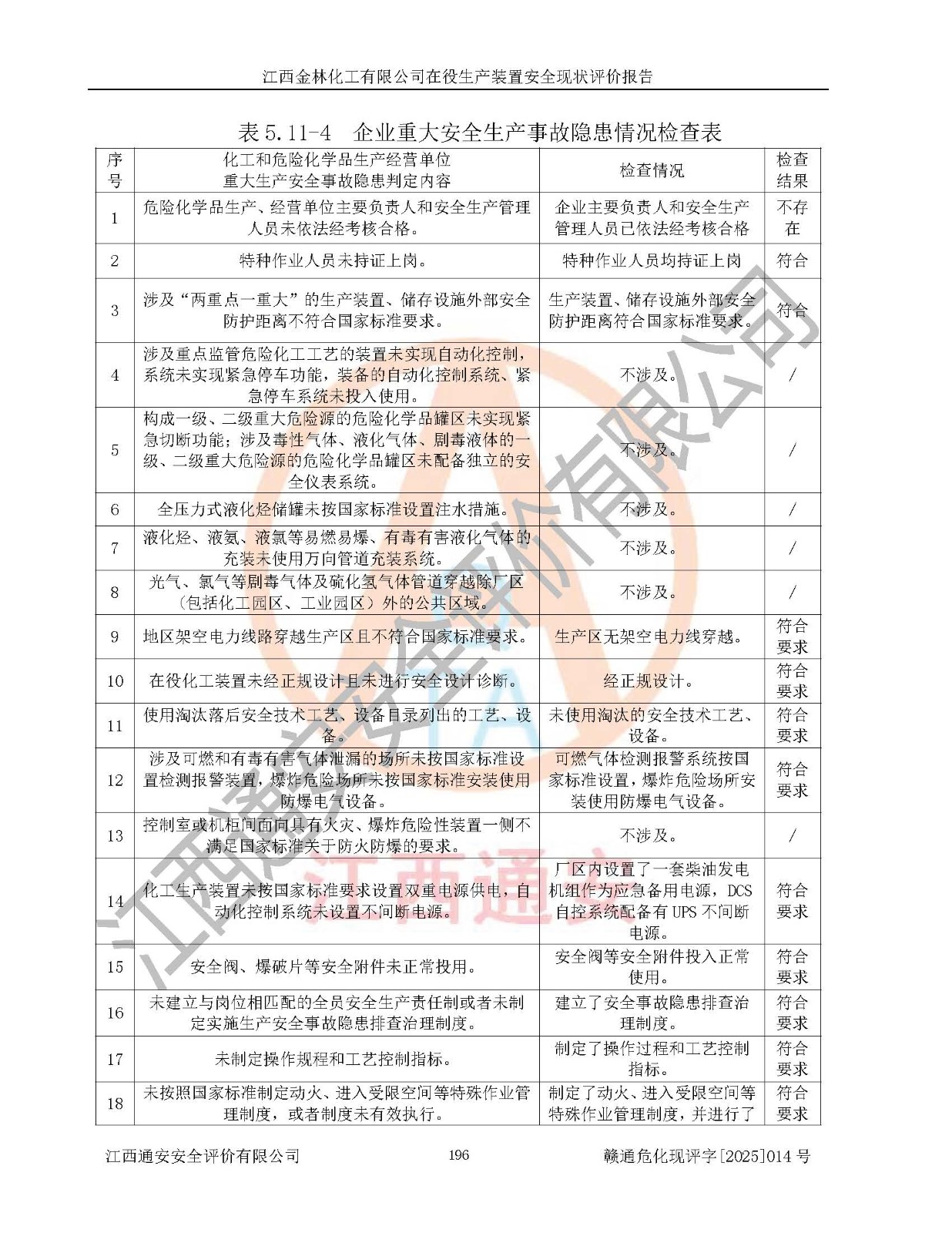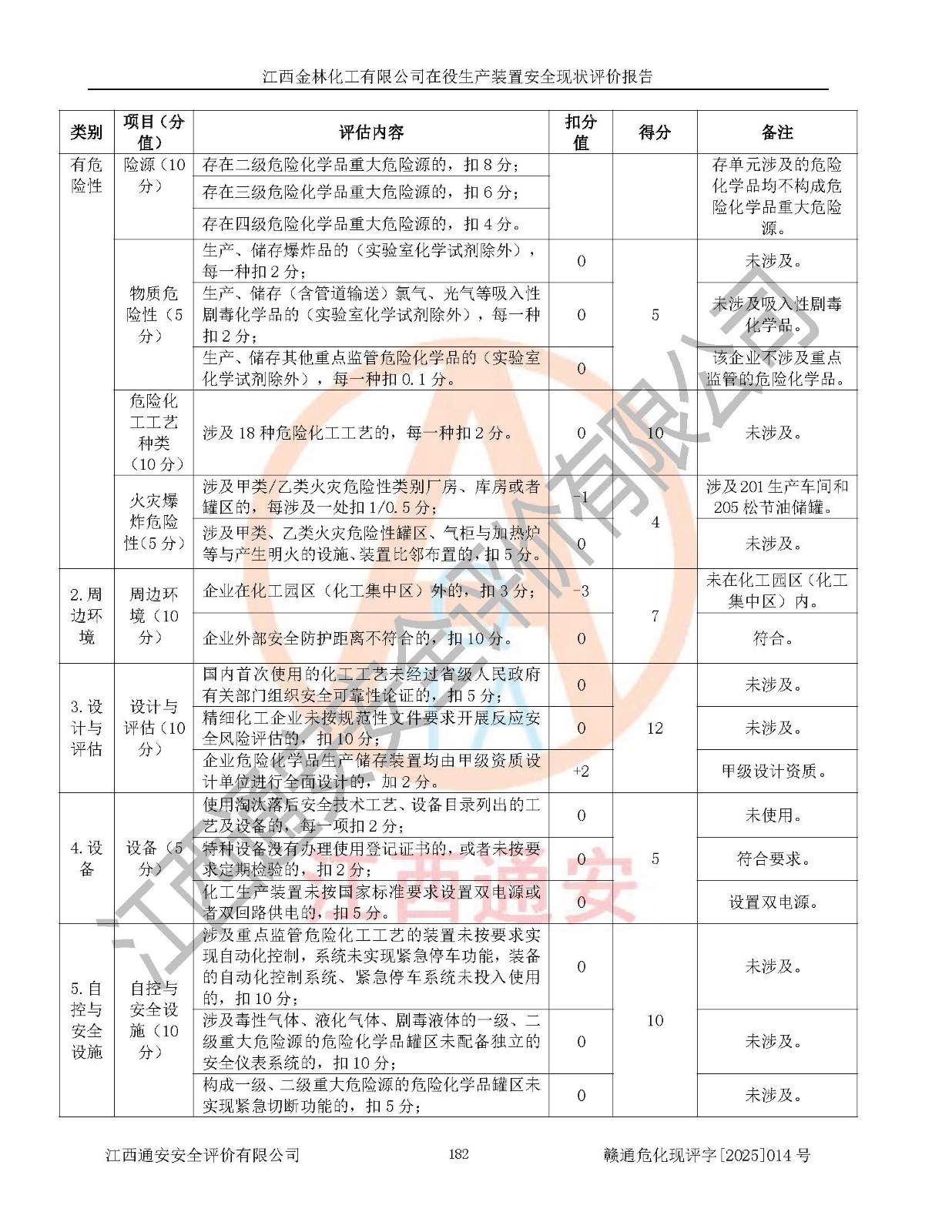 評價結(jié)論 | 江西金林化工有限公司在役生產(chǎn)裝置現(xiàn)場情況與設(shè)計圖紙一致,安全監(jiān)測監(jiān)控系統(tǒng)與設(shè)計一致,并**運行,有關(guān)從業(yè)人員資格符合《江西省危險化學(xué)品安全專項整治三年行動實施方案》要求,安全設(shè)施及安全管理符合**及有關(guān)部門關(guān)于安全生產(chǎn)法律法規(guī)、標準的要求,安全設(shè)施正常投用且運行**,安全風(fēng)險是可以控制的,其風(fēng)險程度是可以接受的,安全現(xiàn)狀符合安全生產(chǎn)條件,能夠滿足安全生產(chǎn)的要求。 | |||