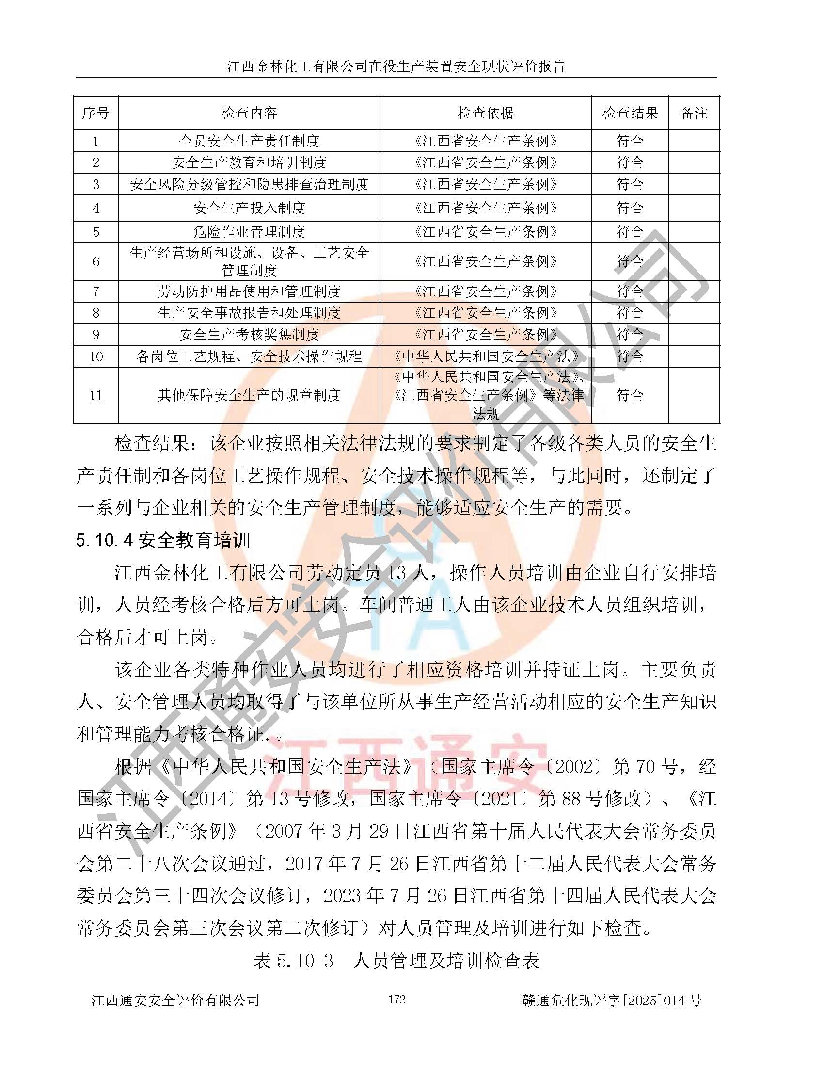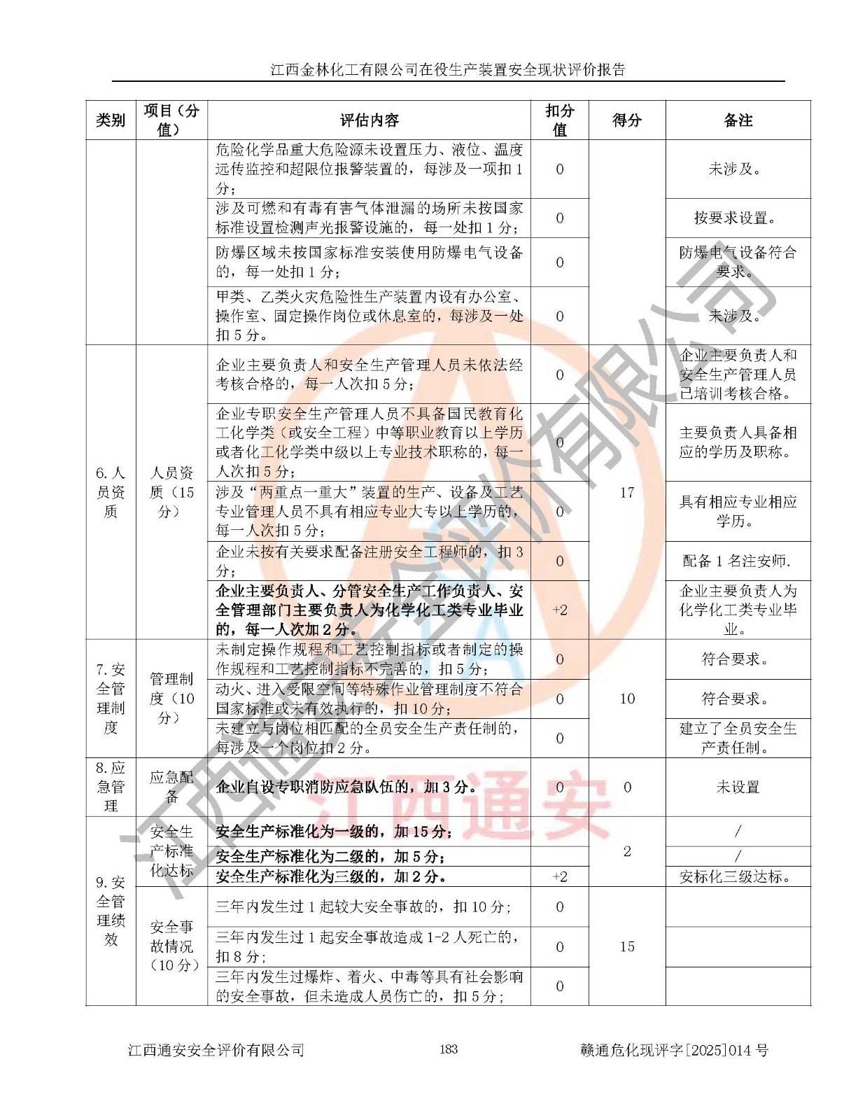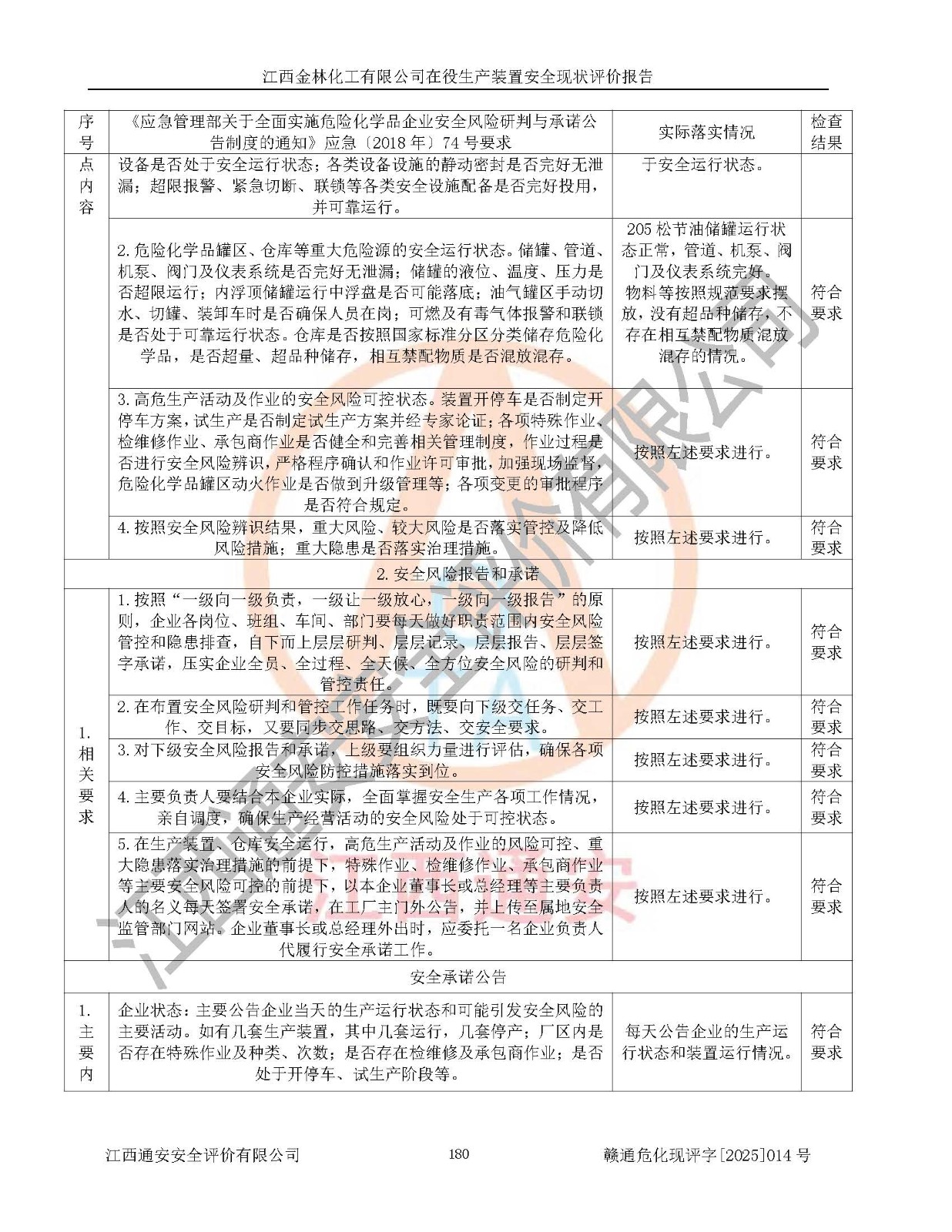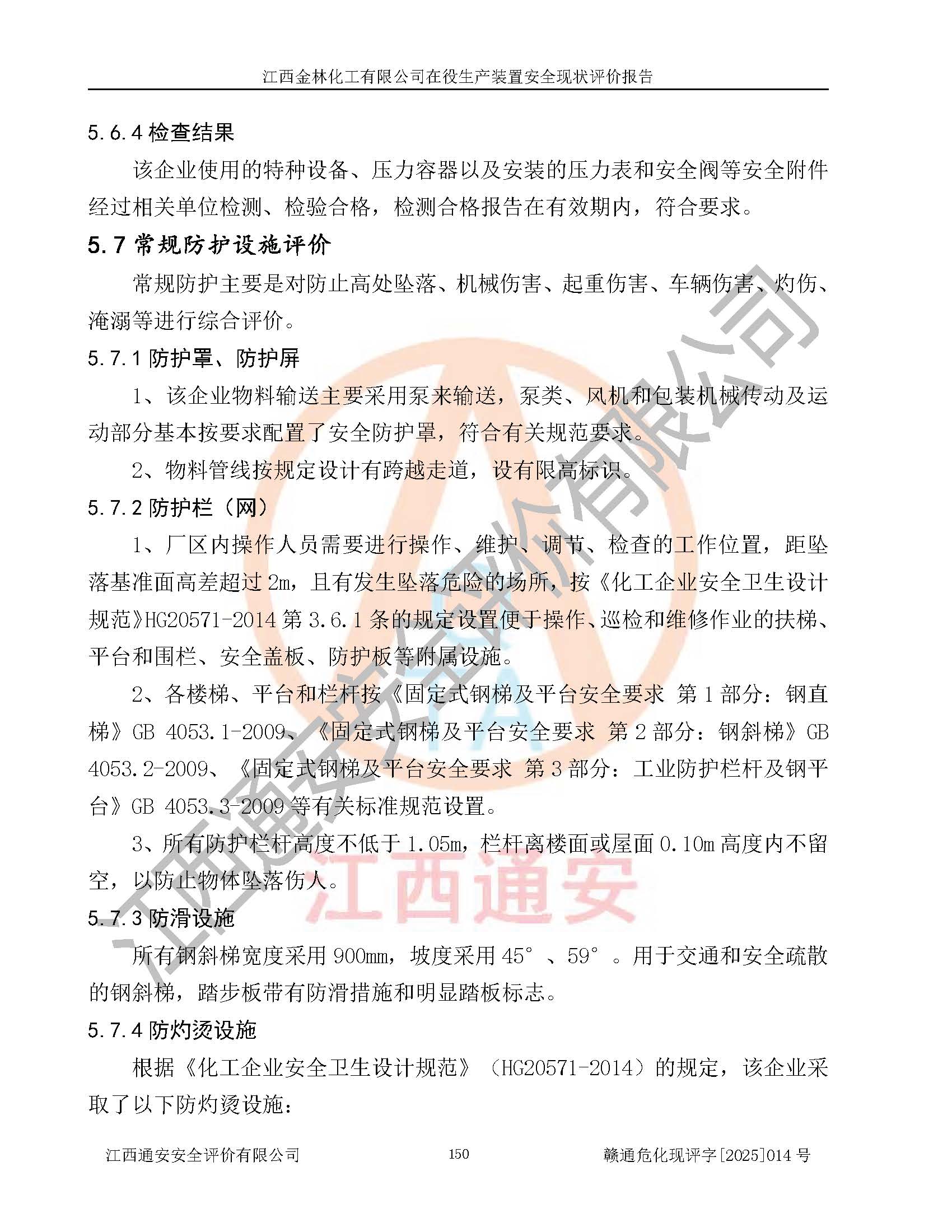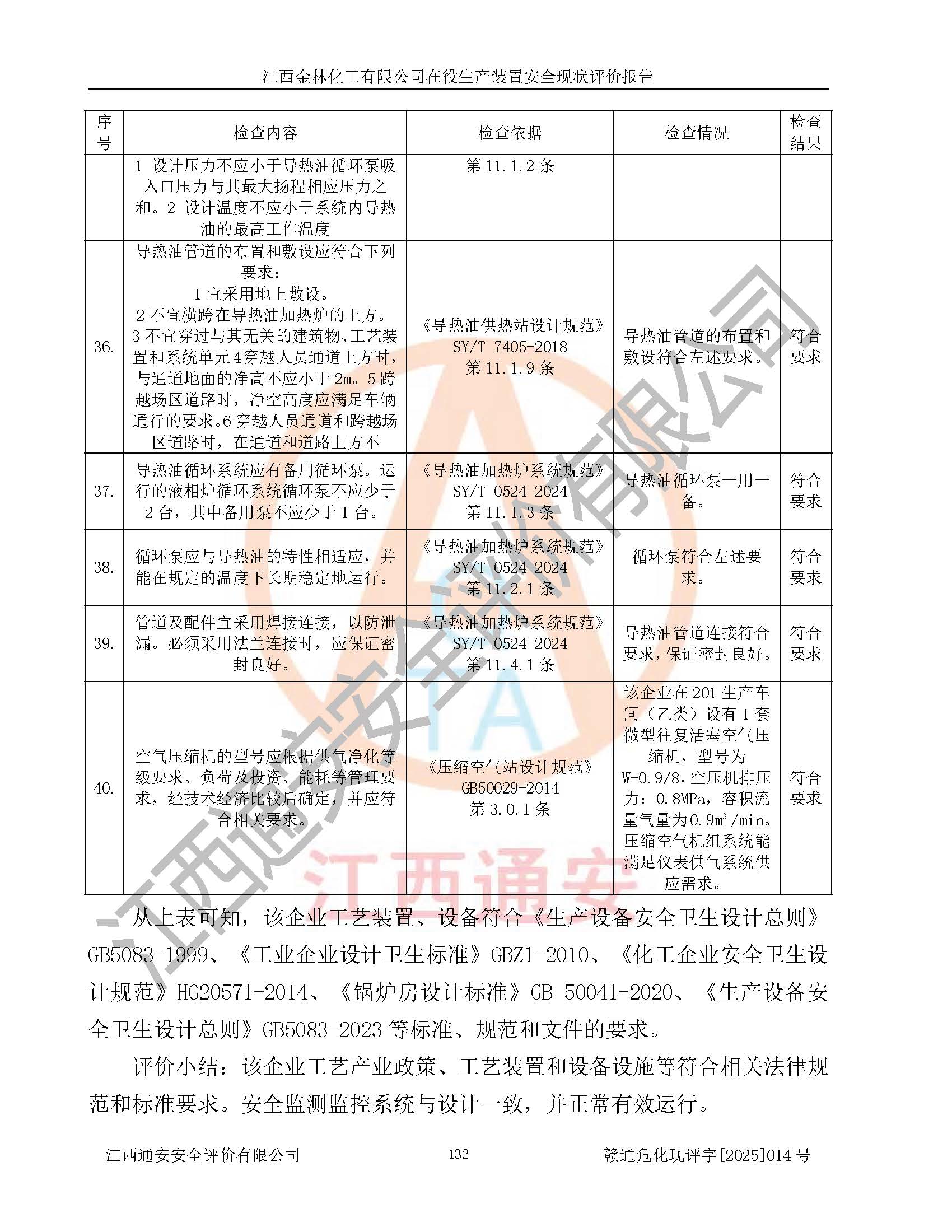 評價結(jié)論 | 江西金林化工有限公司在役生產(chǎn)裝置現(xiàn)場情況與設(shè)計圖紙一致,安全監(jiān)測監(jiān)控系統(tǒng)與設(shè)計一致,并**運行,有關(guān)從業(yè)人員資格符合《江西省危險化學(xué)品安全專項整治三年行動實施方案》要求,安全設(shè)施及安全管理符合**及有關(guān)部門關(guān)于安全生產(chǎn)法律法規(guī)、標準的要求,安全設(shè)施正常投用且運行**,安全風(fēng)險是可以控制的,其風(fēng)險程度是可以接受的,安全現(xiàn)狀符合安全生產(chǎn)條件,能夠滿足安全生產(chǎn)的要求。 | |||
