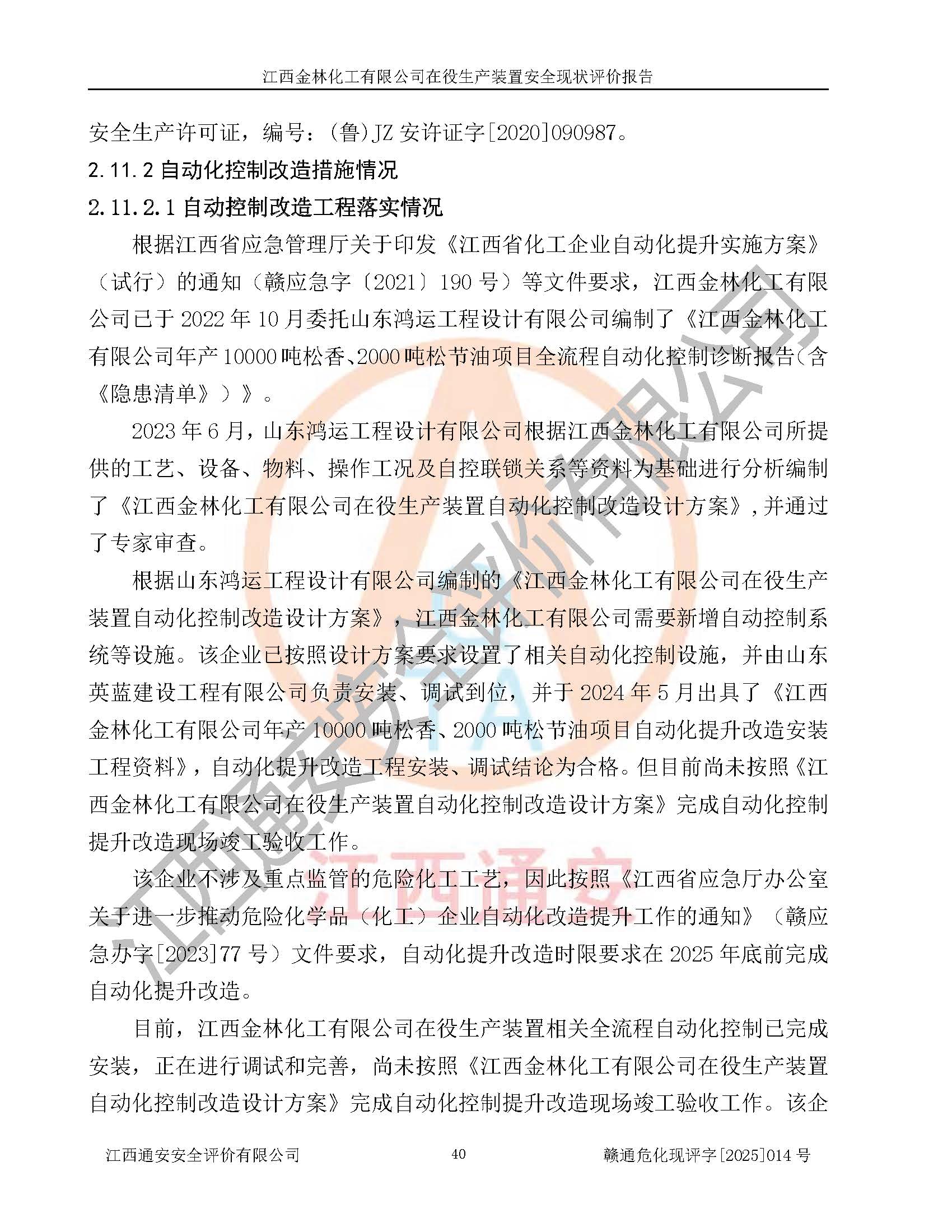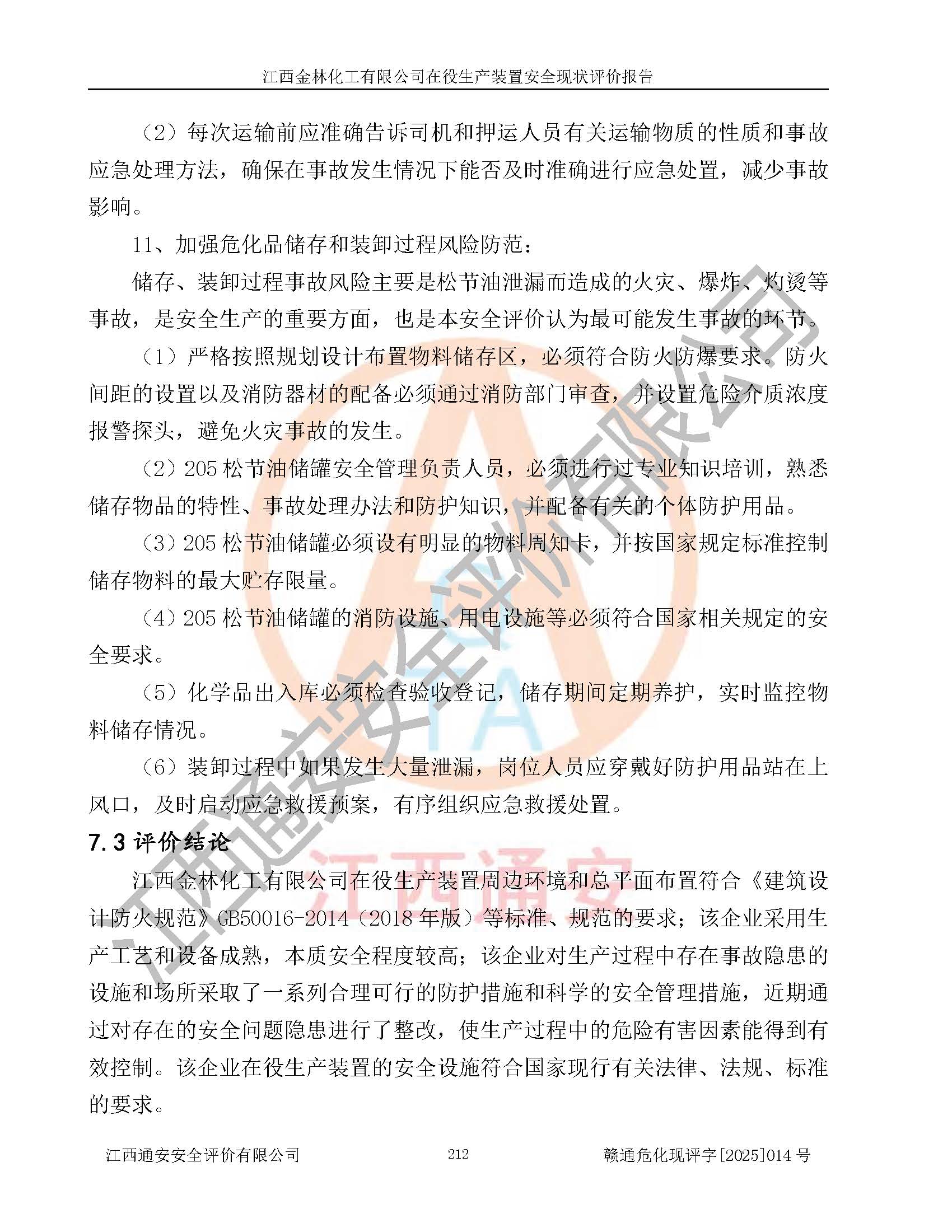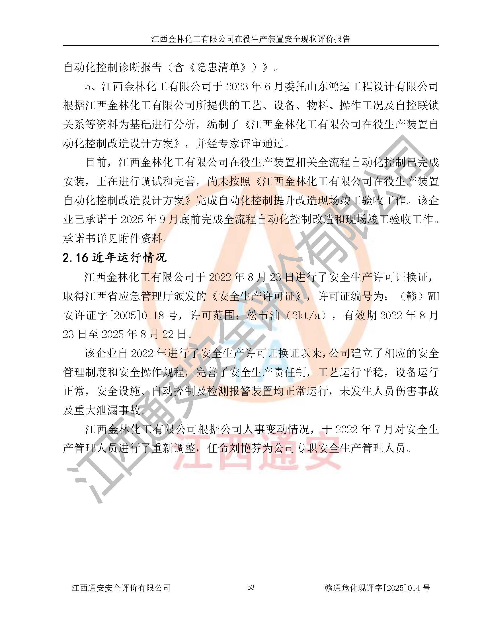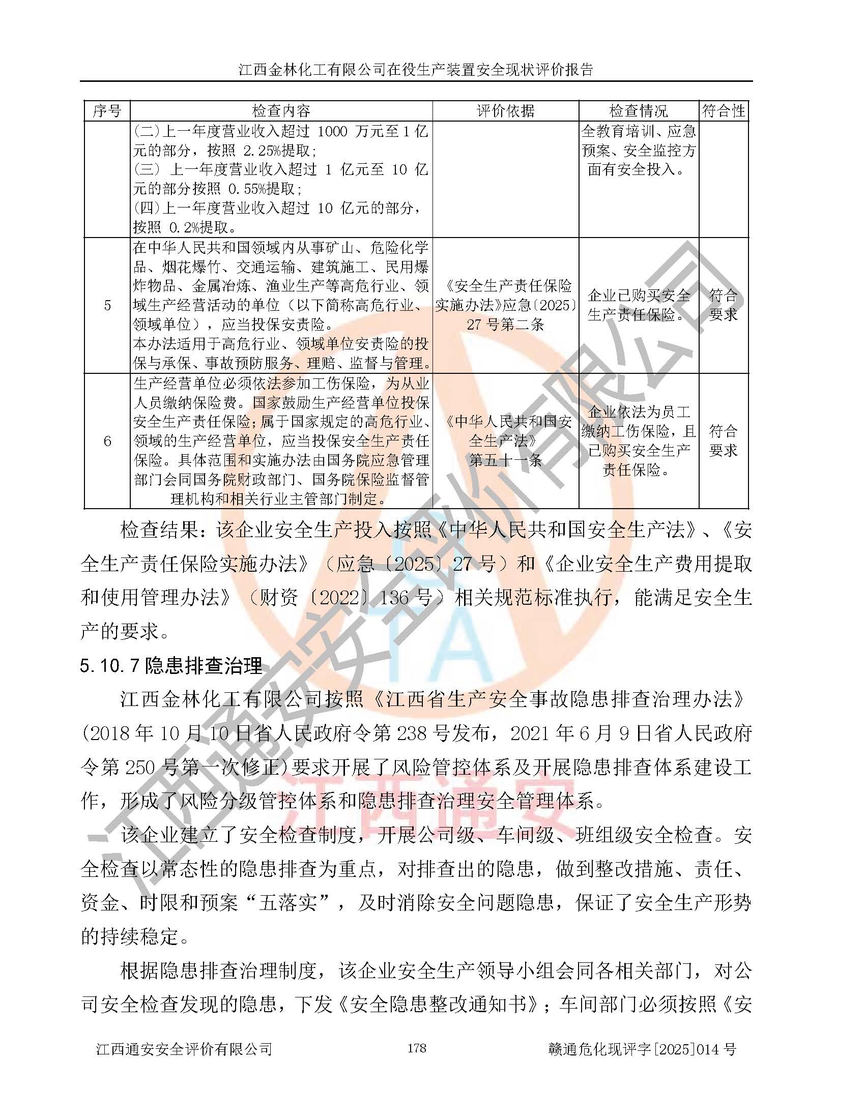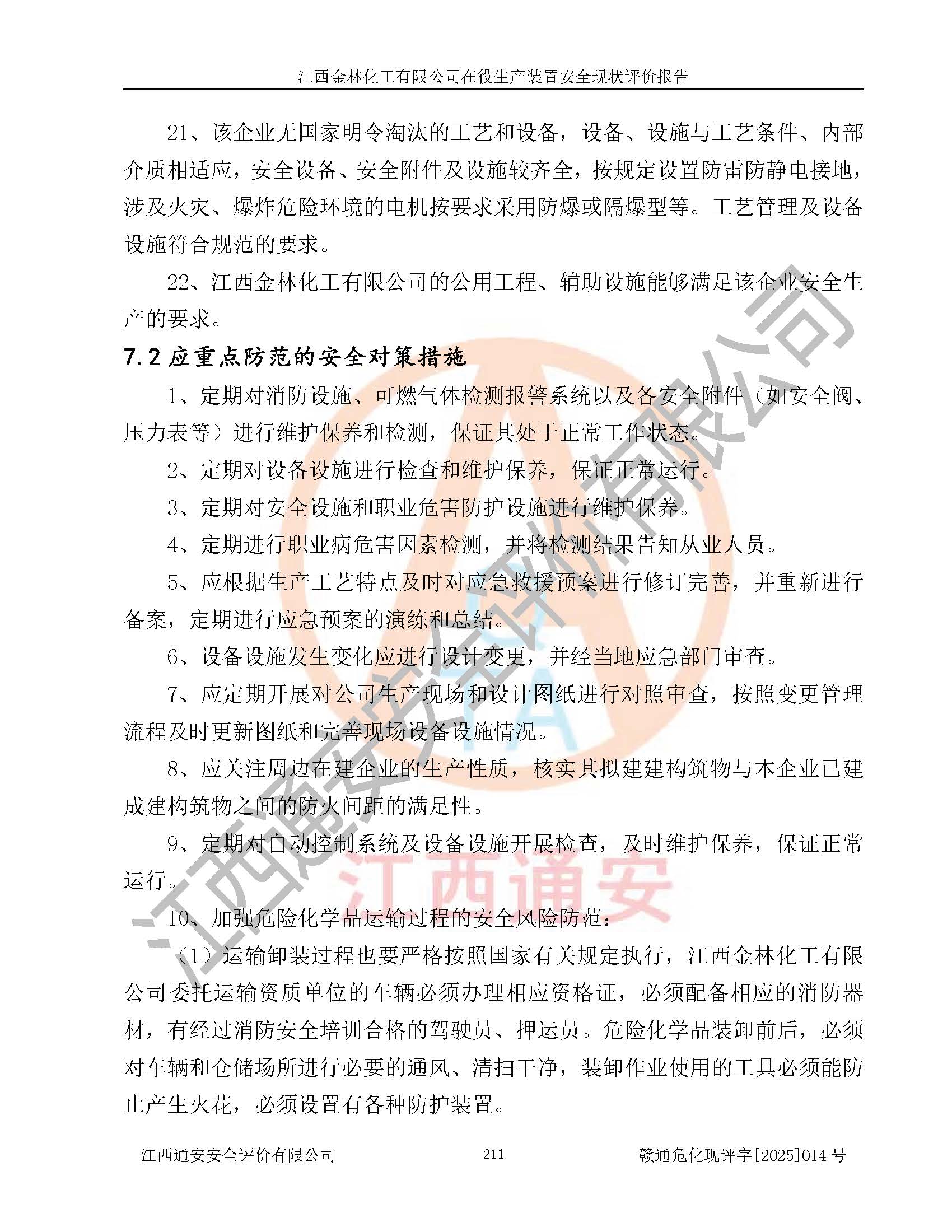 評價結(jié)論 | 江西金林化工有限公司在役生產(chǎn)裝置現(xiàn)場情況與設(shè)計圖紙一致,安全監(jiān)測監(jiān)控系統(tǒng)與設(shè)計一致,并**運行,有關(guān)從業(yè)人員資格符合《江西省危險化學(xué)品安全專項整治三年行動實施方案》要求,安全設(shè)施及安全管理符合**及有關(guān)部門關(guān)于安全生產(chǎn)法律法規(guī)、標準的要求,安全設(shè)施正常投用且運行**,安全風(fēng)險是可以控制的,其風(fēng)險程度是可以接受的,安全現(xiàn)狀符合安全生產(chǎn)條件,能夠滿足安全生產(chǎn)的要求。 | |||