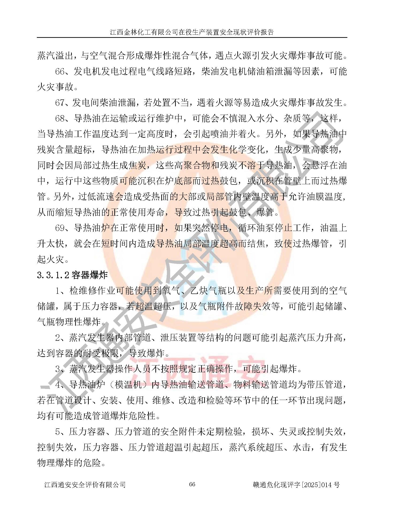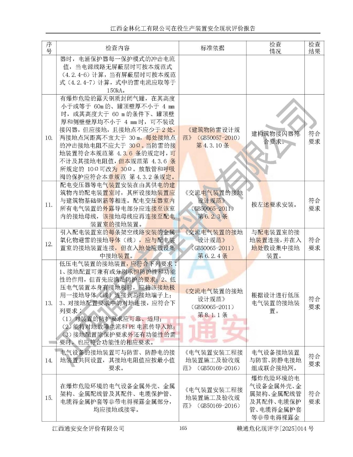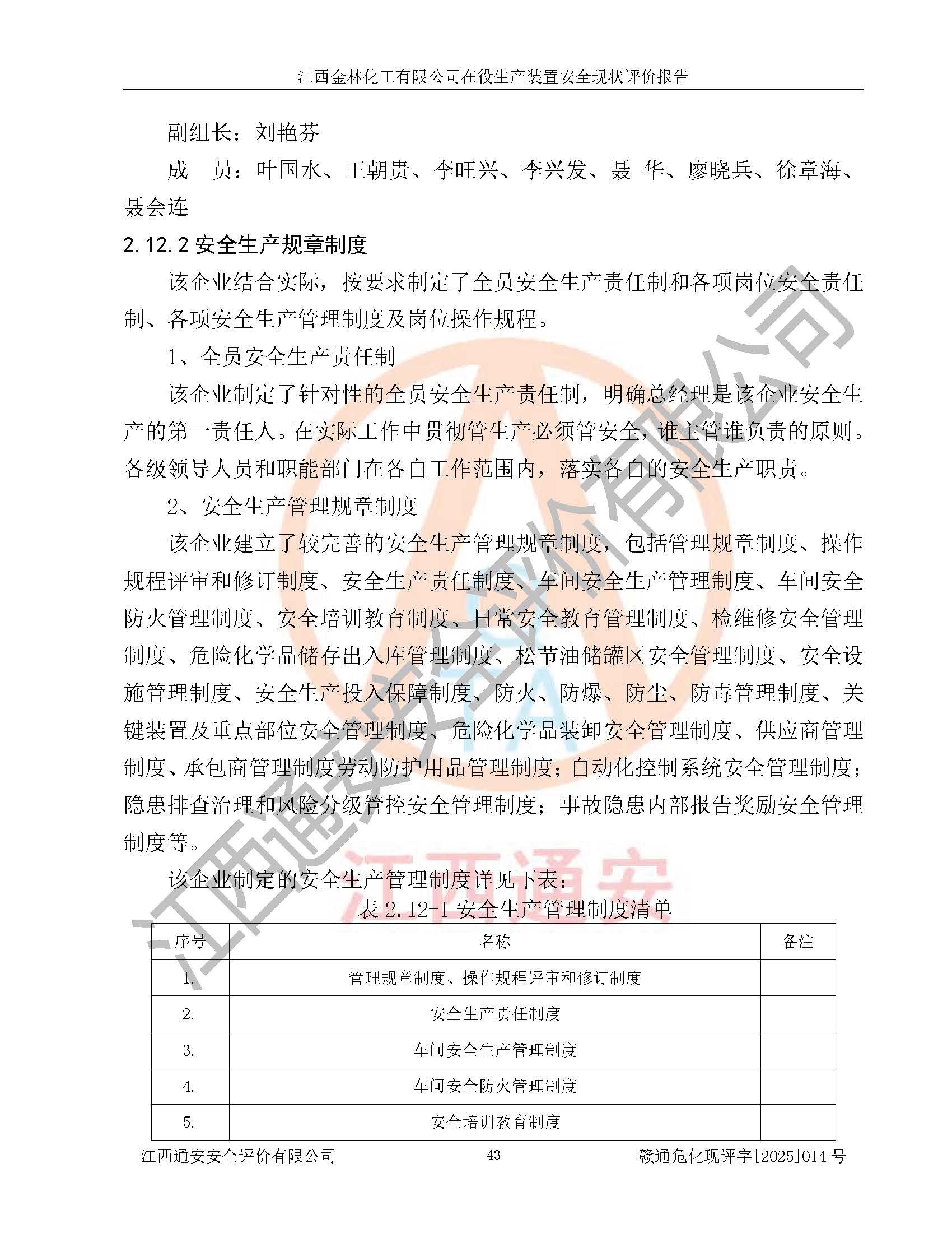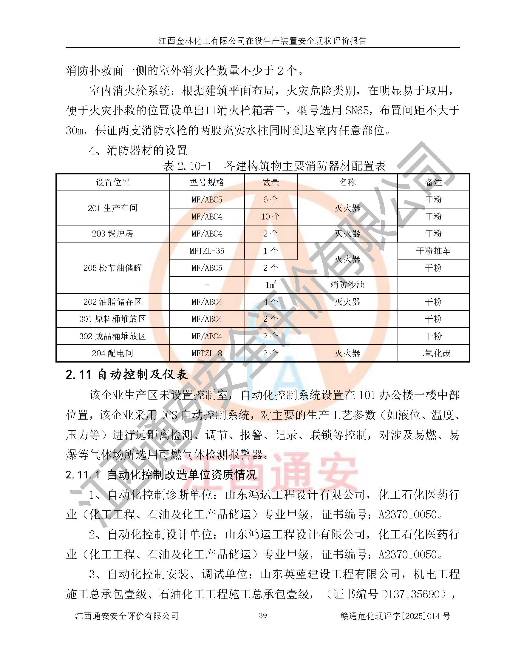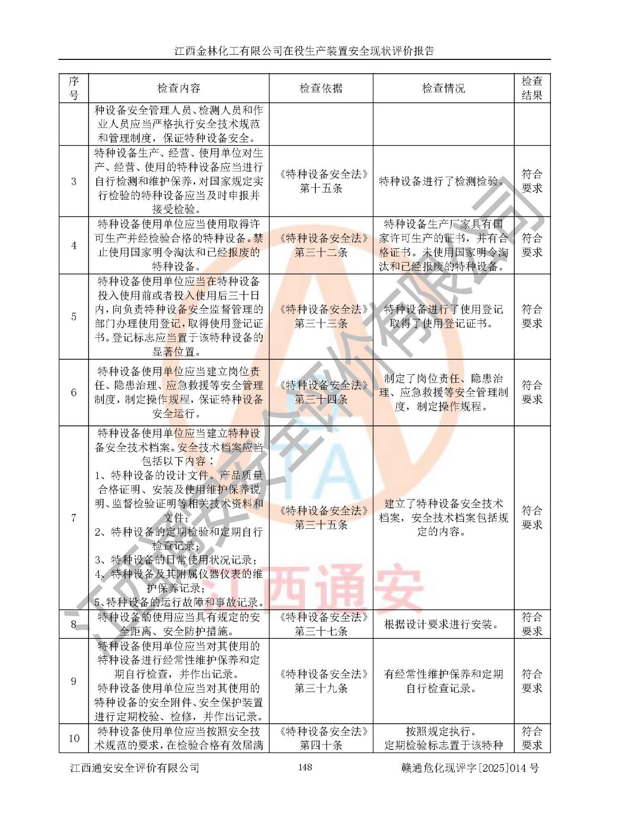 評價結(jié)論 | 江西金林化工有限公司在役生產(chǎn)裝置現(xiàn)場情況與設(shè)計圖紙一致,安全監(jiān)測監(jiān)控系統(tǒng)與設(shè)計一致,并**運行,有關(guān)從業(yè)人員資格符合《江西省危險化學(xué)品安全專項整治三年行動實施方案》要求,安全設(shè)施及安全管理符合**及有關(guān)部門關(guān)于安全生產(chǎn)法律法規(guī)、標準的要求,安全設(shè)施正常投用且運行**,安全風(fēng)險是可以控制的,其風(fēng)險程度是可以接受的,安全現(xiàn)狀符合安全生產(chǎn)條件,能夠滿足安全生產(chǎn)的要求。 | |||