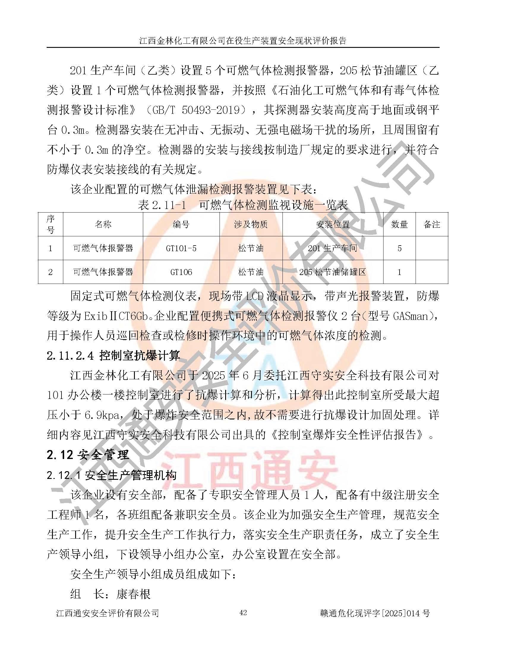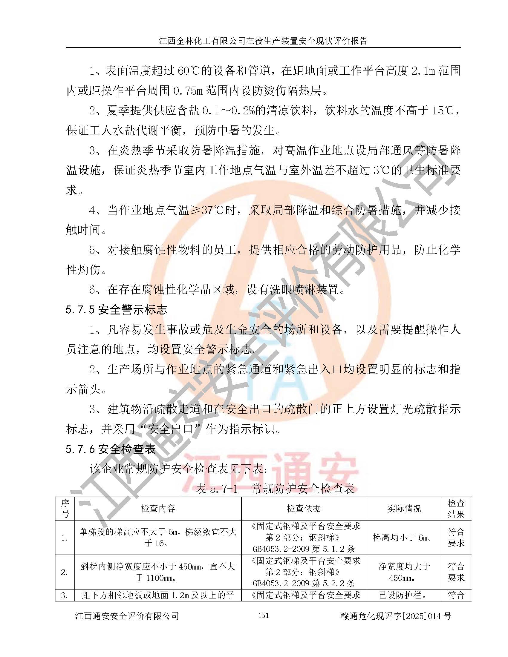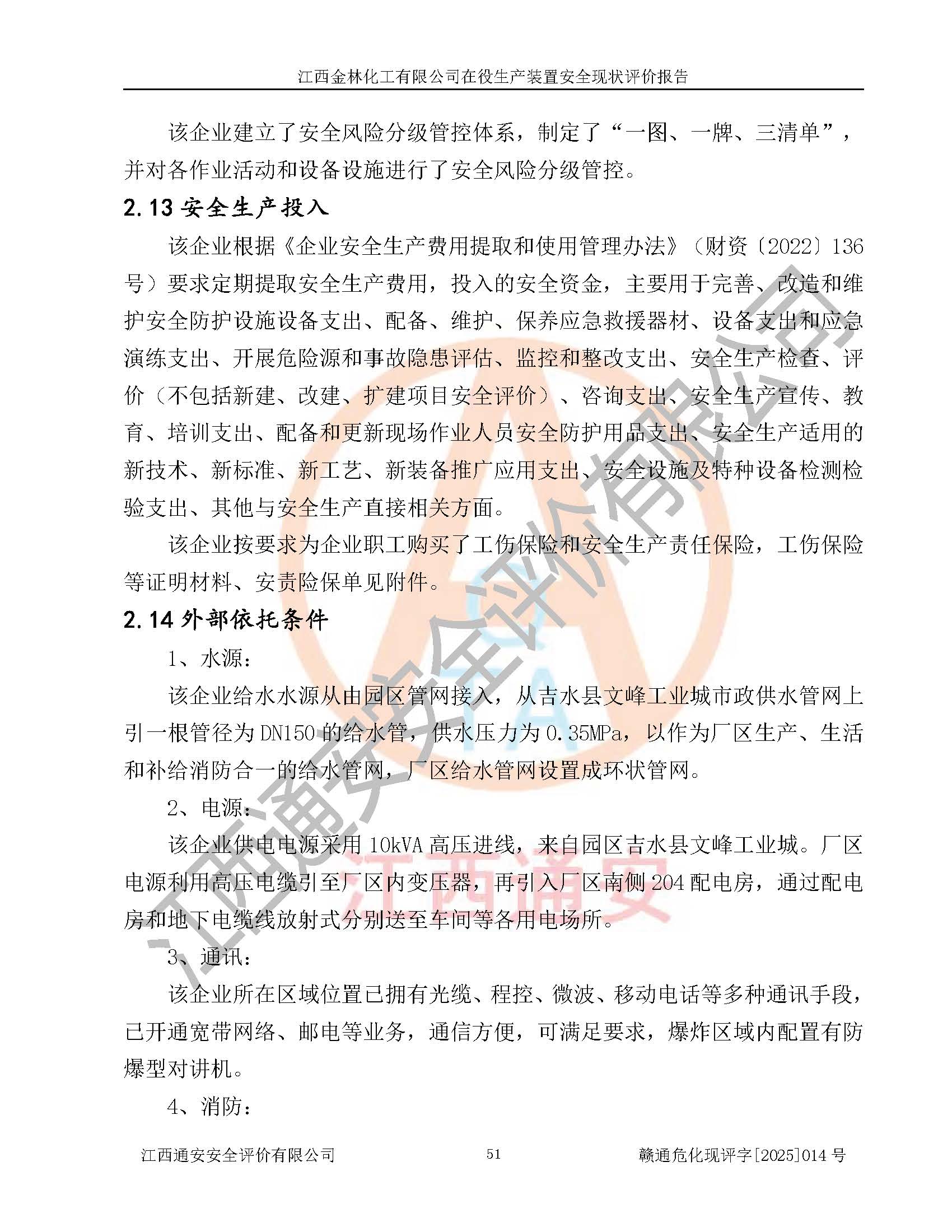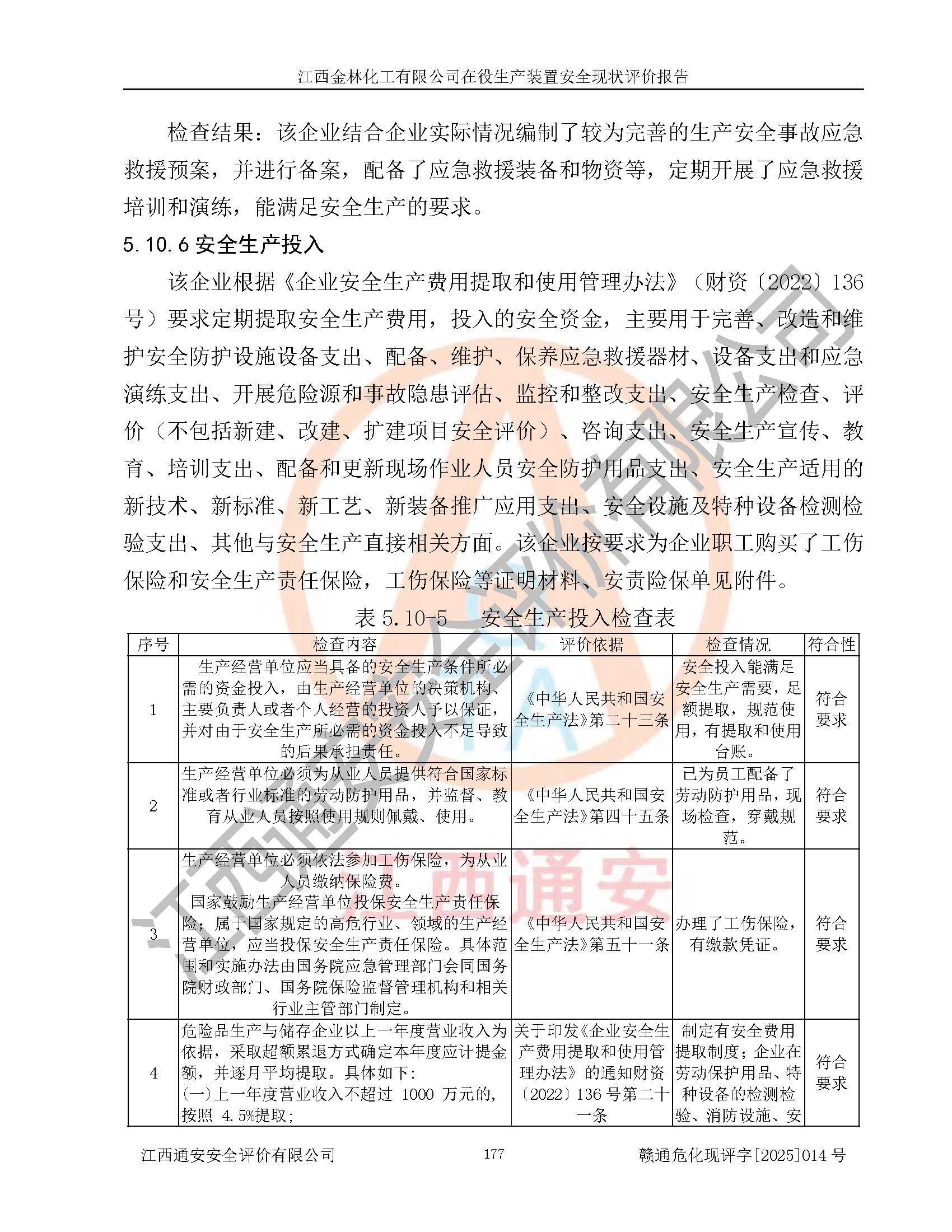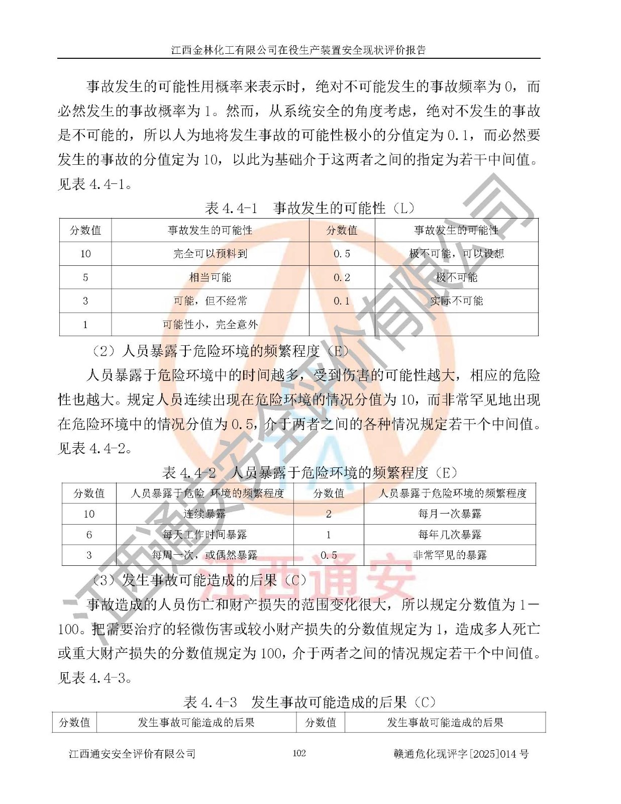 評價結(jié)論 | 江西金林化工有限公司在役生產(chǎn)裝置現(xiàn)場情況與設(shè)計圖紙一致,安全監(jiān)測監(jiān)控系統(tǒng)與設(shè)計一致,并**運行,有關(guān)從業(yè)人員資格符合《江西省危險化學(xué)品安全專項整治三年行動實施方案》要求,安全設(shè)施及安全管理符合**及有關(guān)部門關(guān)于安全生產(chǎn)法律法規(guī)、標準的要求,安全設(shè)施正常投用且運行**,安全風(fēng)險是可以控制的,其風(fēng)險程度是可以接受的,安全現(xiàn)狀符合安全生產(chǎn)條件,能夠滿足安全生產(chǎn)的要求。 | |||