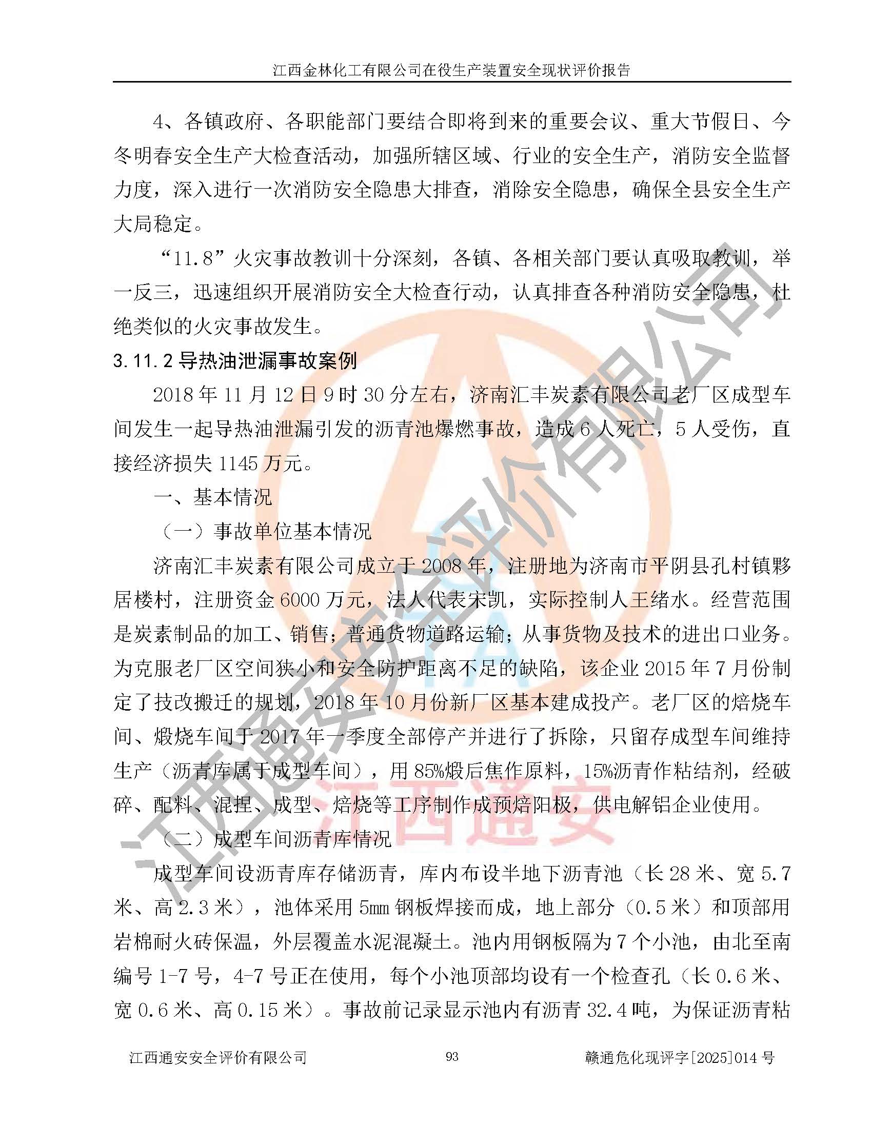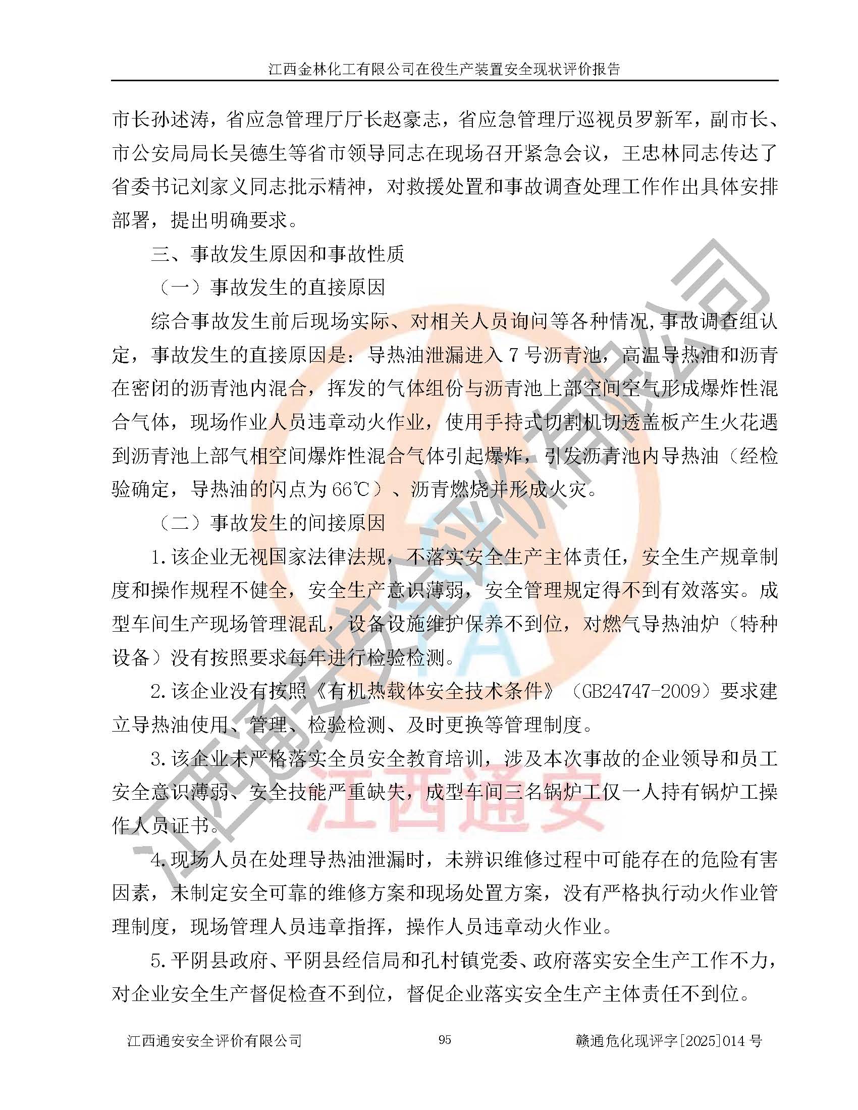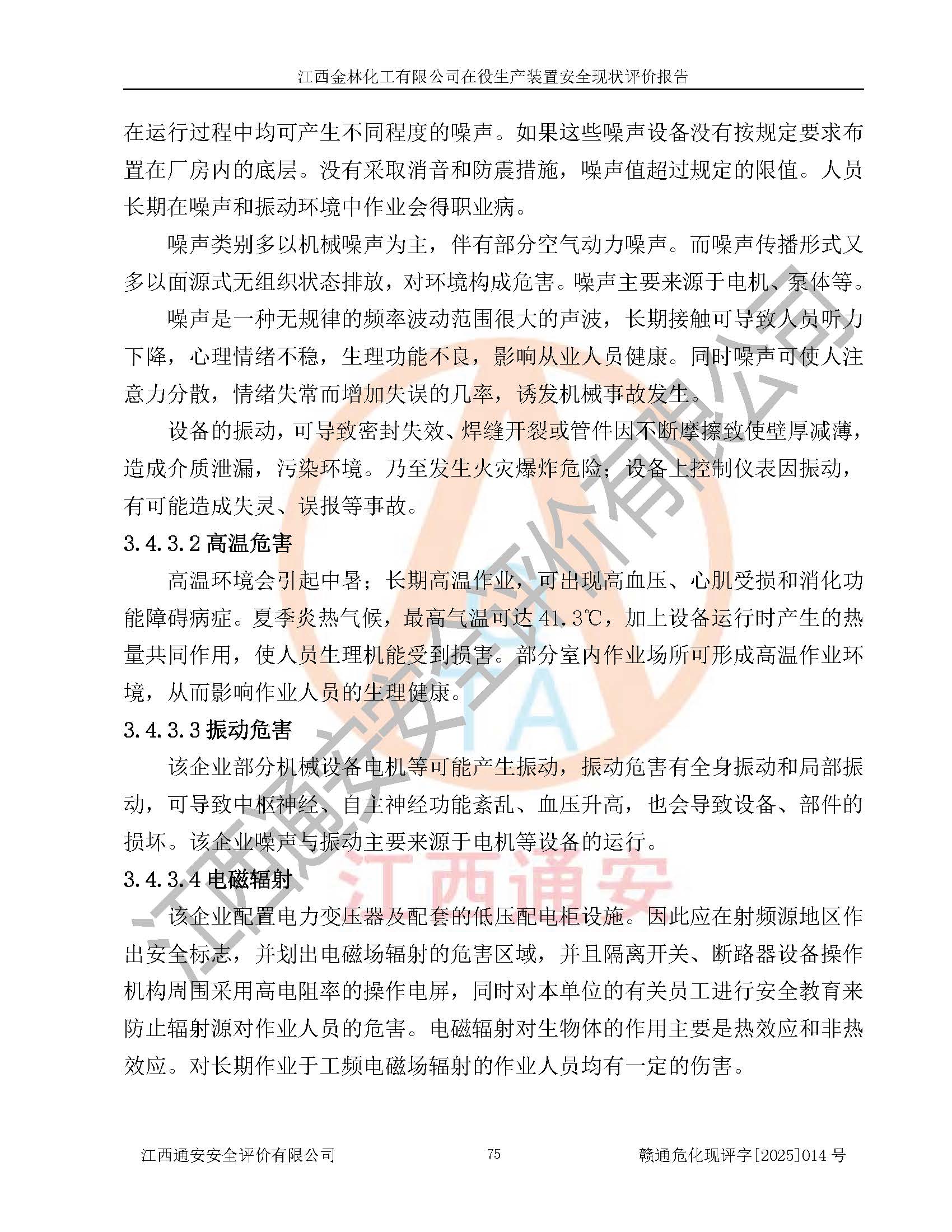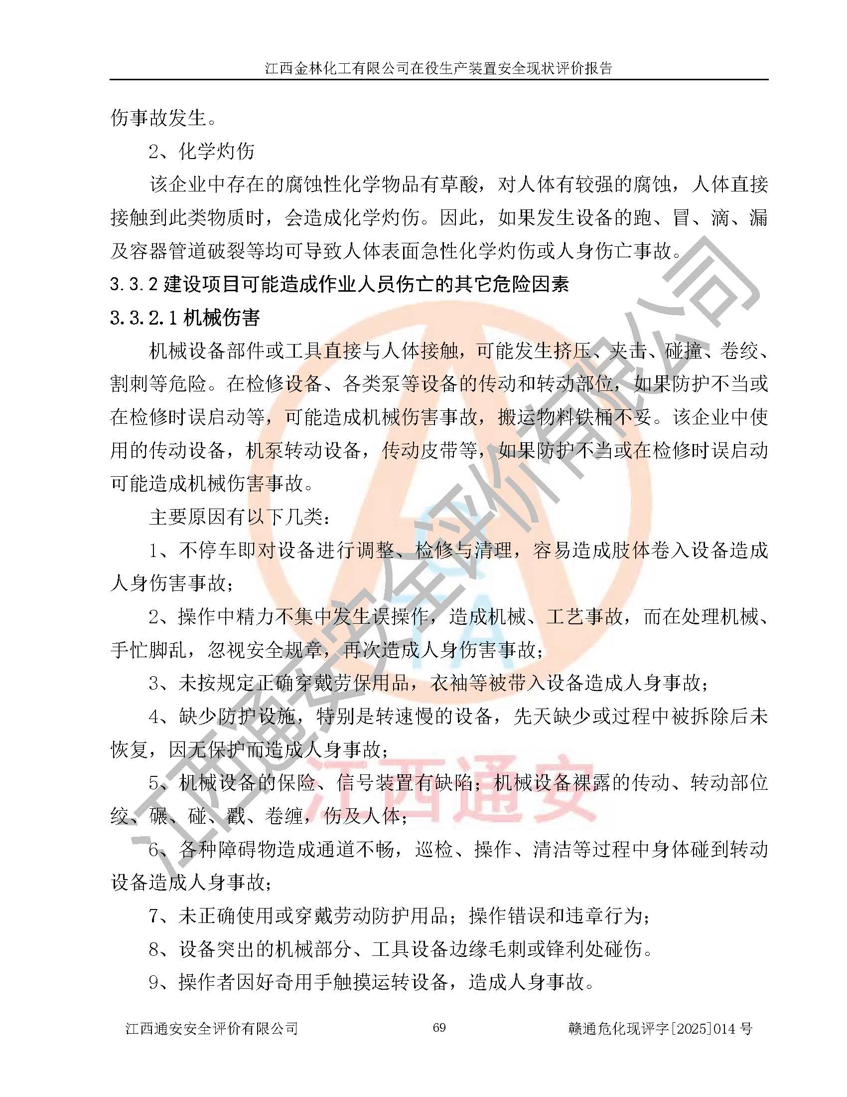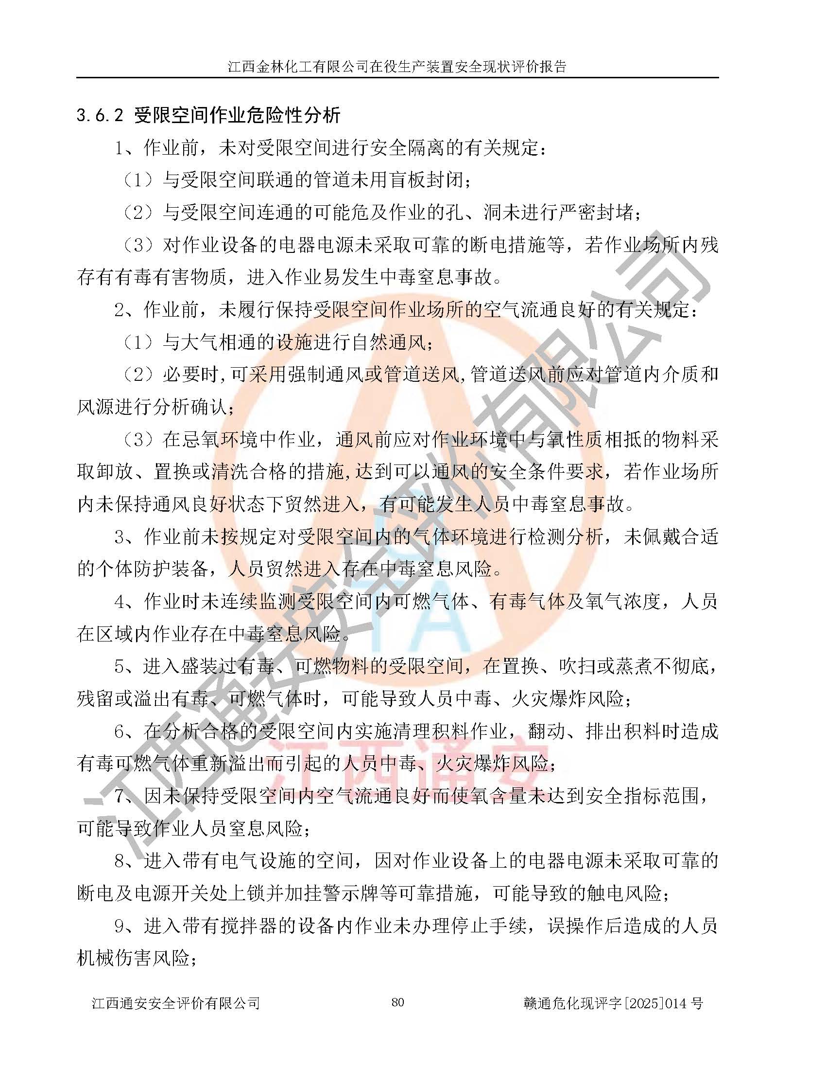 評價結(jié)論 | 江西金林化工有限公司在役生產(chǎn)裝置現(xiàn)場情況與設(shè)計圖紙一致,安全監(jiān)測監(jiān)控系統(tǒng)與設(shè)計一致,并**運行,有關(guān)從業(yè)人員資格符合《江西省危險化學(xué)品安全專項整治三年行動實施方案》要求,安全設(shè)施及安全管理符合**及有關(guān)部門關(guān)于安全生產(chǎn)法律法規(guī)、標準的要求,安全設(shè)施正常投用且運行**,安全風(fēng)險是可以控制的,其風(fēng)險程度是可以接受的,安全現(xiàn)狀符合安全生產(chǎn)條件,能夠滿足安全生產(chǎn)的要求。 | |||
