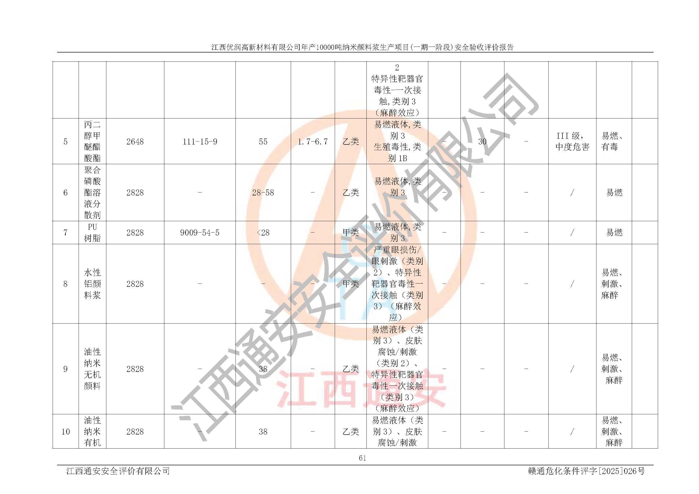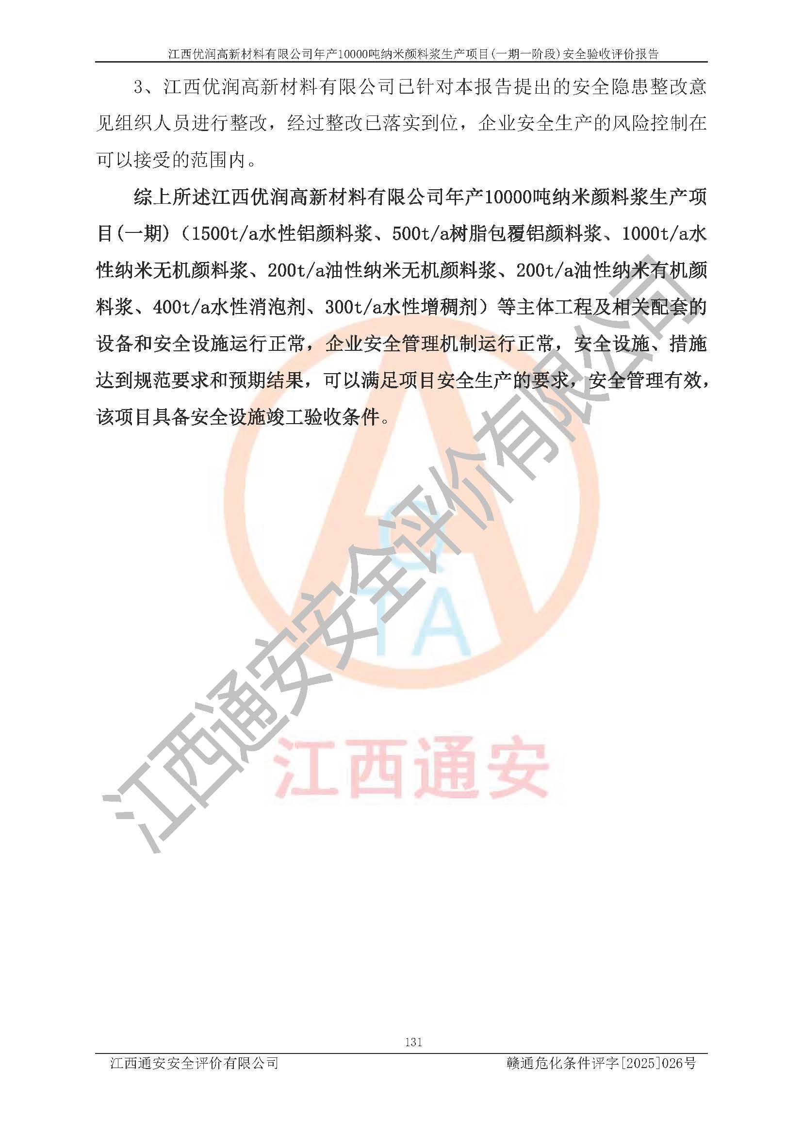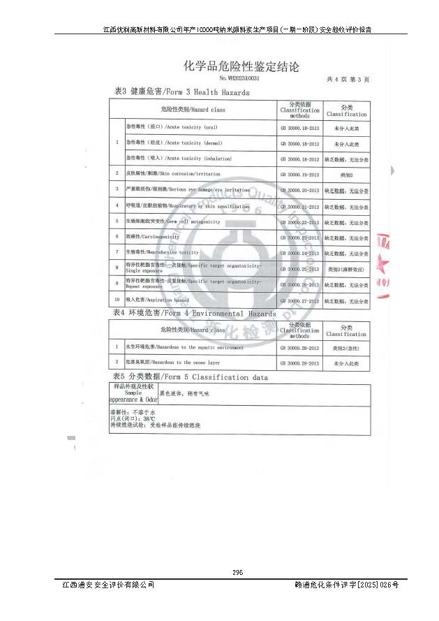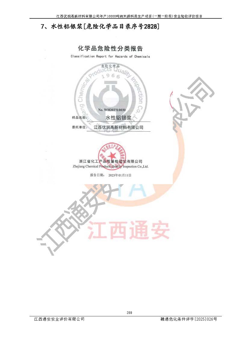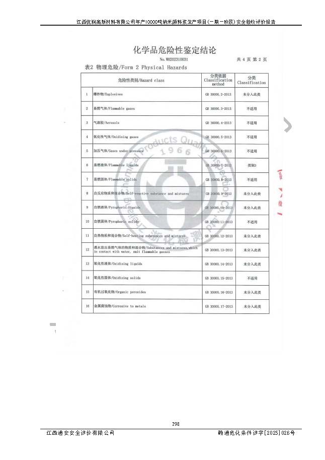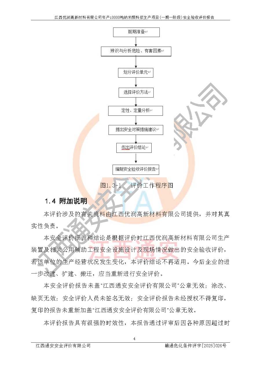 評(píng)價(jià)報(bào)告名稱(chēng) | 江西優(yōu)潤(rùn)高新材料有限公司年產(chǎn)10000噸納米顏料漿生產(chǎn)項(xiàng)目(一期一階段)安全驗(yàn)收評(píng)價(jià)報(bào)告 | |||