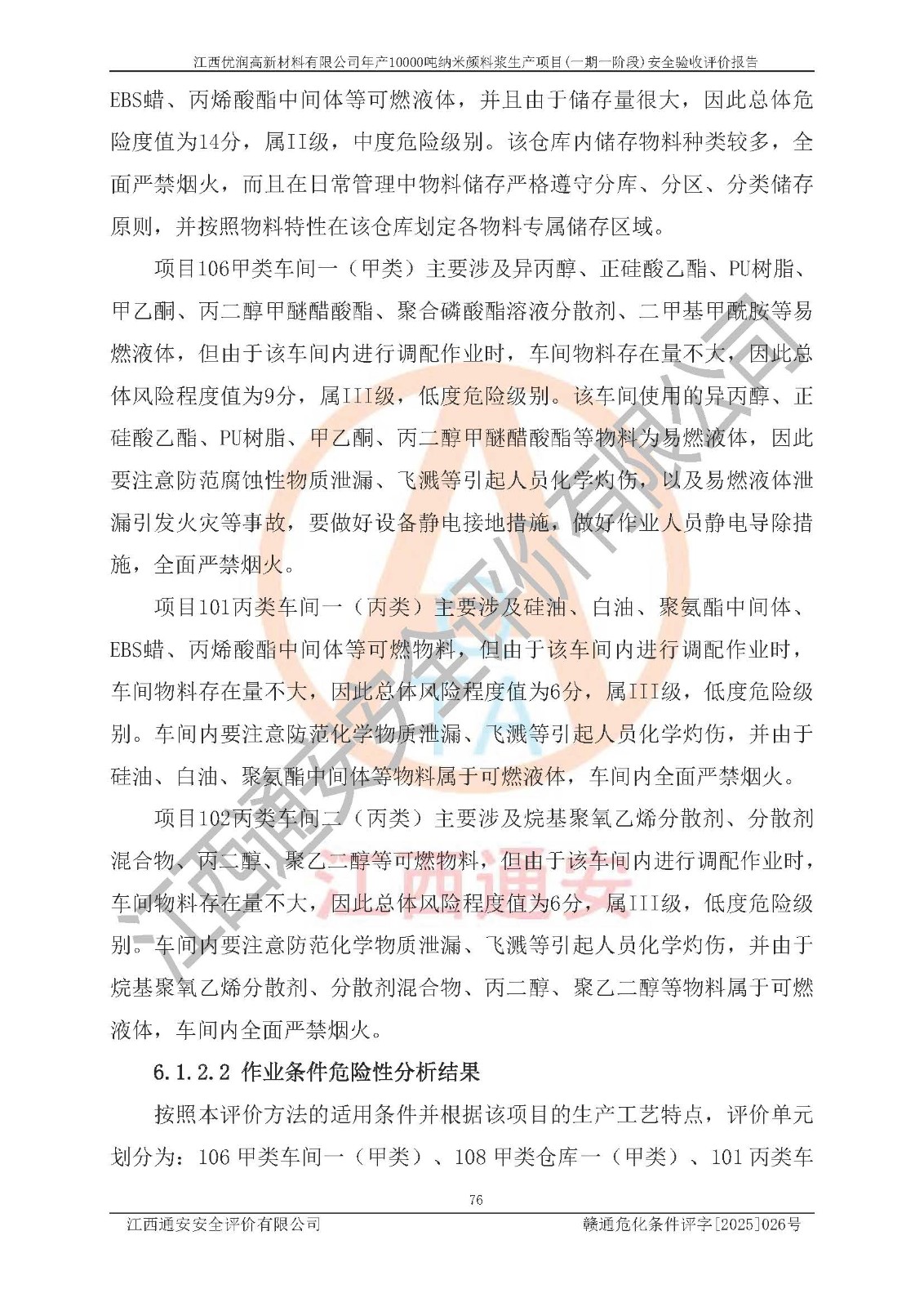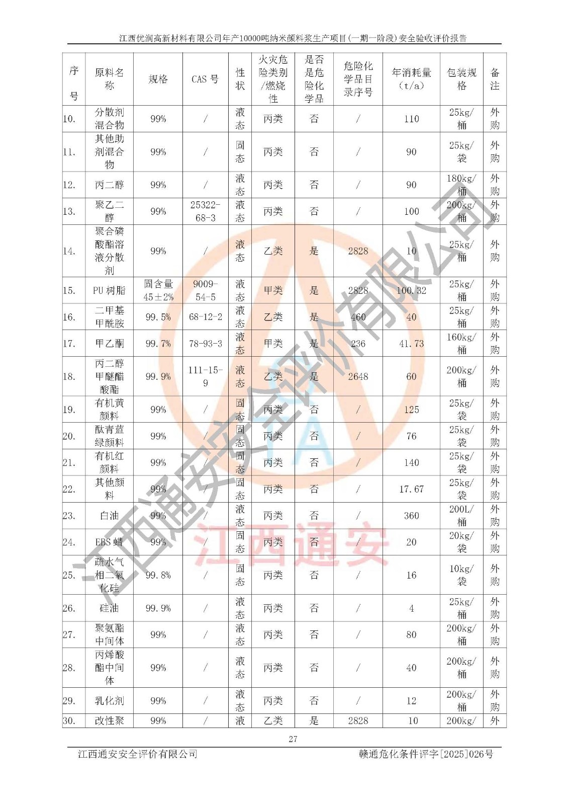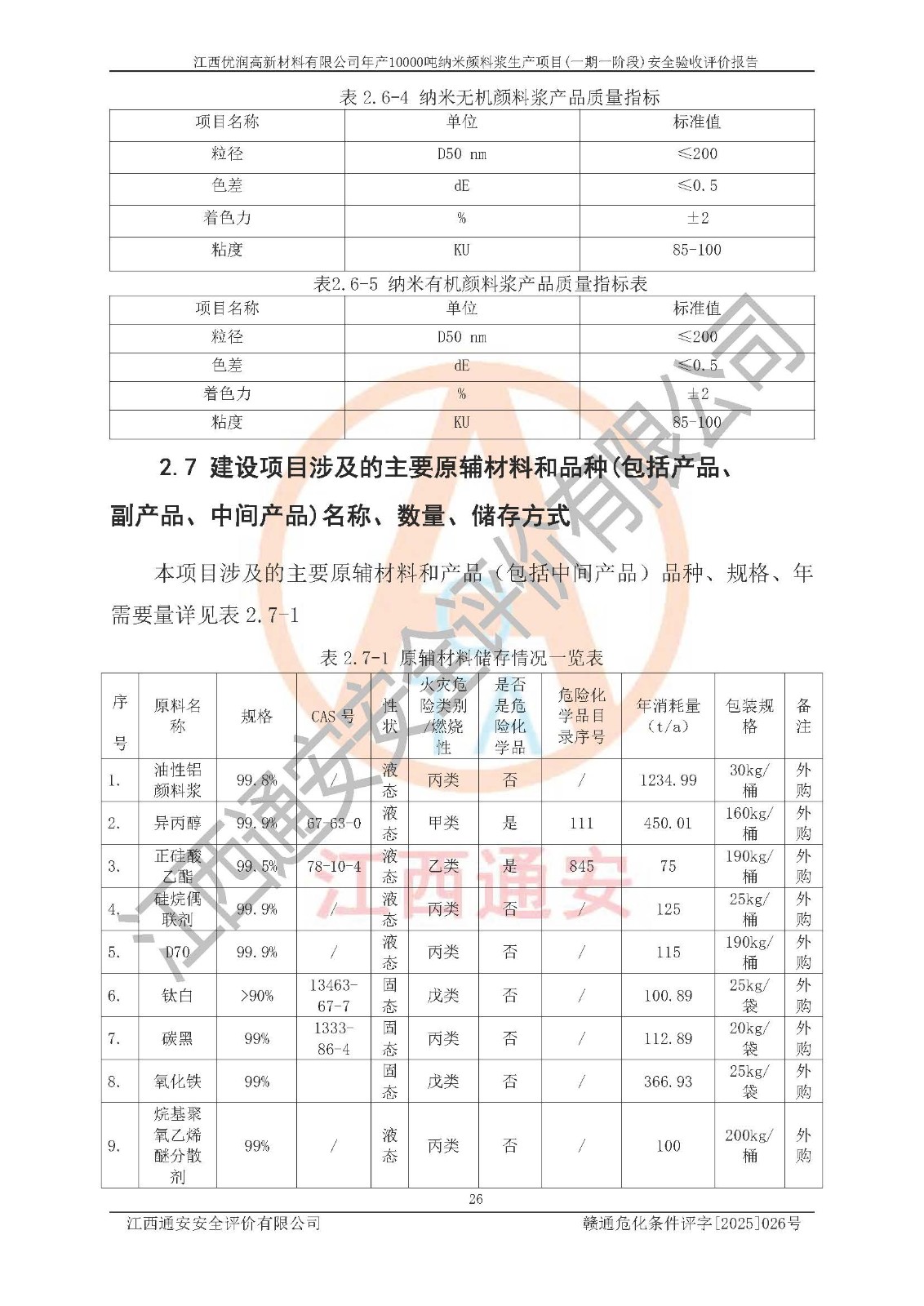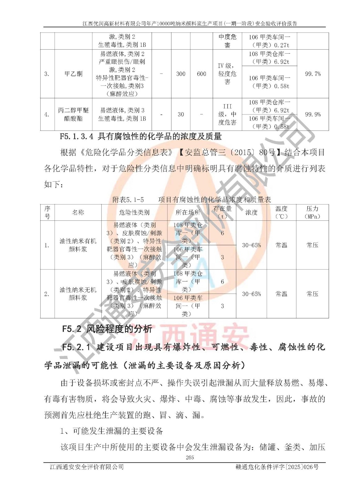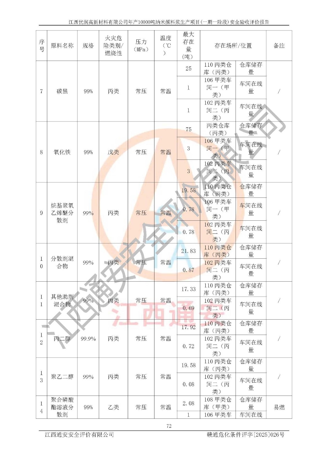 評(píng)價(jià)報(bào)告名稱(chēng) | 江西優(yōu)潤(rùn)高新材料有限公司年產(chǎn)10000噸納米顏料漿生產(chǎn)項(xiàng)目(一期一階段)安全驗(yàn)收評(píng)價(jià)報(bào)告 | |||